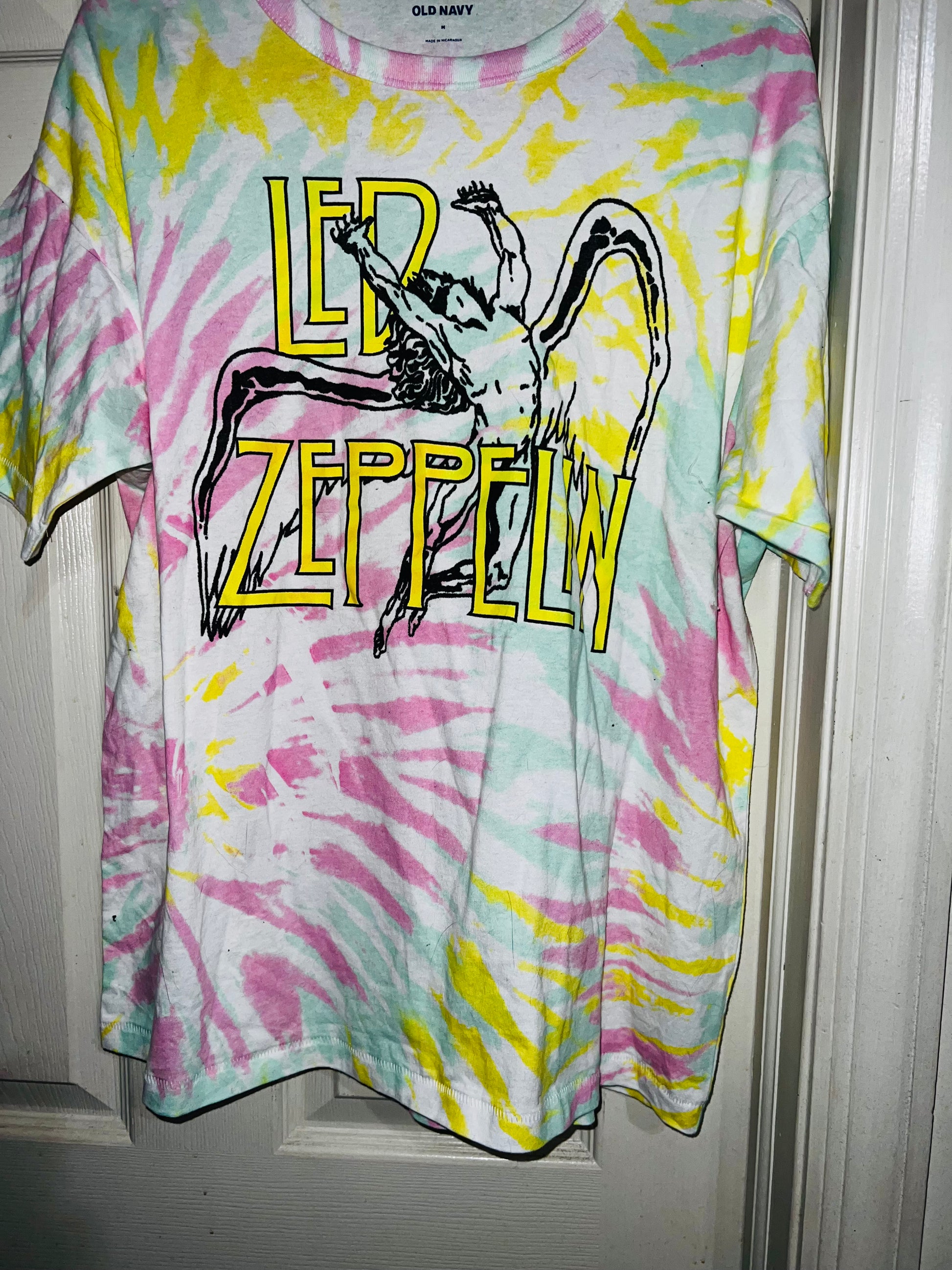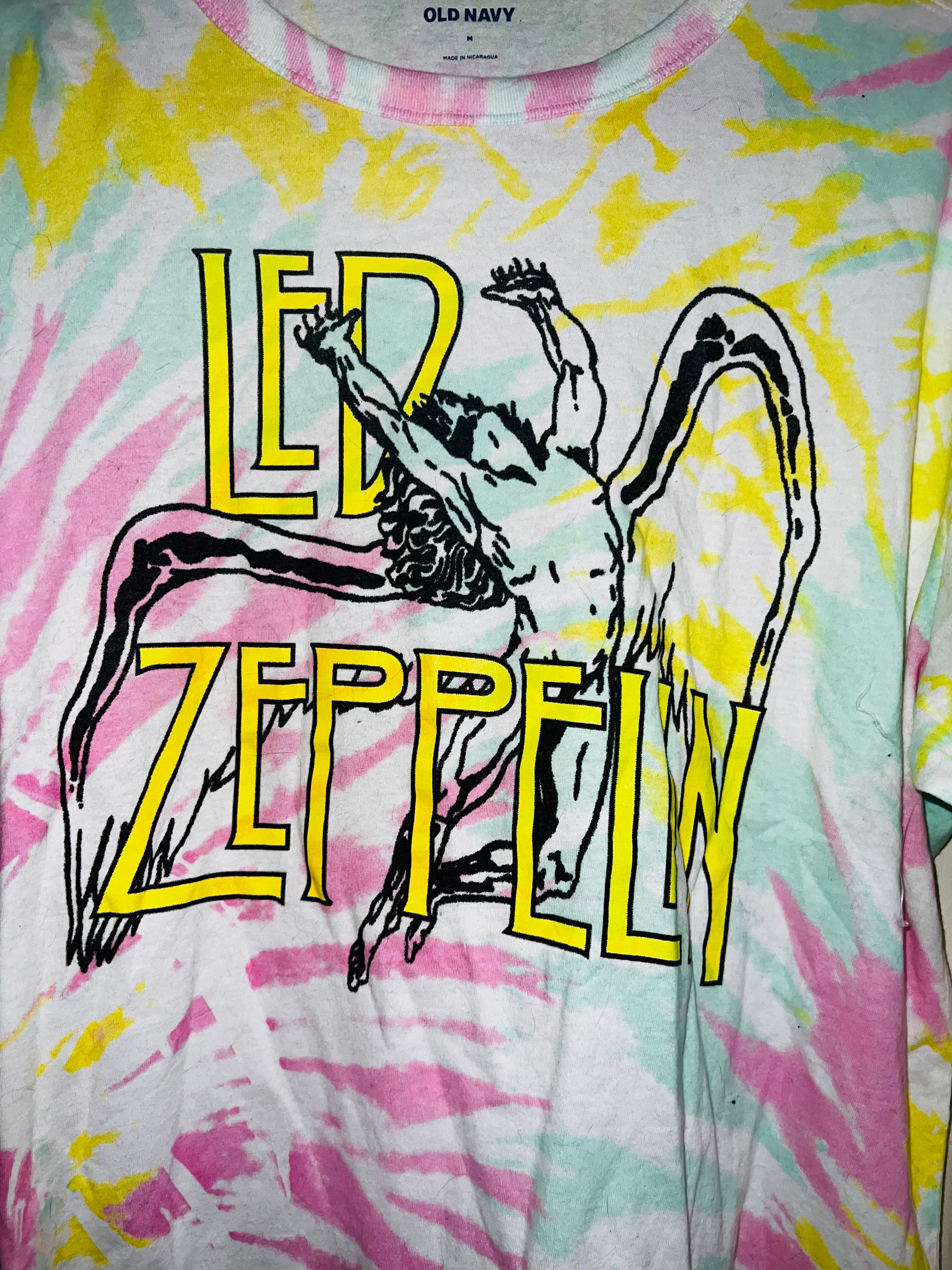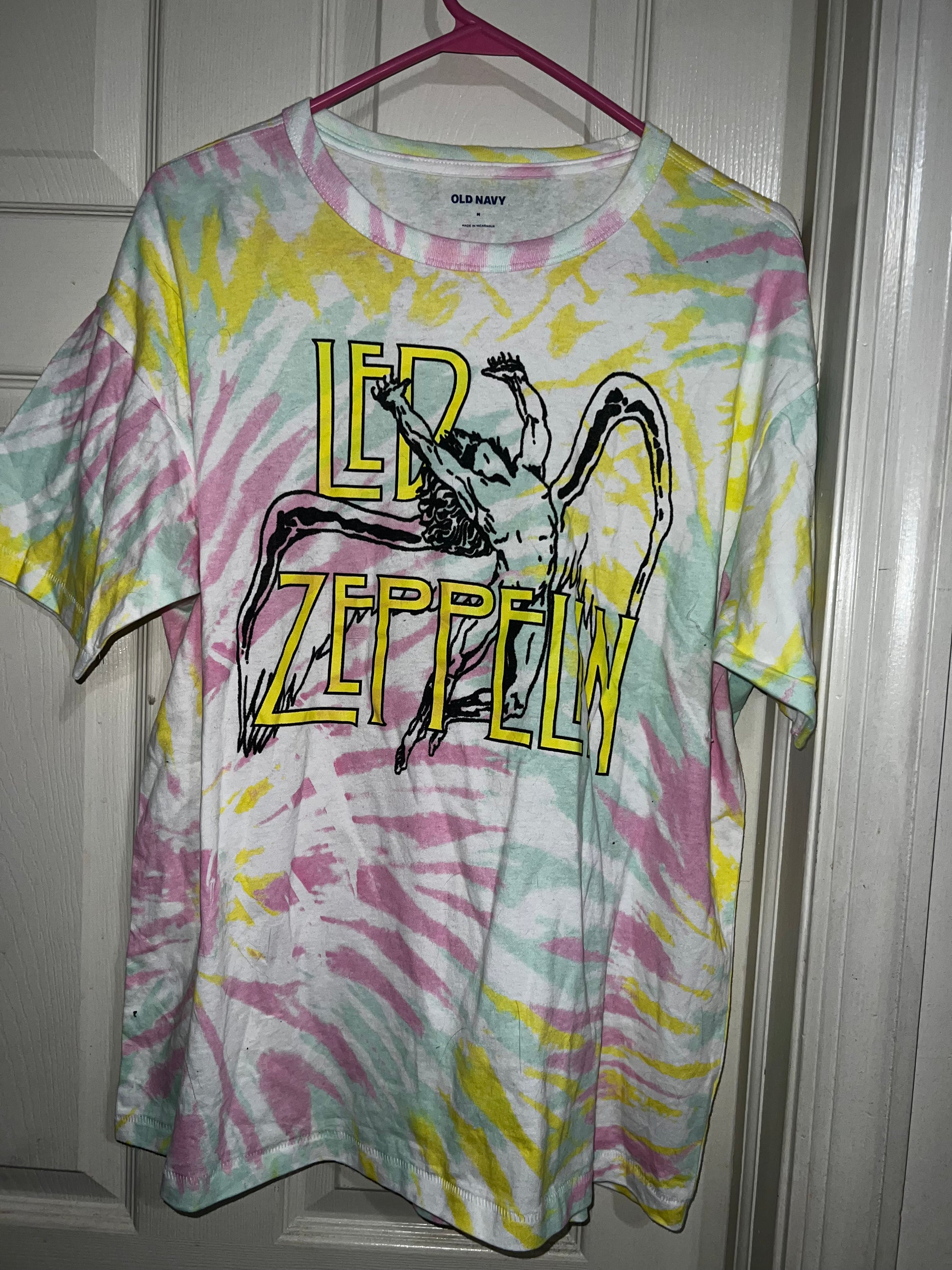 A Led Zeppelin pink, yellow, and blue tie dye t-shirt with the band name and their iconic logo on the front. I have a size medium and a size large. They’re oversized so I’d say they fit a size up of a bit bigger. Never seen these before. This isn’t distressed yet, so please be sure to choose your level of distress
