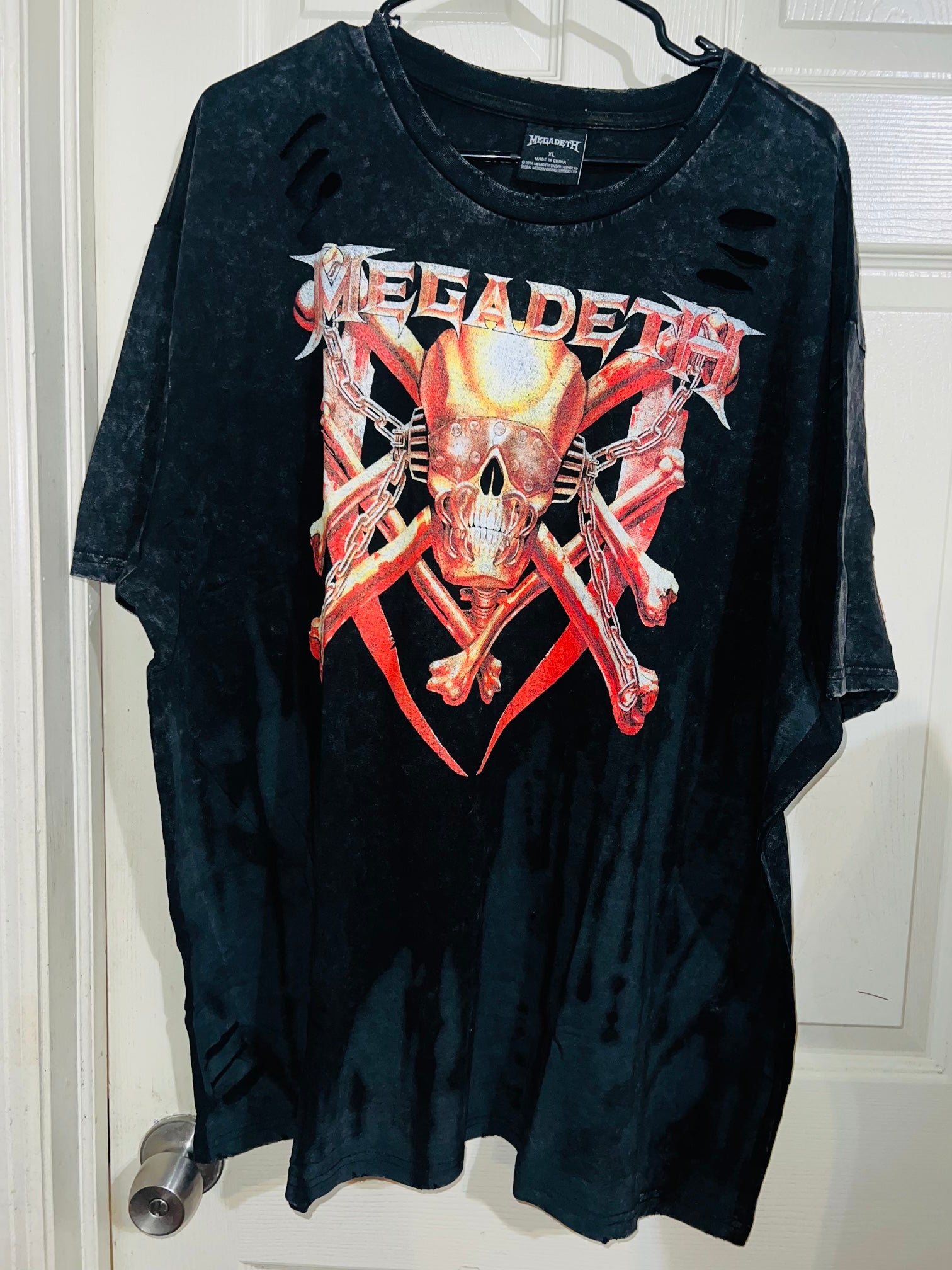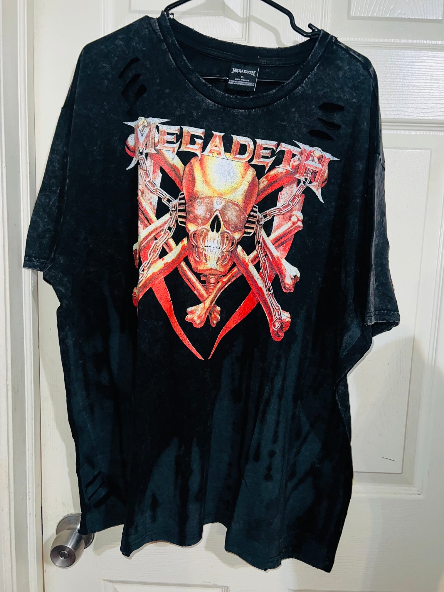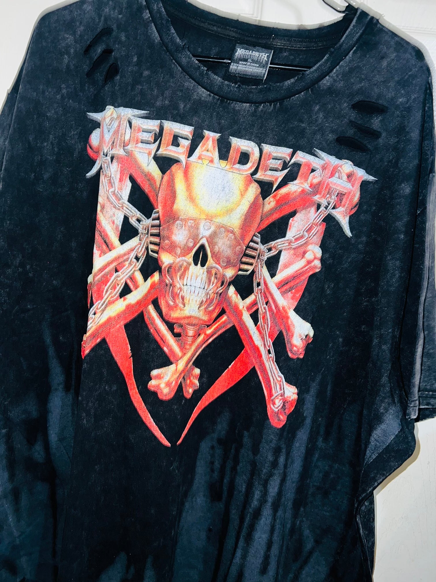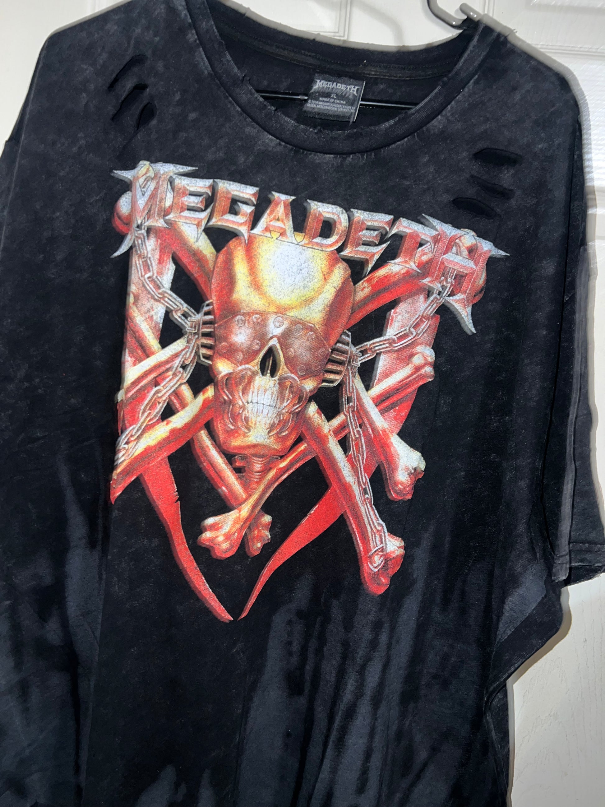 A black/grey tie dyed at the lower part oversized Megadeath tee with already distressed areas I’d work around. Oversized, could possibly wear as a dress like in the video. I love Megadeath graphics, reminds me of Billions! Size XL, oversized.