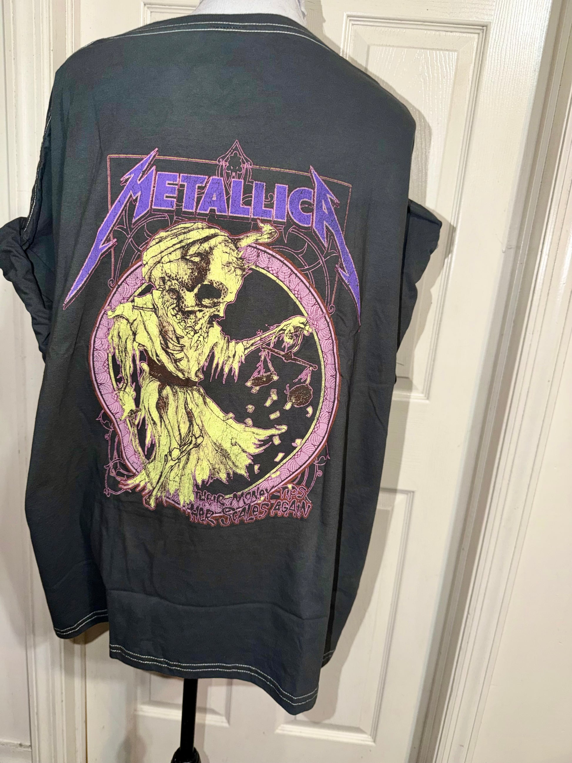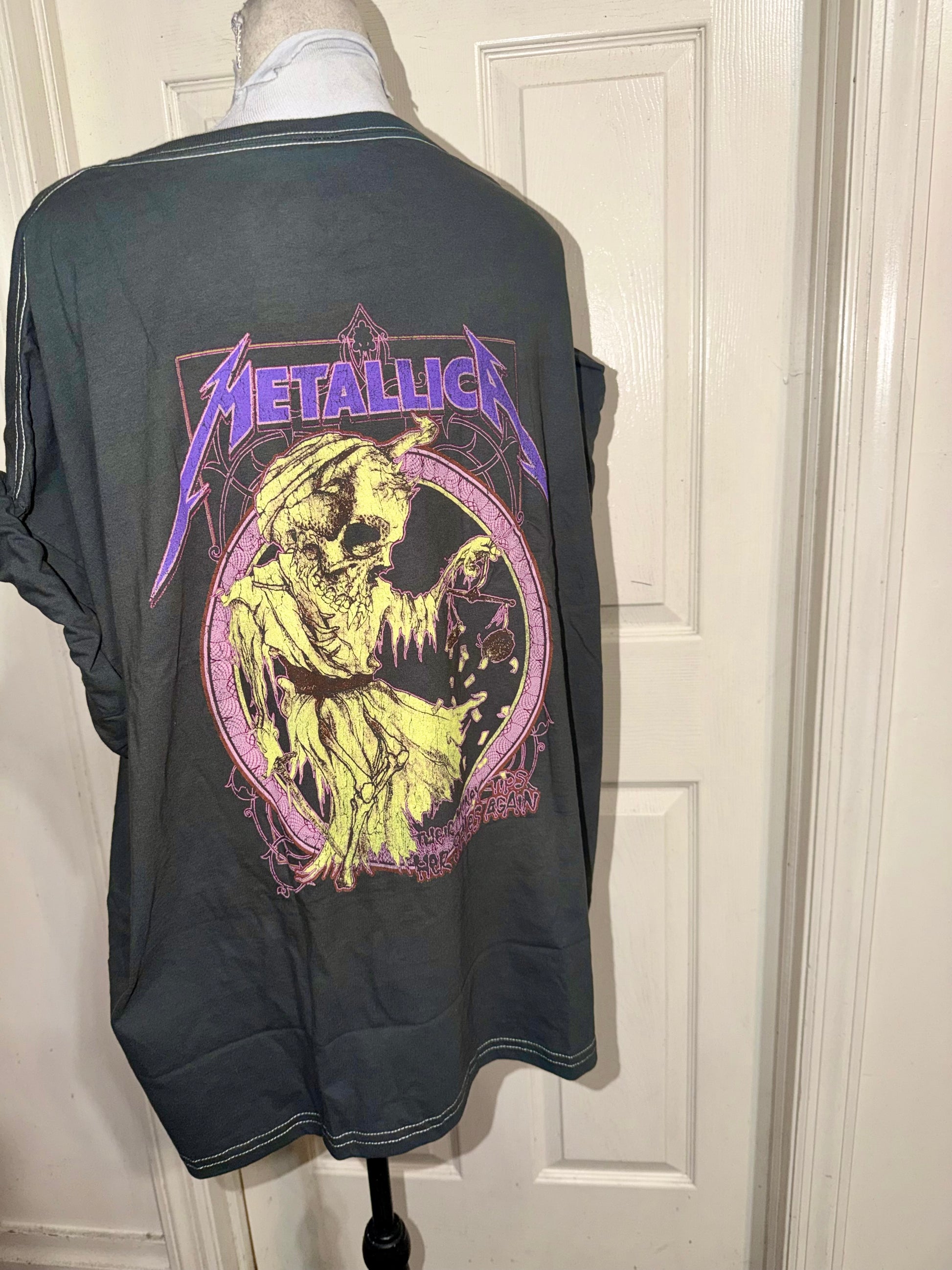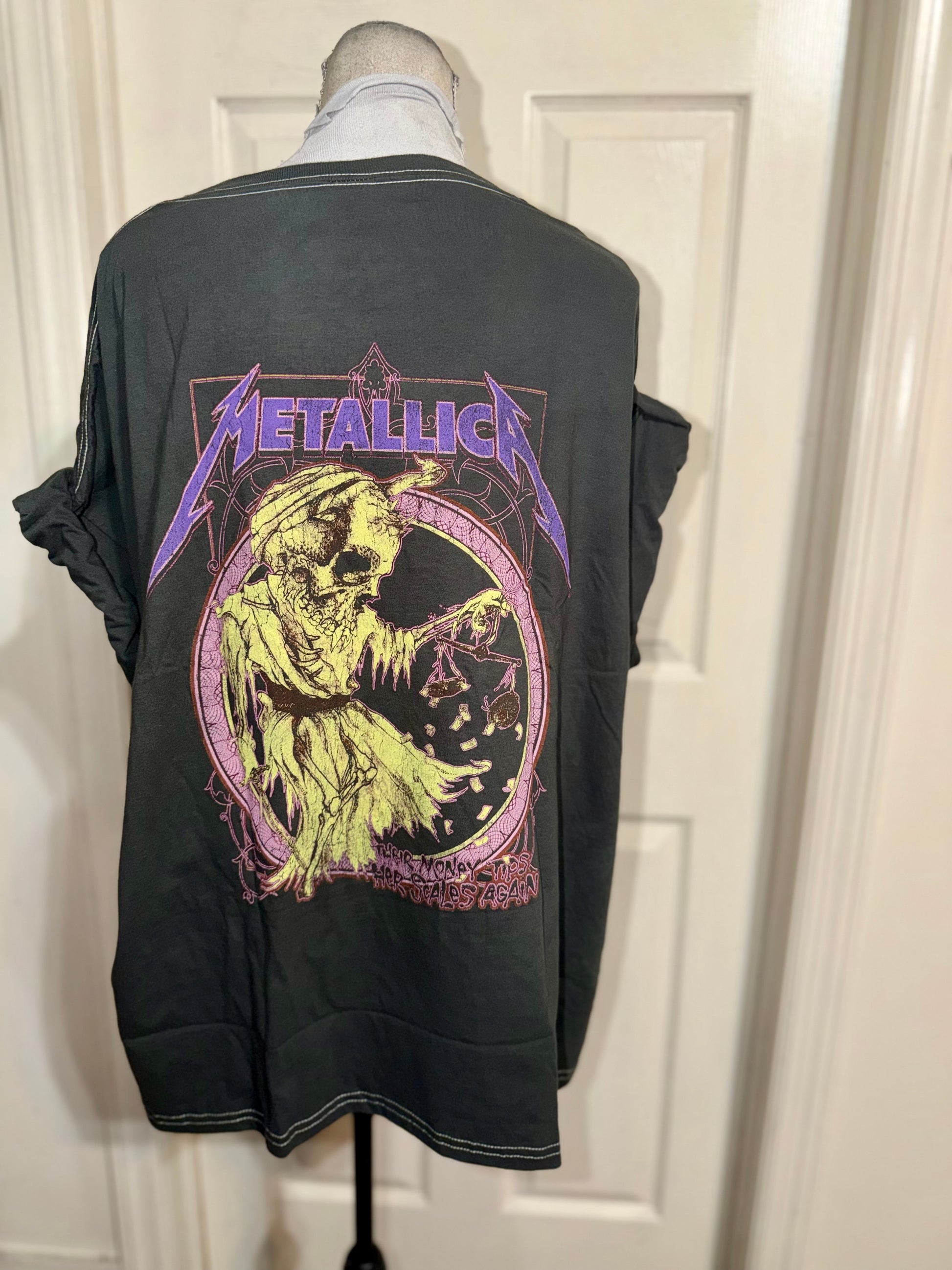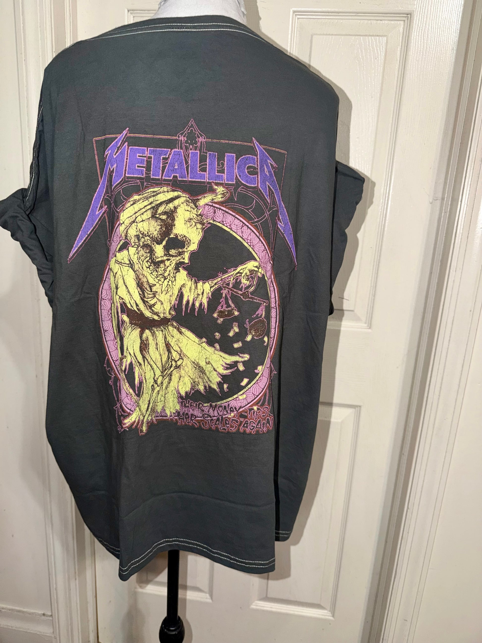 This is now a preorder. "Their money tips her scales again.” A double sided grey and purple Metallica tee with a sick graphic on the back. Oversized.