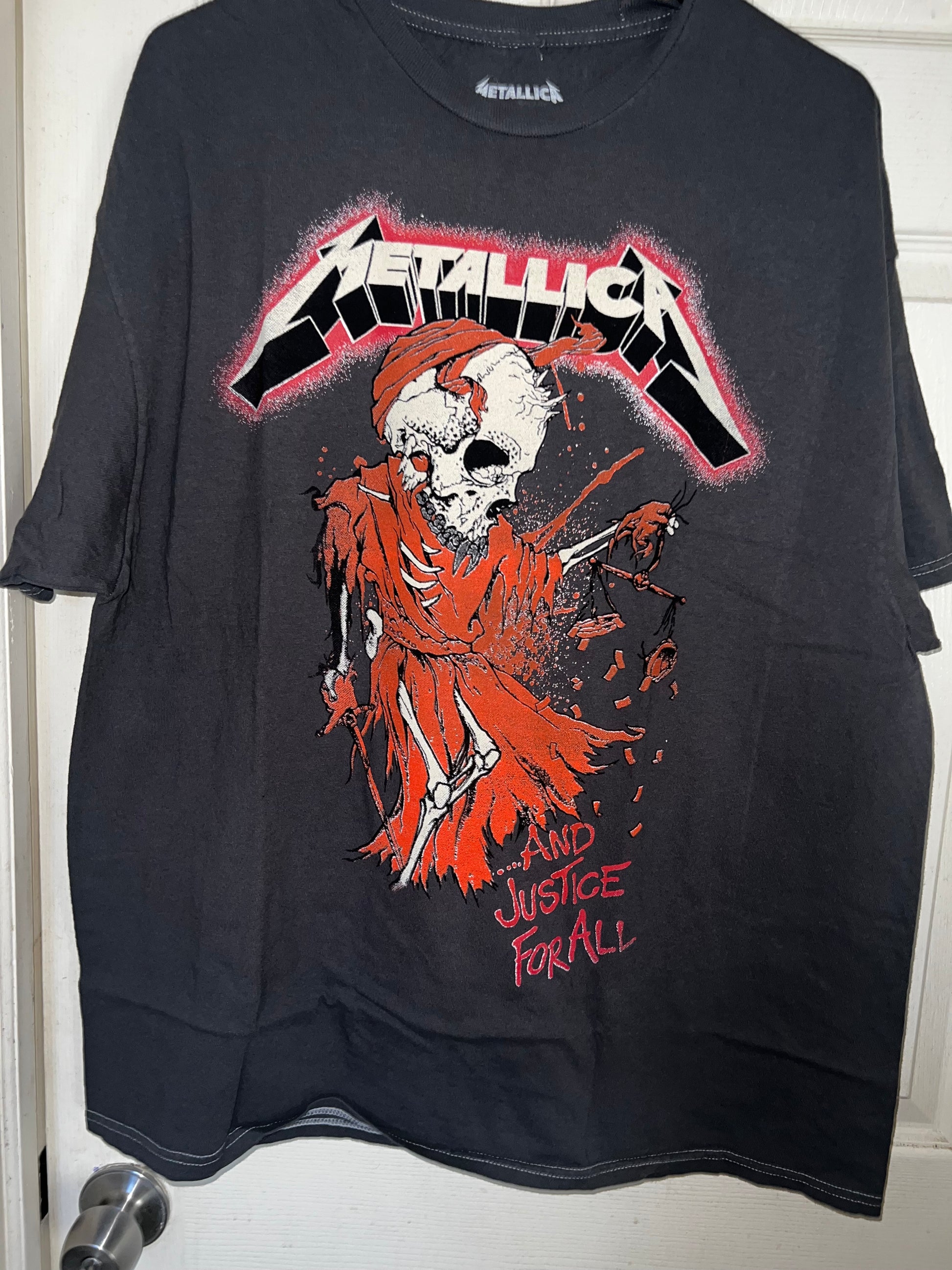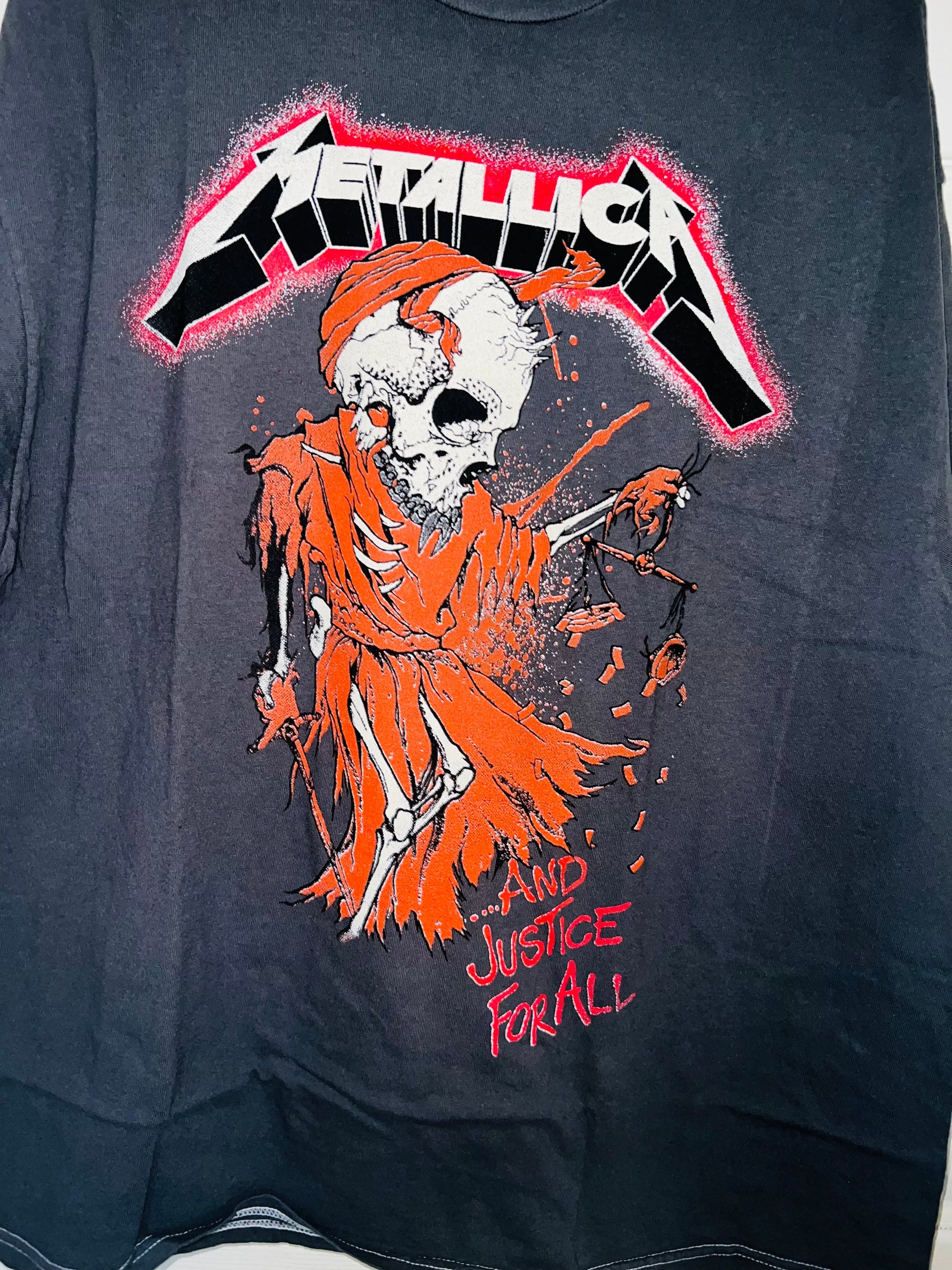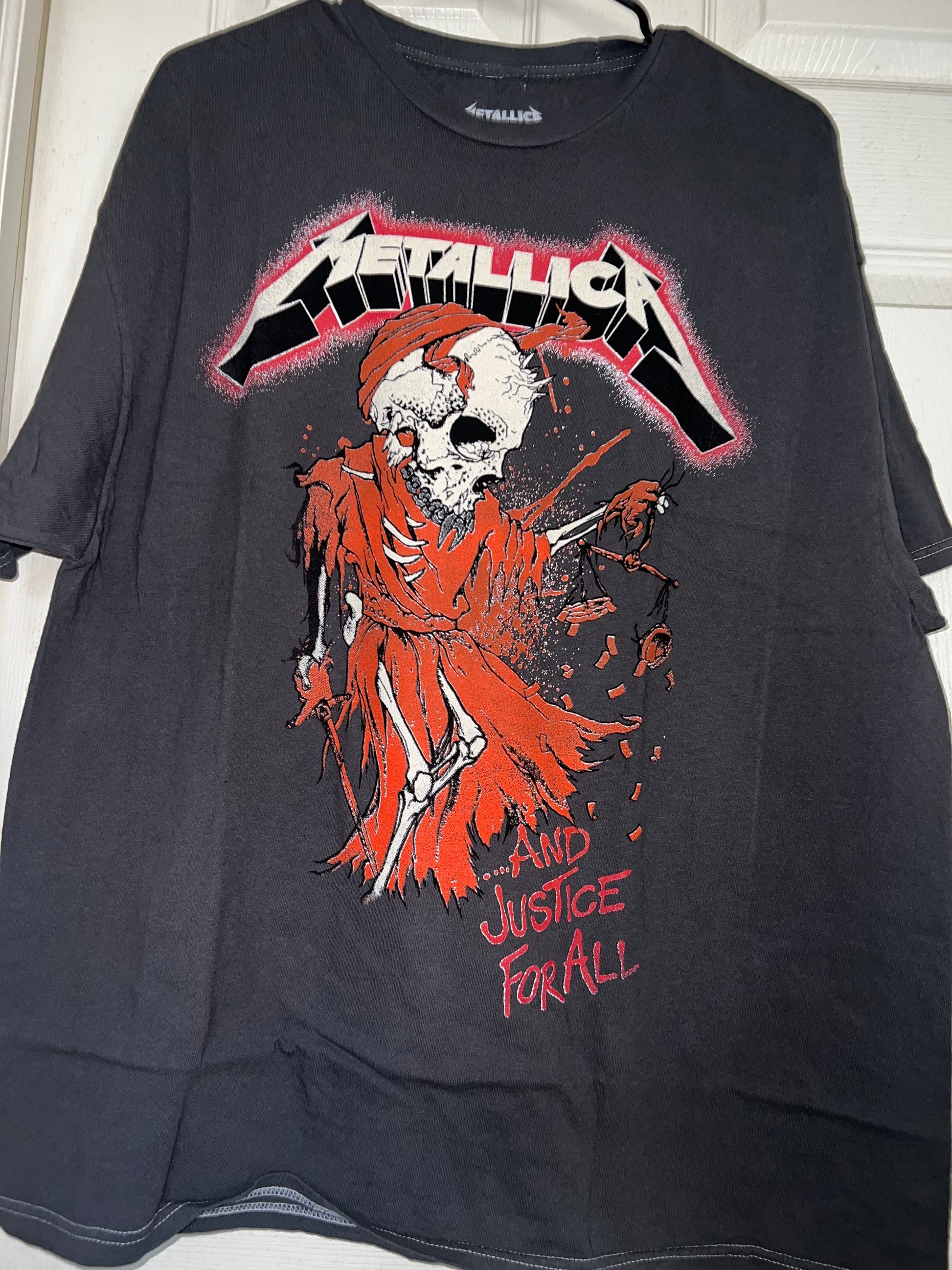 This is a preorder. Please allow extra shipping. charcoal grey with a bit of mineral wash (the color on preorders may be a lighter grey, dependent on seller and vintage, but grey & same graphic) on the Metallica And Justice For All.. tee with the red and different skull graphic! Super sick, oversized. Size L/XL.