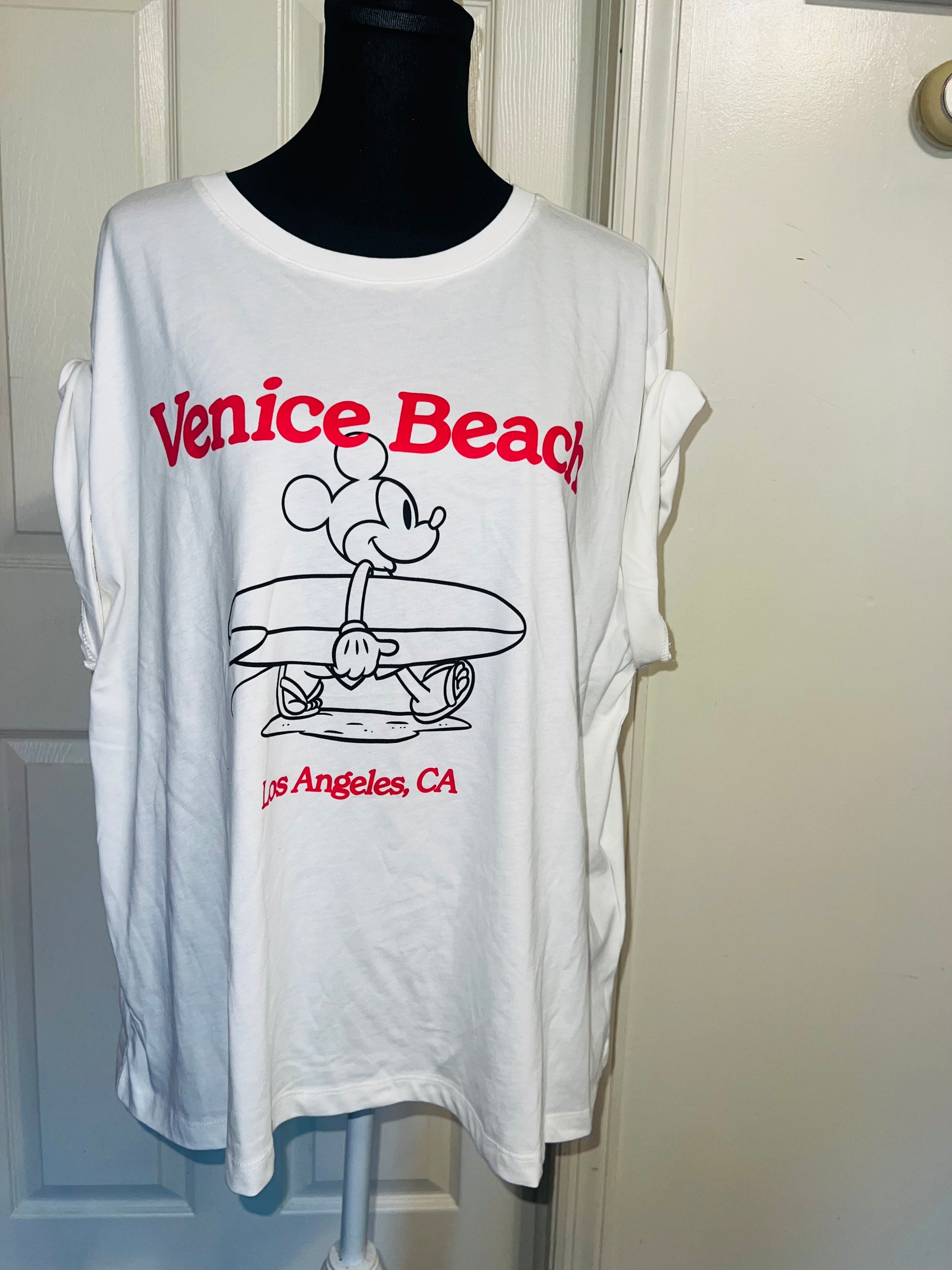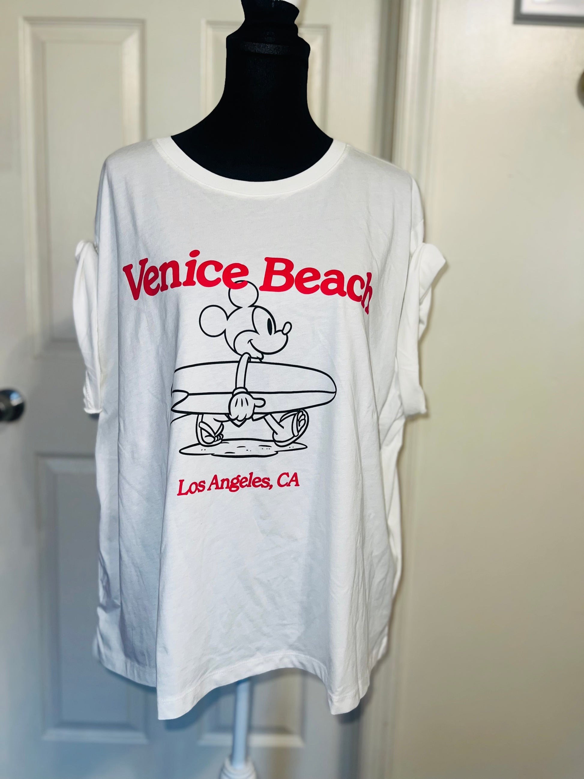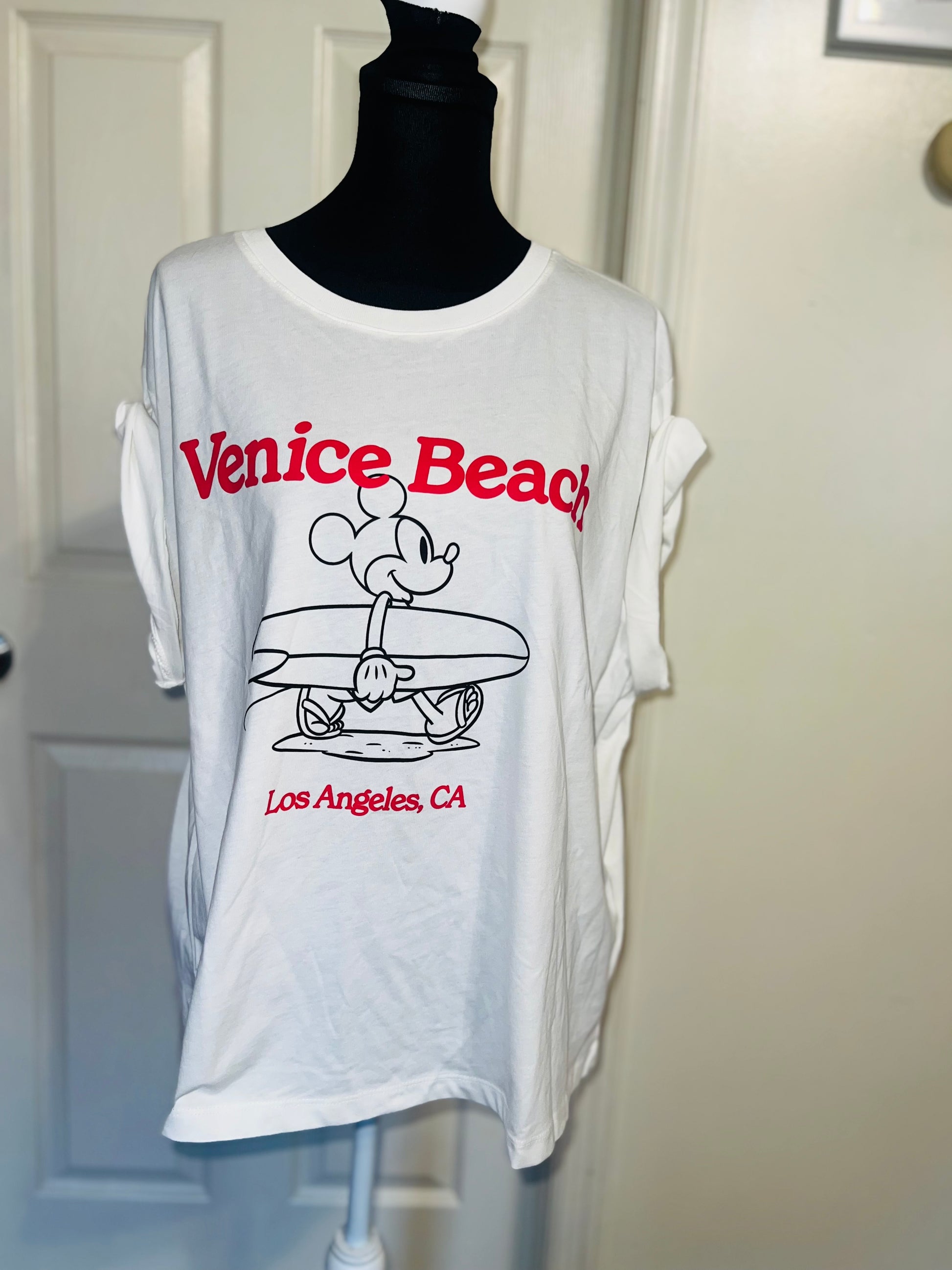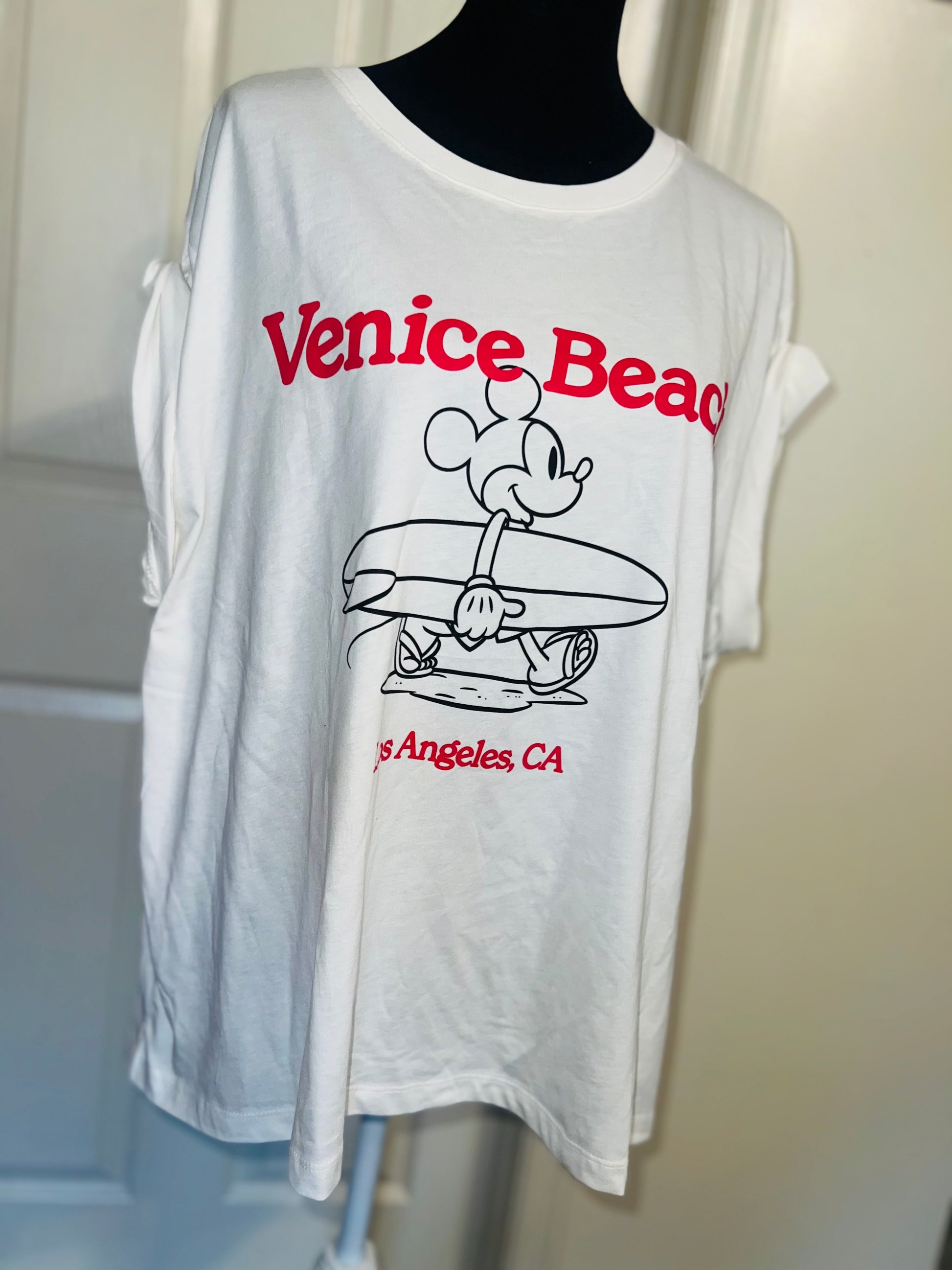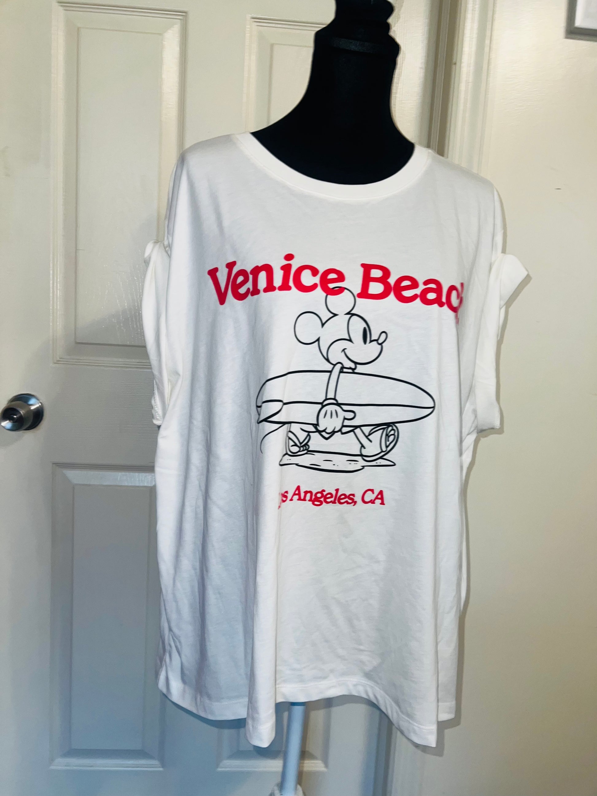 A white and red Mickey Mouse surf board tee with Venice, Beach & Los Angeles, California underneath! Super cute. Not long enough like a dress, but not cropped. Size L, oversized.