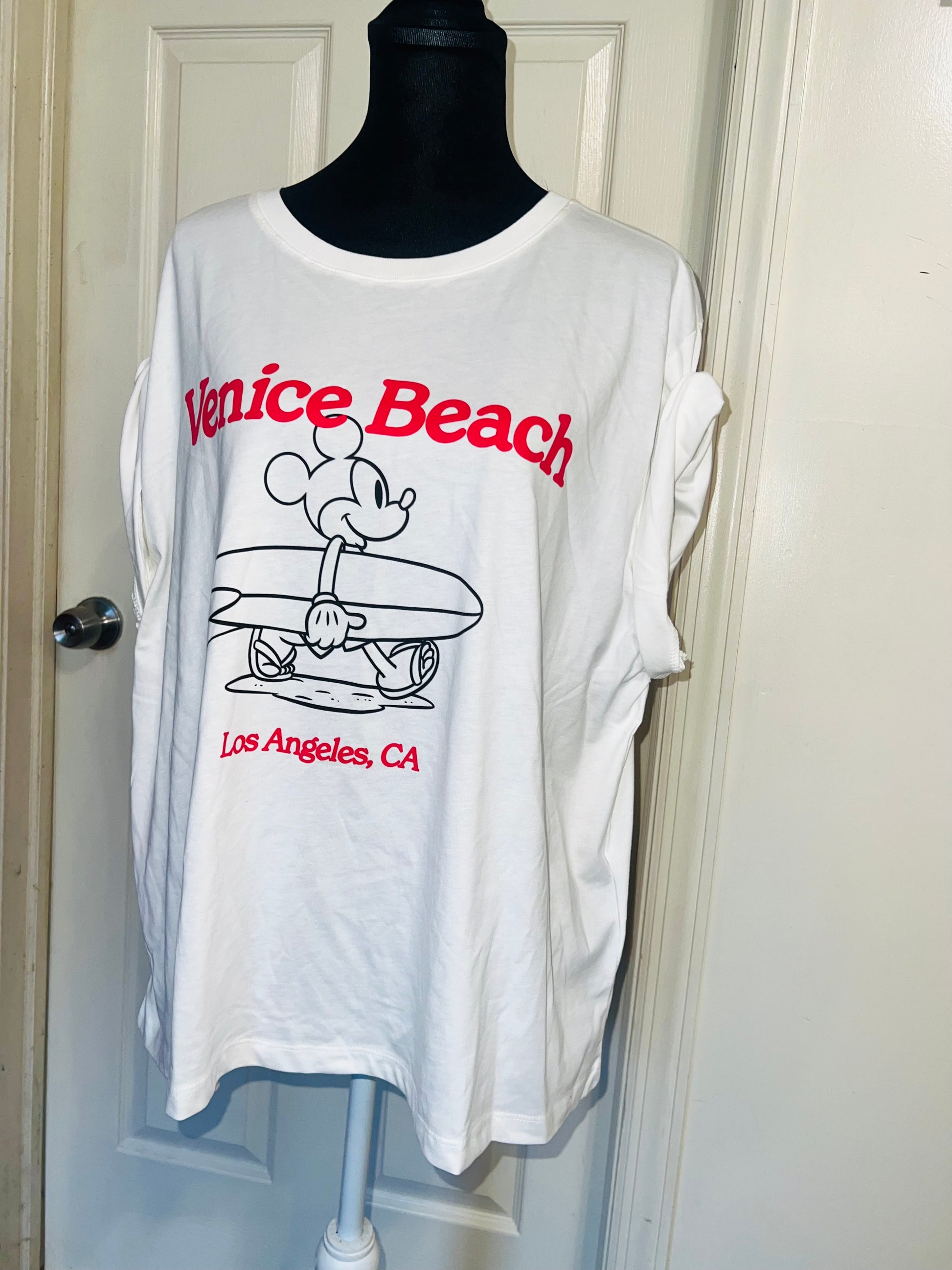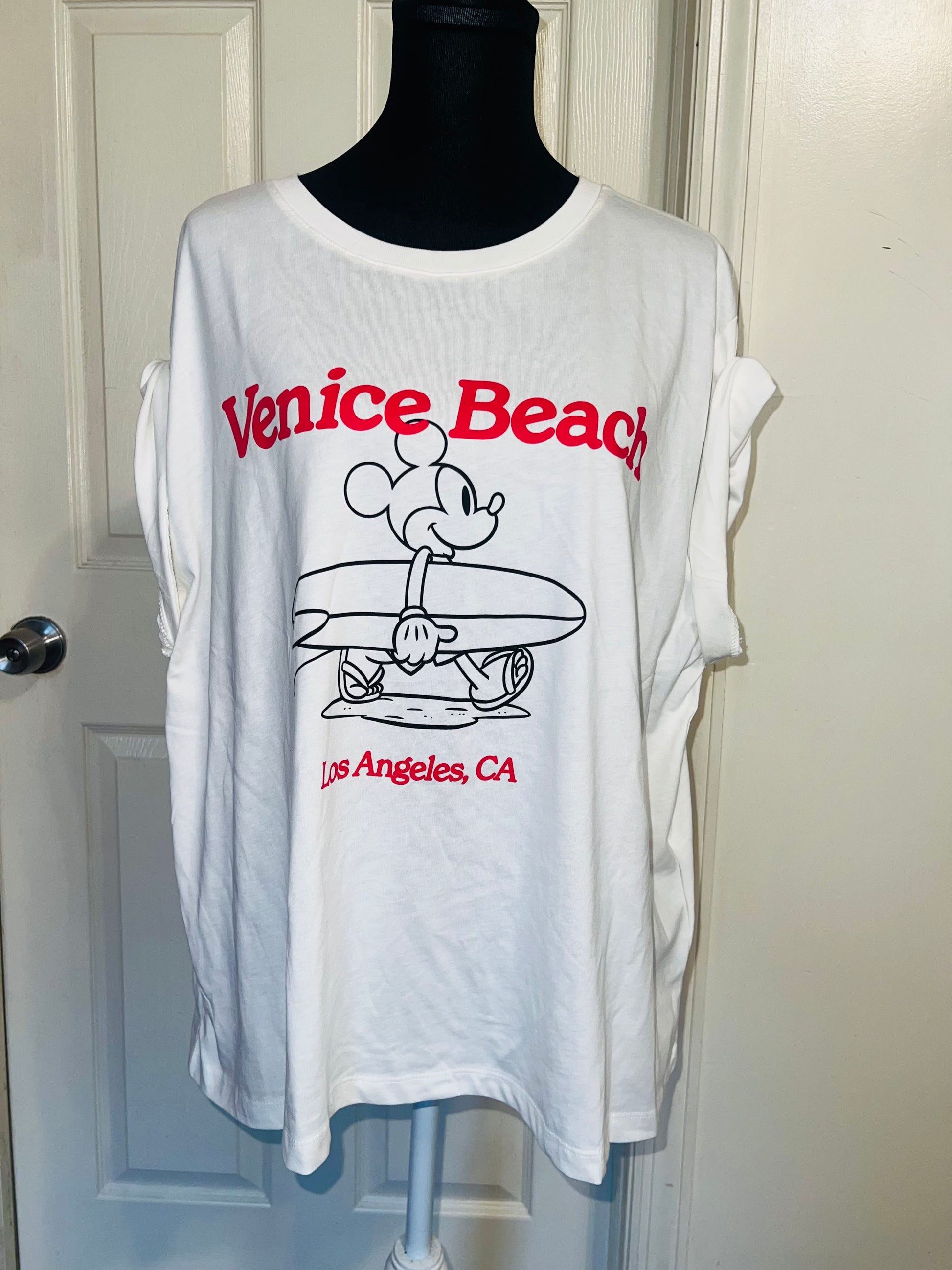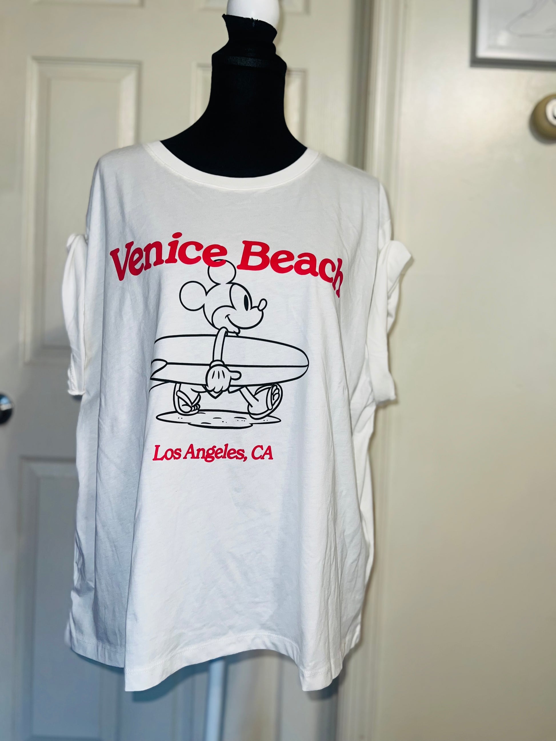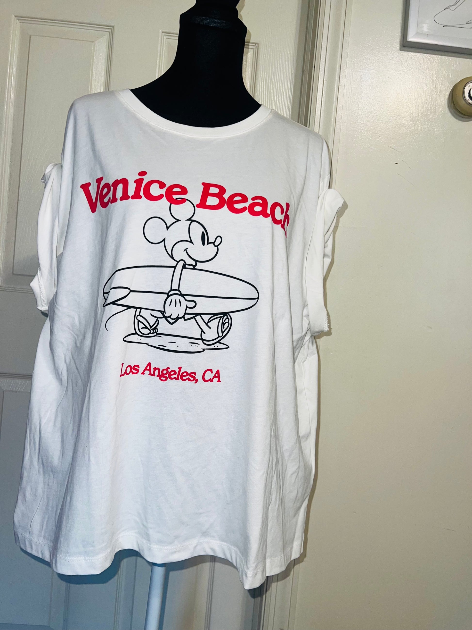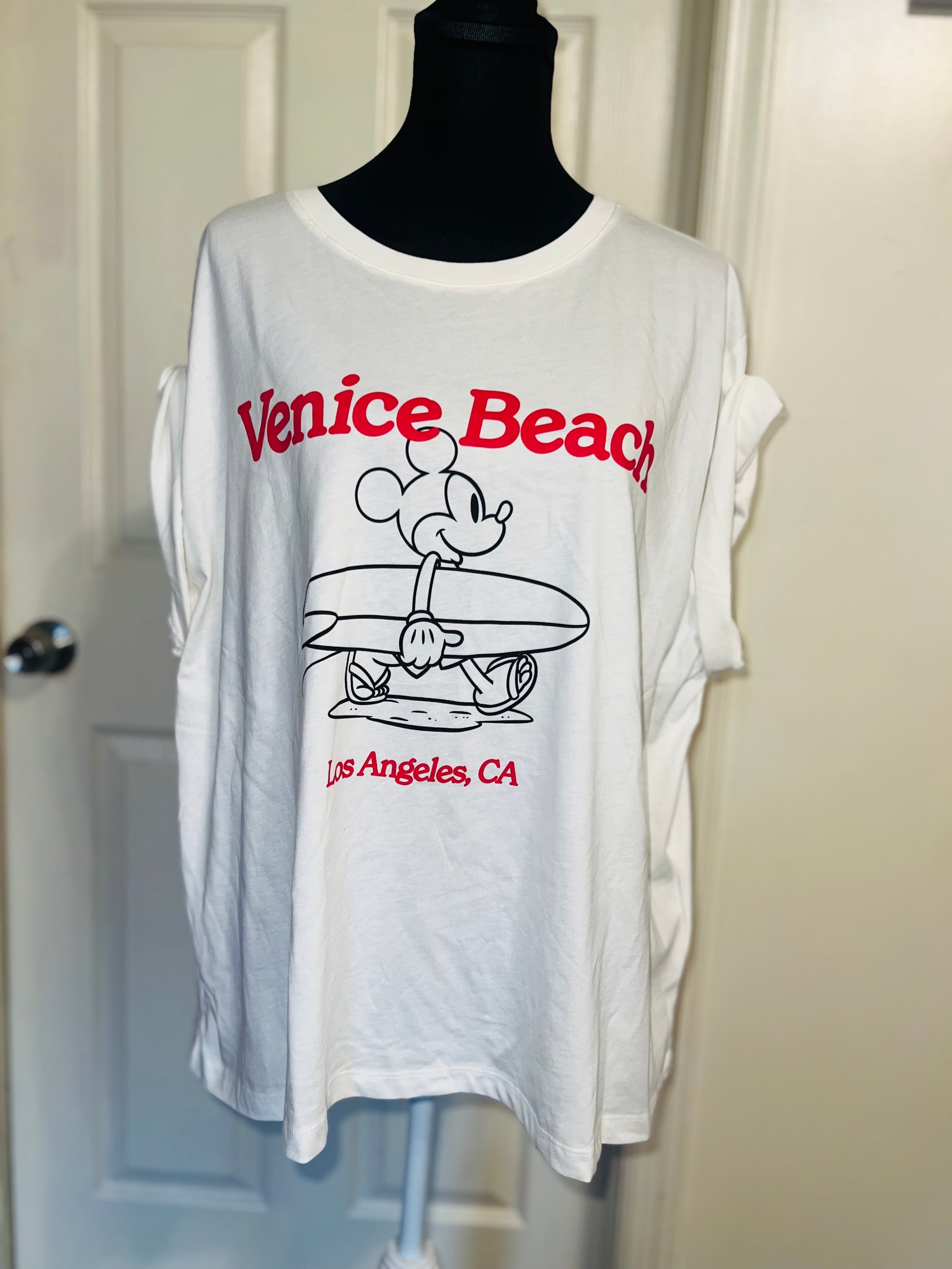 A white and red Mickey Mouse surf board tee with Venice, Beach & Los Angeles, California underneath! Super cute. Not long enough like a dress, but not cropped. Size L, oversized.