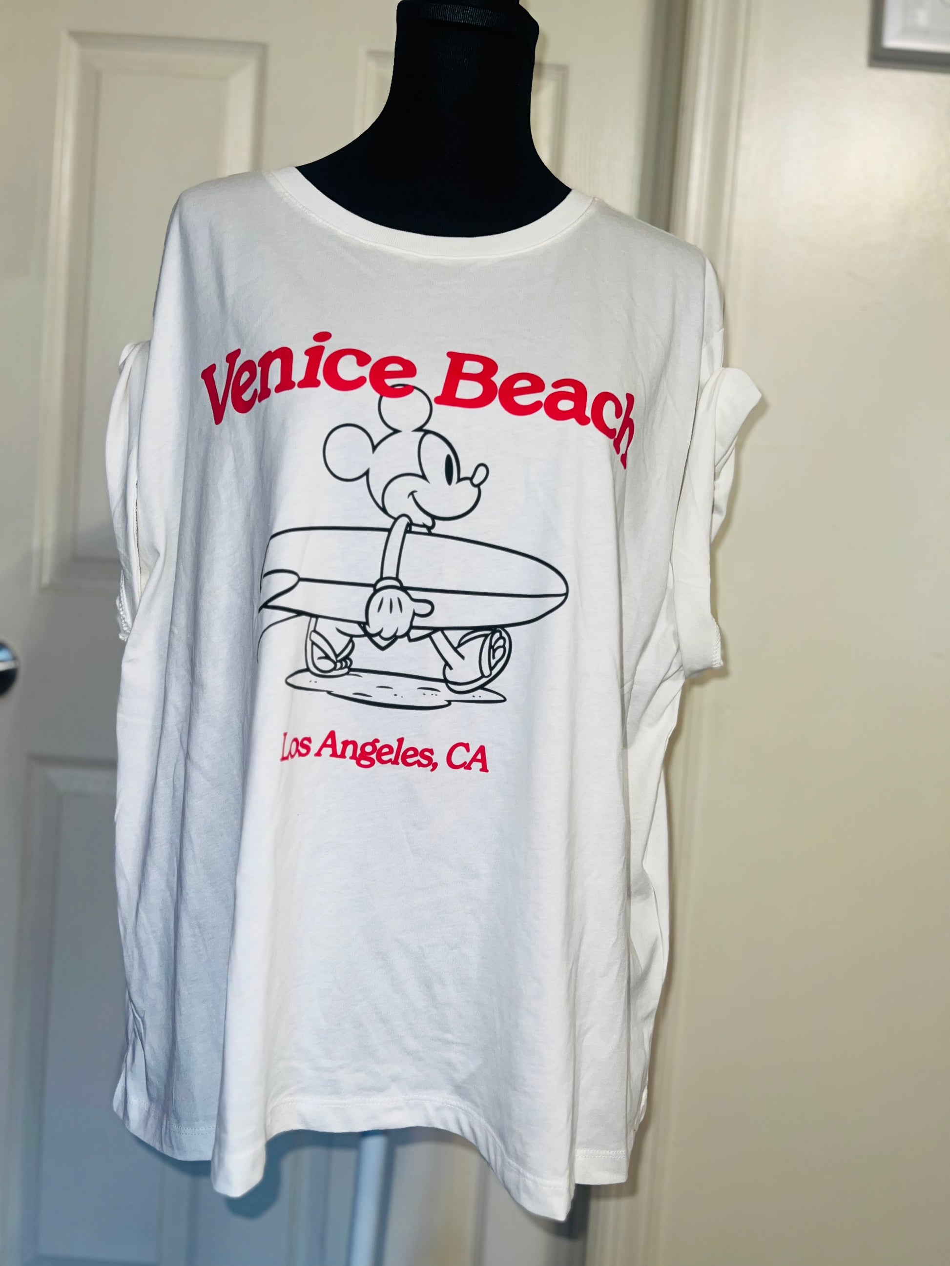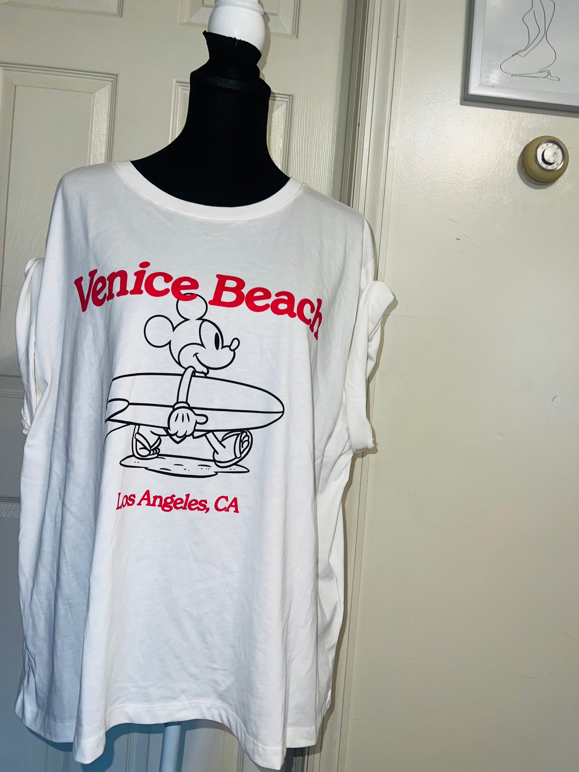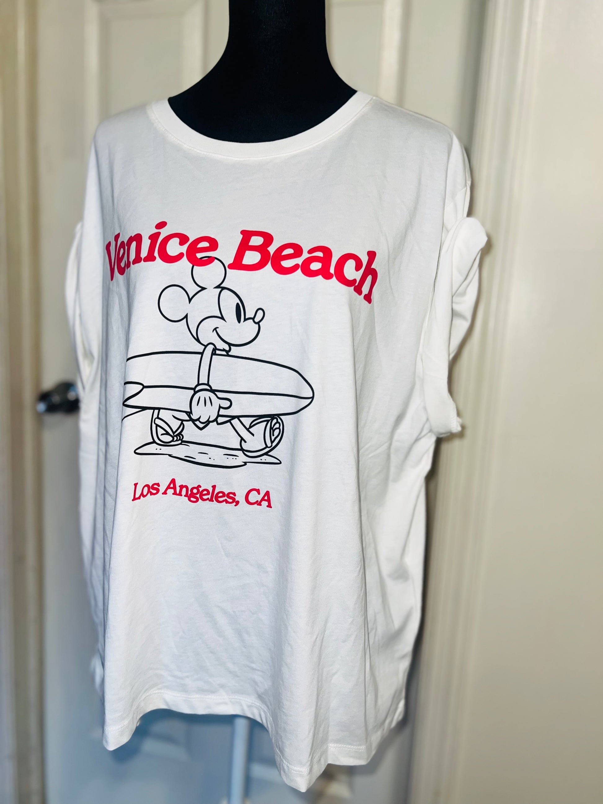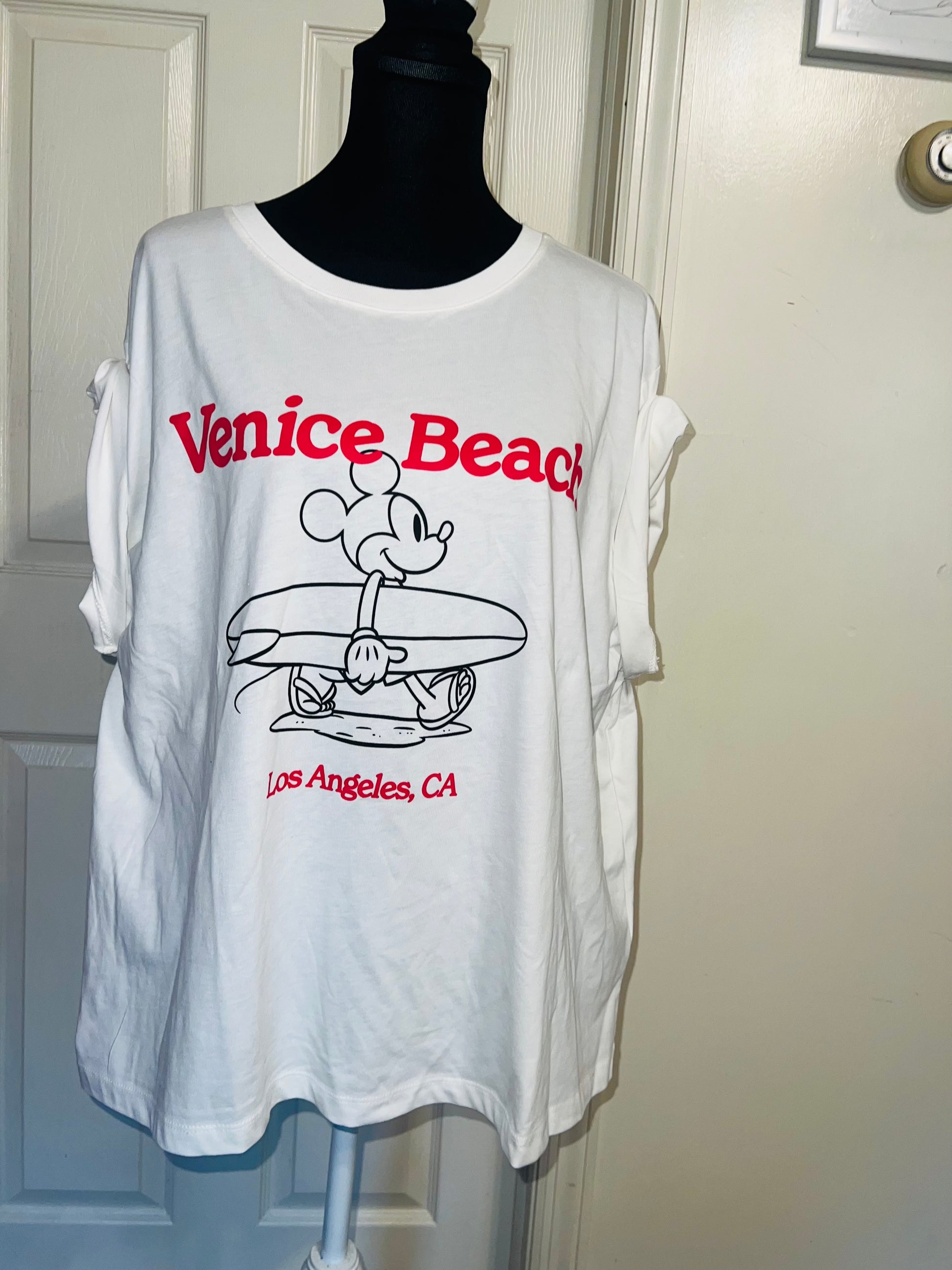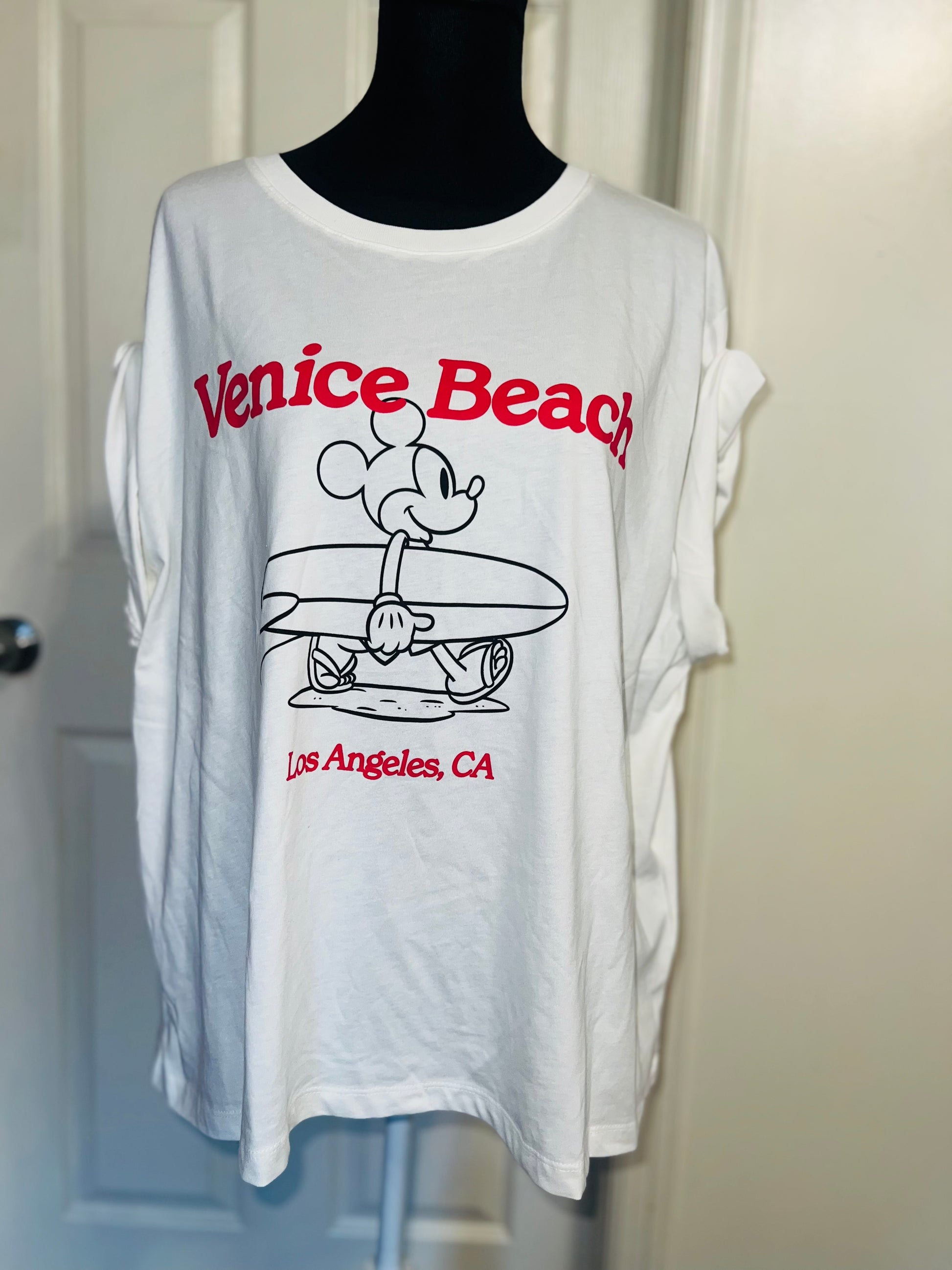 A white and red Mickey Mouse surf board tee with Venice, Beach & Los Angeles, California underneath! Super cute. Not long enough like a dress, but not cropped. Size L, oversized.