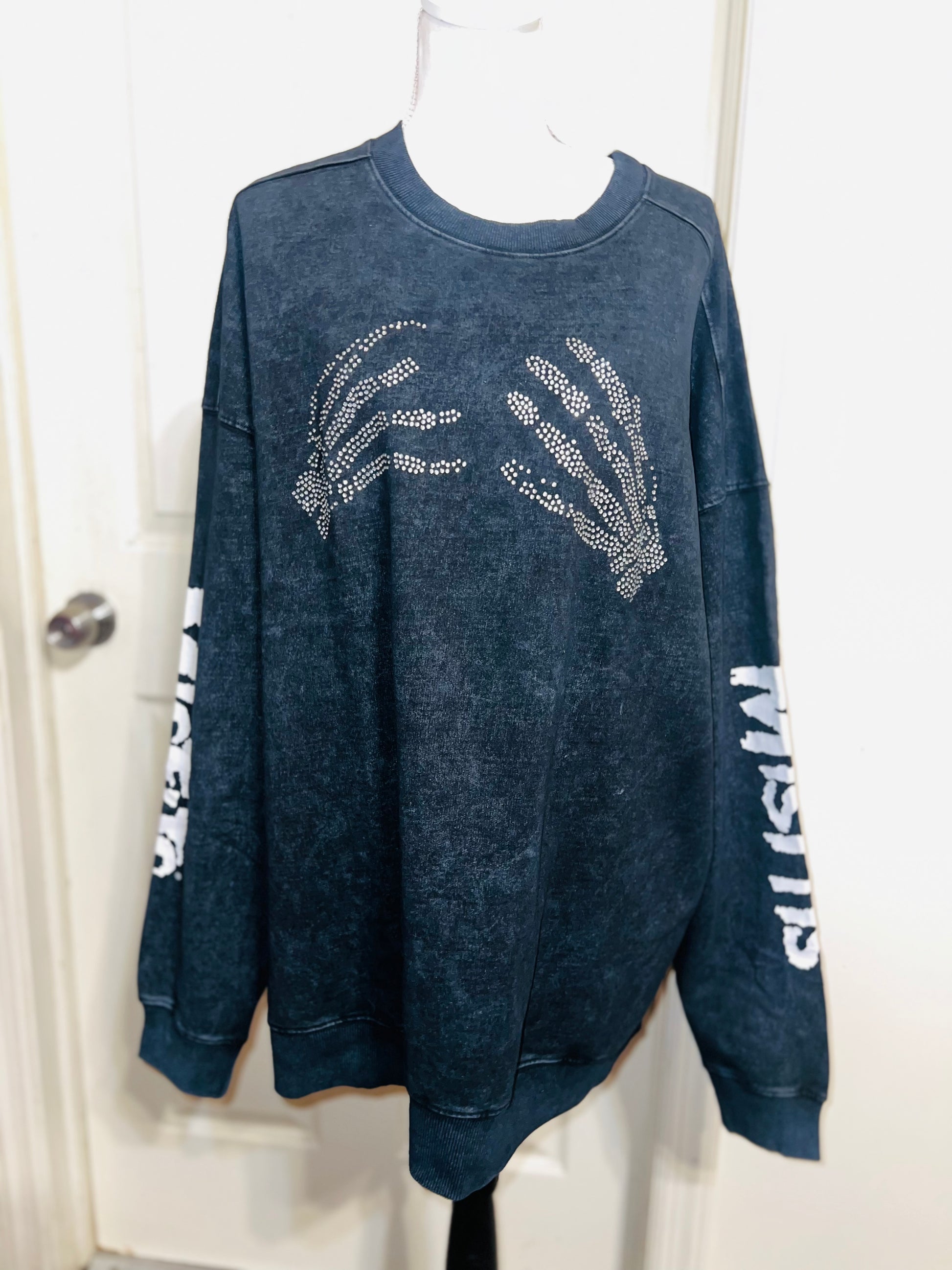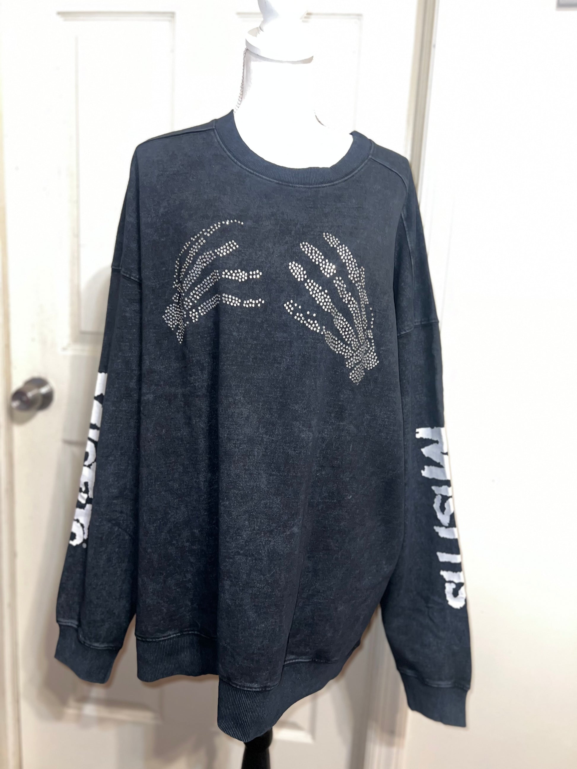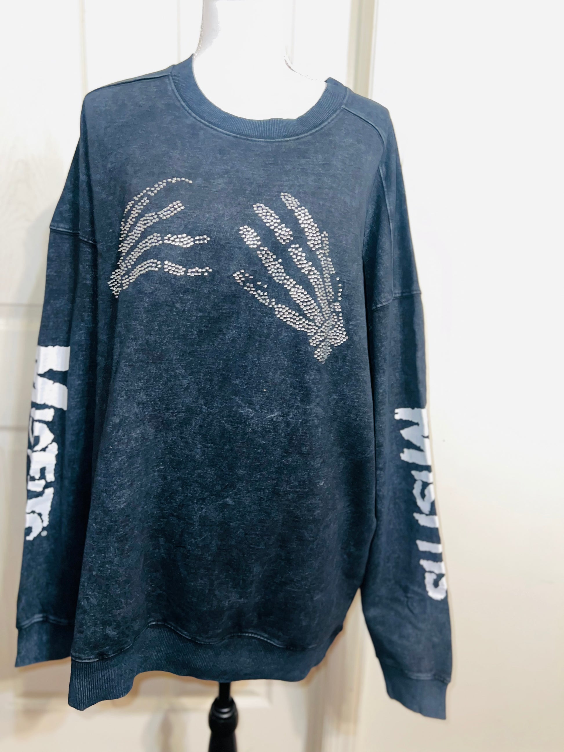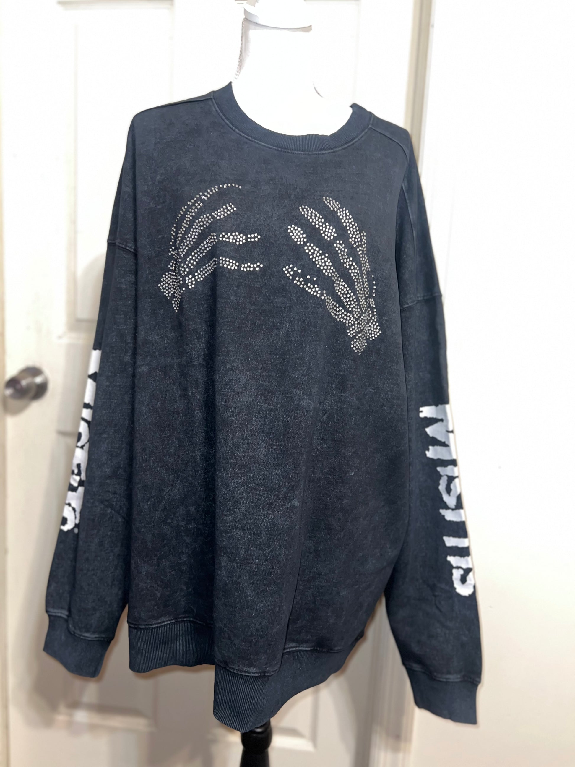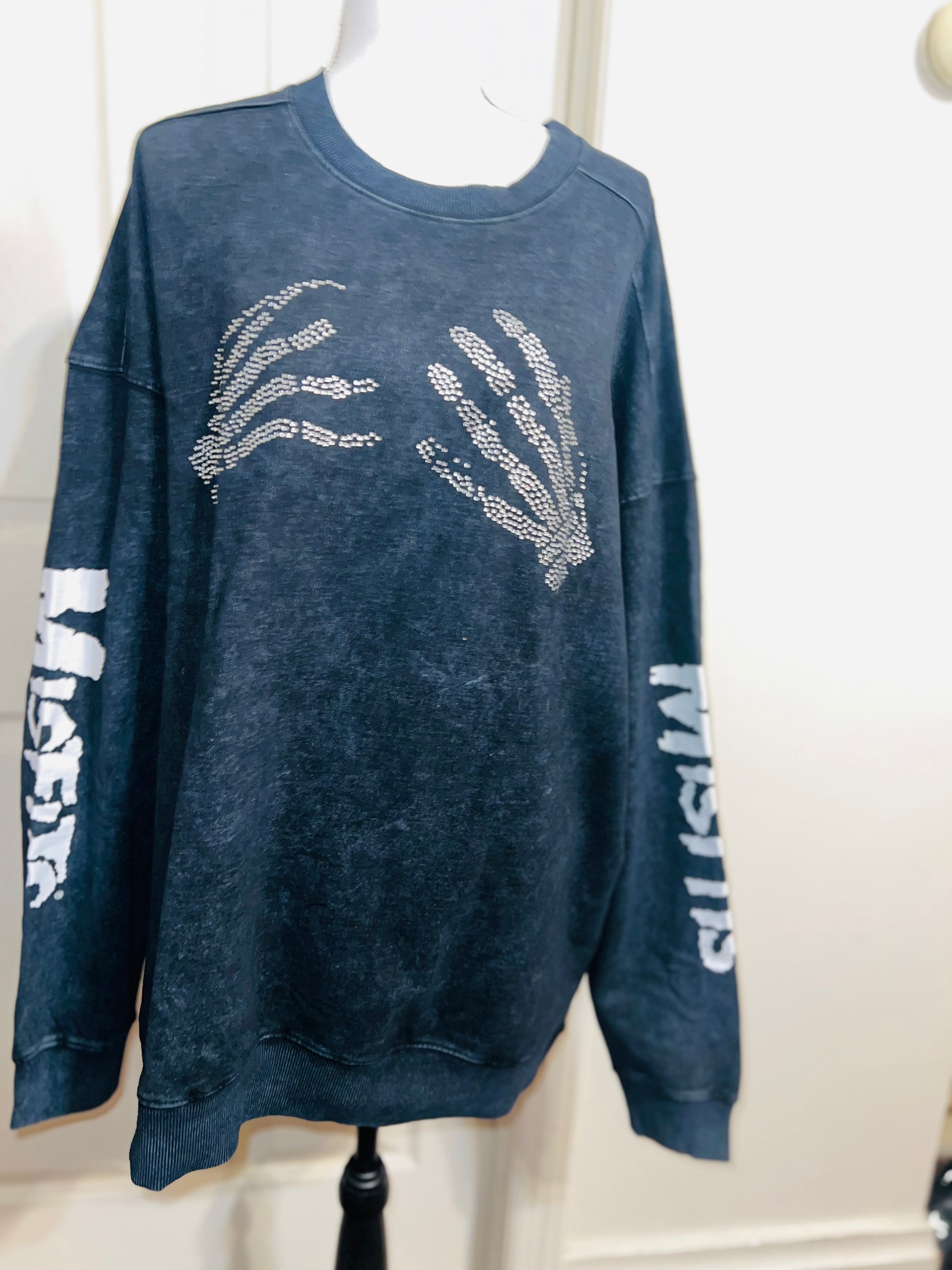 This is now a preorder. Please allow extra processing time. A charcoal grey mineral washed Misfits sweatshirt with the skeleton hands with some gem detailing. Misfits down both of the sleeves. Size S/M, oversized. Super comfy!