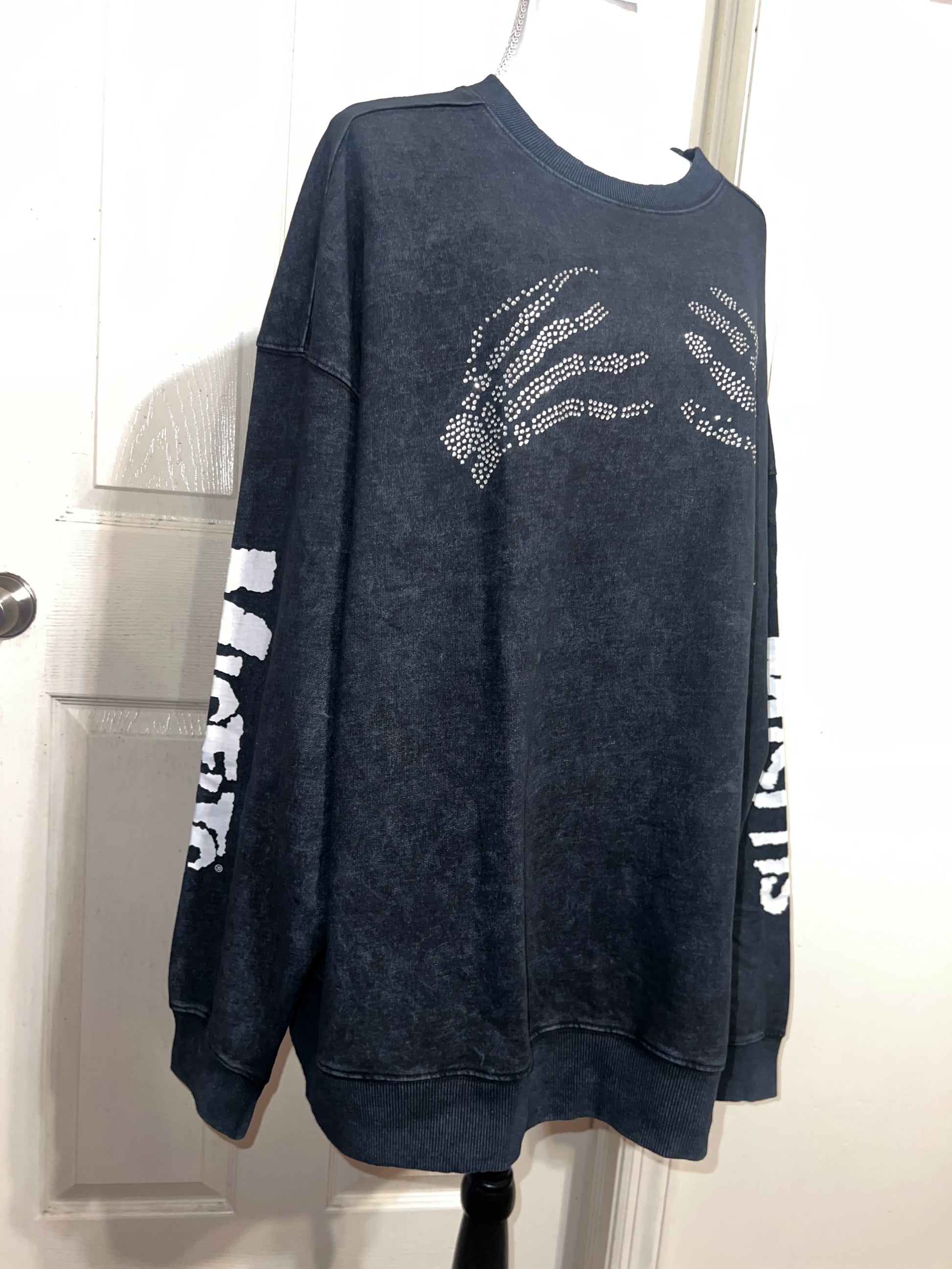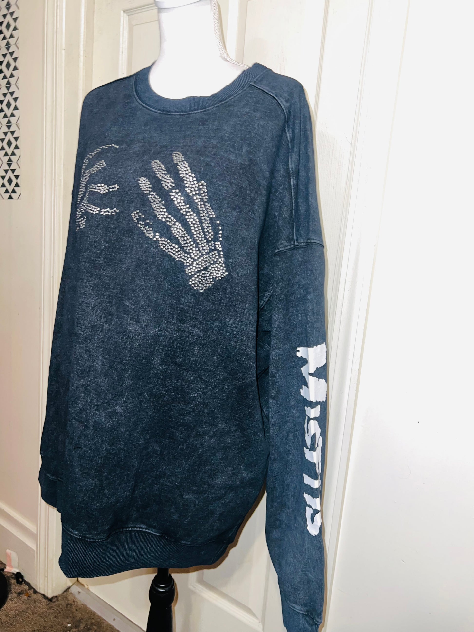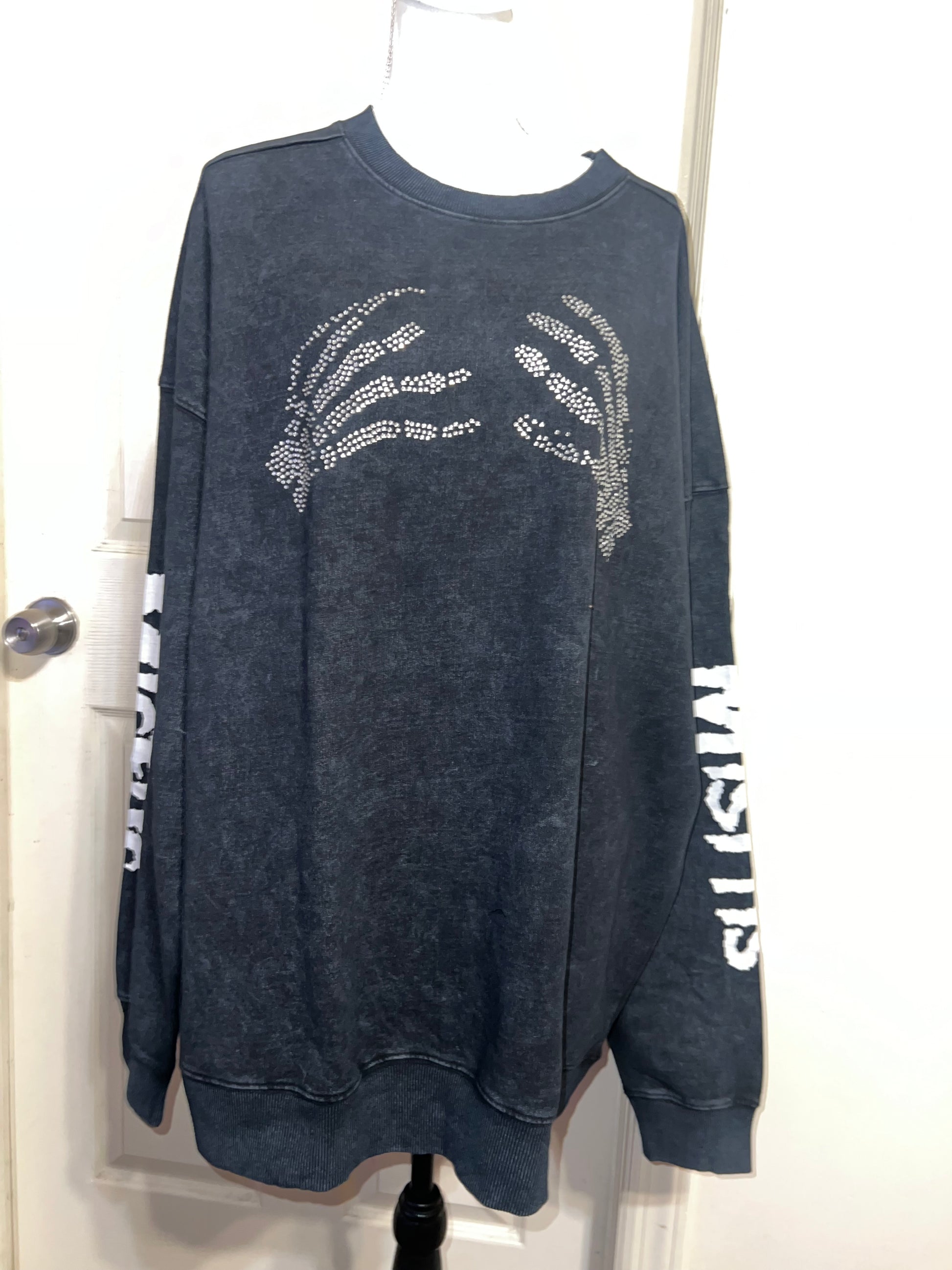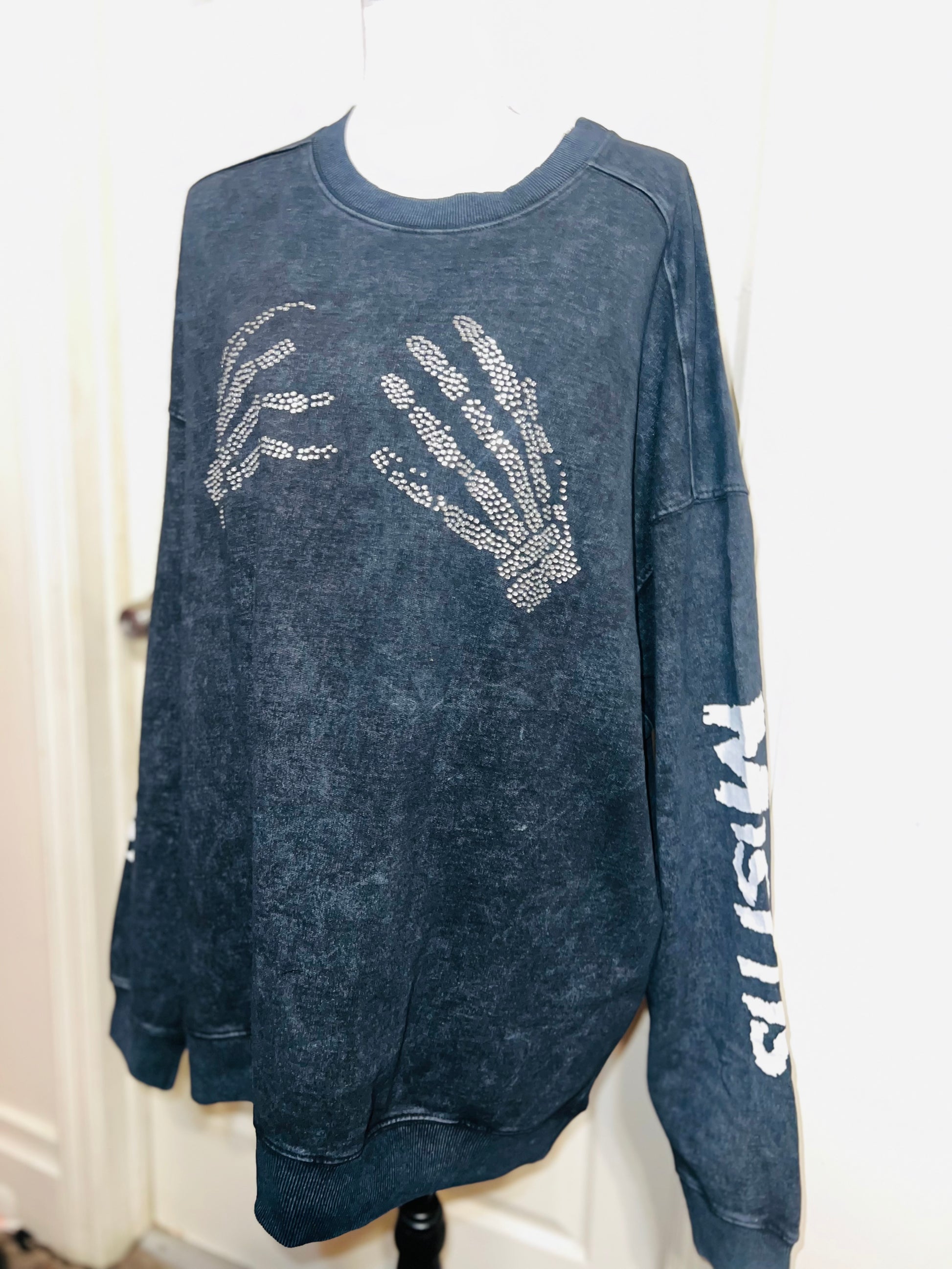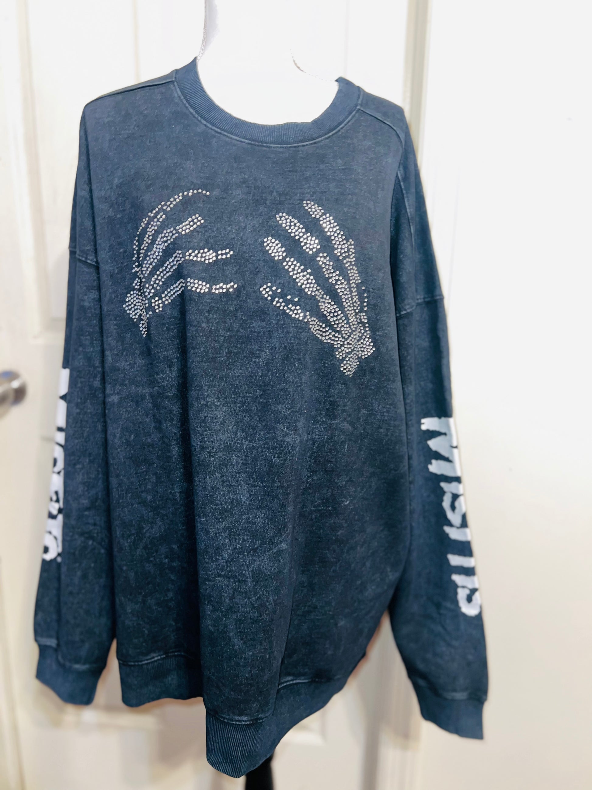 This is now a preorder. Please allow extra processing time. A charcoal grey mineral washed Misfits sweatshirt with the skeleton hands with some gem detailing. Misfits down both of the sleeves. Size S/M, oversized. Super comfy!