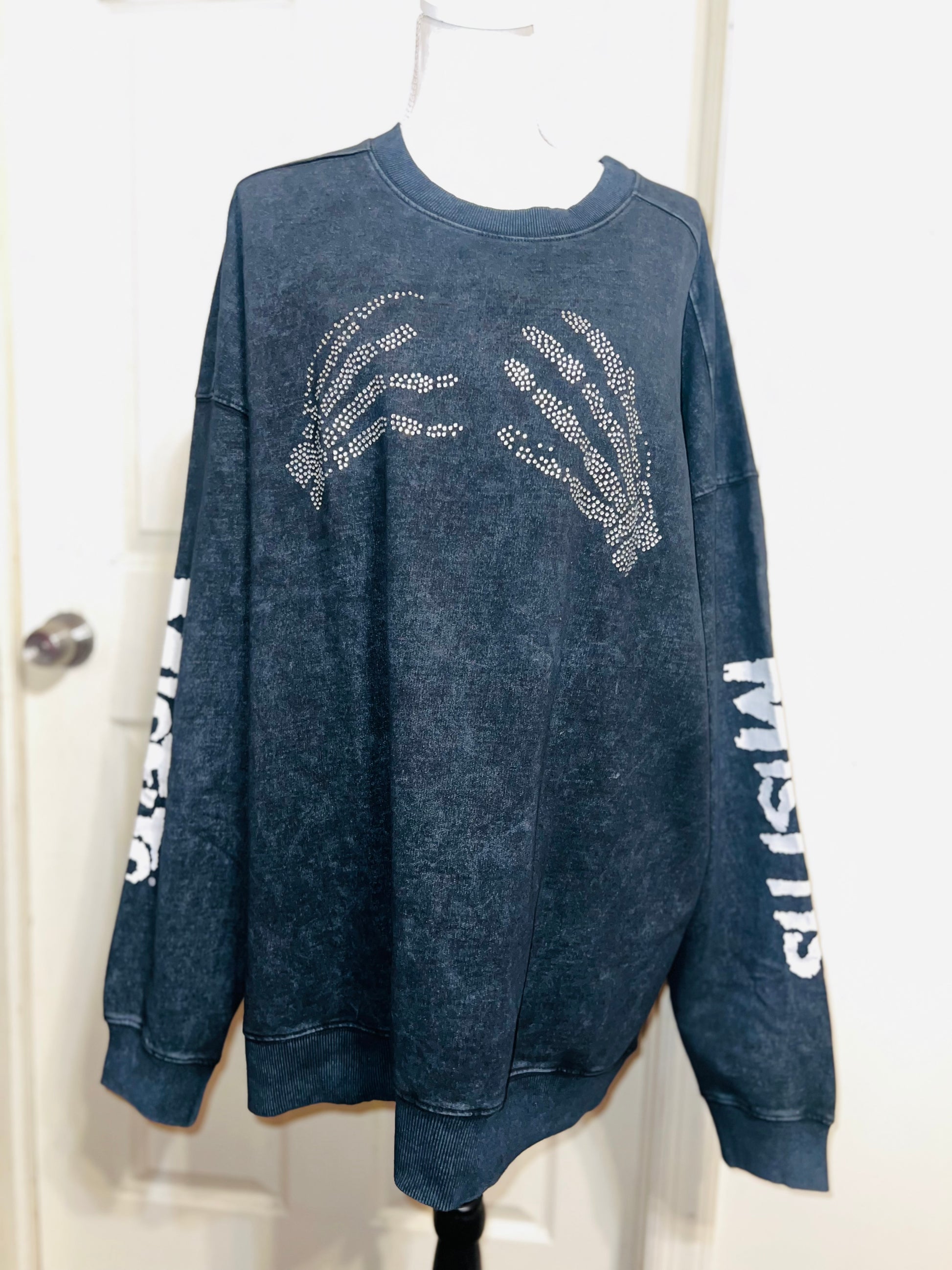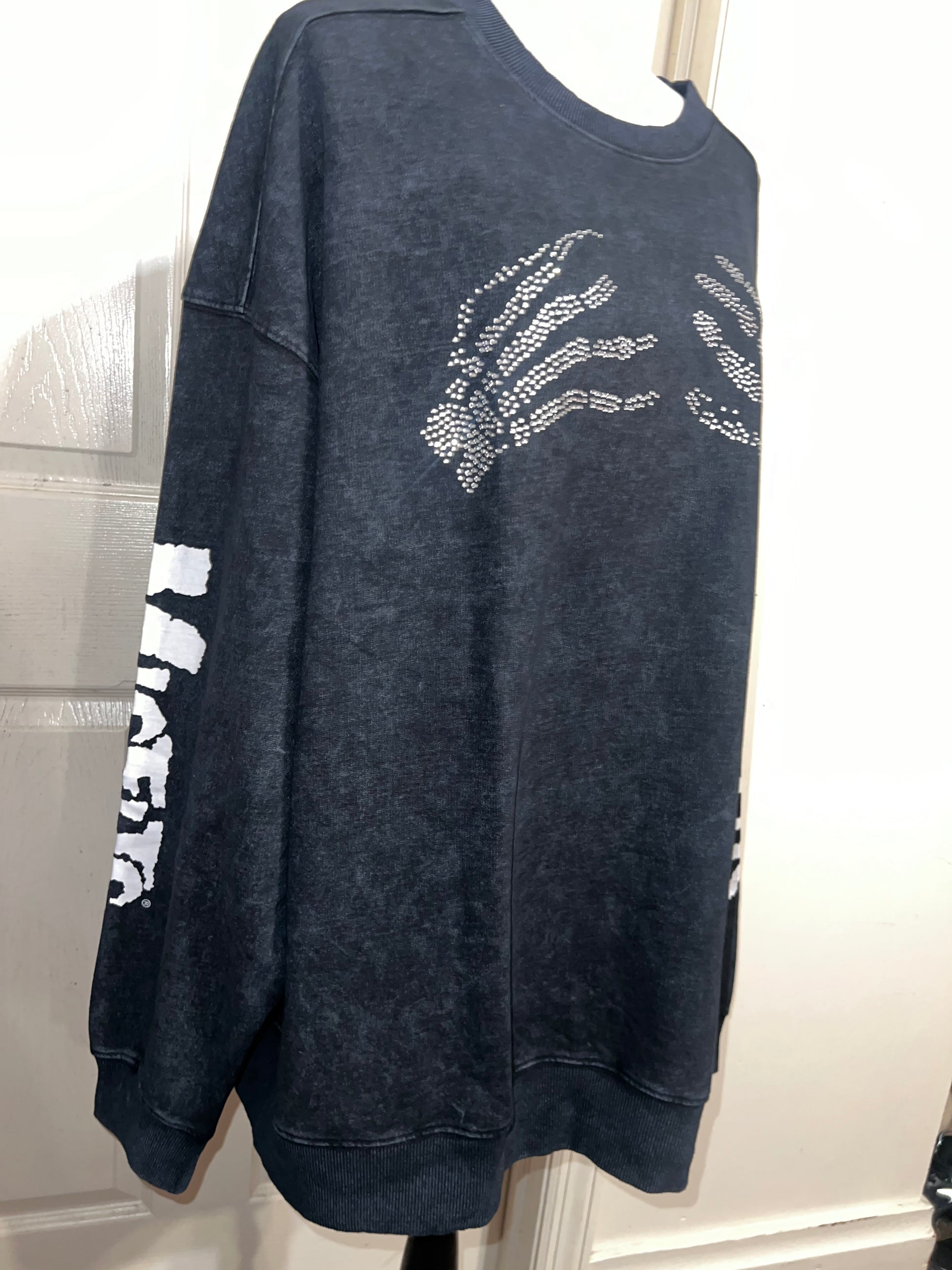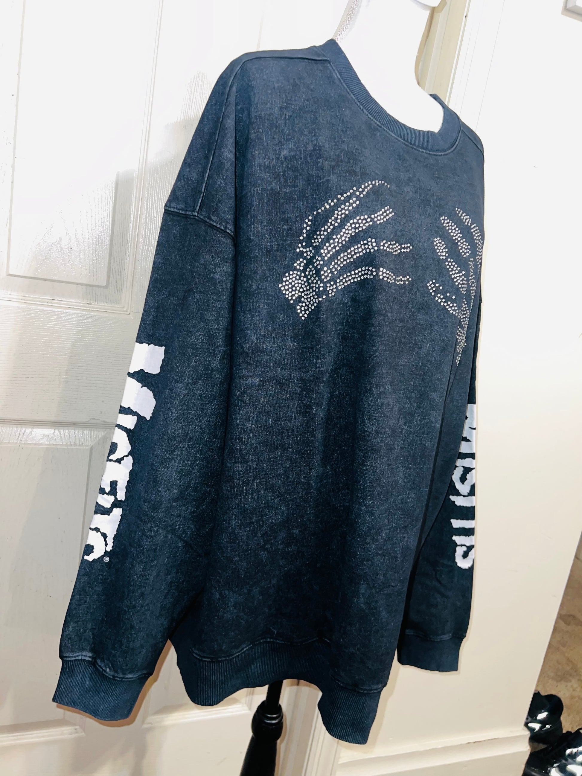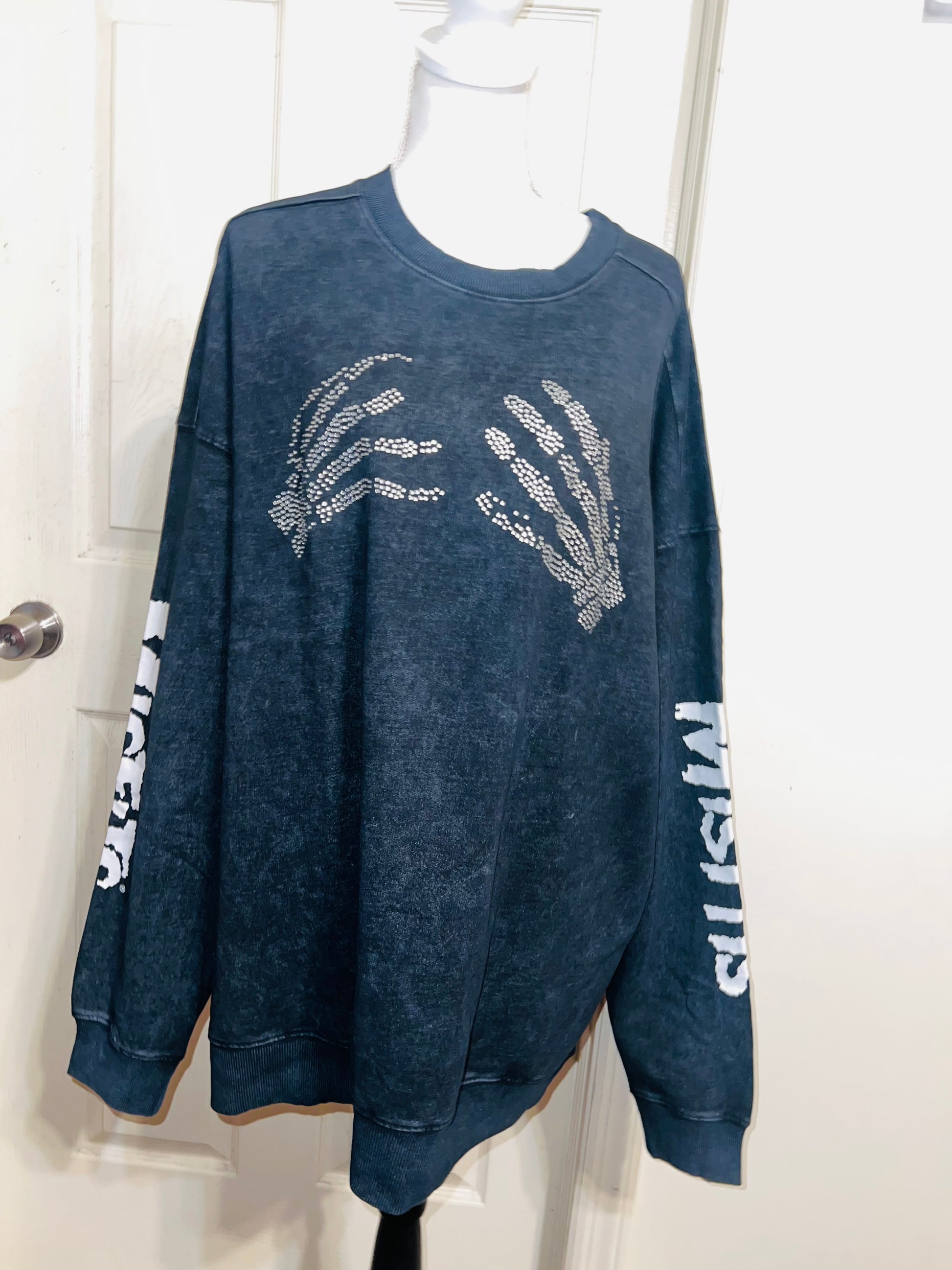 This is now a preorder. Please allow extra processing time. A charcoal grey mineral washed Misfits sweatshirt with the skeleton hands with some gem detailing. Misfits down both of the sleeves. Size S/M, oversized. Super comfy!