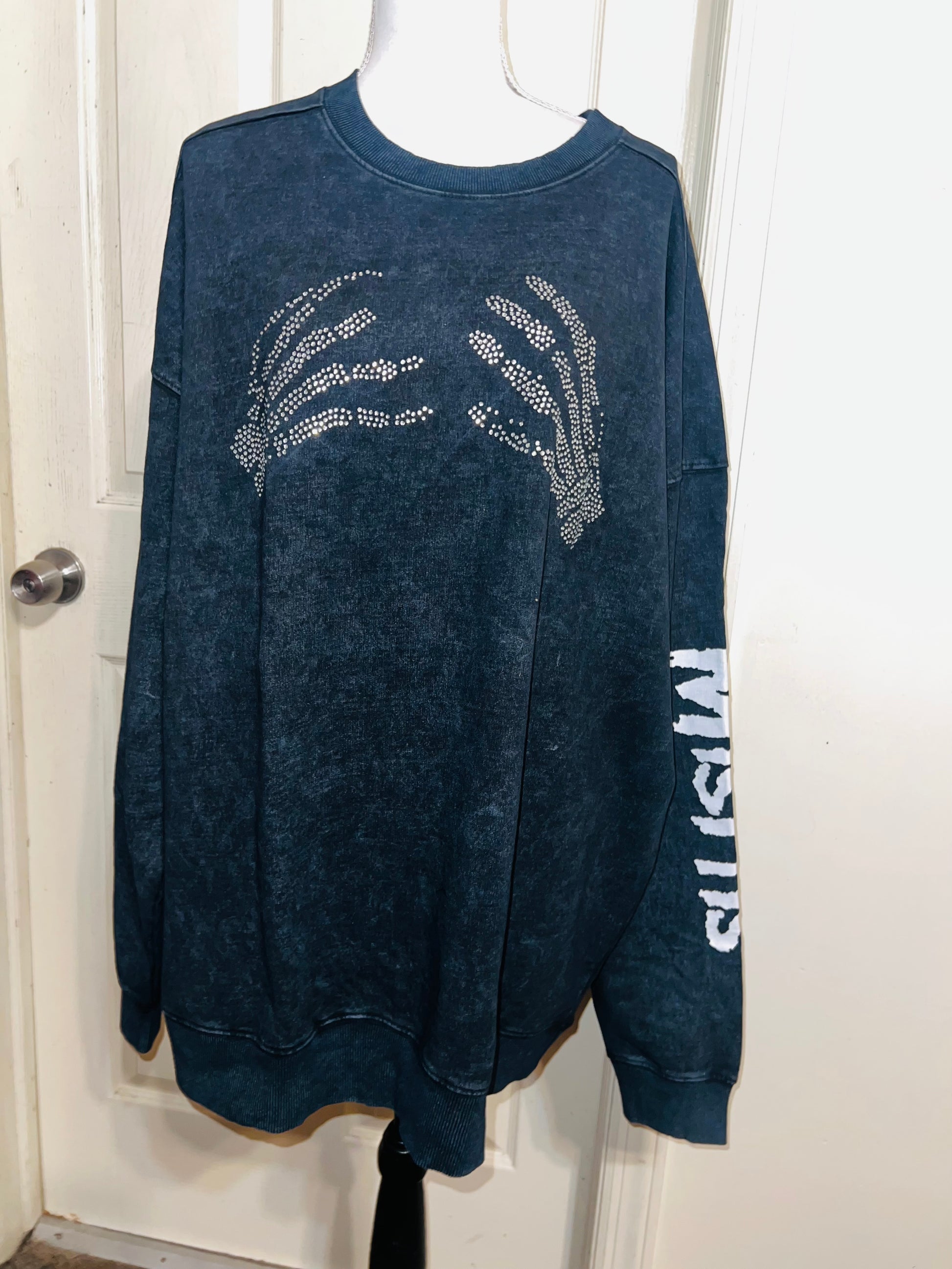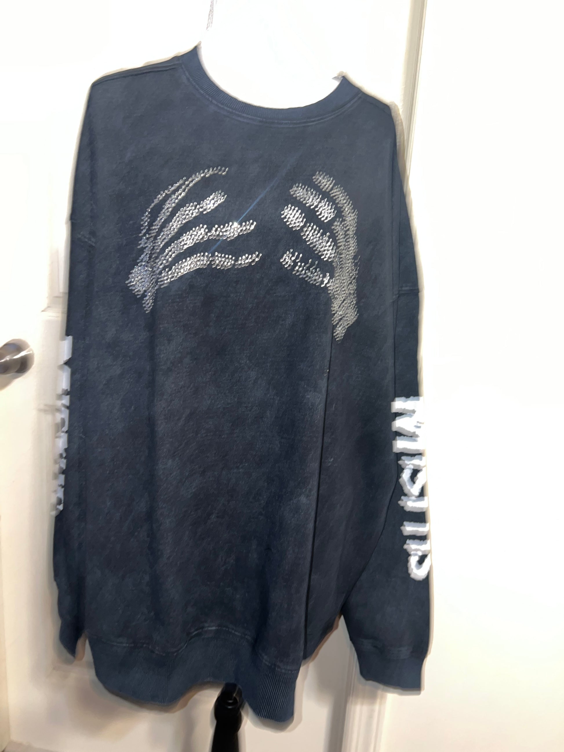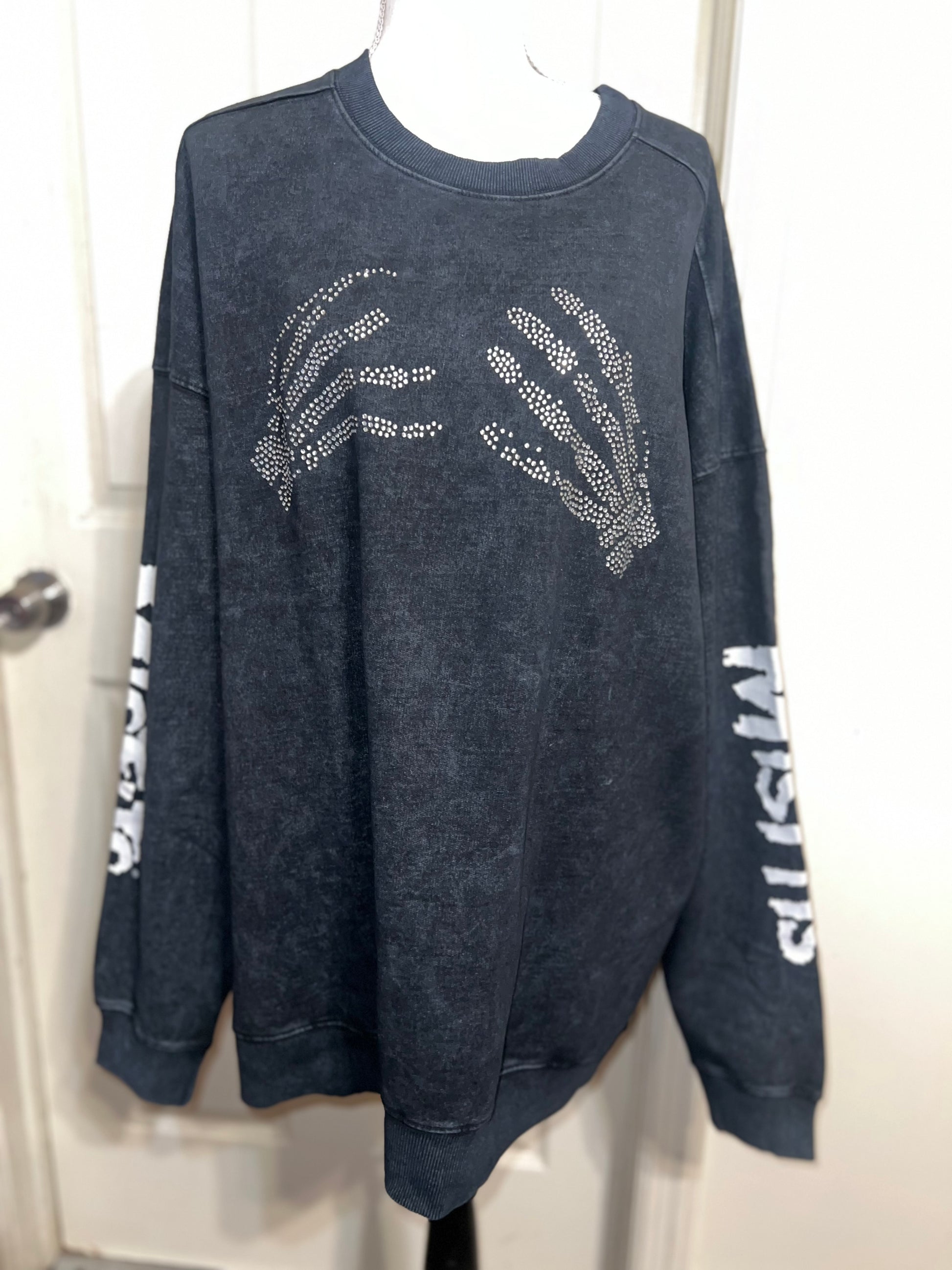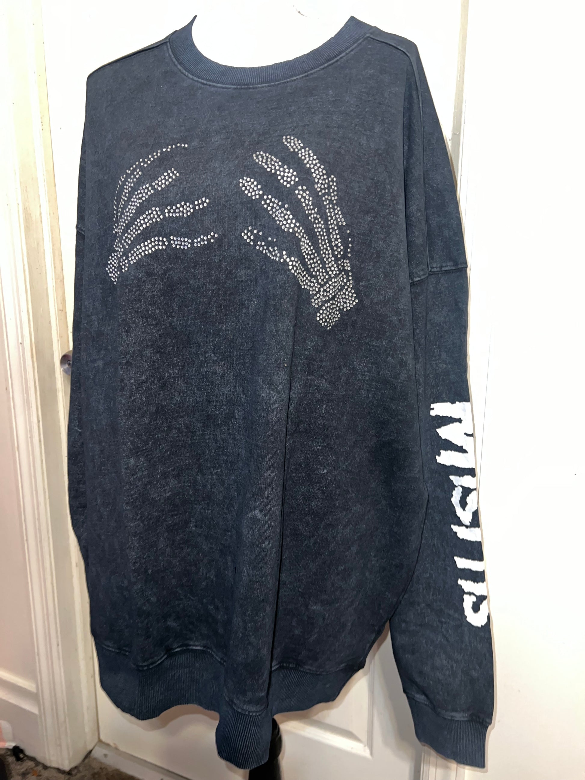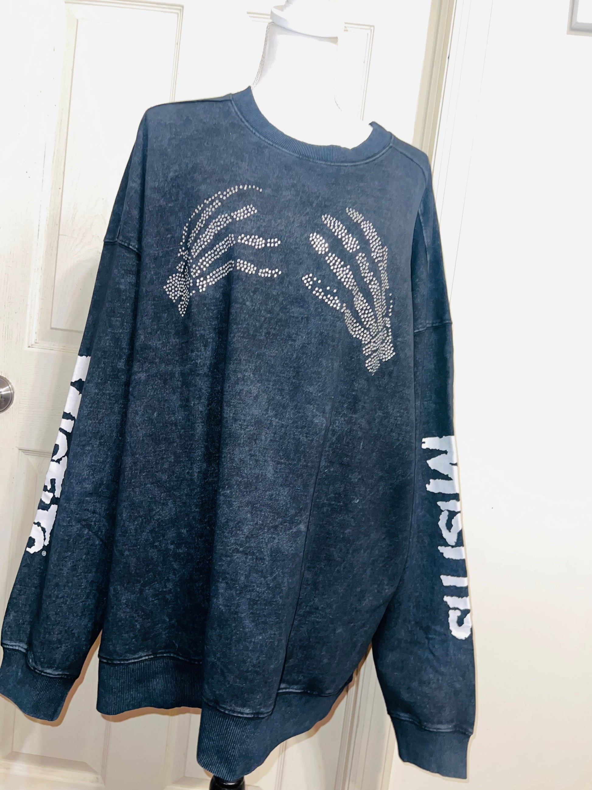 This is now a preorder. Please allow extra processing time. A charcoal grey mineral washed Misfits sweatshirt with the skeleton hands with some gem detailing. Misfits down both of the sleeves. Size S/M, oversized. Super comfy!