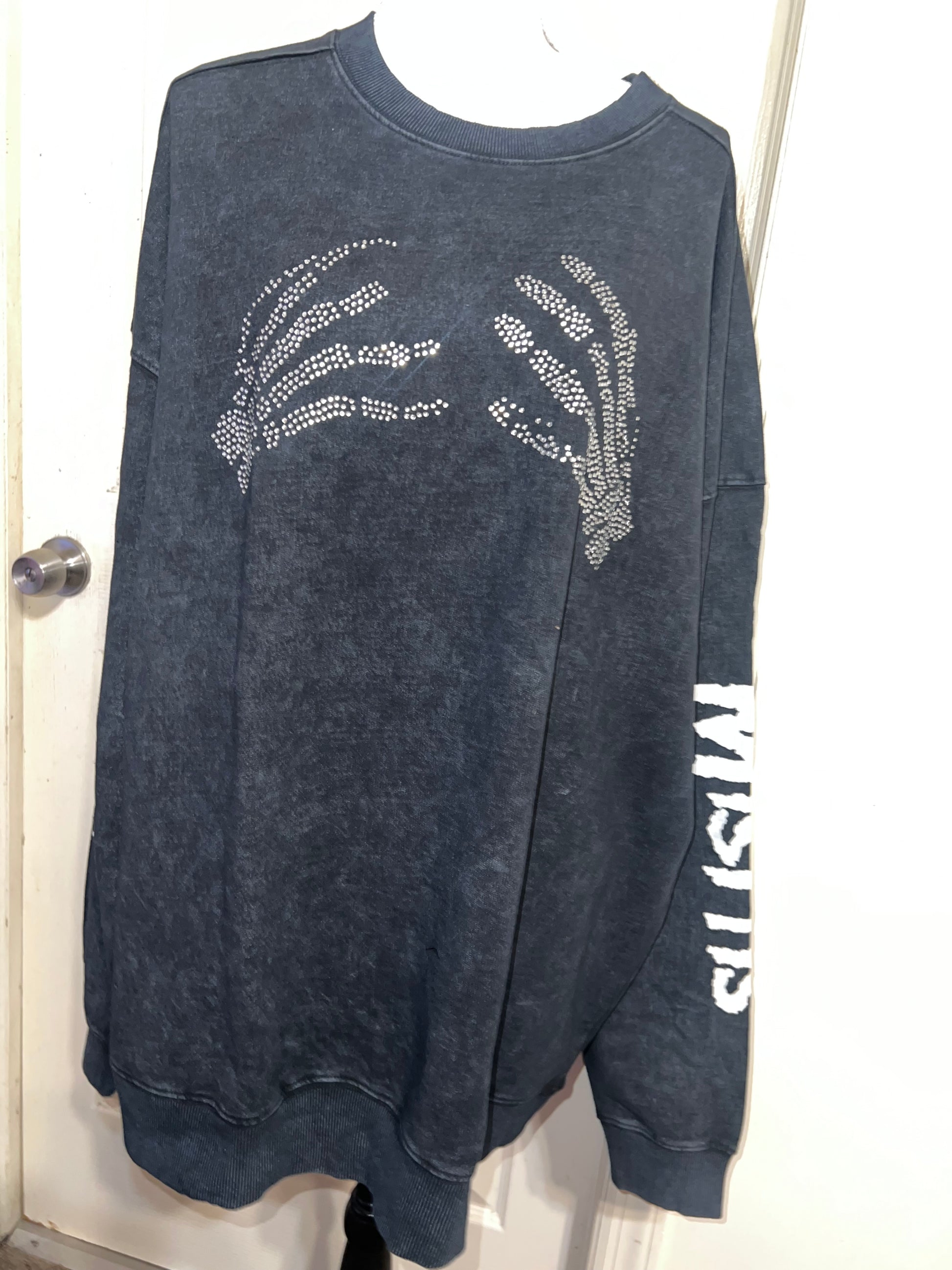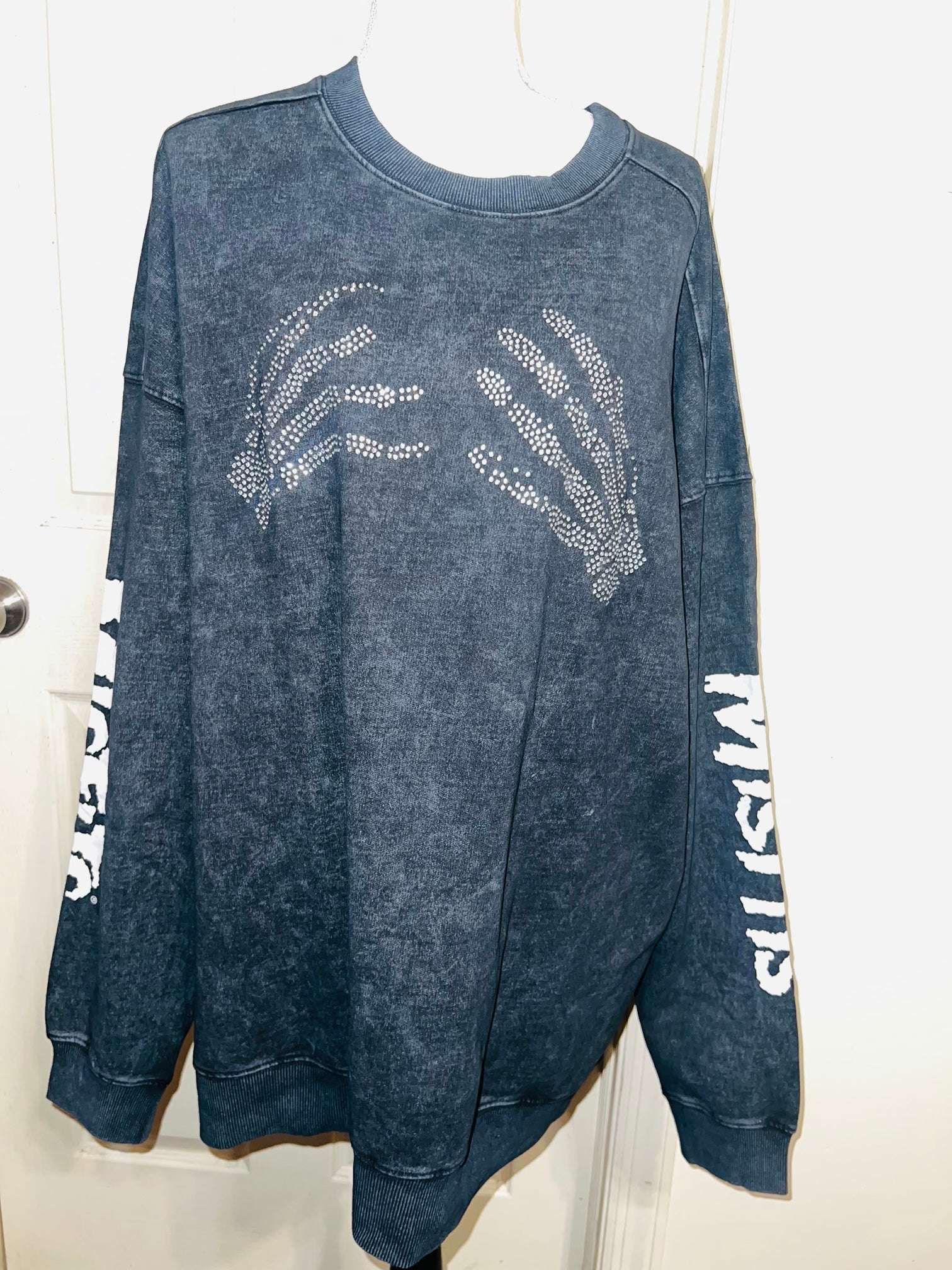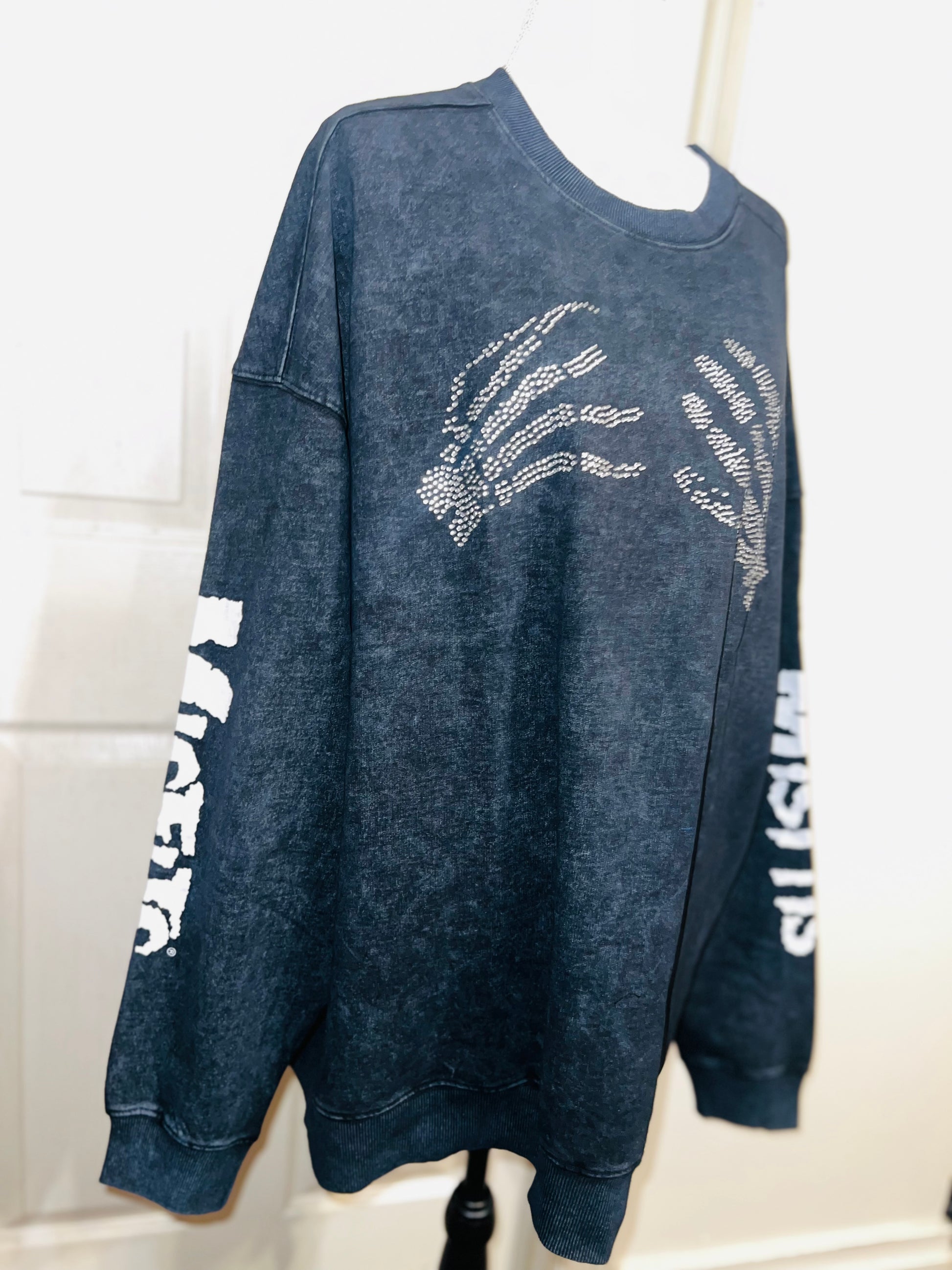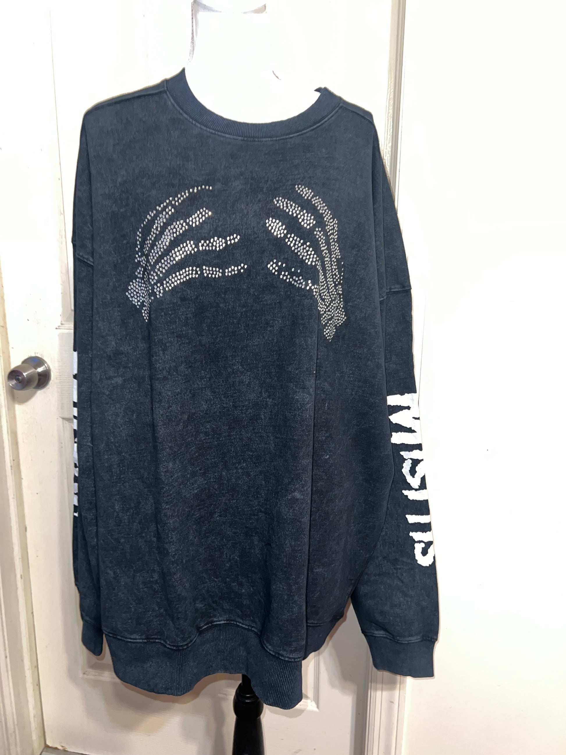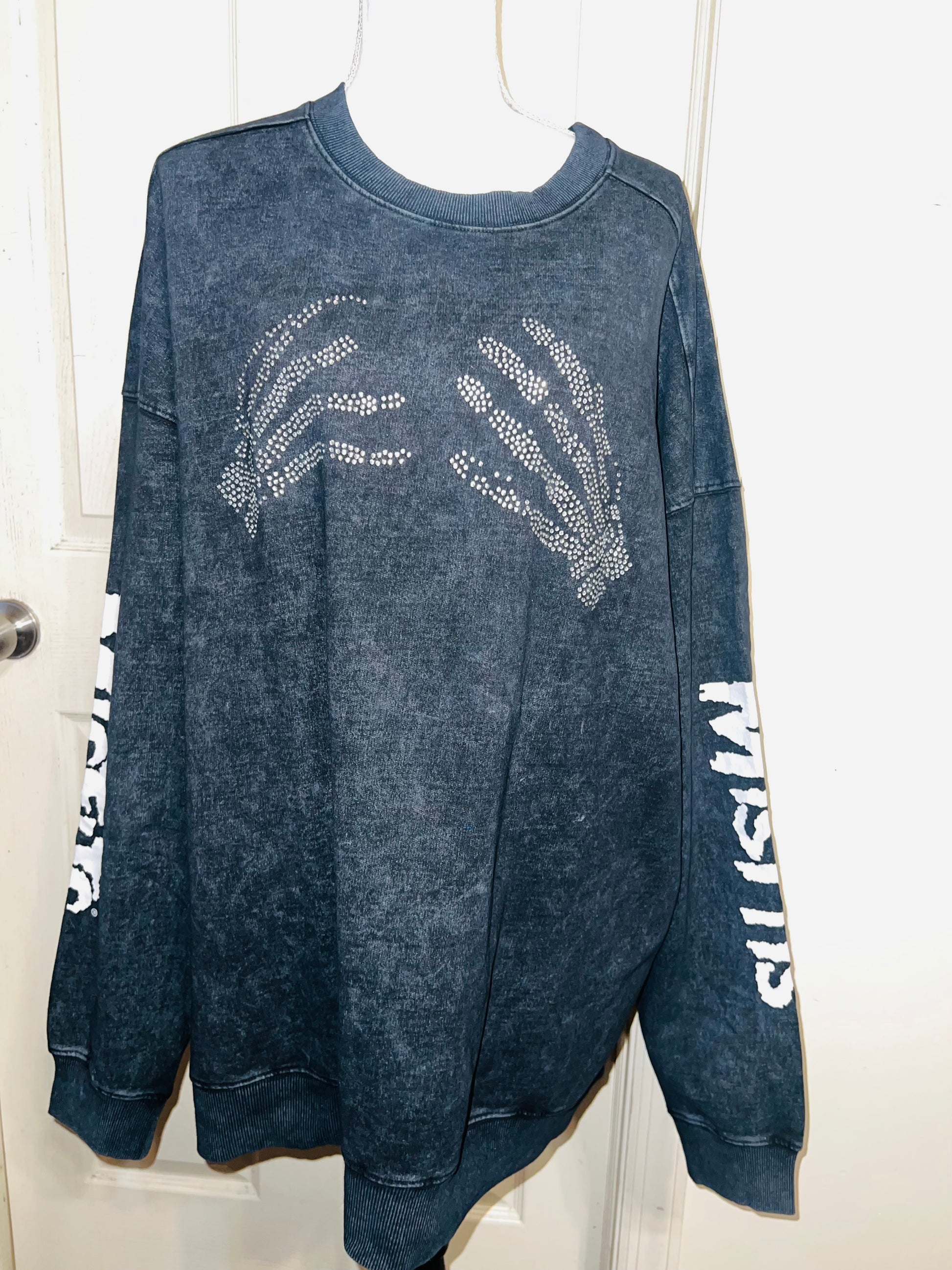 This is now a preorder. Please allow extra processing time. A charcoal grey mineral washed Misfits sweatshirt with the skeleton hands with some gem detailing. Misfits down both of the sleeves. Size S/M, oversized. Super comfy!