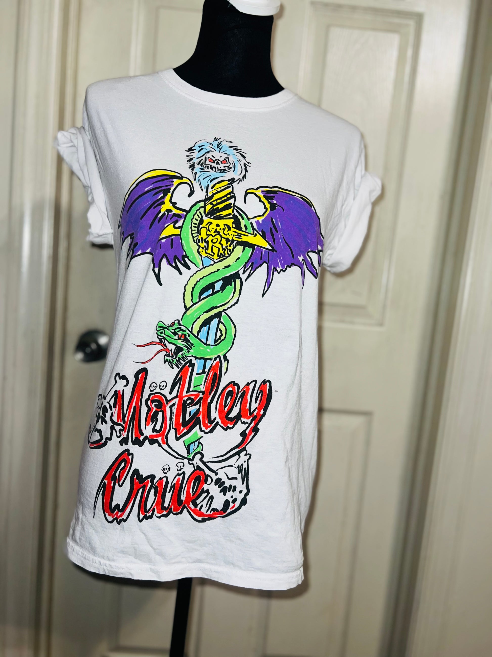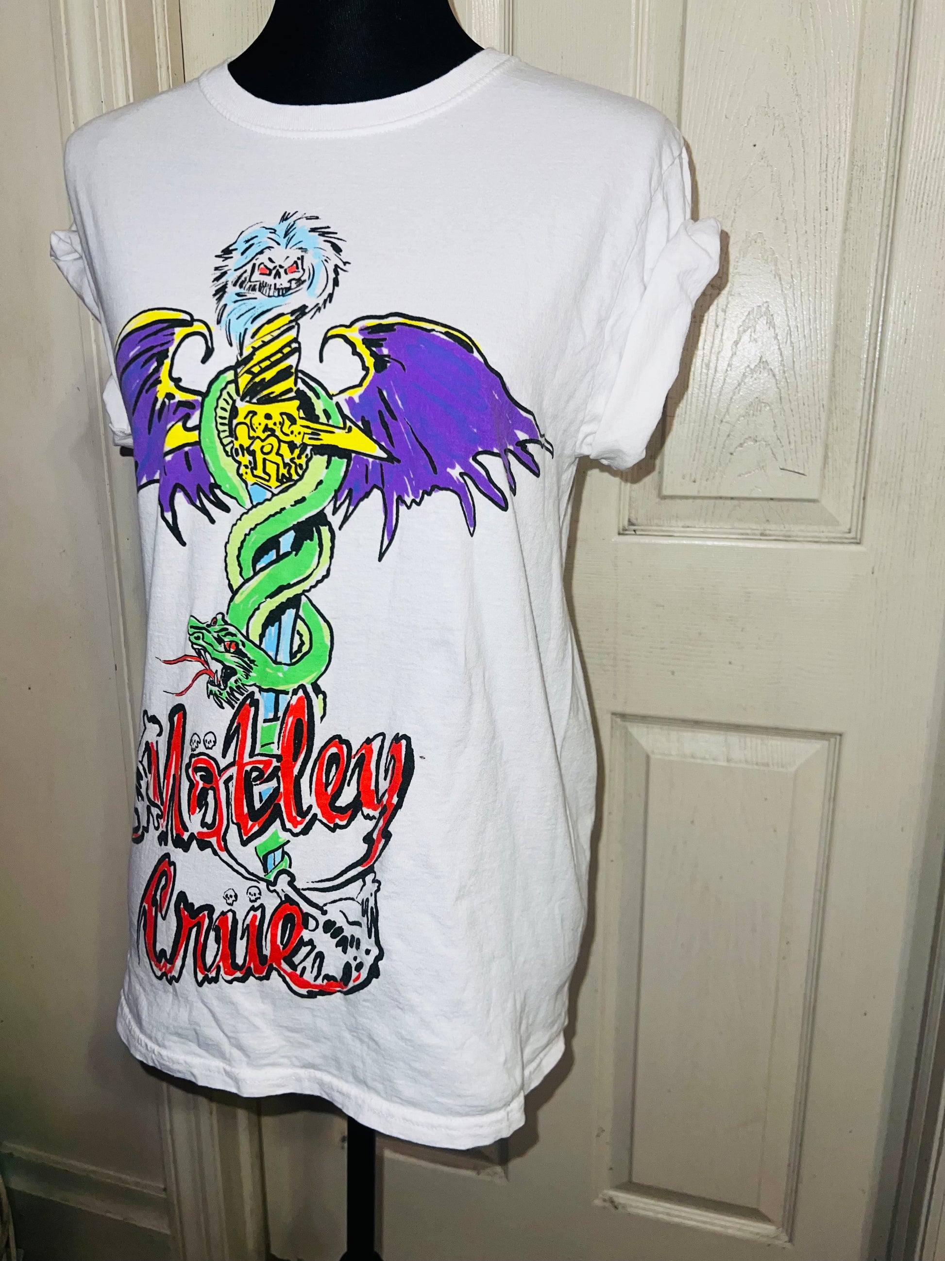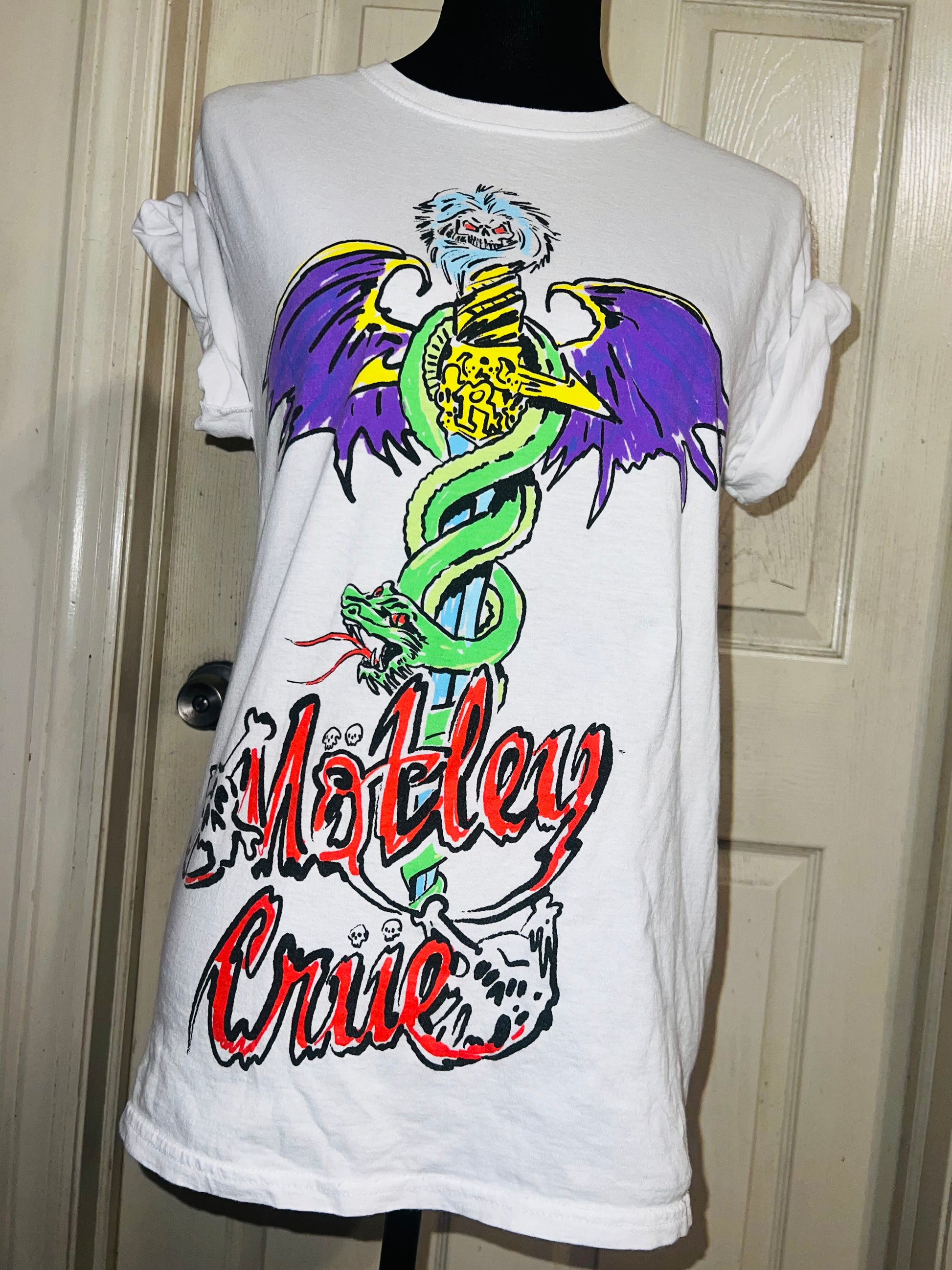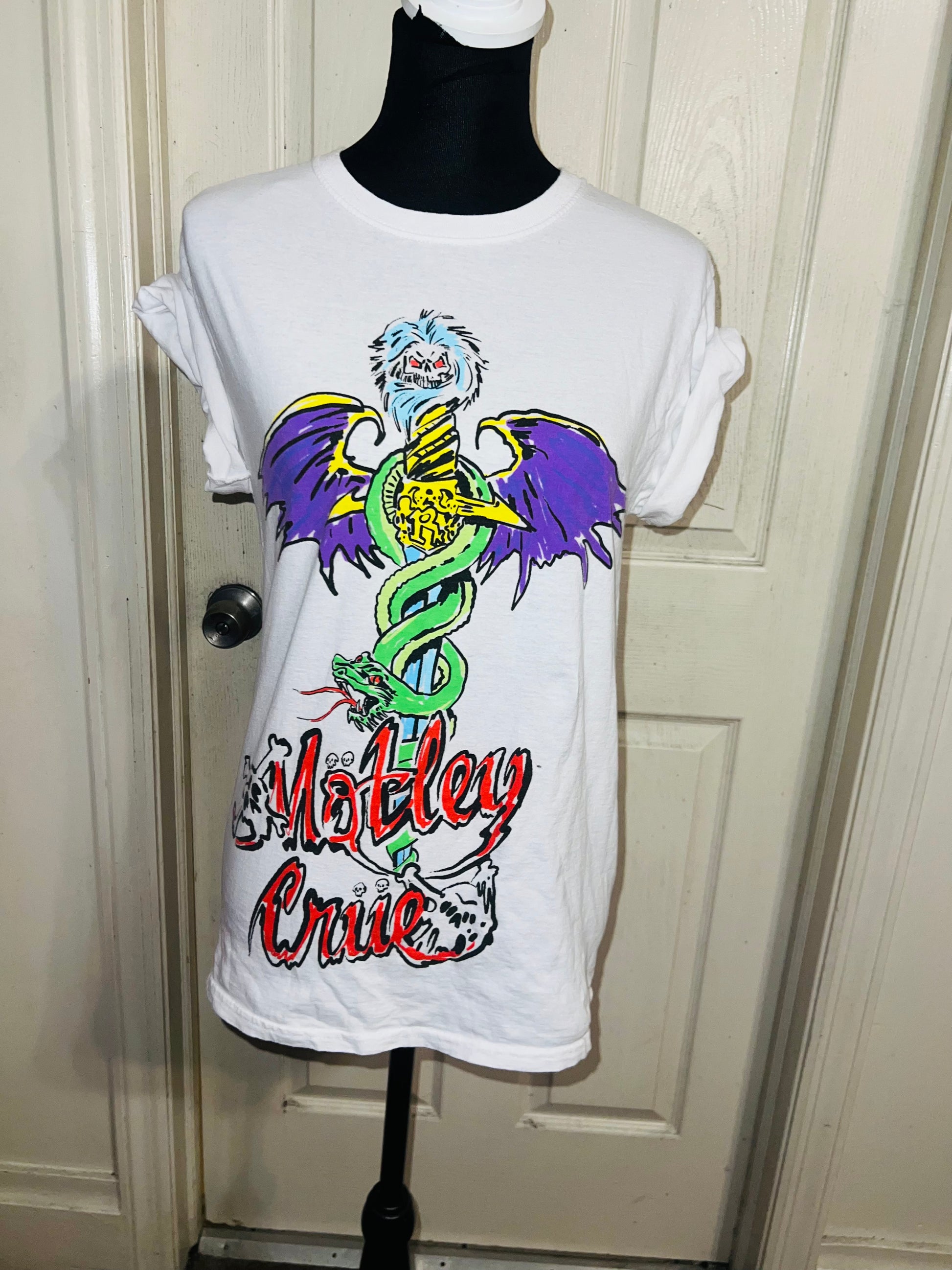 A white Motley Crue tee I found at a vintage shop, super sick graphic and artwork. Size small, oversized.