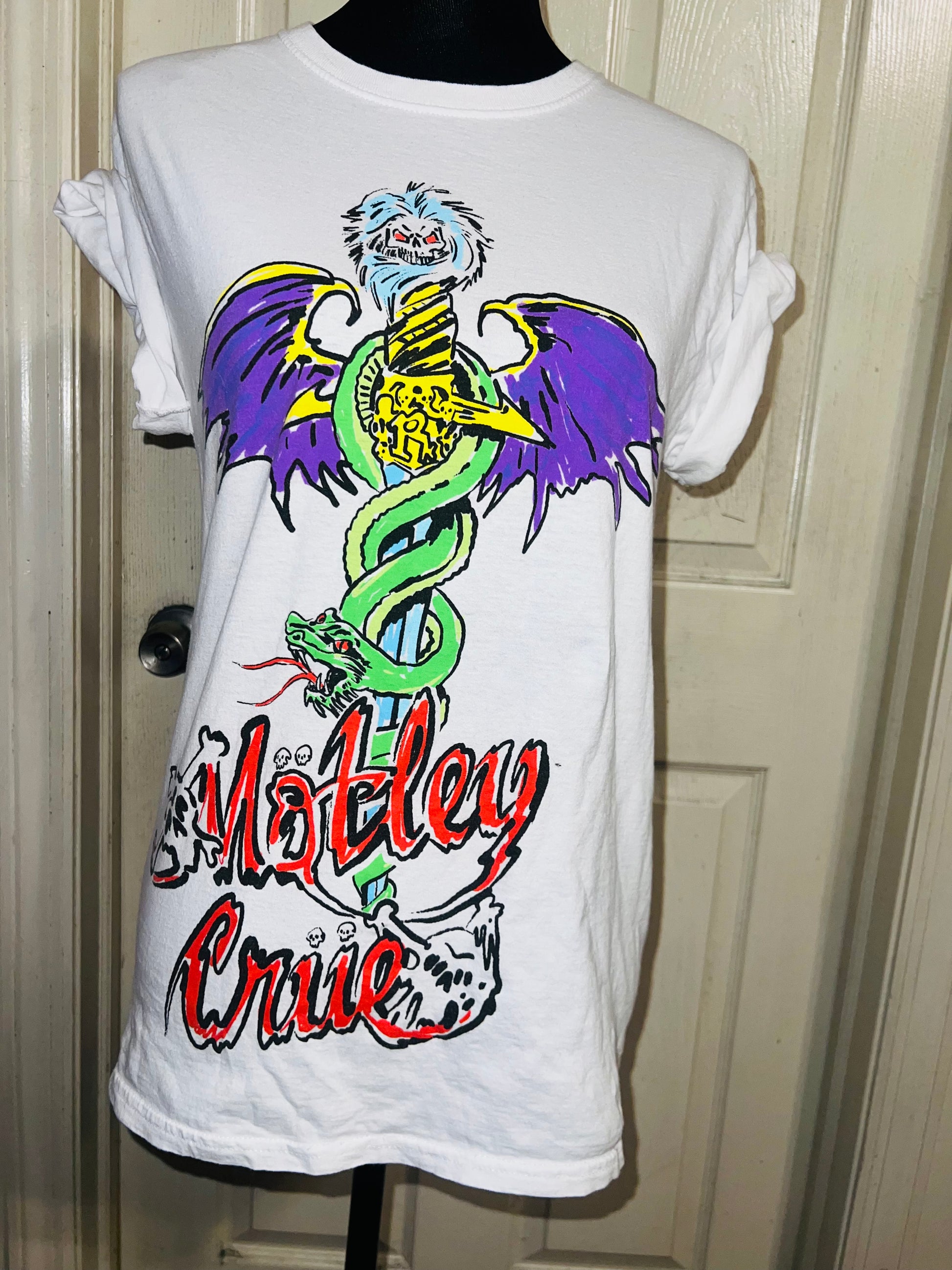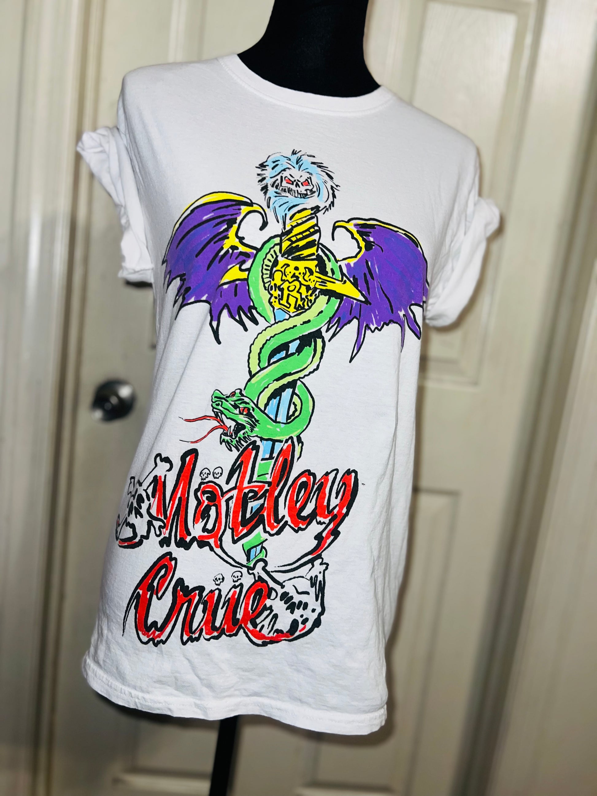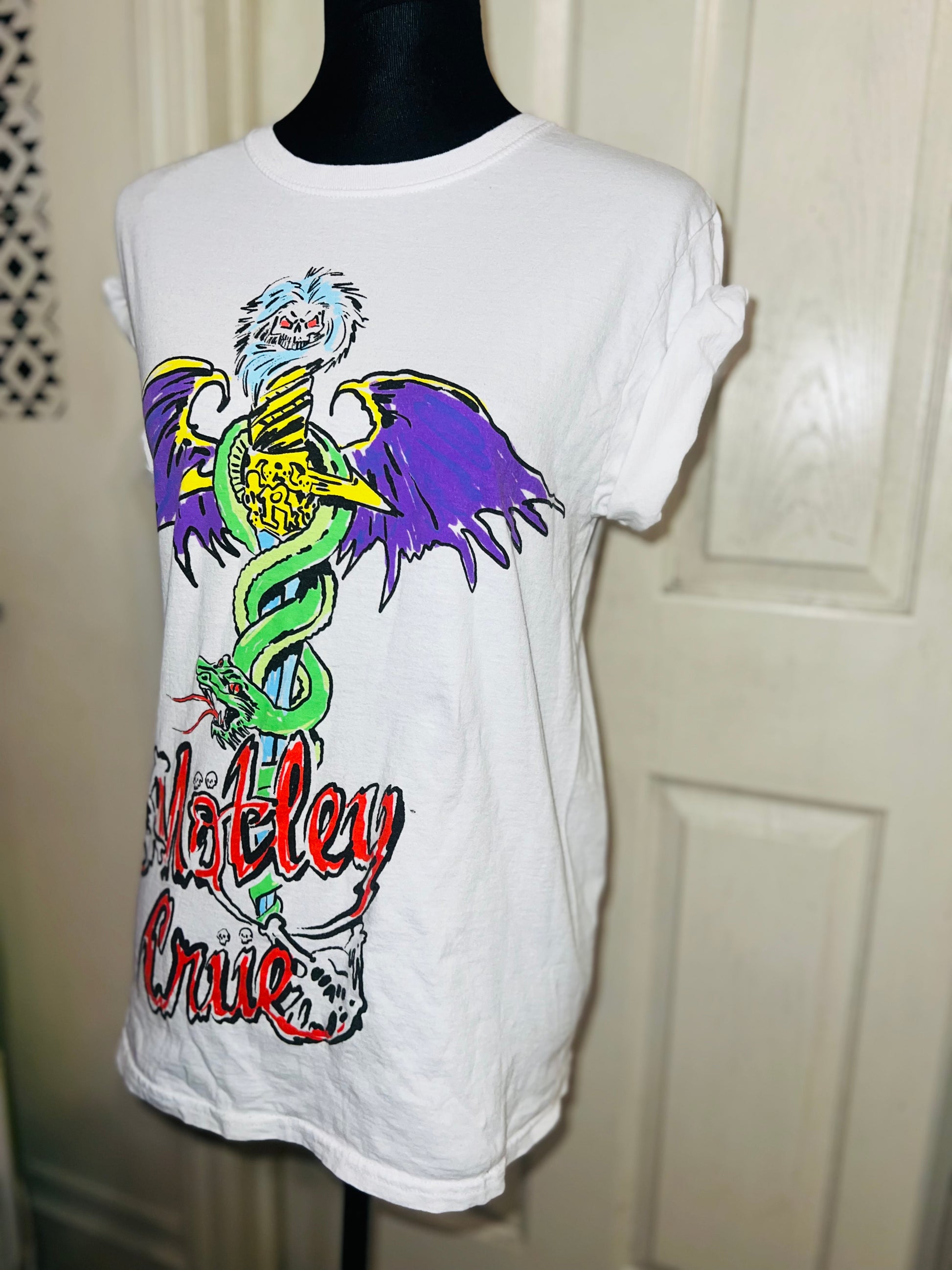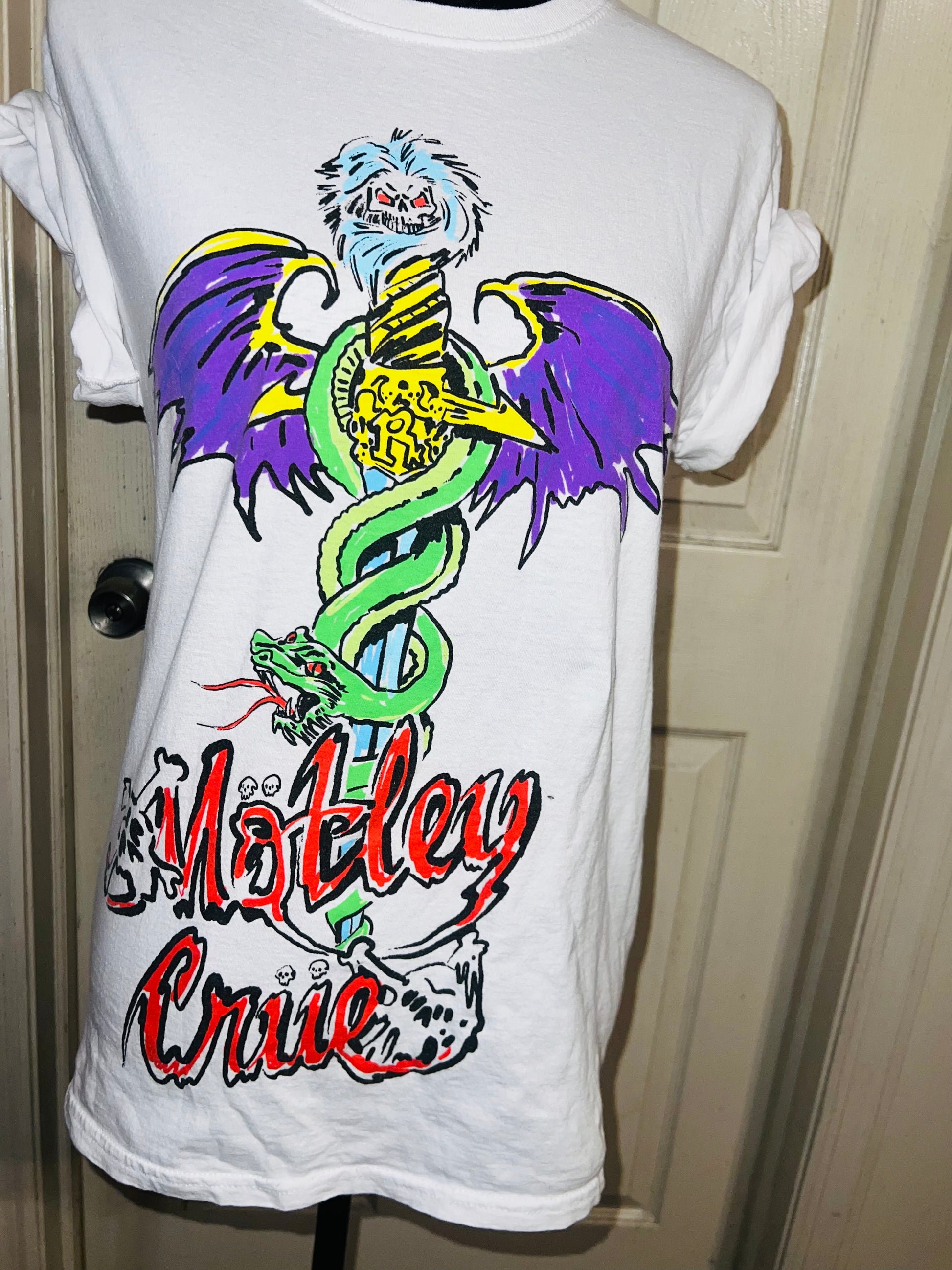 A white Motley Crue tee I found at a vintage shop, super sick graphic and artwork. Size small, oversized.