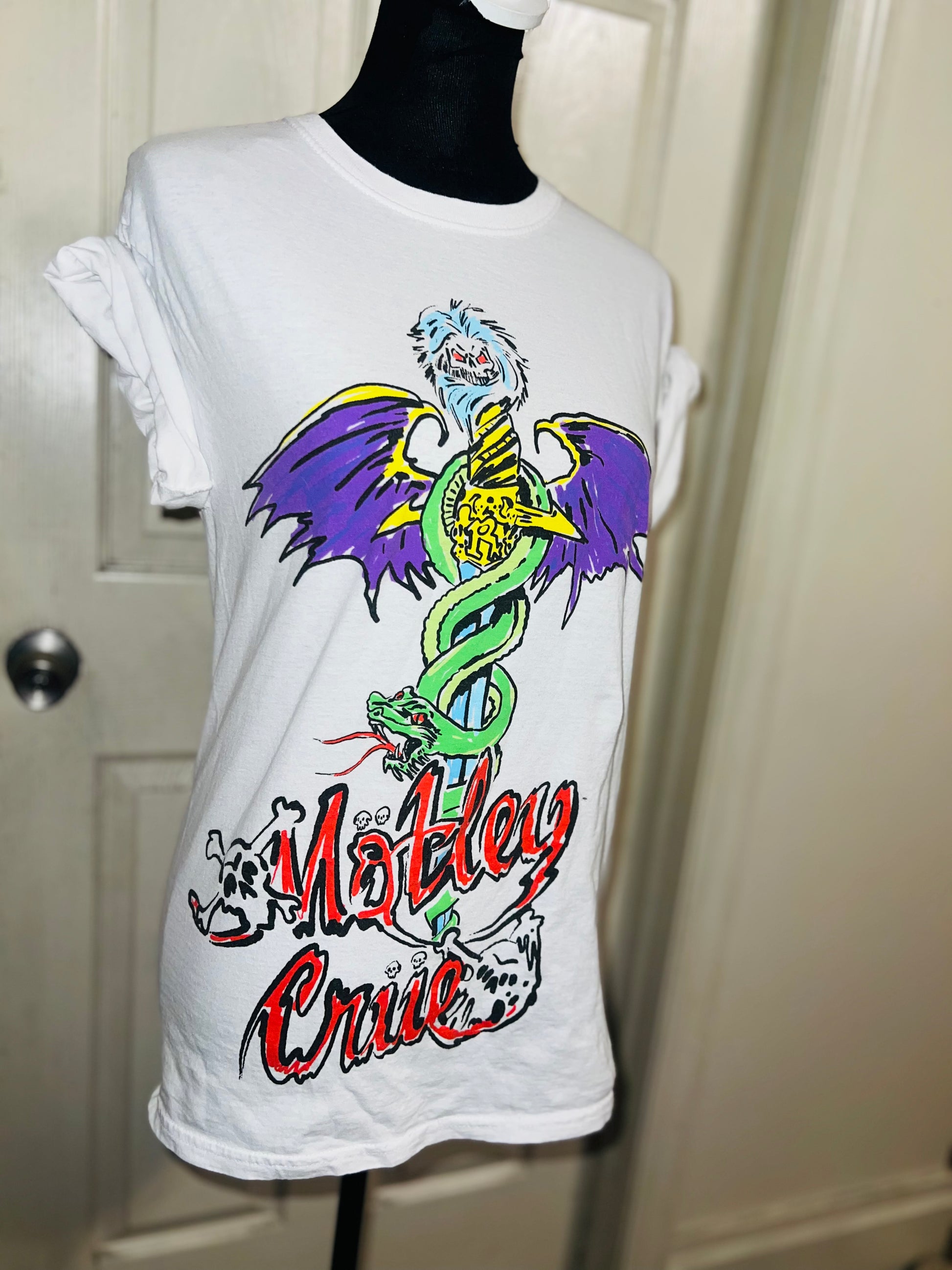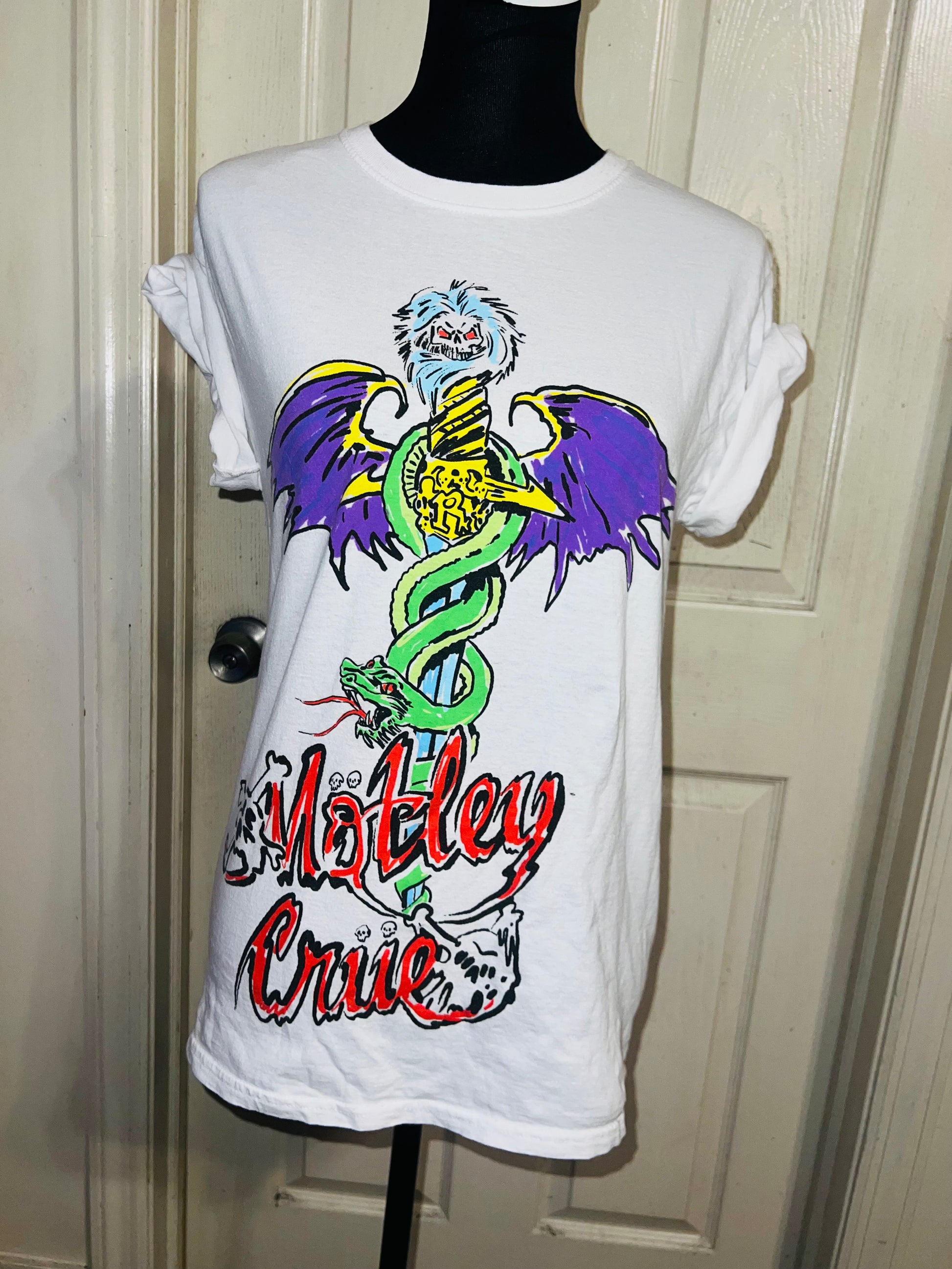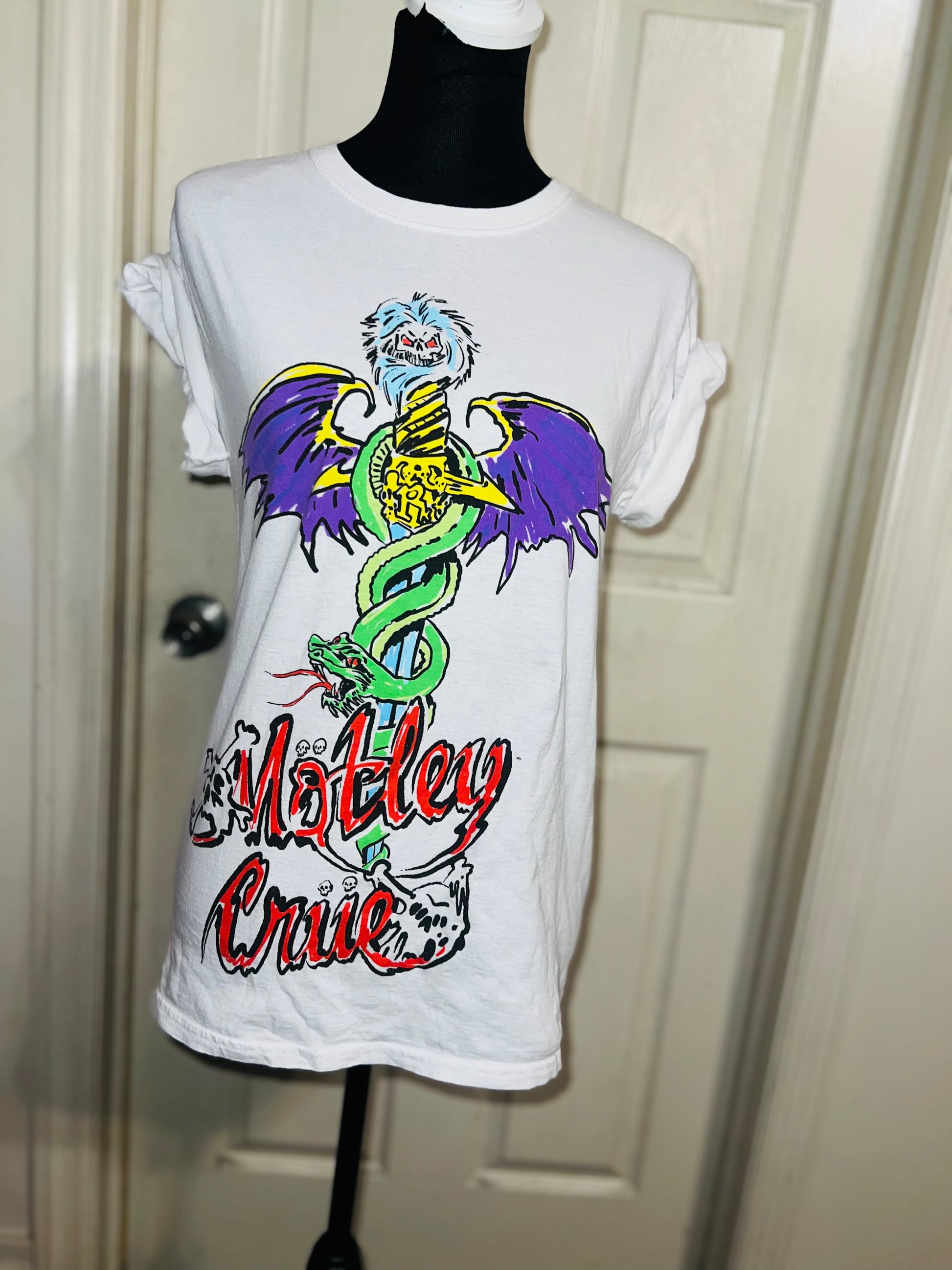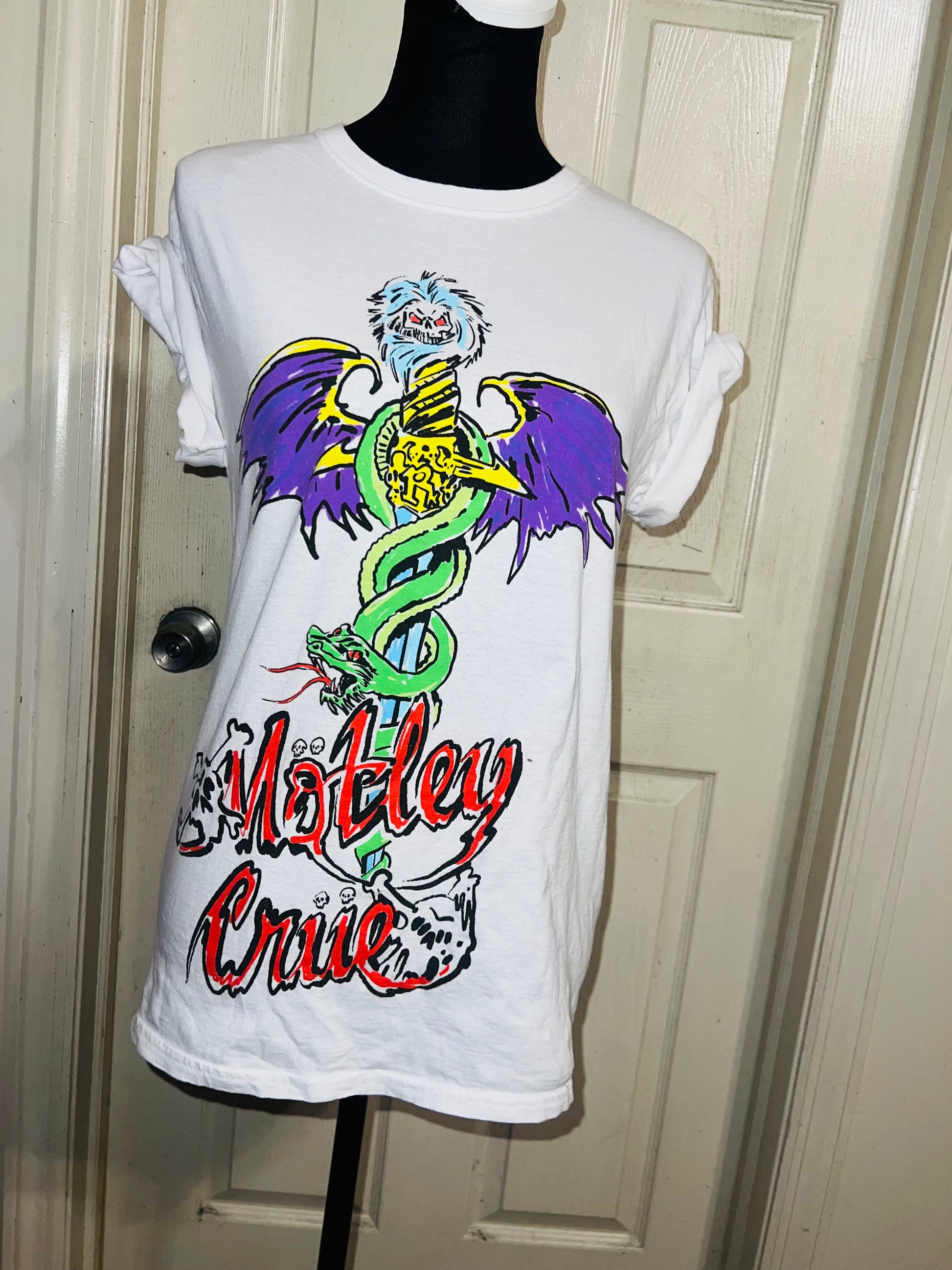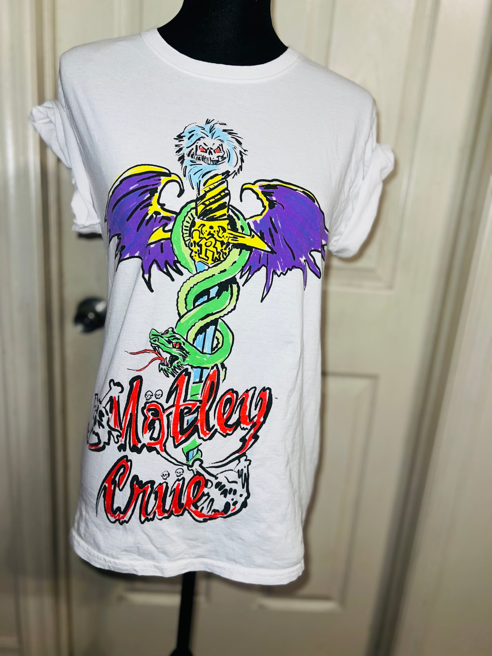 A white Motley Crue tee I found at a vintage shop, super sick graphic and artwork. Size small, oversized.