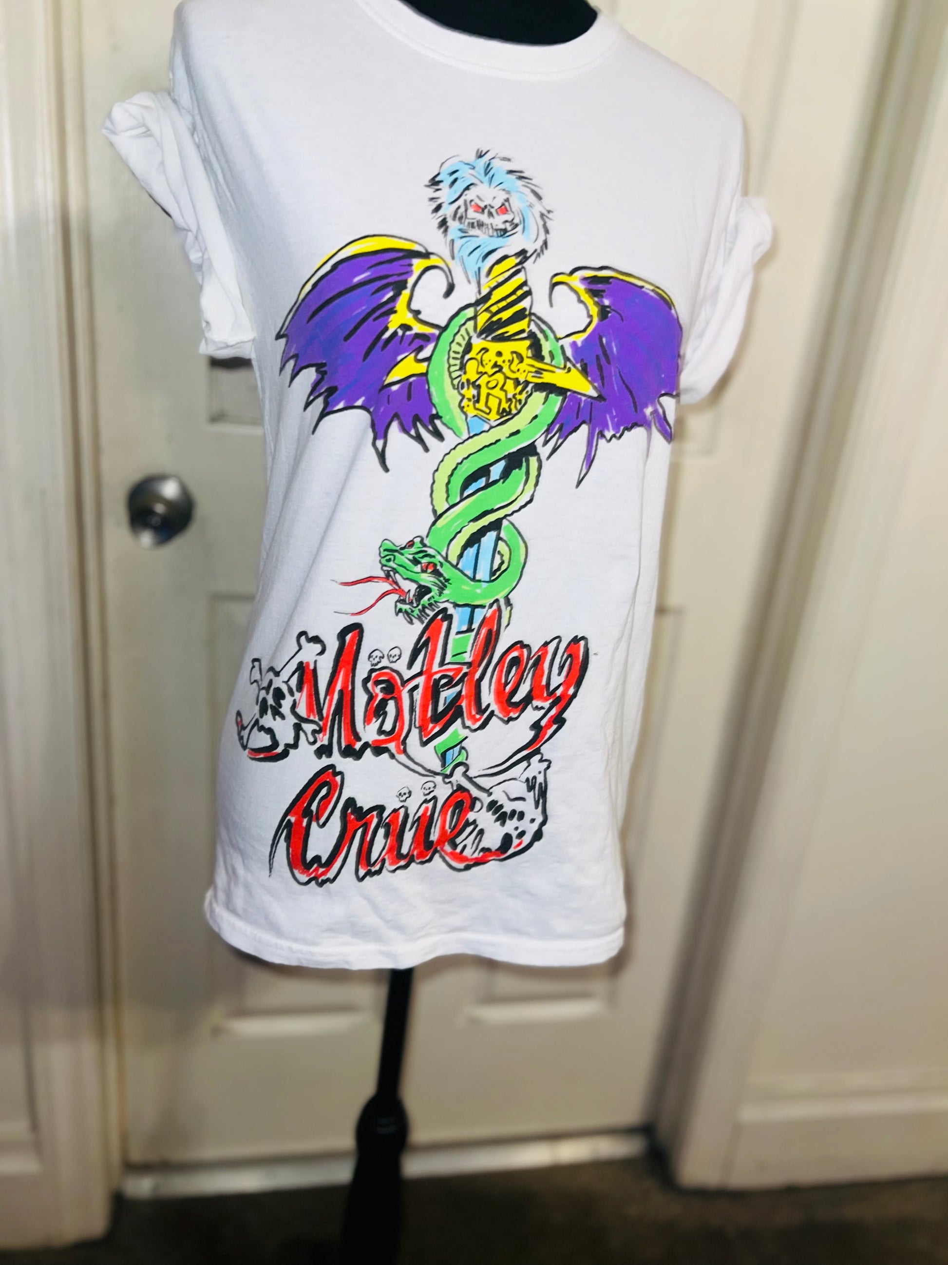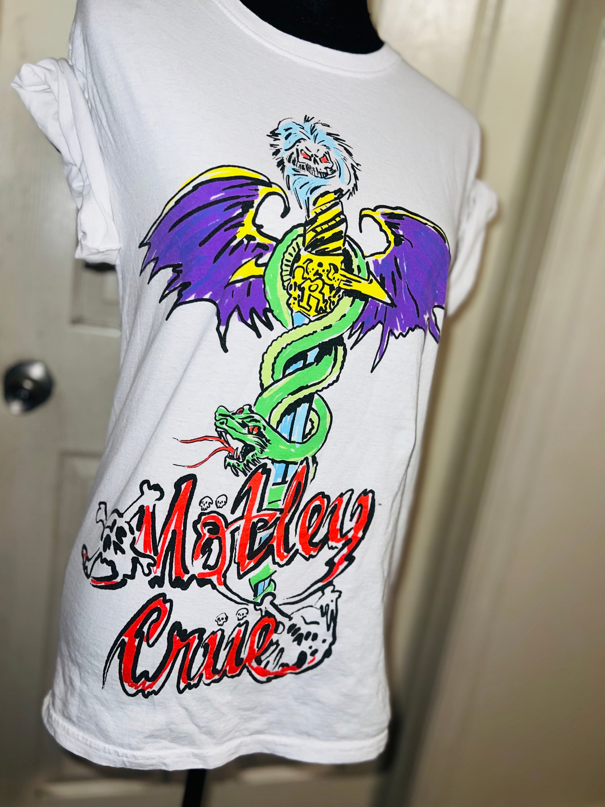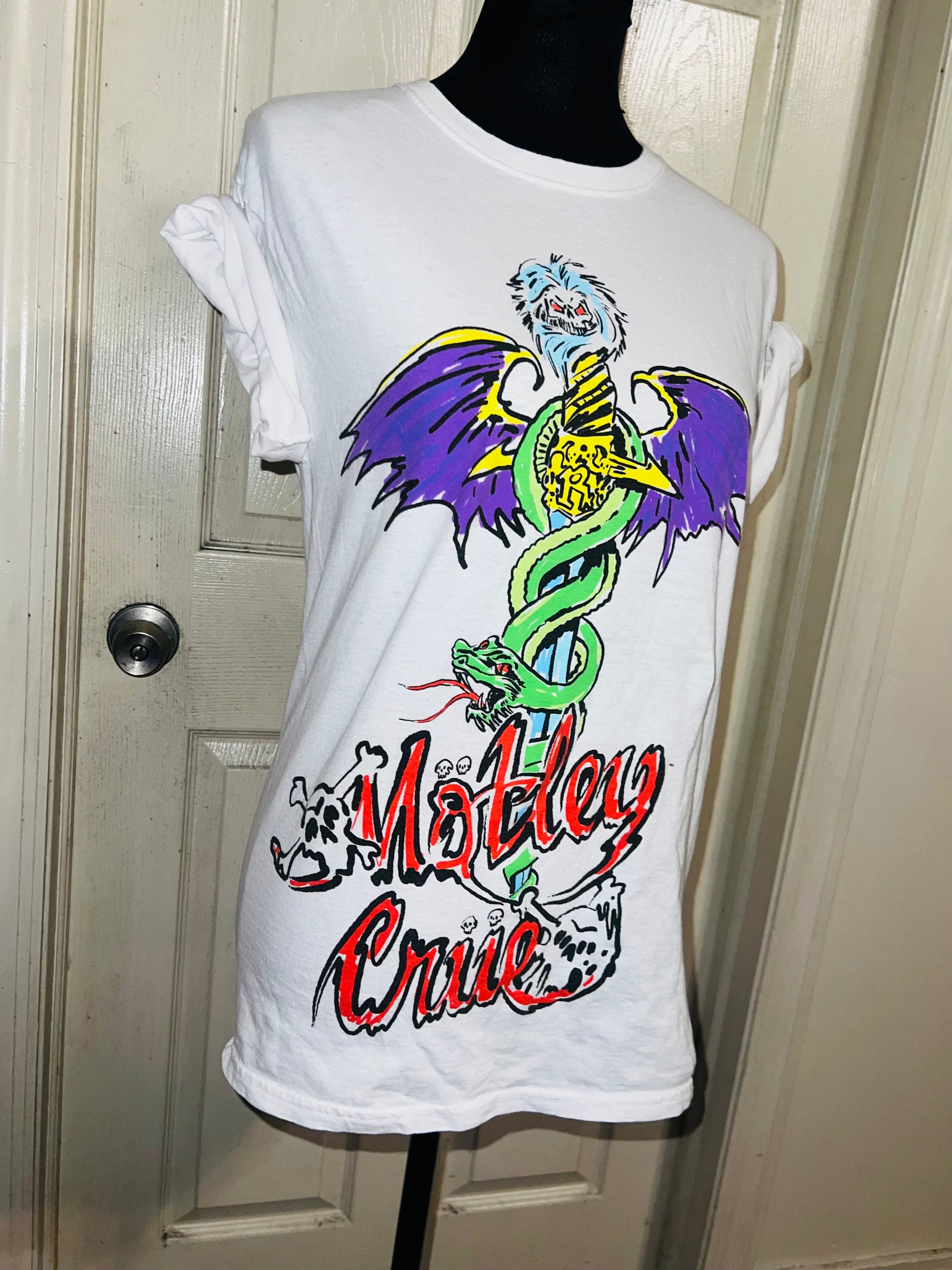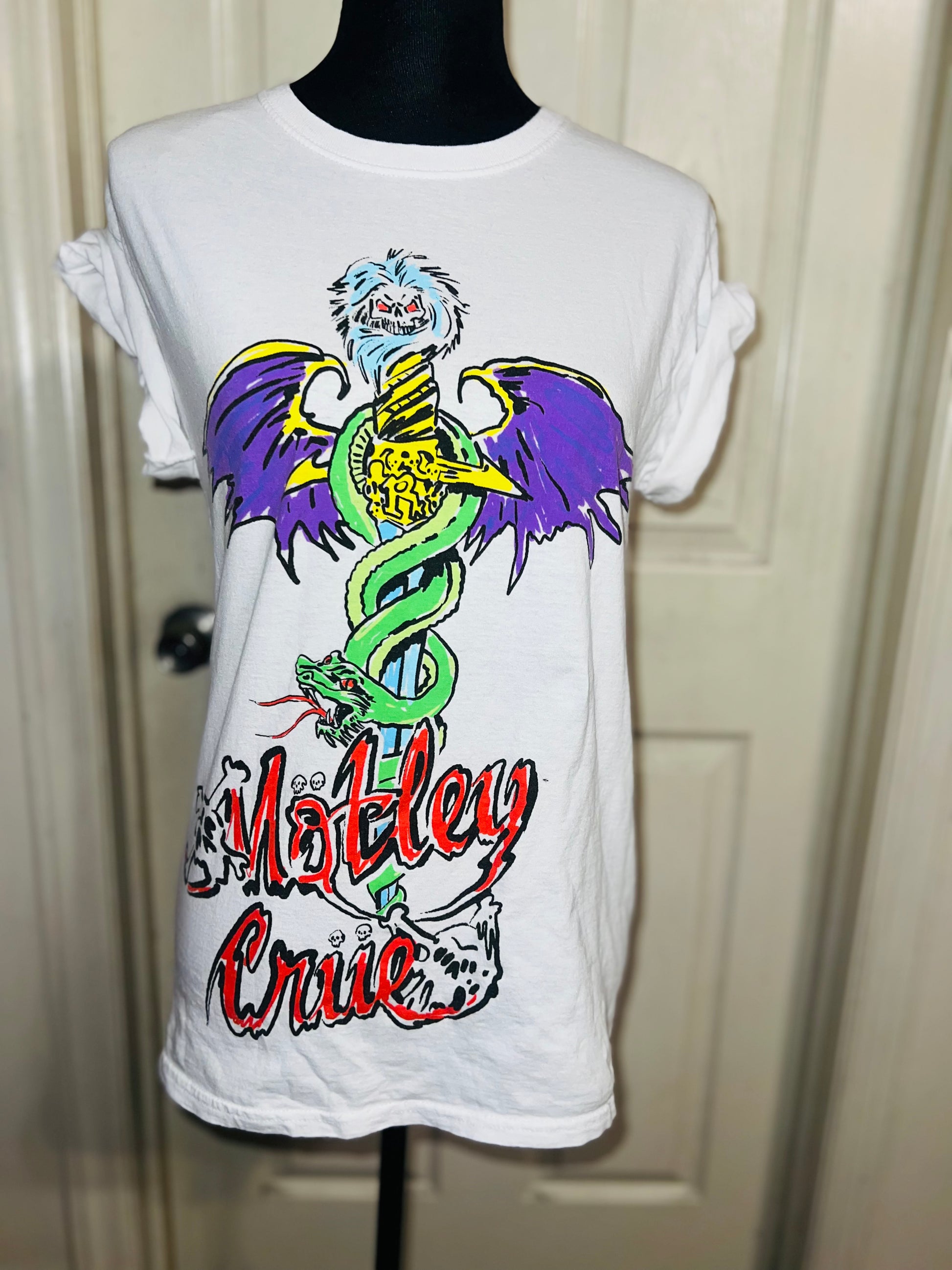 A white Motley Crue tee I found at a vintage shop, super sick graphic and artwork. Size small, oversized.