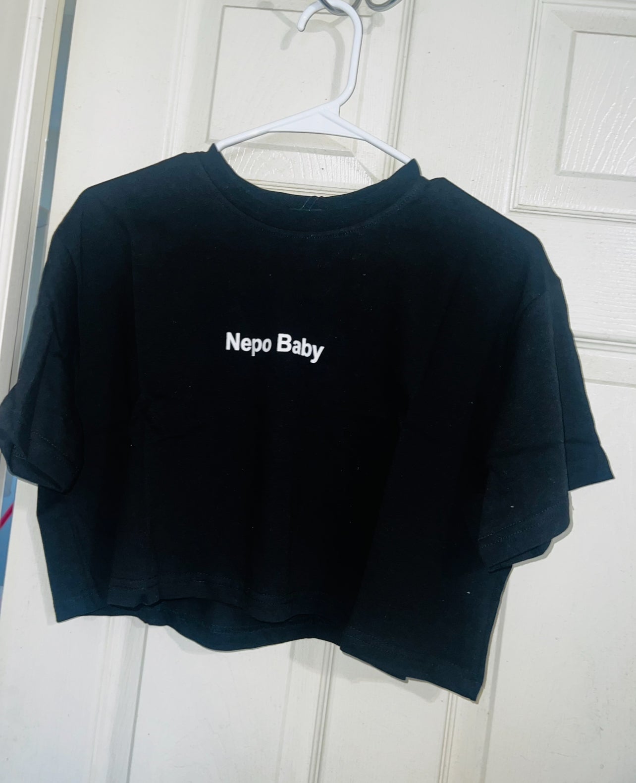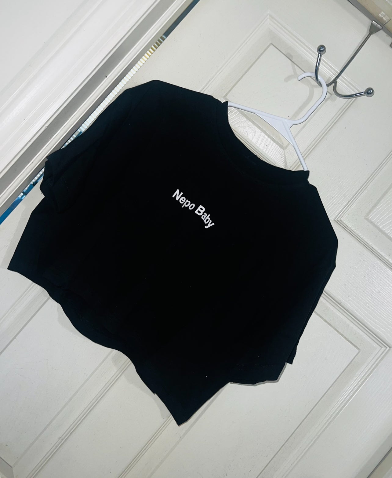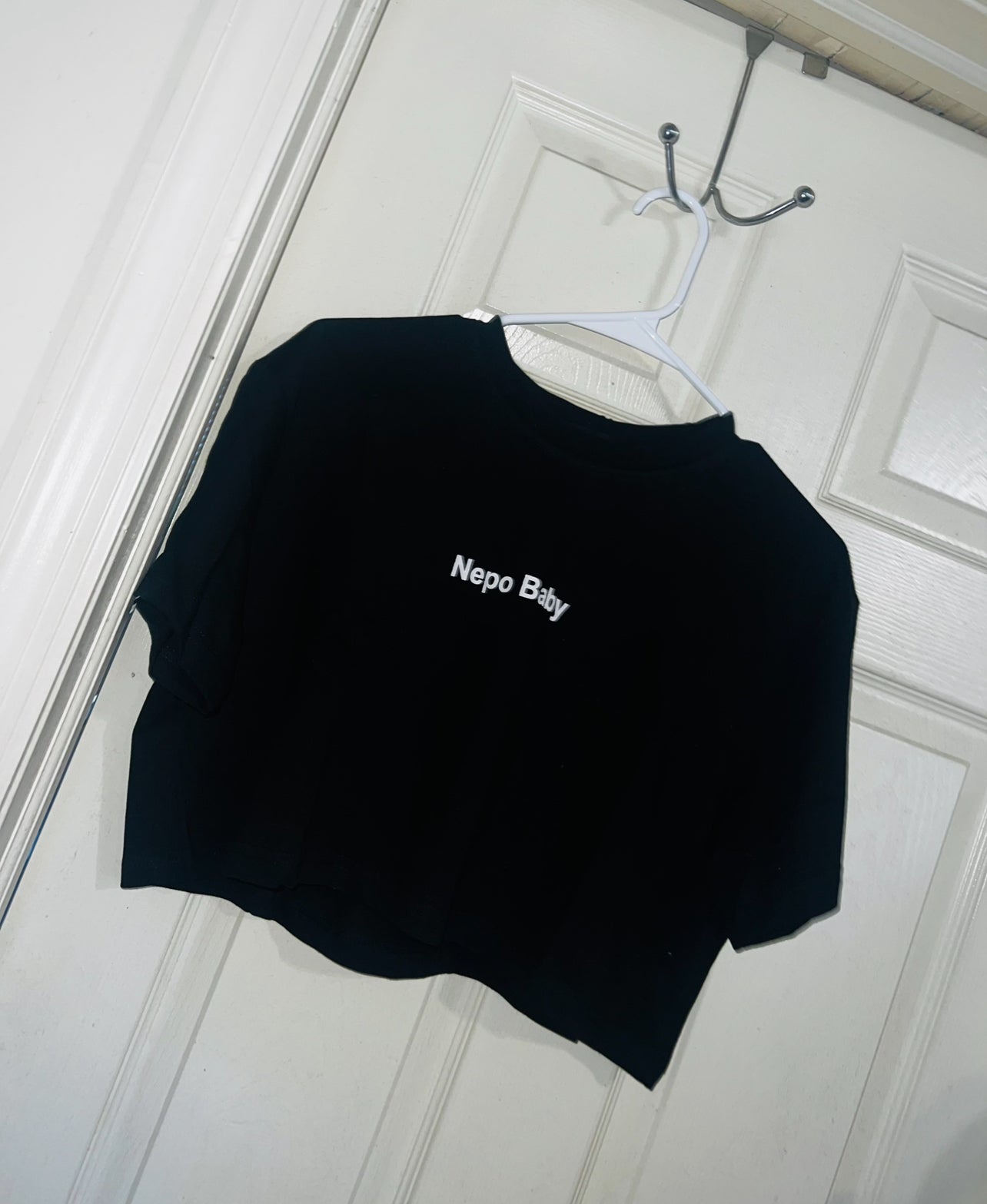 As seen on Hailey Bieber, this funny and cute Nepo Baby crop top makes light of the new phrase heard around the world and makes us feel rich for a day! Cropped! Size M/L and L/XL