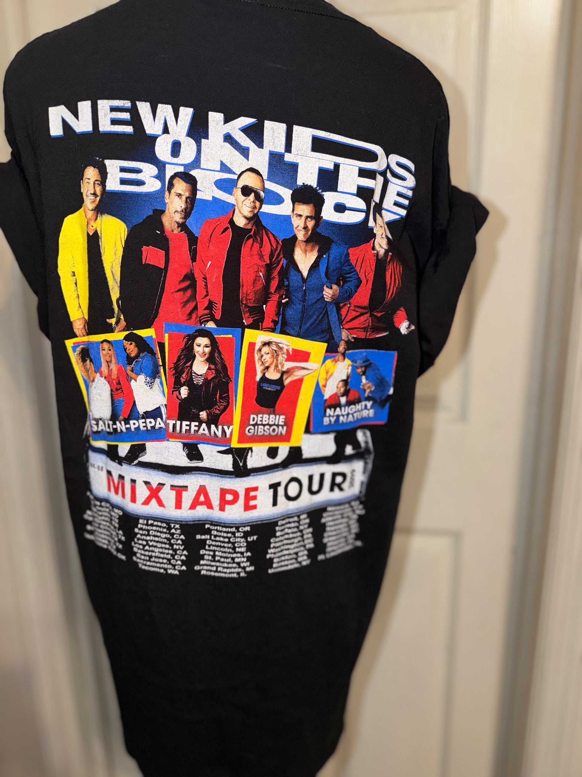 This is now a preorder. A black 2019 New Kids on the Block The Mixtape Tour double sided tee featuring Naughty by Nature, Salt n Peppa, Tiffany, and Debbie Gibson. Tour dates and cities on the back. Oversized.