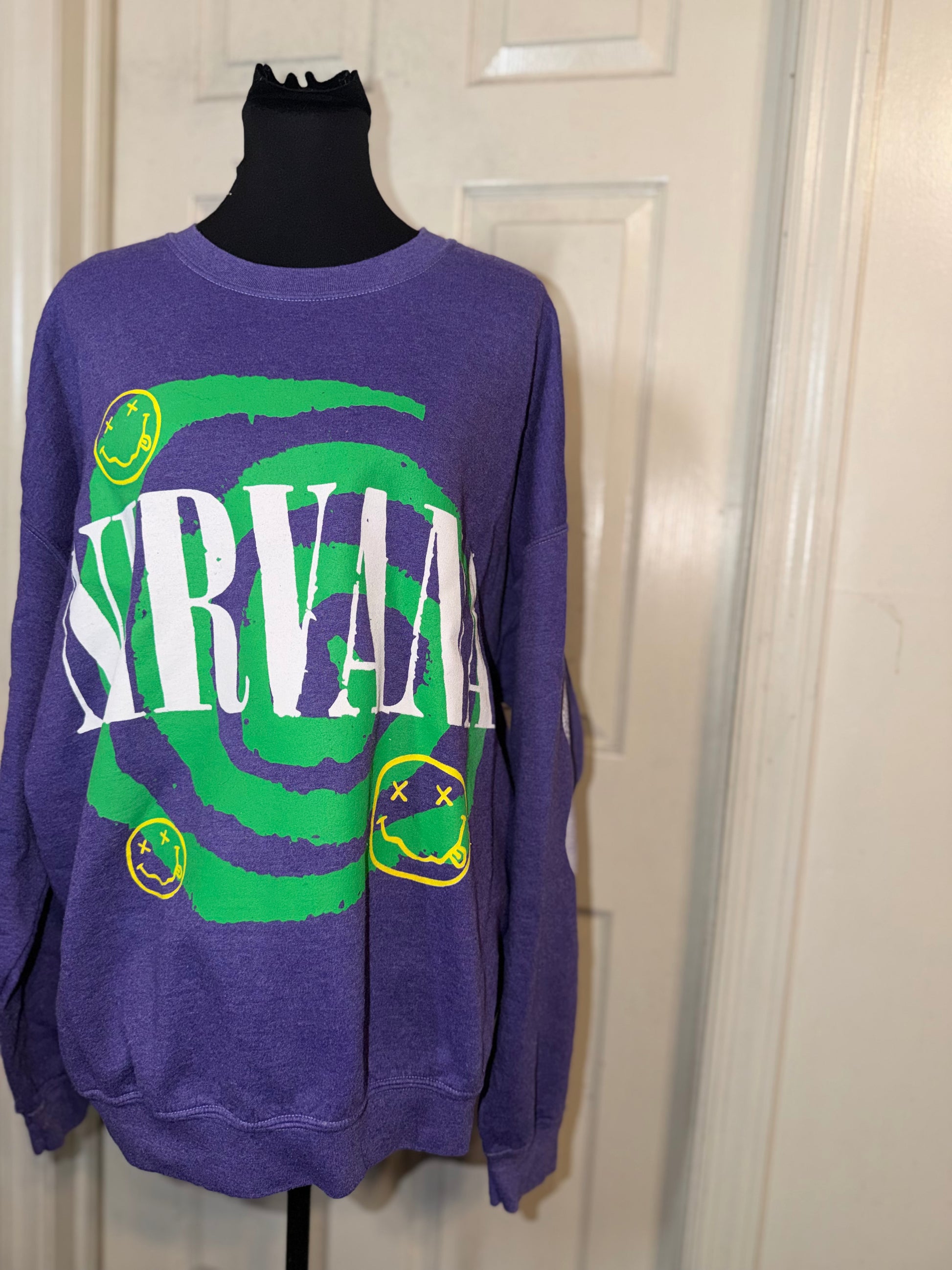 A purple and green version of the Nirvana double sided spiral sweatshirt with Nirvana across the back. Oversized and rare.