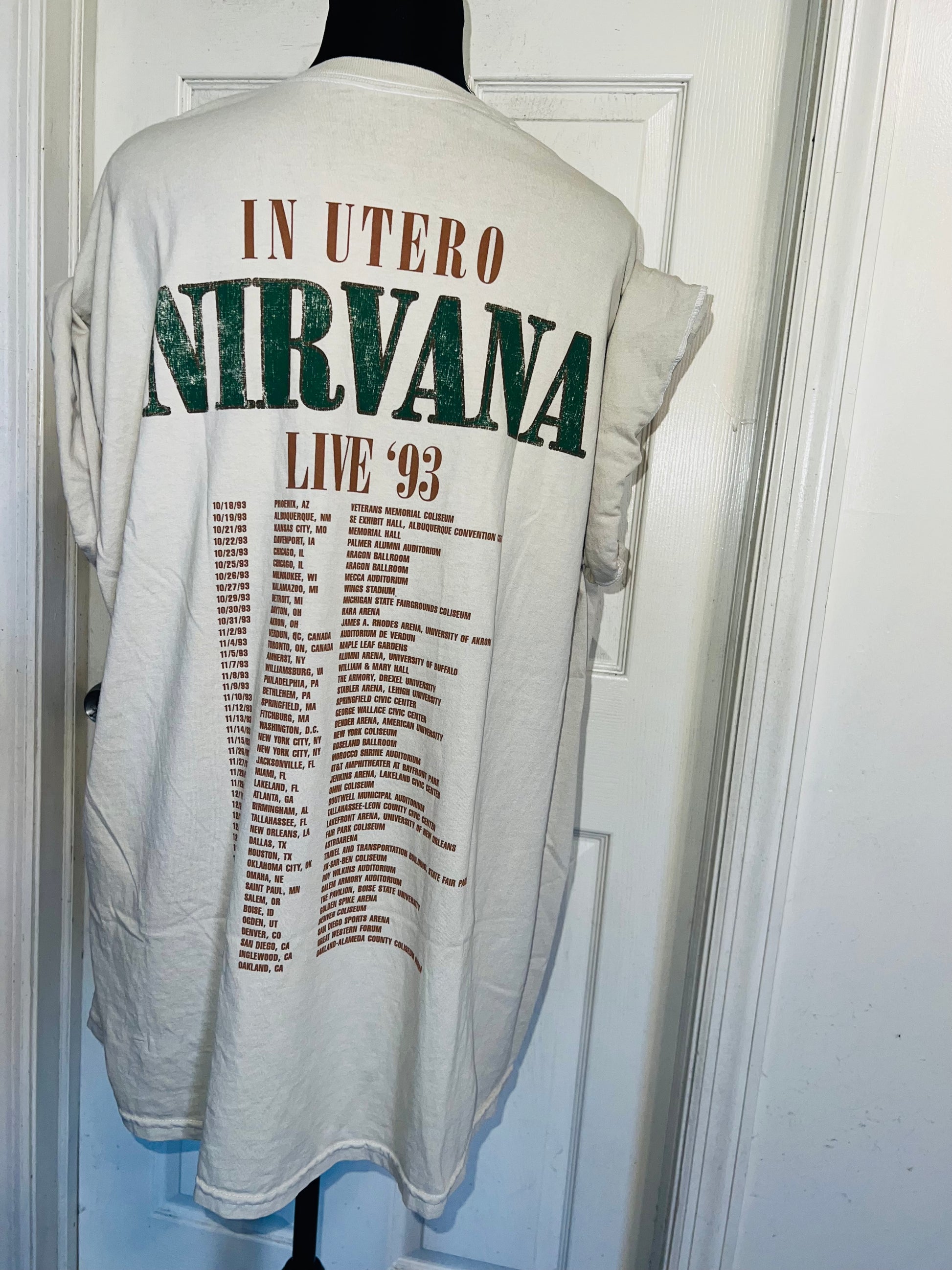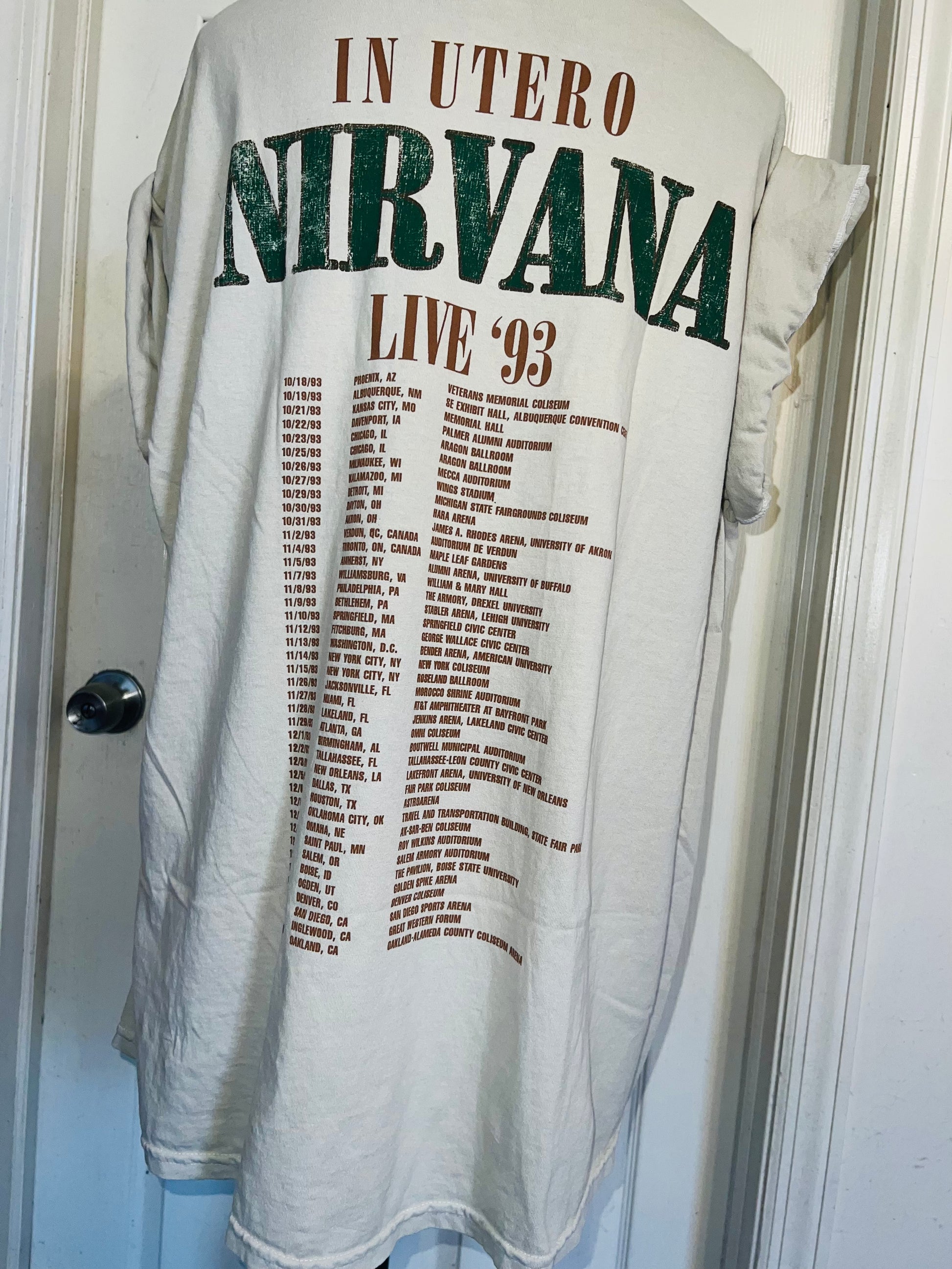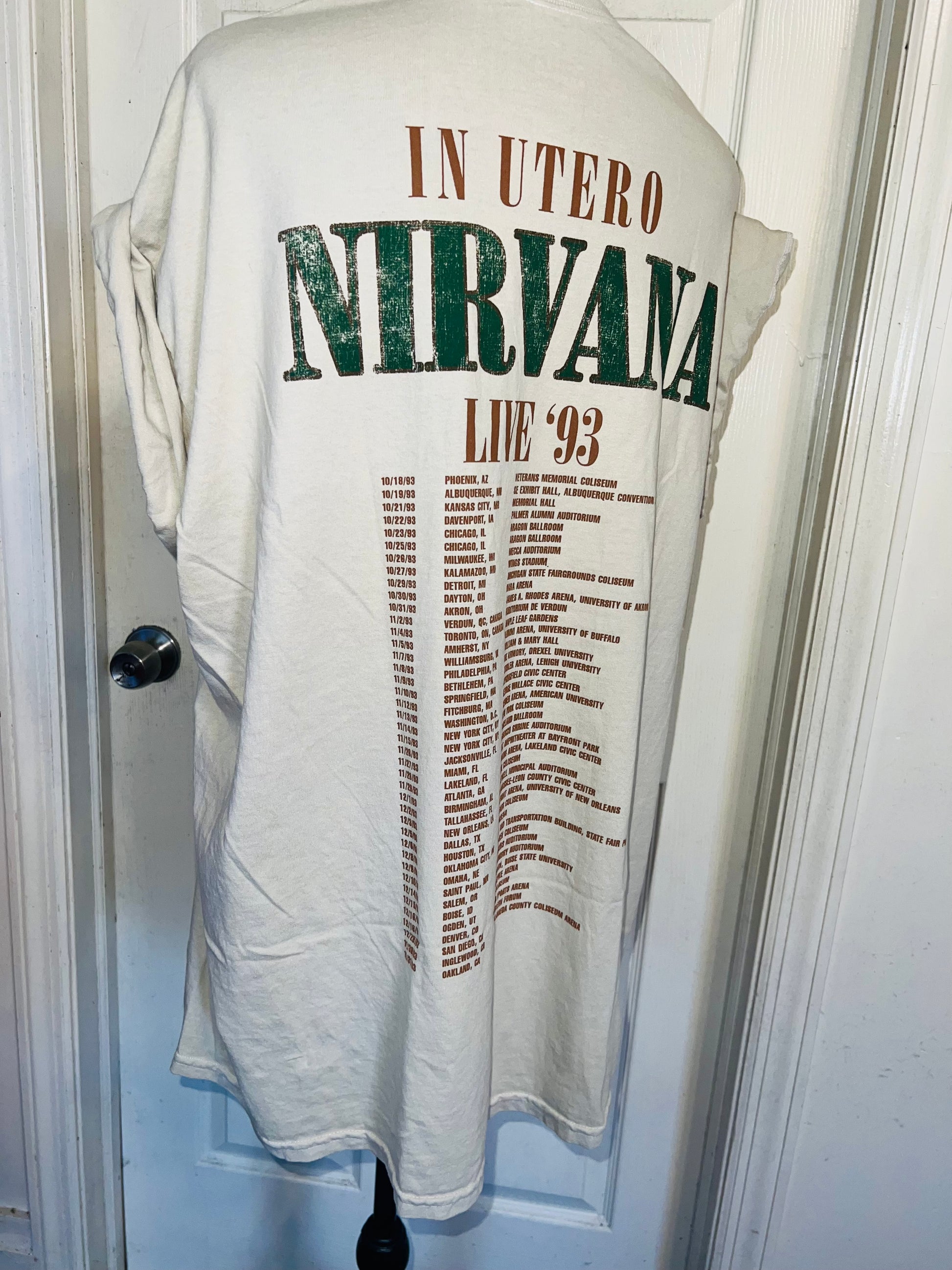 This is now a preorder. Please allow extra processing time. A sand/natural and dark green Nirvana double sided Live in Utero ‘93 concert tee with the dates and cities on the back. Size L/XL, oversized.