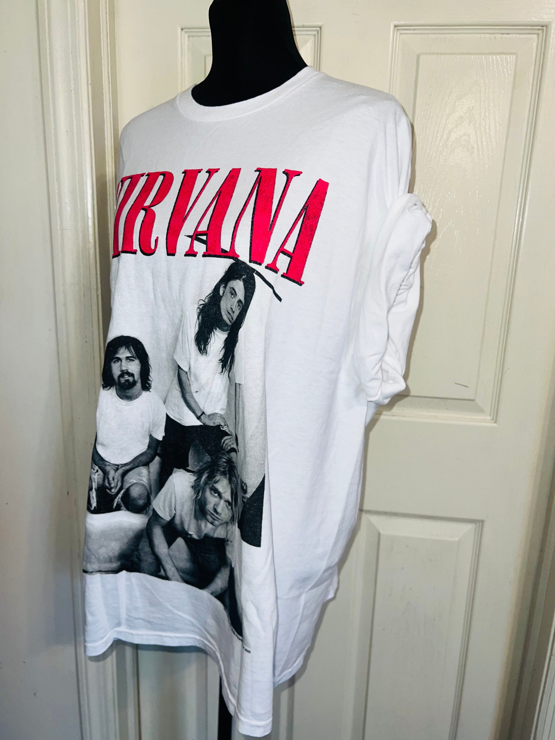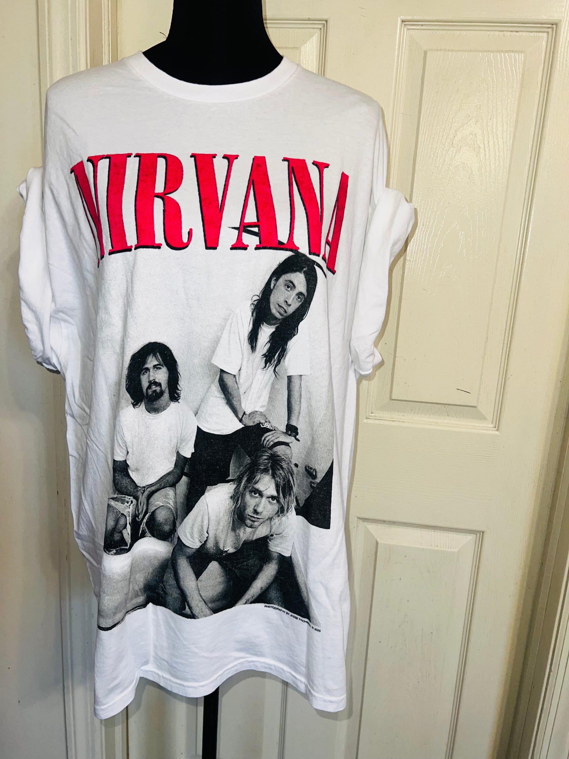 This is now a preorder. A white double sided Nirvana Nevermind Live ‘92 tee with a sick photo on the front of the band and the cities and dates on the back. Size L/XL, oversized.