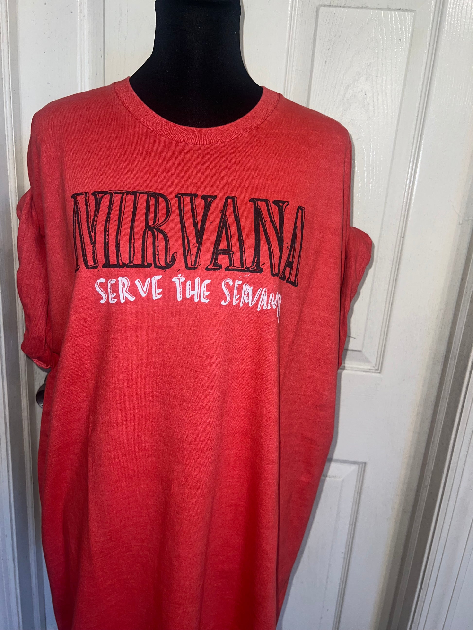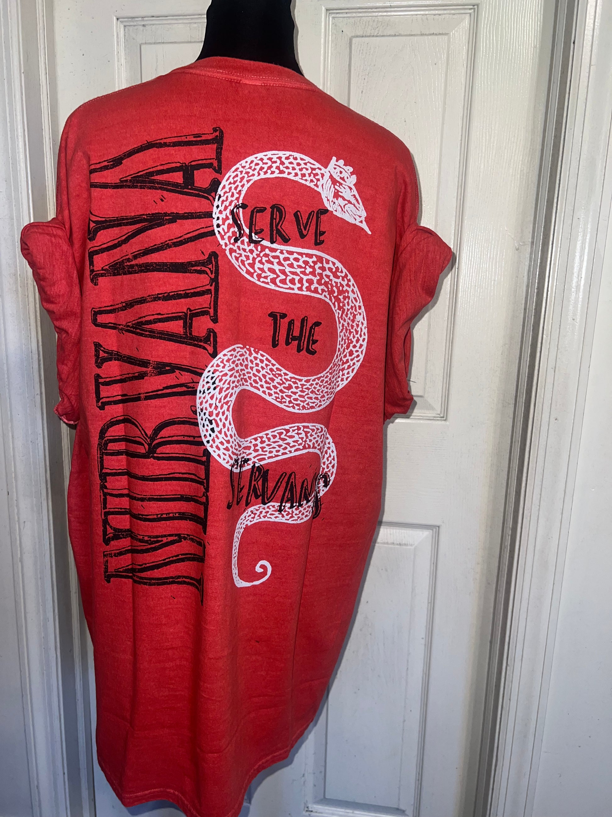 A dark red Nirvana double sided Serve The Servants tee with a snake on the back. Oversized.