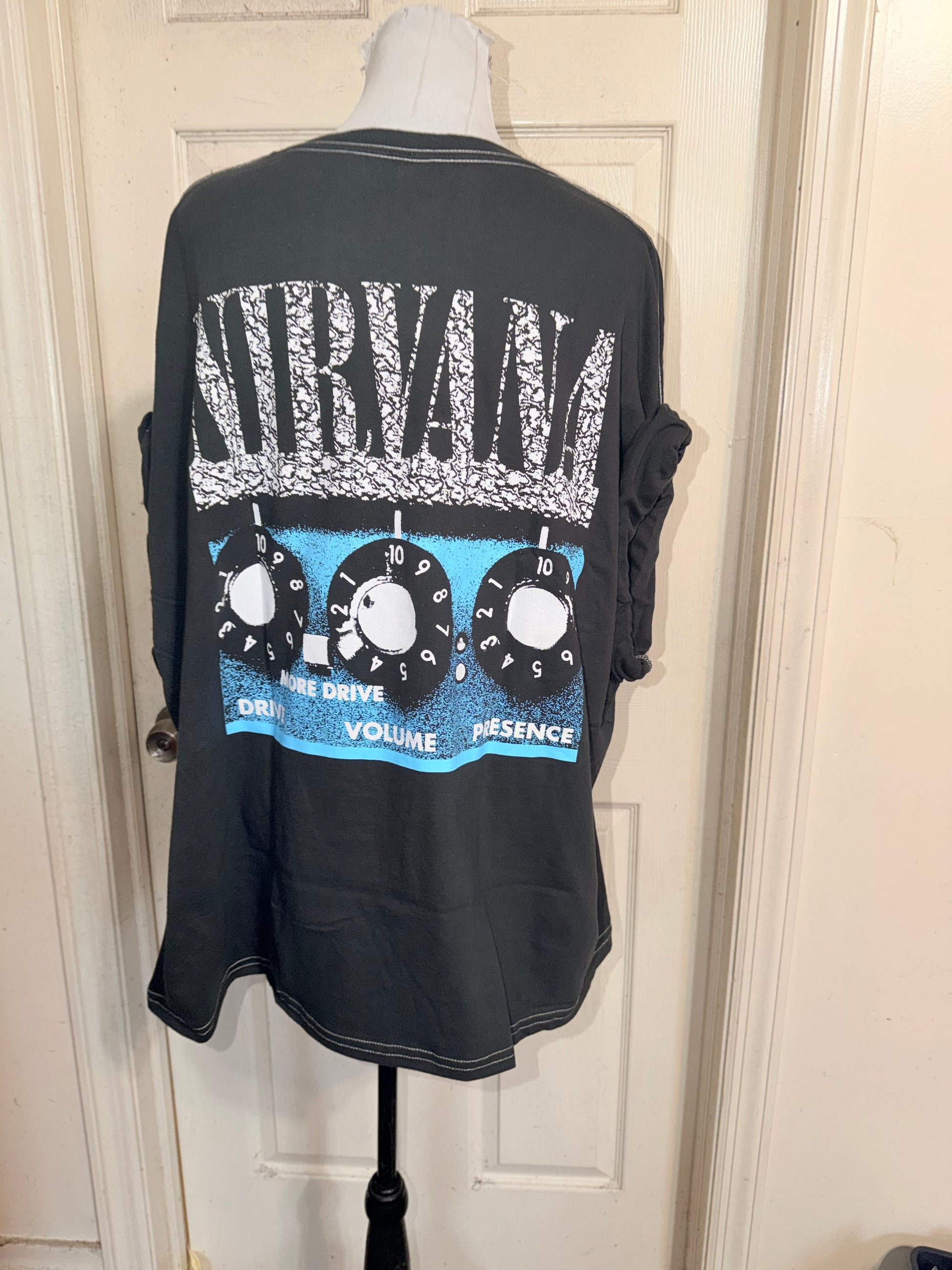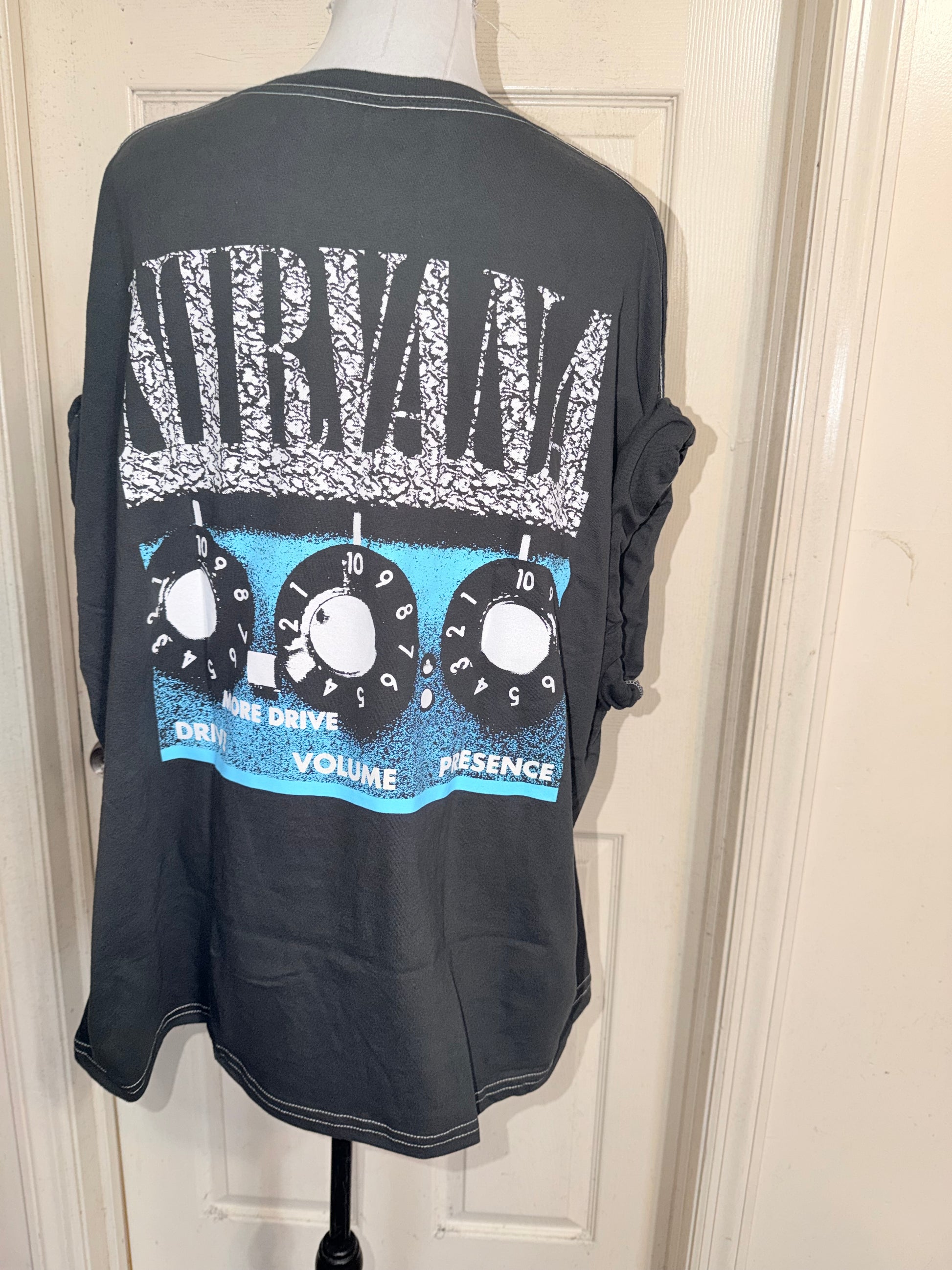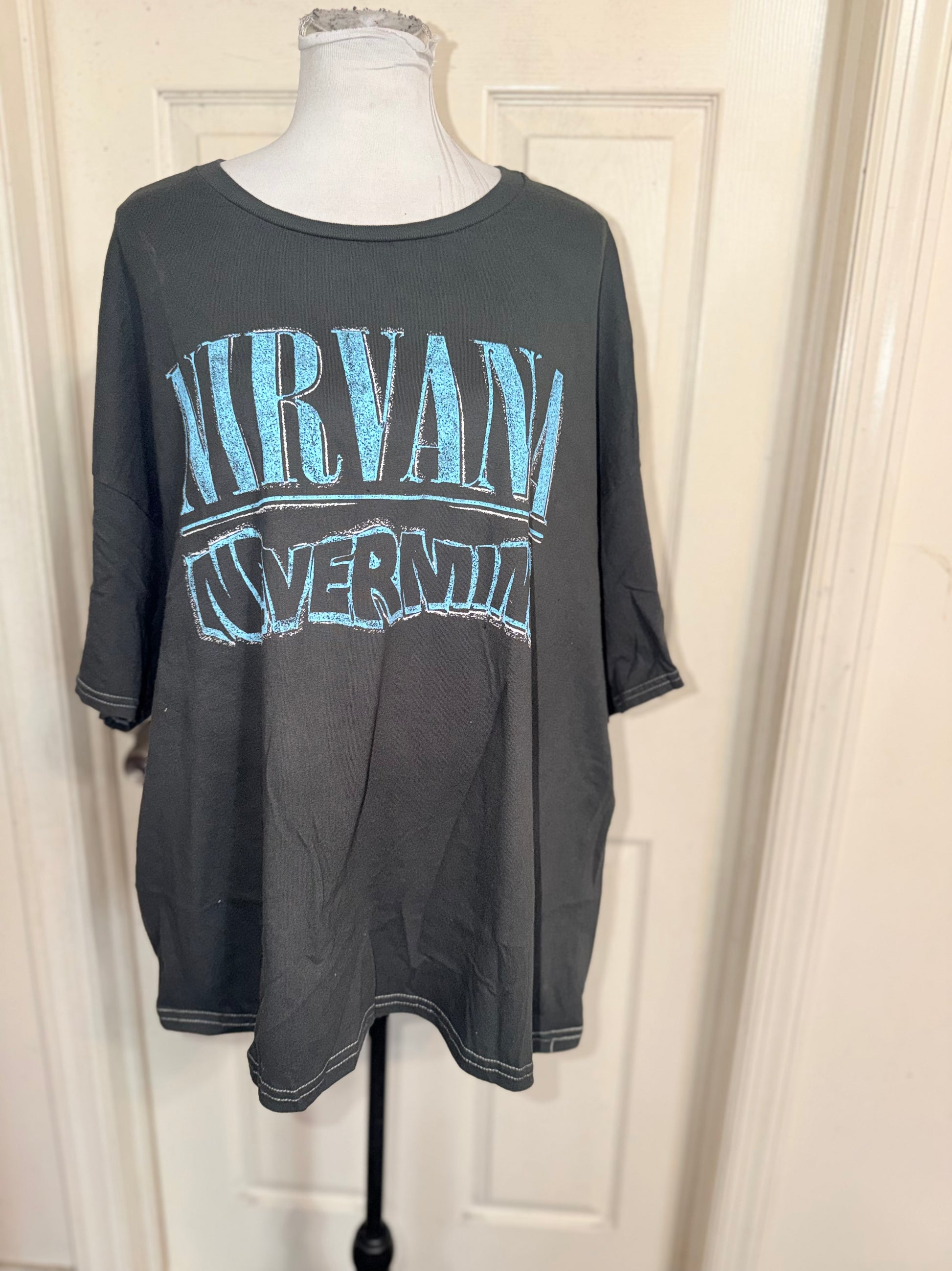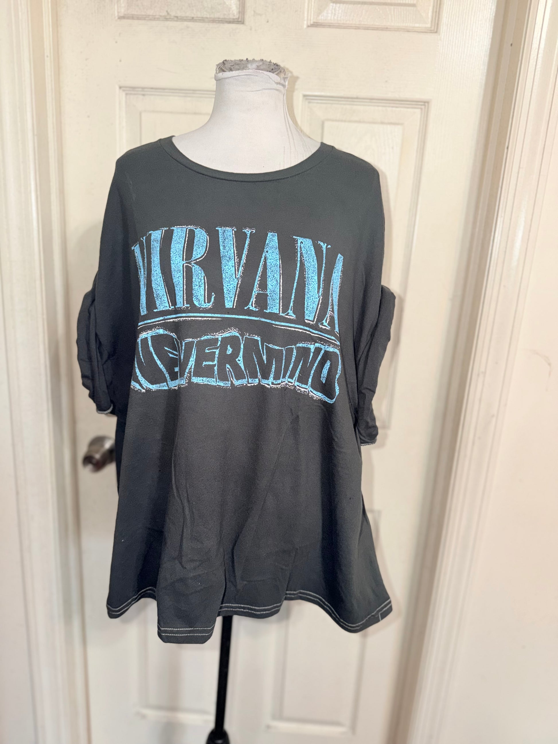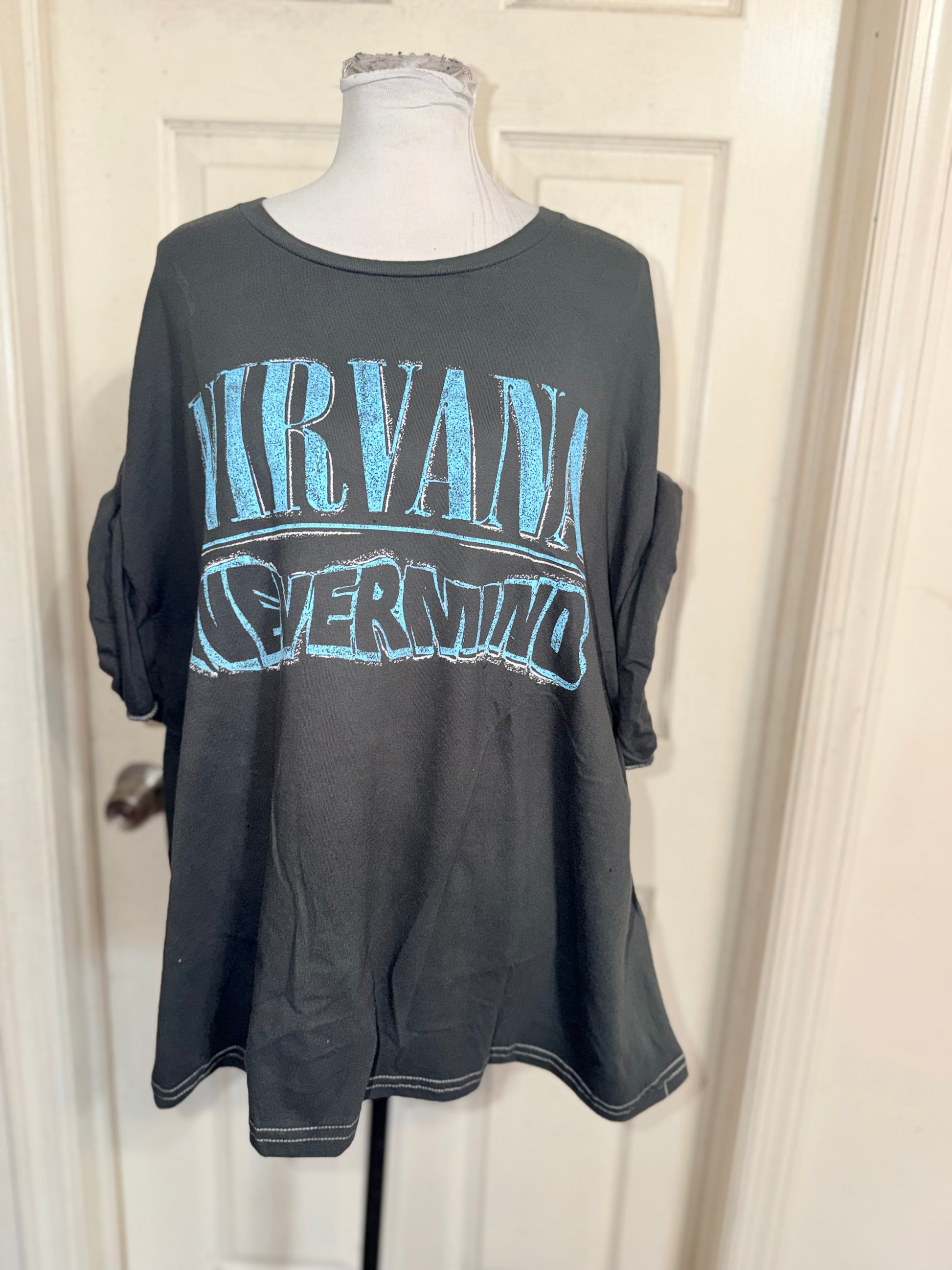 A dark grey Nirvana Nevermind double sided tee with a cool graphic on the back. Slightly shortened with drop shoulders, oversized.
