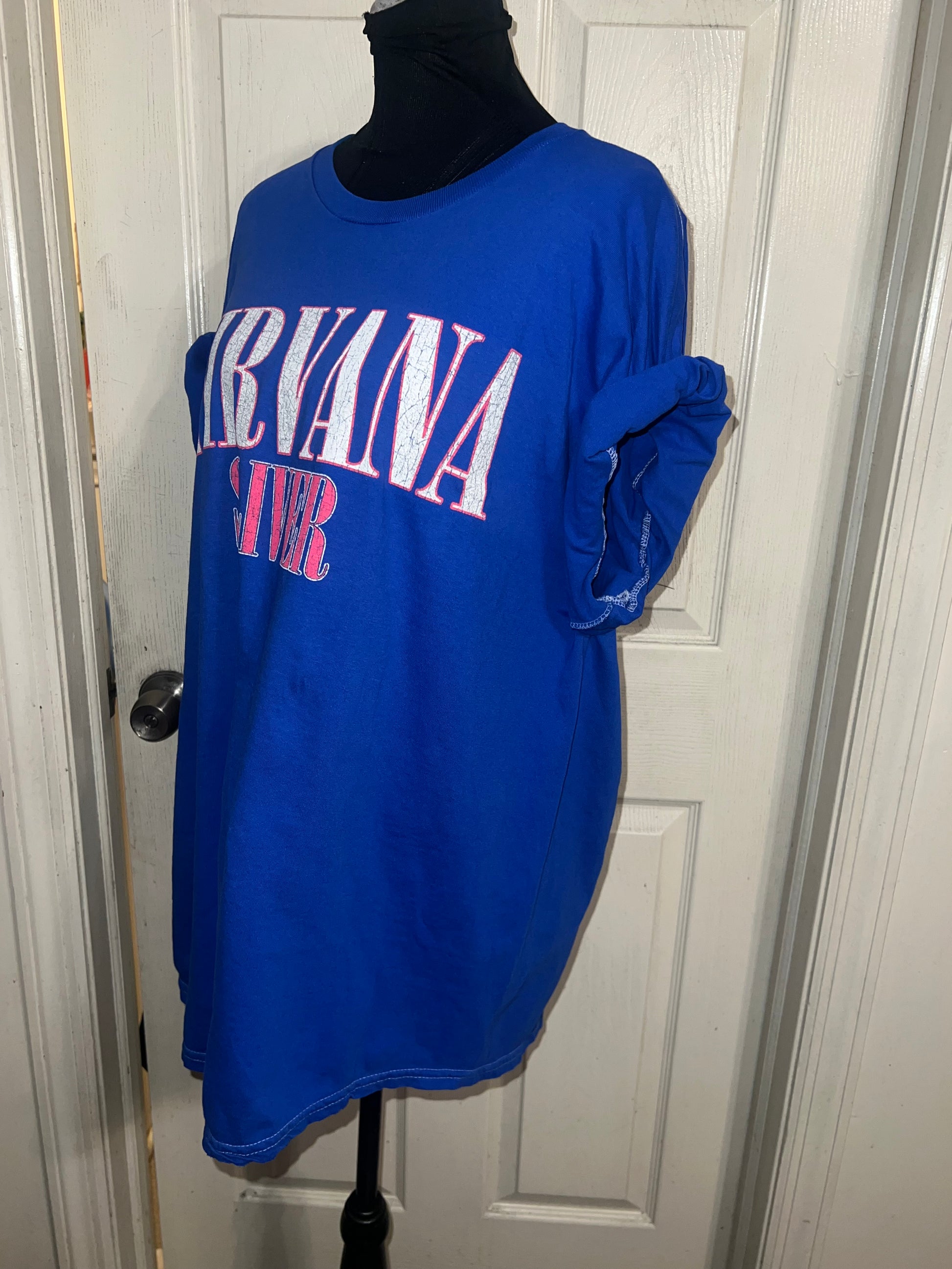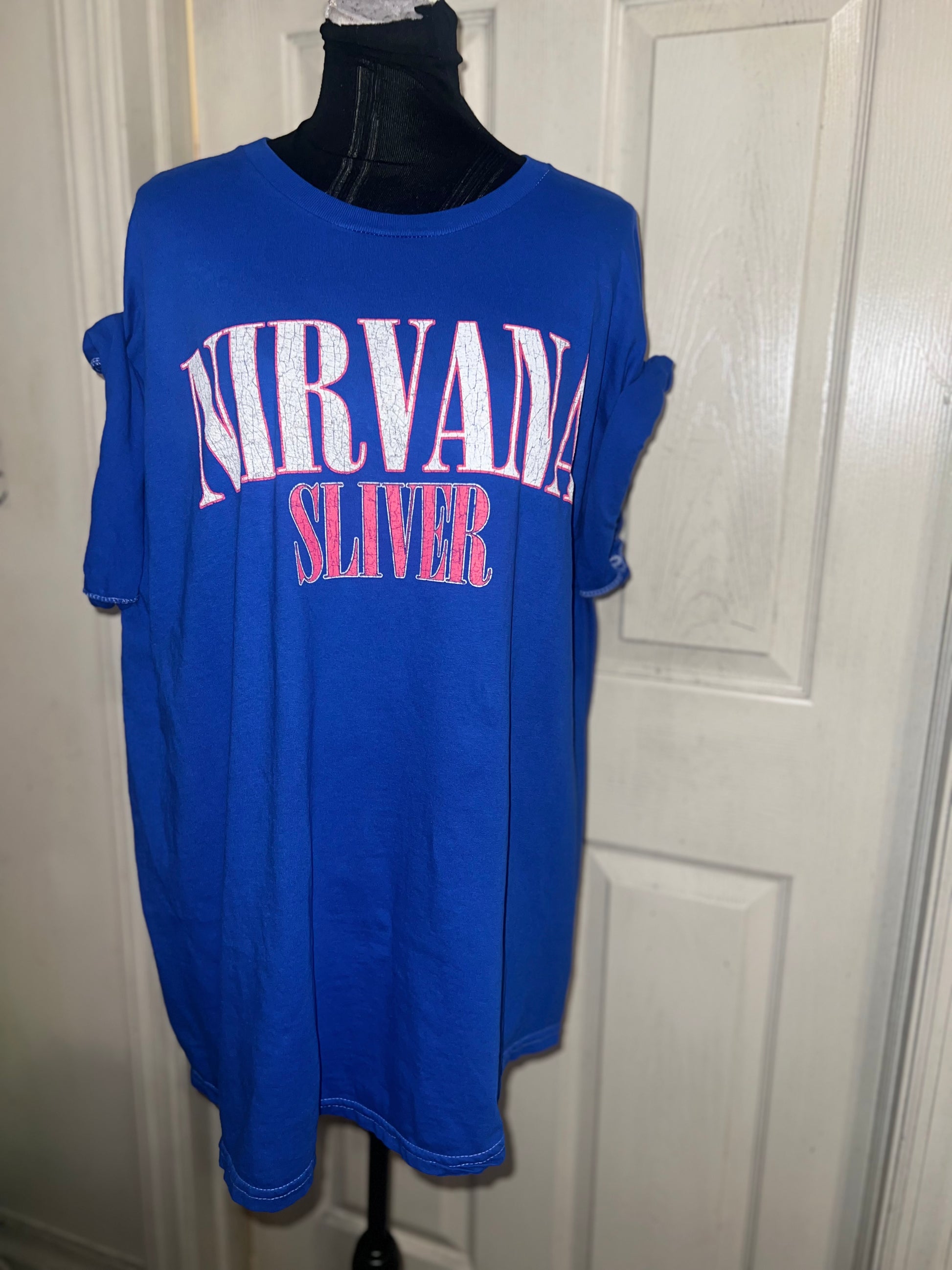 This is now a preorder. Please allow extra processing time. A super pretty blue Nirvana “Sliver” double sided tee with the album graphic on the back. Size XL, oversized.