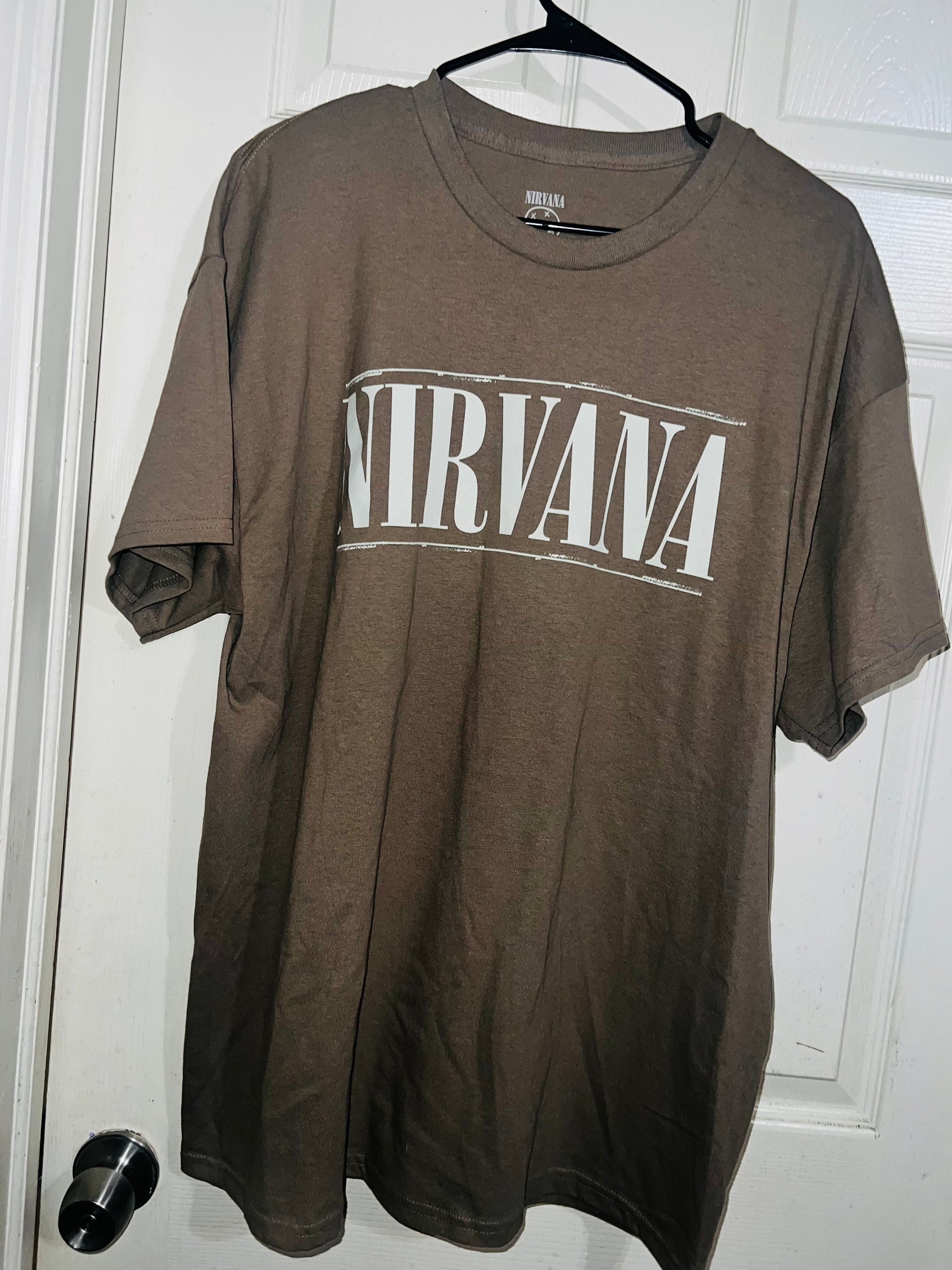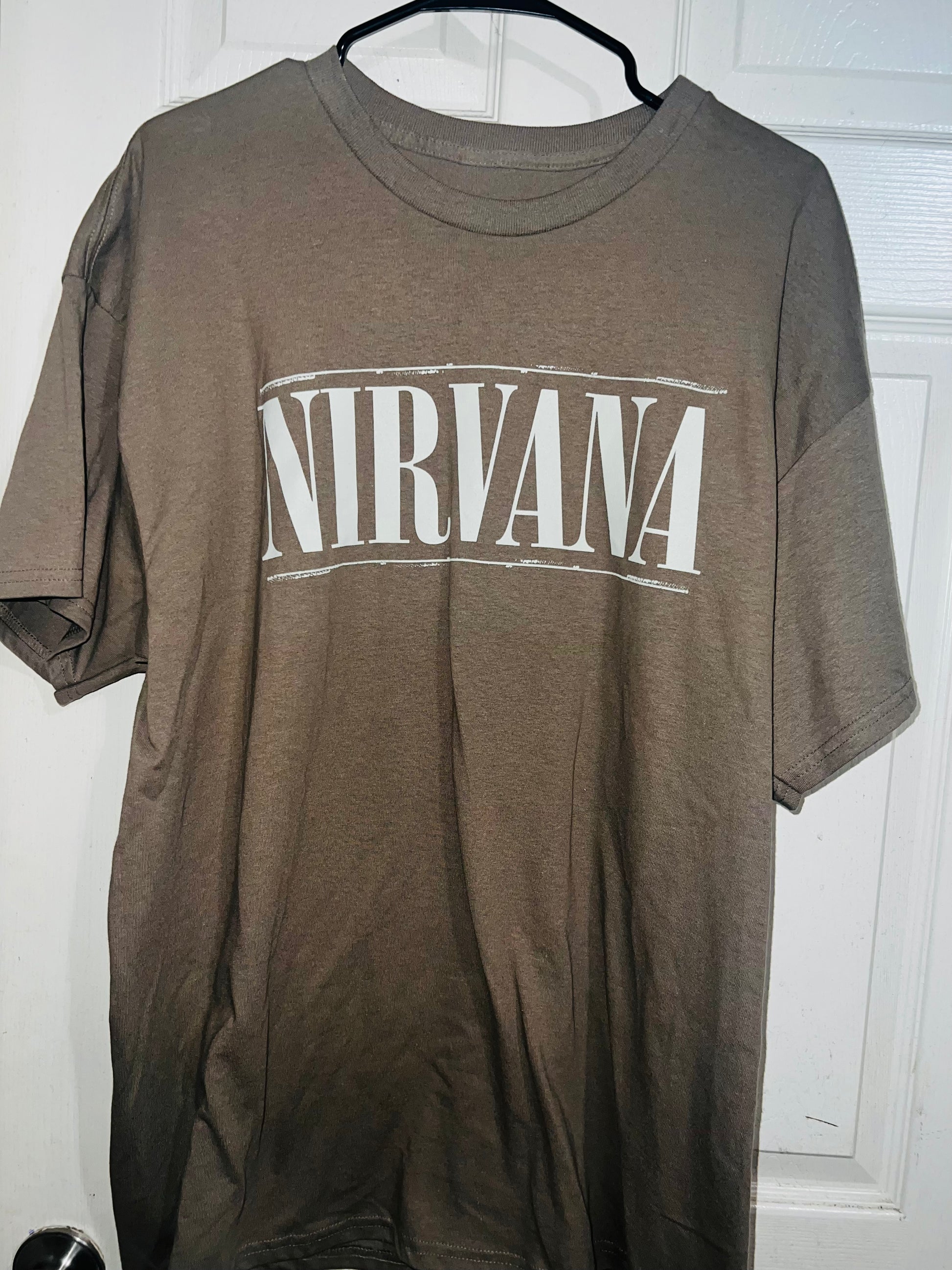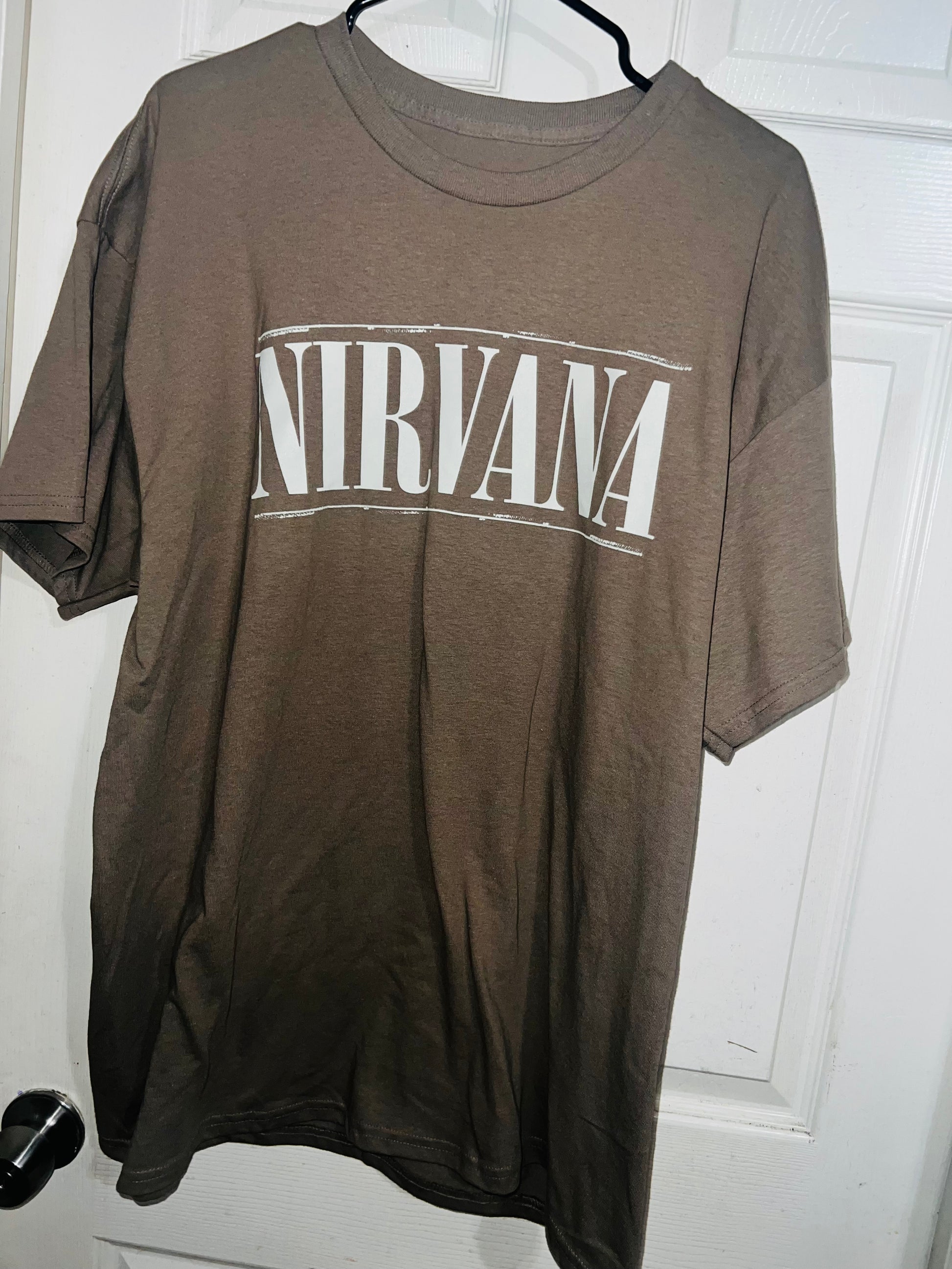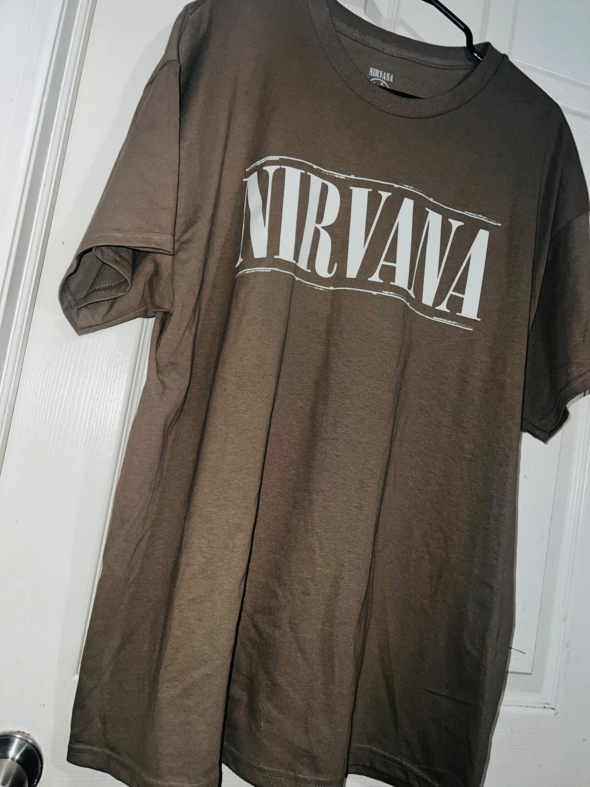 This is a preorder. A sand/beige colored shirt I got for the shop because when I tried it on with my leggings while I was out, it looked SO cute before even distressed. On the front it says Nirvana, and on the back has the giant epic logo- the smiley. Perfect for every day wear, matched everything. Comfortable! I’ll post a pic with it on next time! Super cute. Size XL oversized