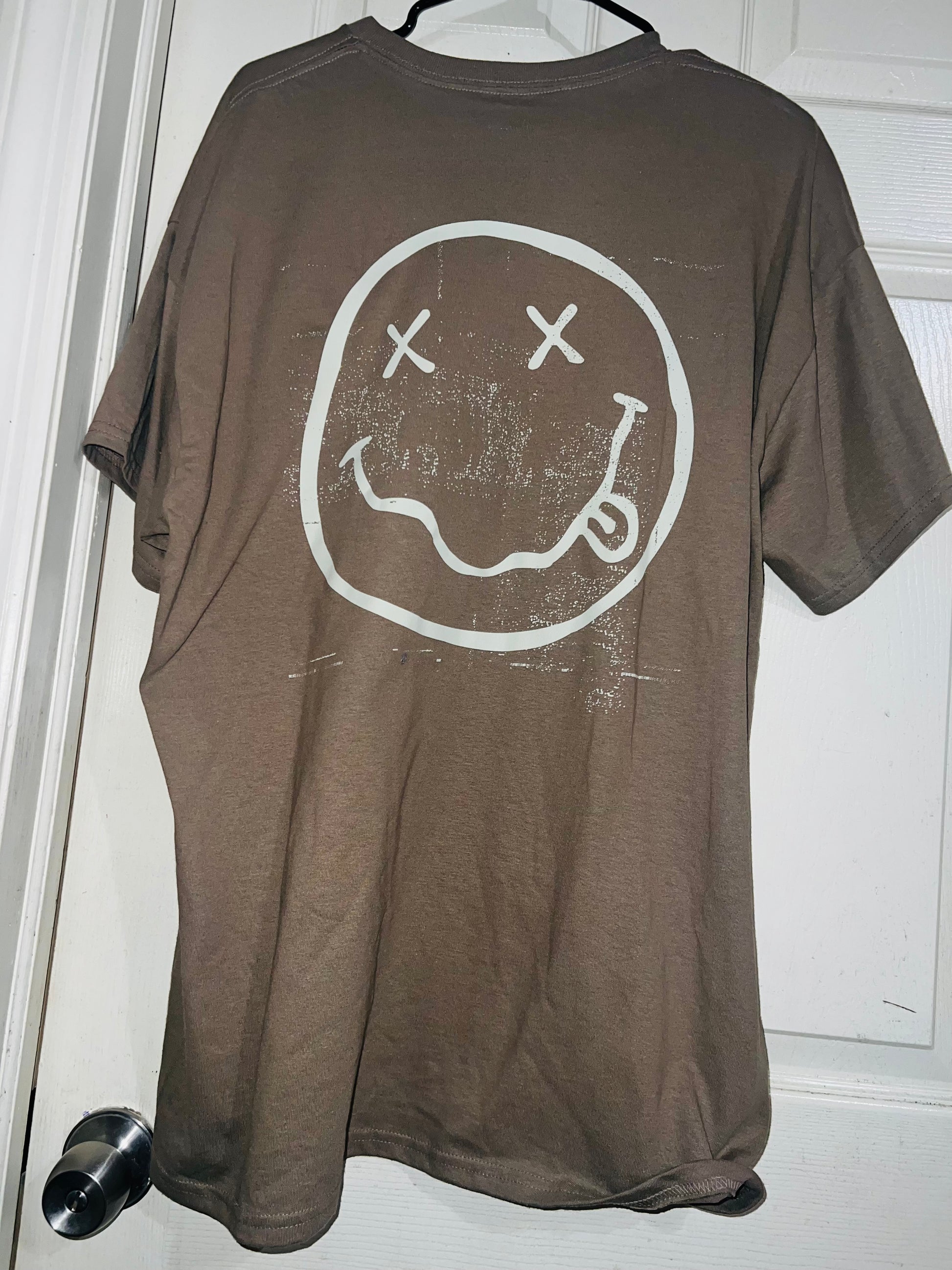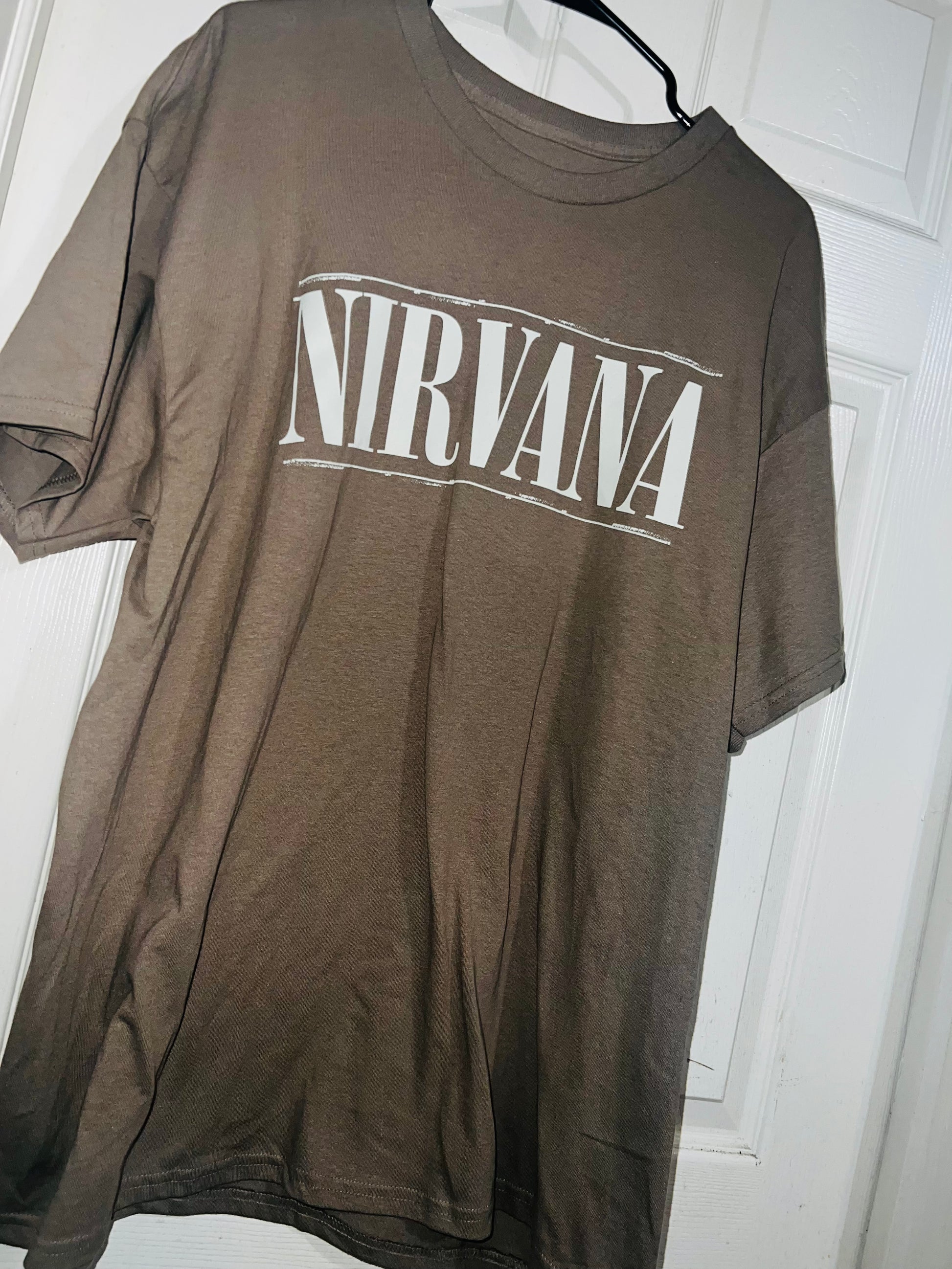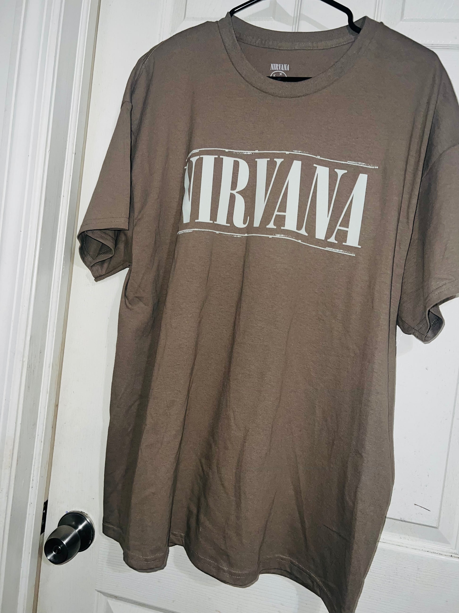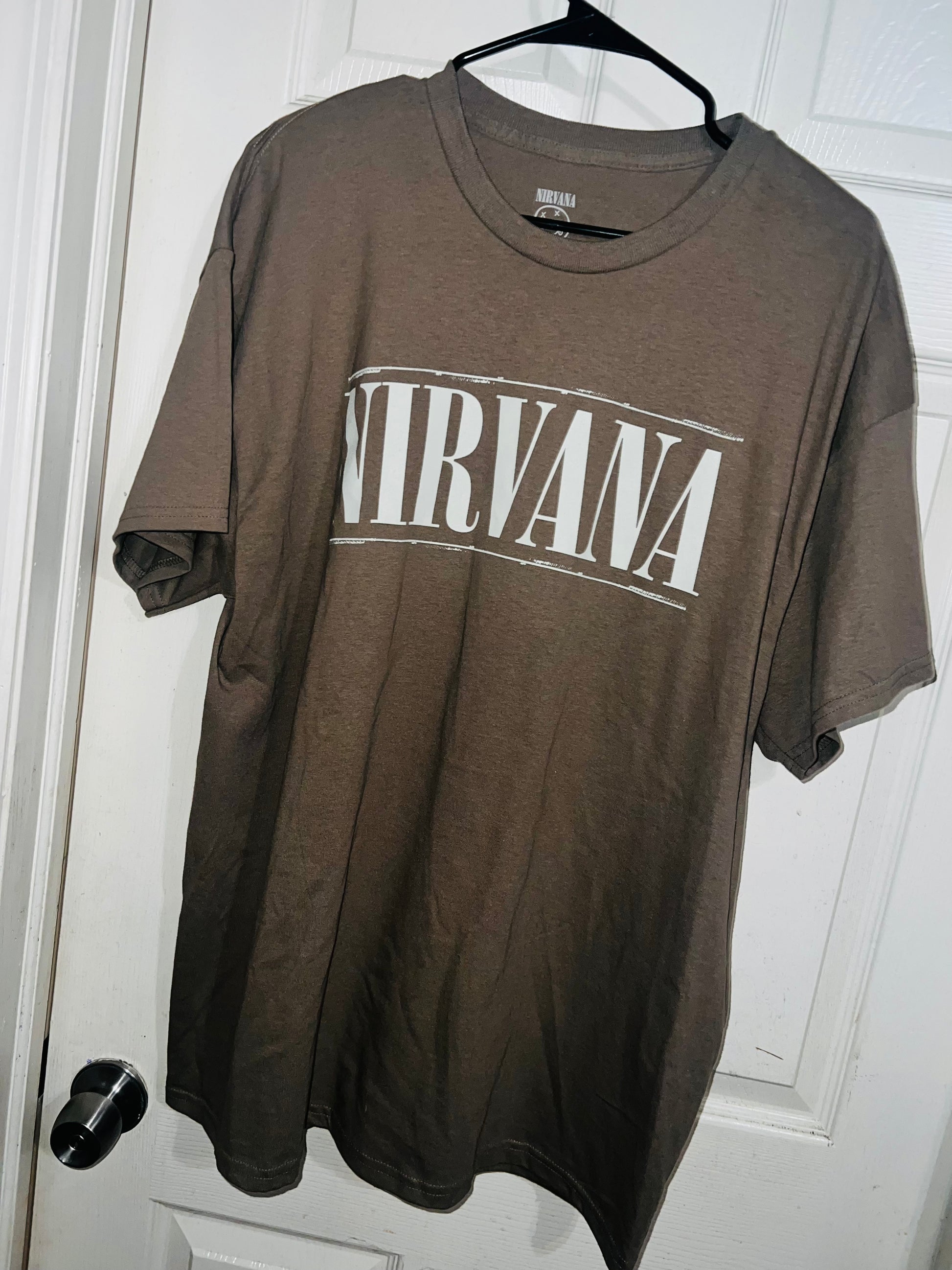 This is a preorder. A sand/beige colored shirt I got for the shop because when I tried it on with my leggings while I was out, it looked SO cute before even distressed. On the front it says Nirvana, and on the back has the giant epic logo- the smiley. Perfect for every day wear, matched everything. Comfortable! I’ll post a pic with it on next time! Super cute. Size XL oversized