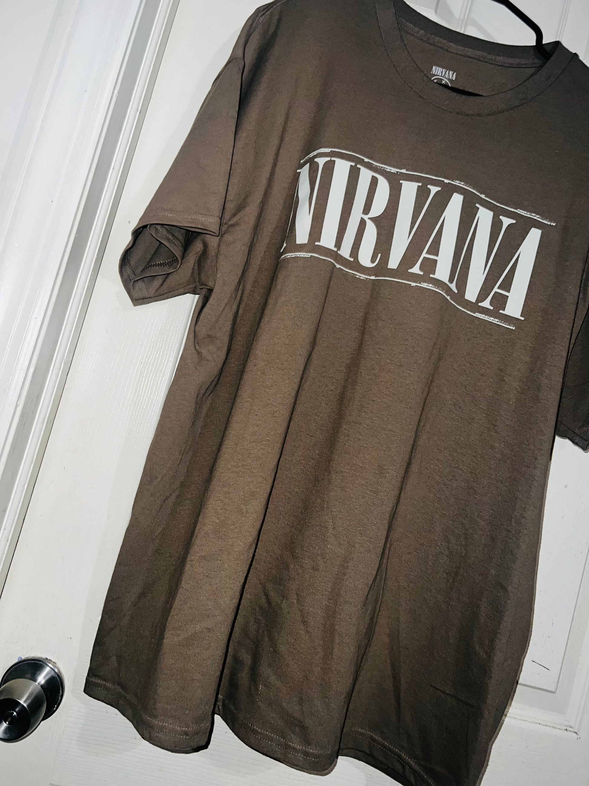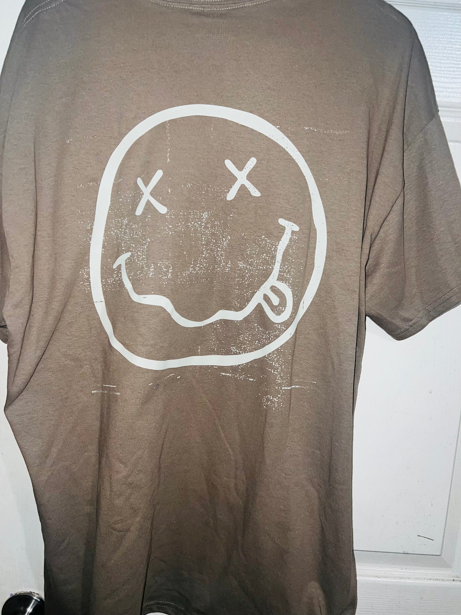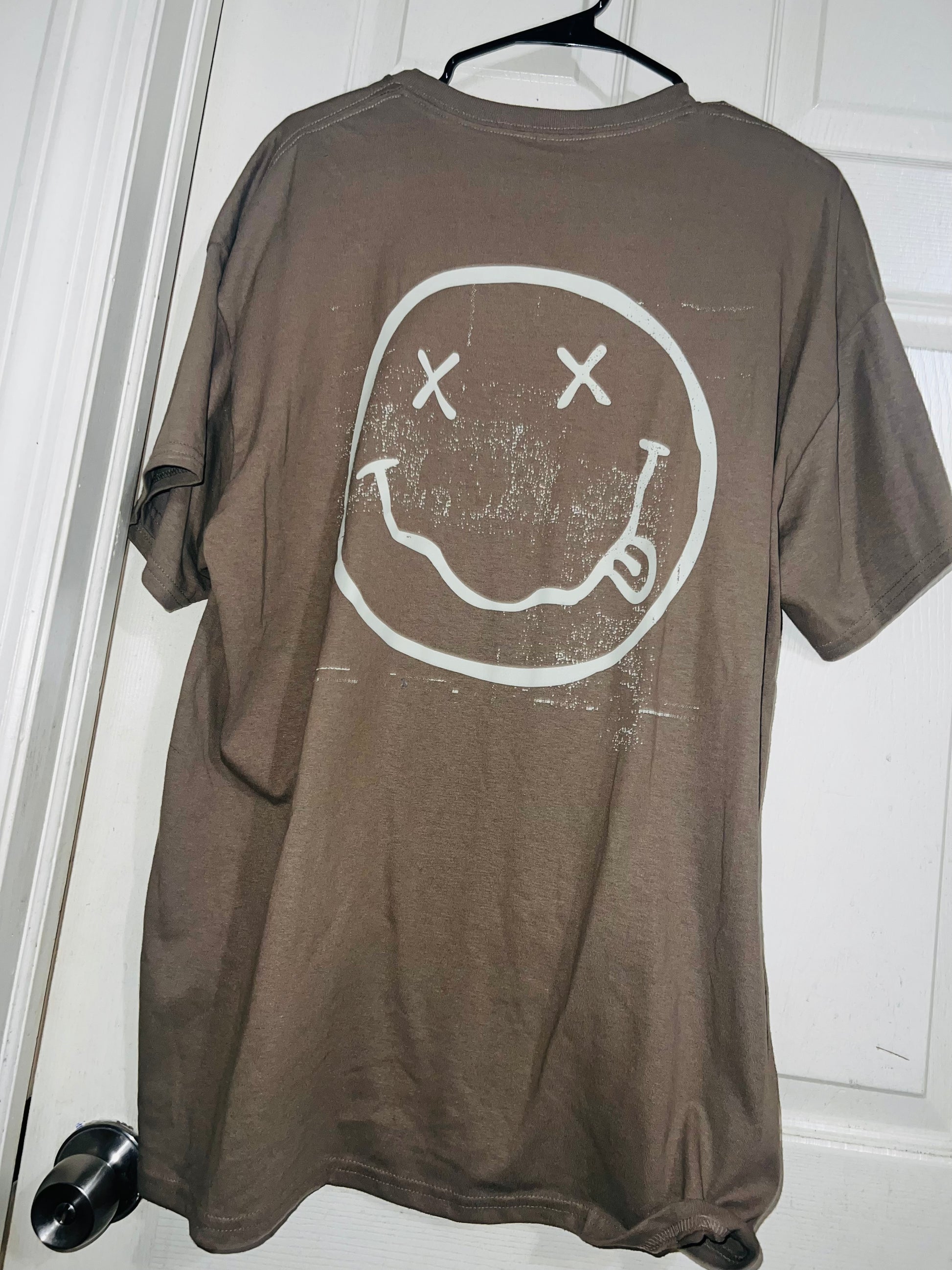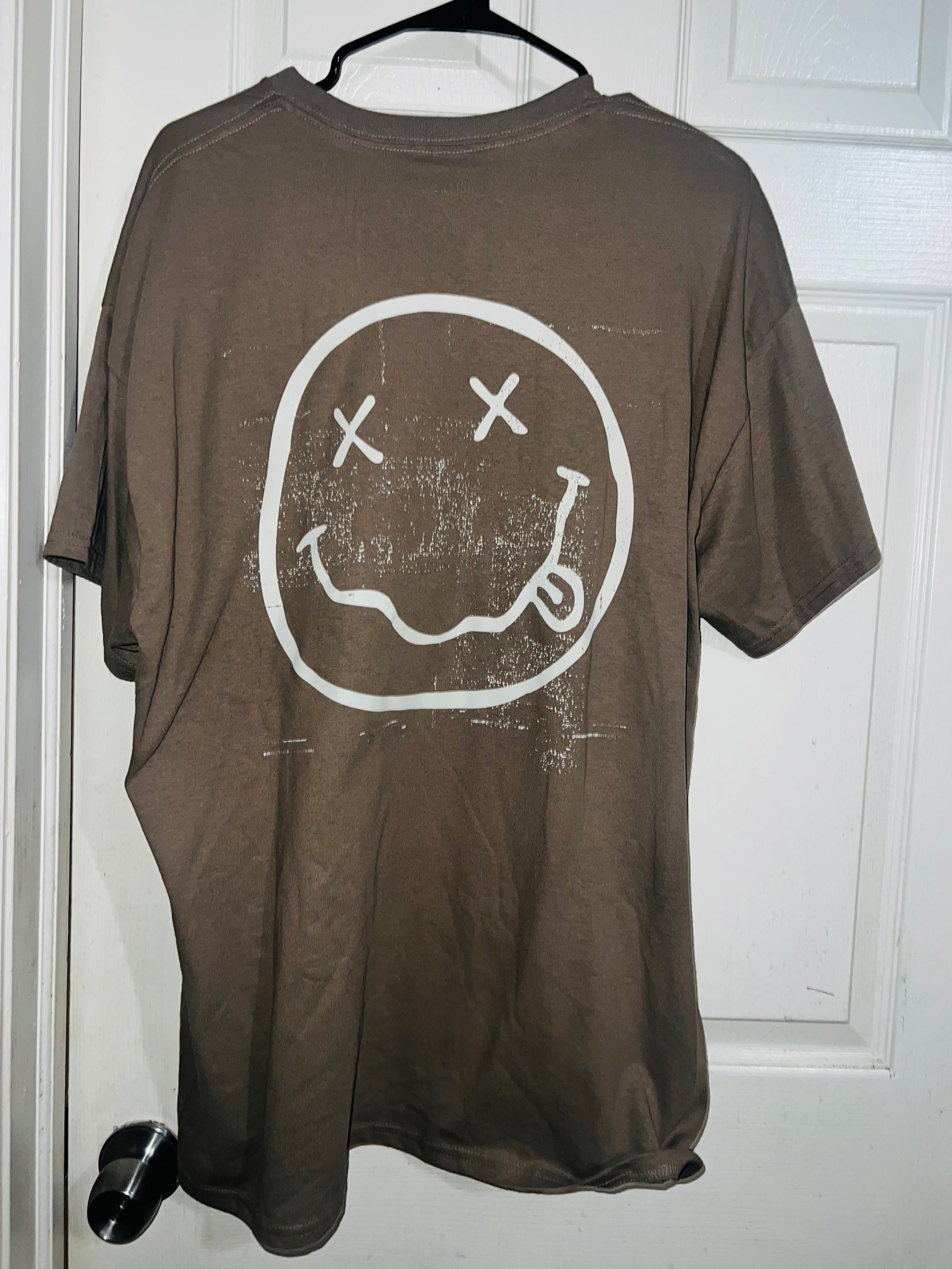 This is a preorder. A sand/beige colored shirt I got for the shop because when I tried it on with my leggings while I was out, it looked SO cute before even distressed. On the front it says Nirvana, and on the back has the giant epic logo- the smiley. Perfect for every day wear, matched everything. Comfortable! I’ll post a pic with it on next time! Super cute. Size XL oversized