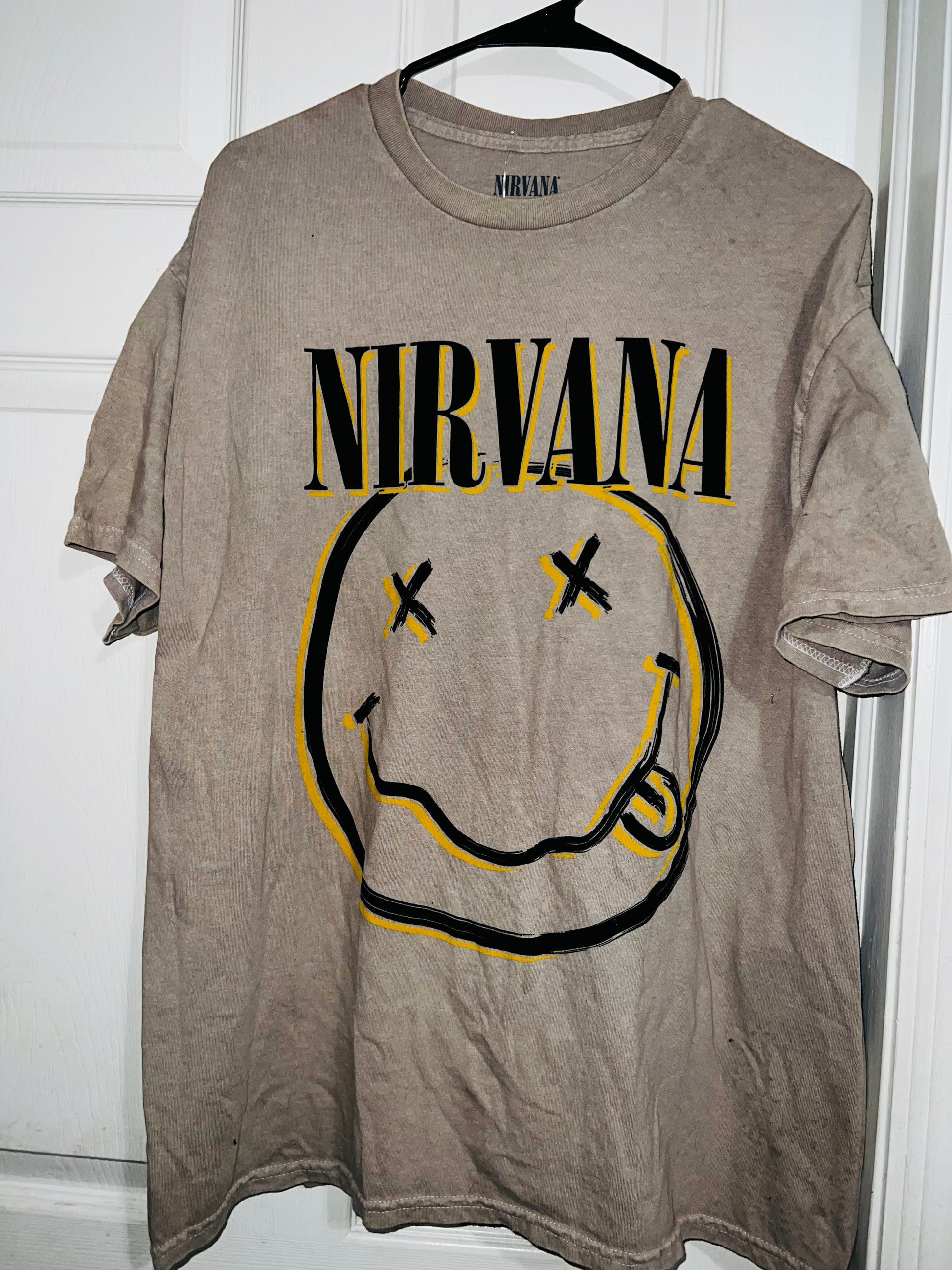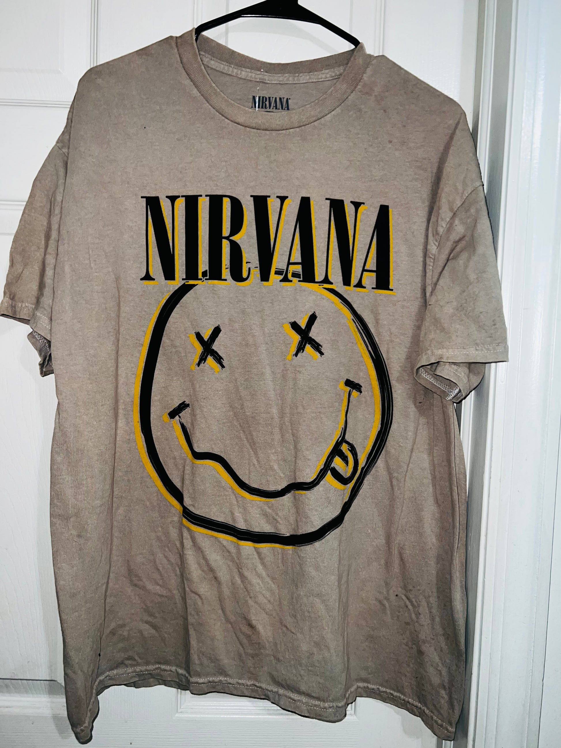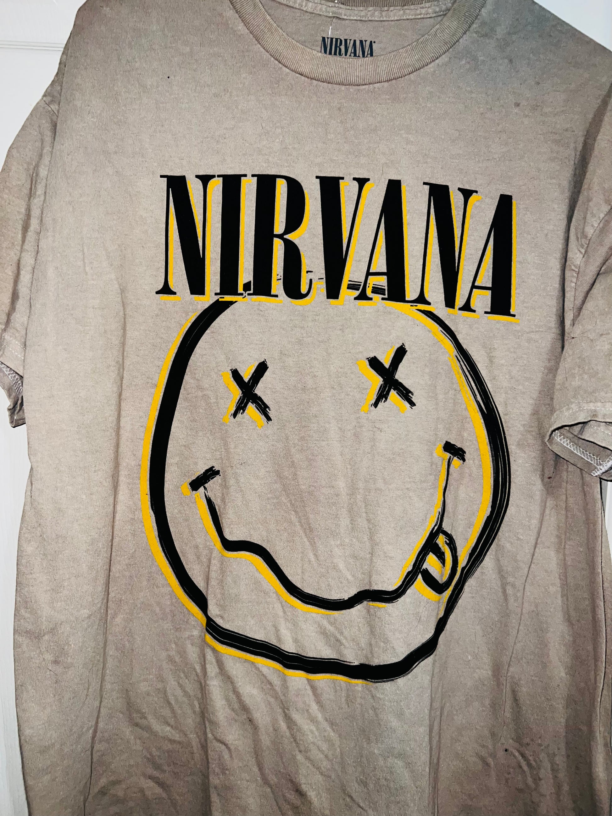 This is a preorder. Please allow extra processing time if ordered. A beige Nirvana oversized t-shirt with the Nirvana smiley in black! Such a nice color that goes with everything. Size large! Sold a few times and everyone loves it. This is not distressed yet, so be sure to choose your distress level or any customizations.