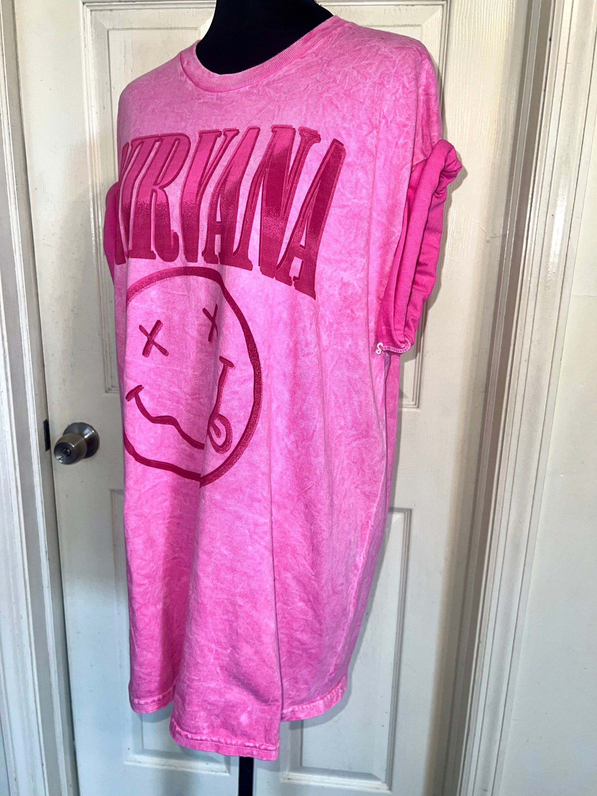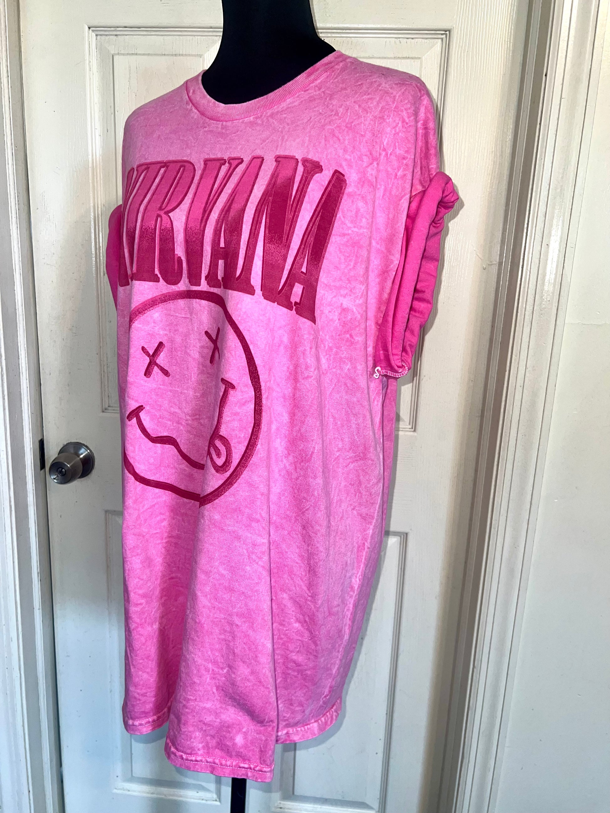 A pretty mineral washed pink Nirvana tee with the iconic smiley. Size L/XL, oversized.