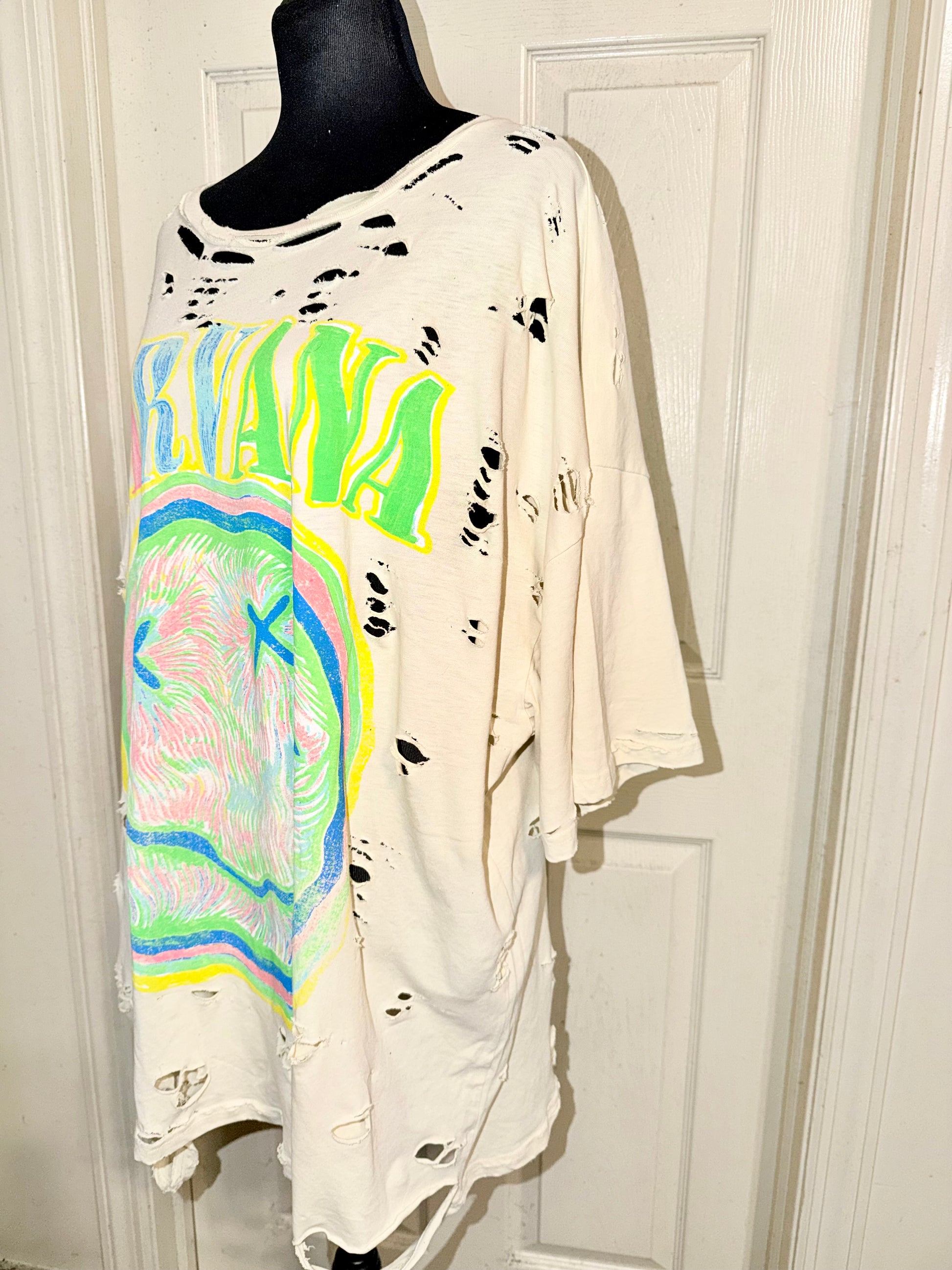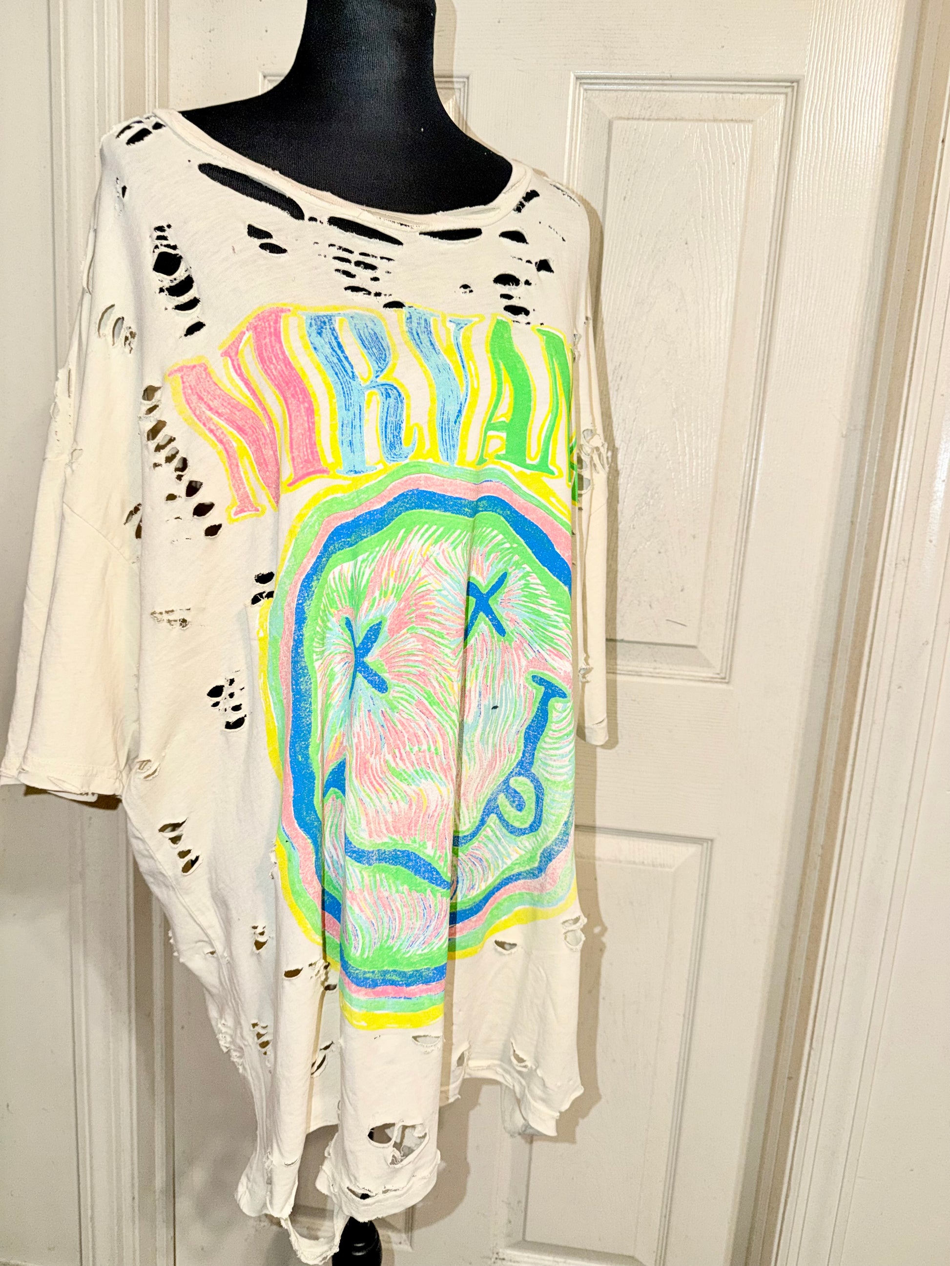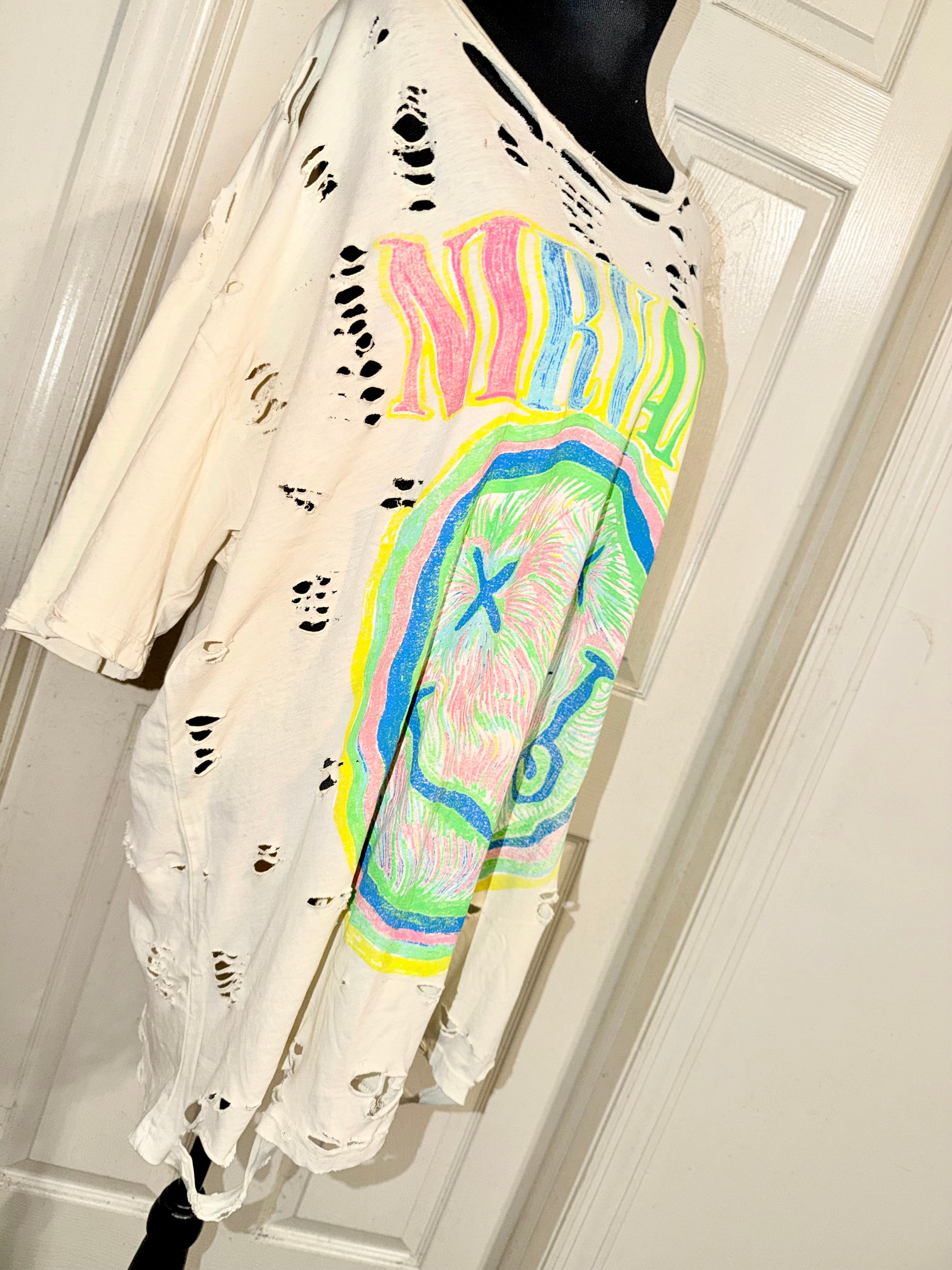 This is distressed already. A cream Nirvana tee with distressed edges and dropped shoulders. SUPER soft and super comfortable. Love this fit. Oversized.