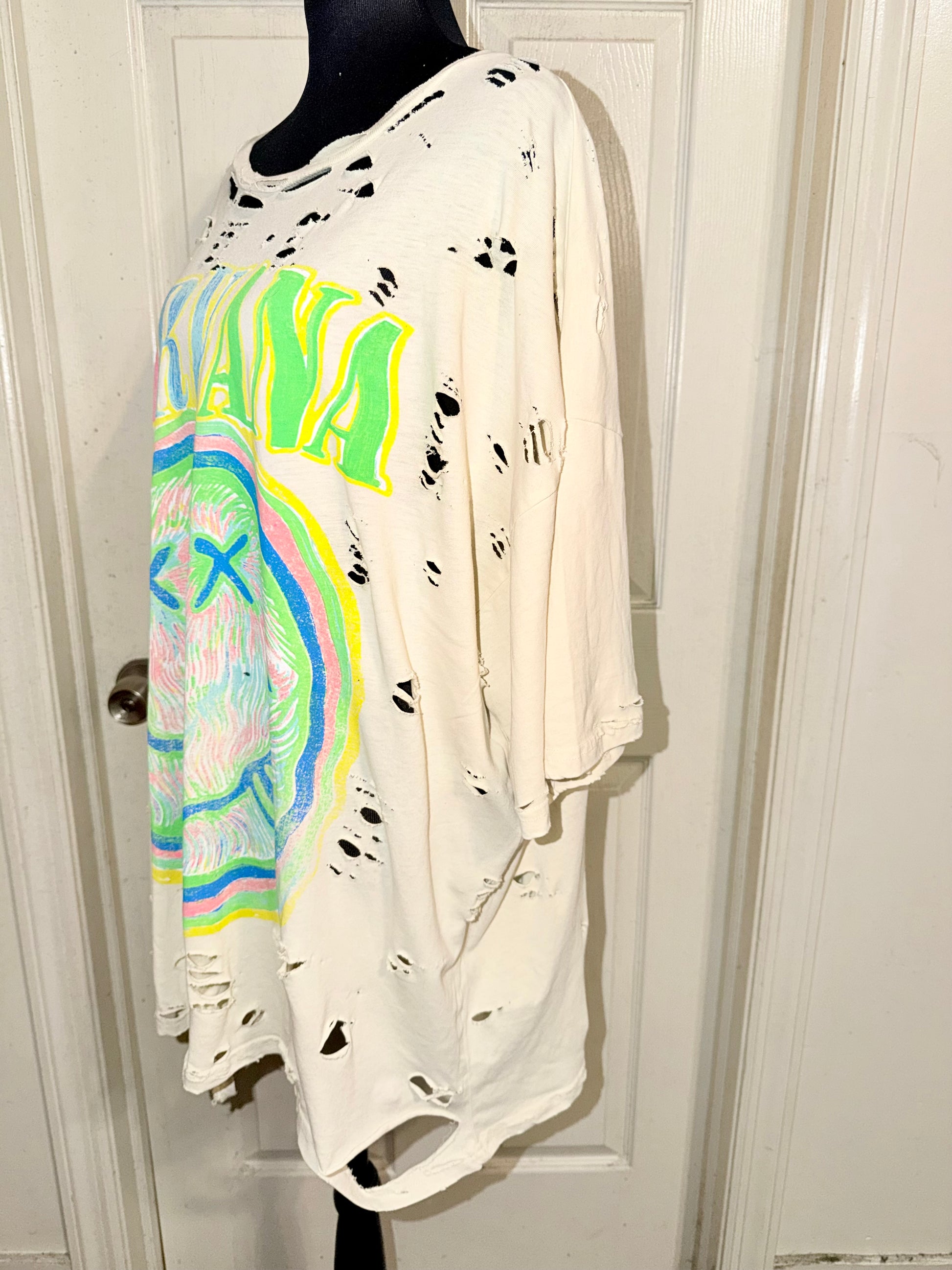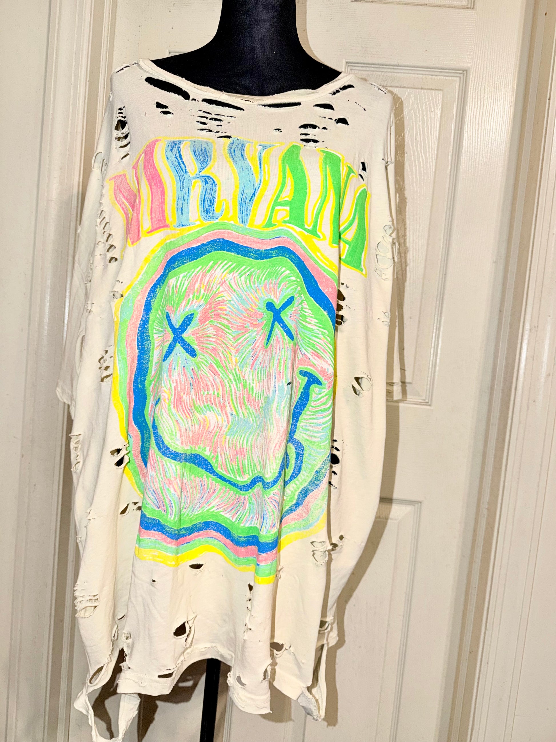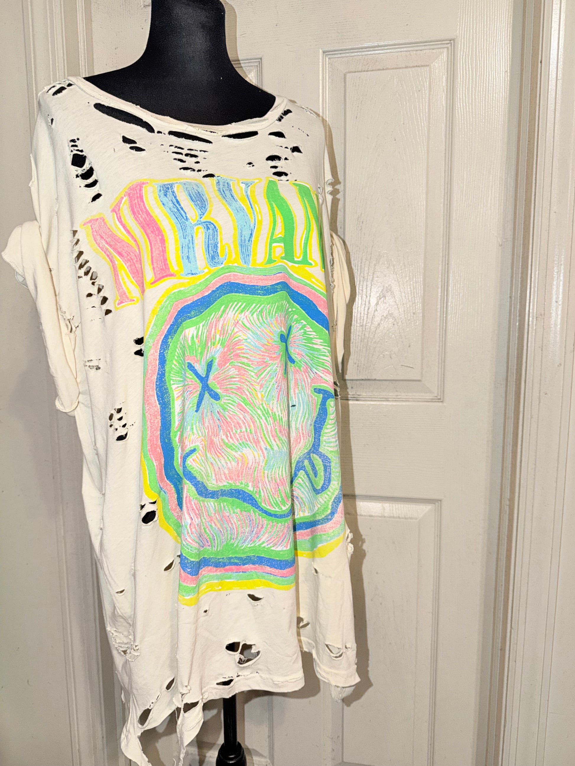 This is distressed already. A cream Nirvana tee with distressed edges and dropped shoulders. SUPER soft and super comfortable. Love this fit. Oversized.