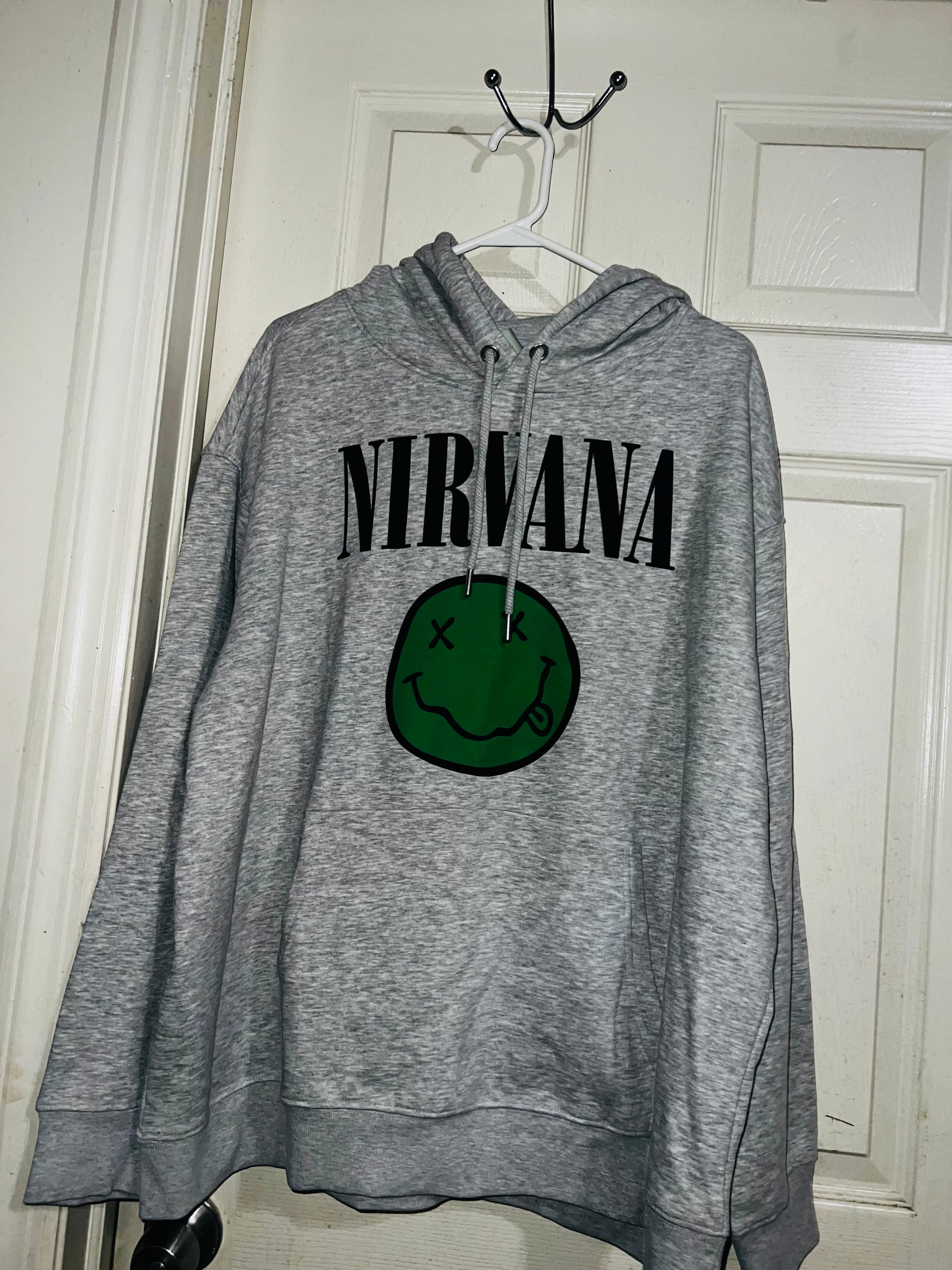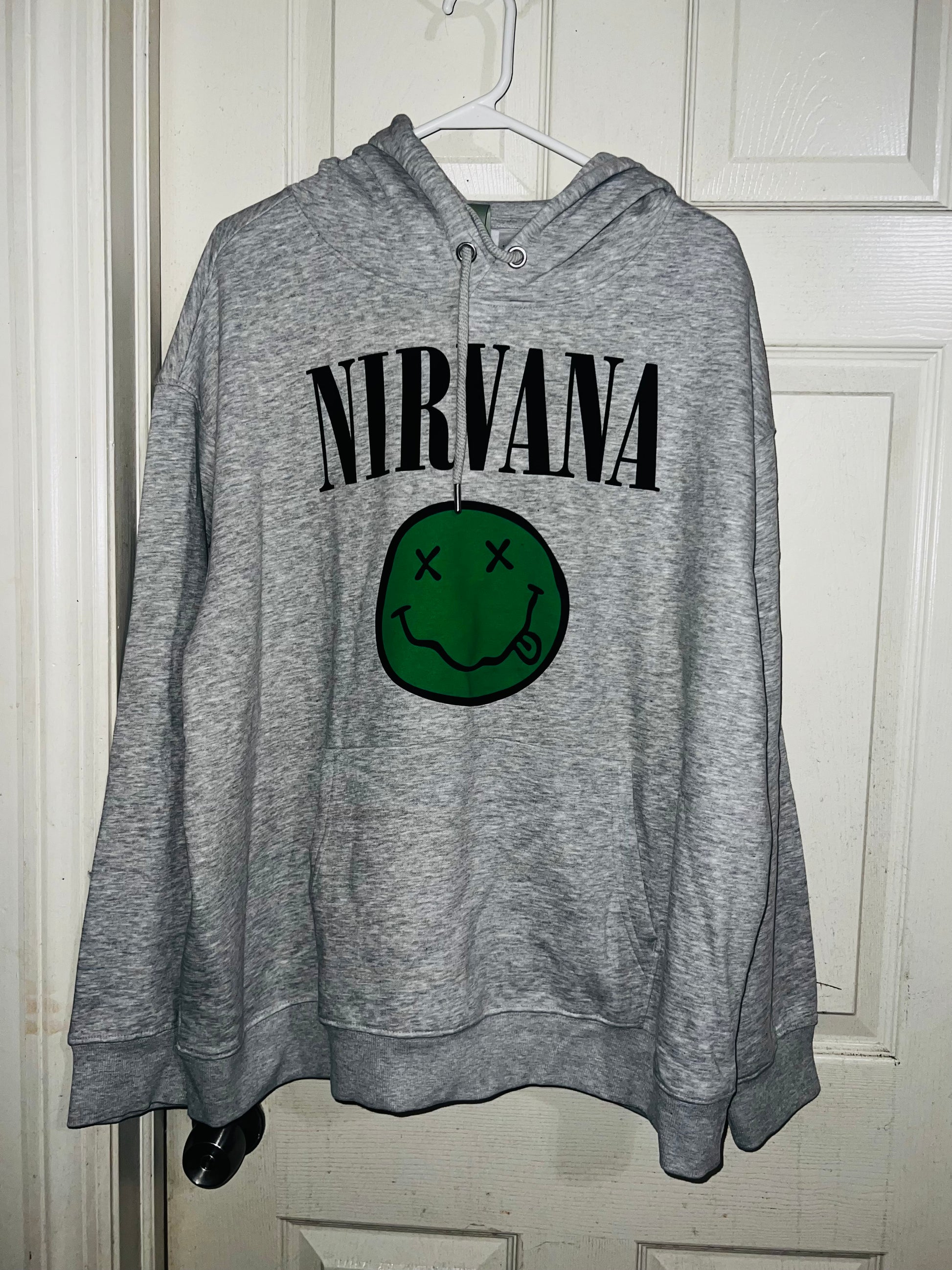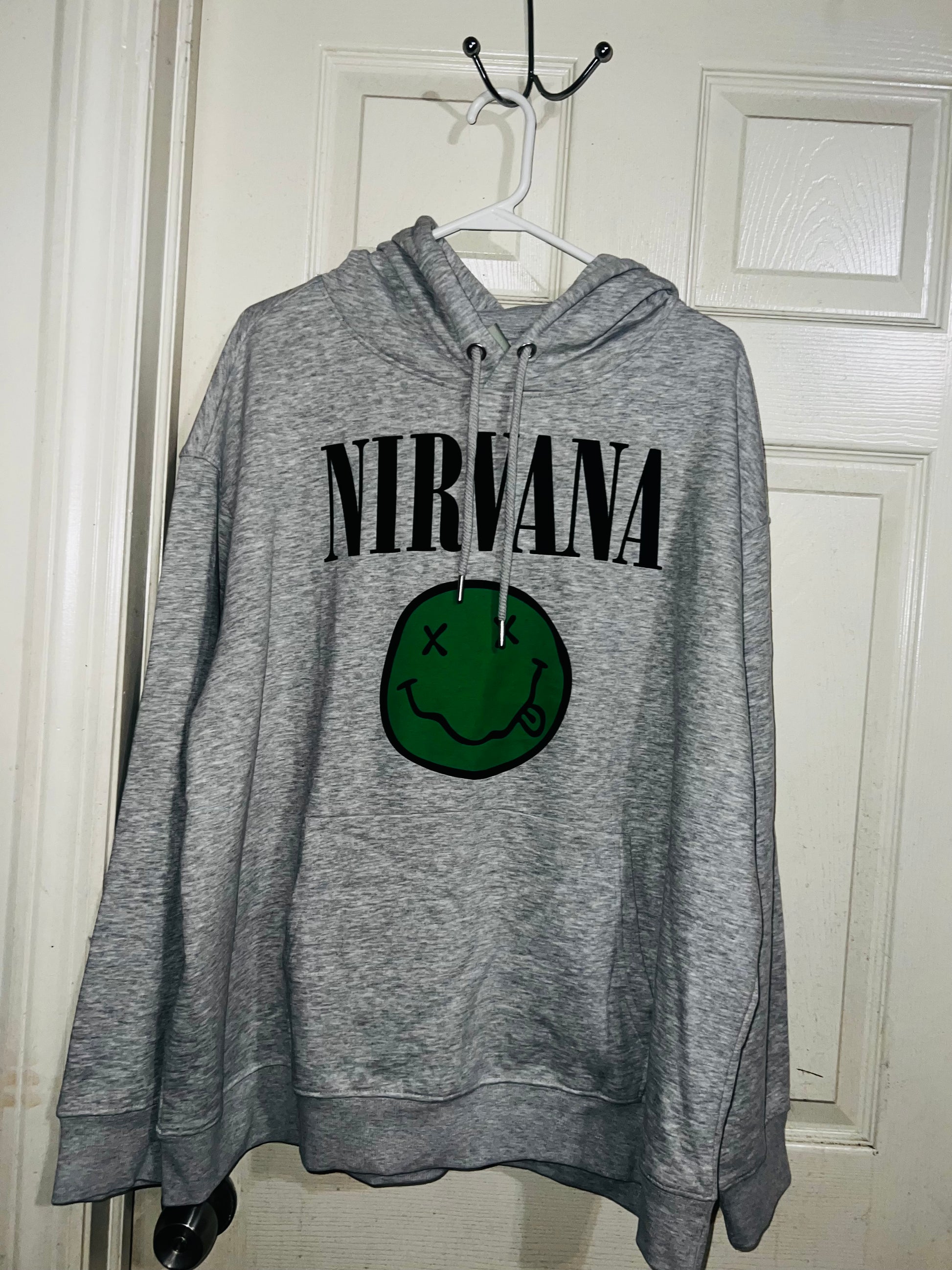 A grey hoodie with a super pretty and cute Nirvana smiley slogo in green on the front. Oversized and comfortable. Size XL.