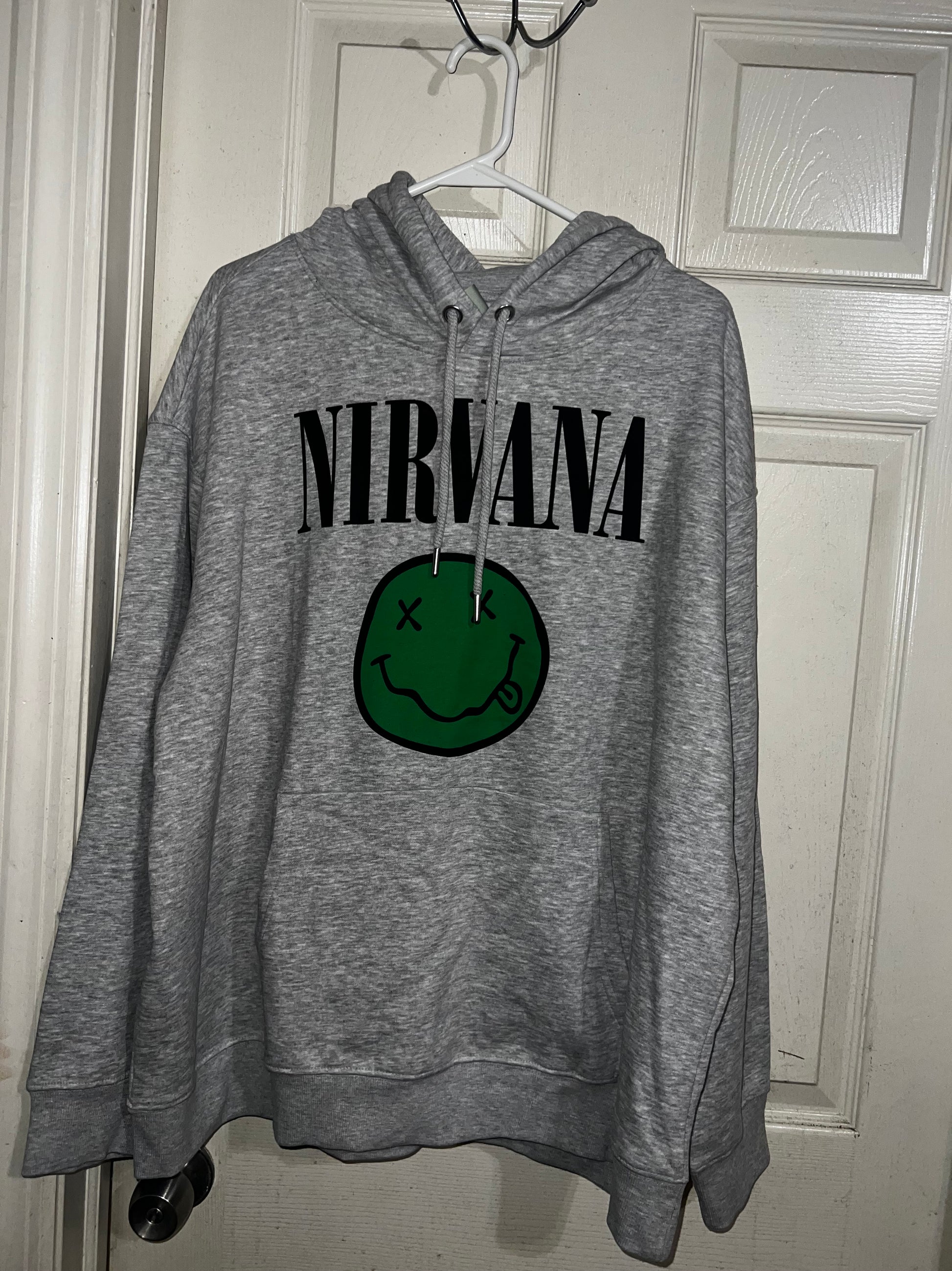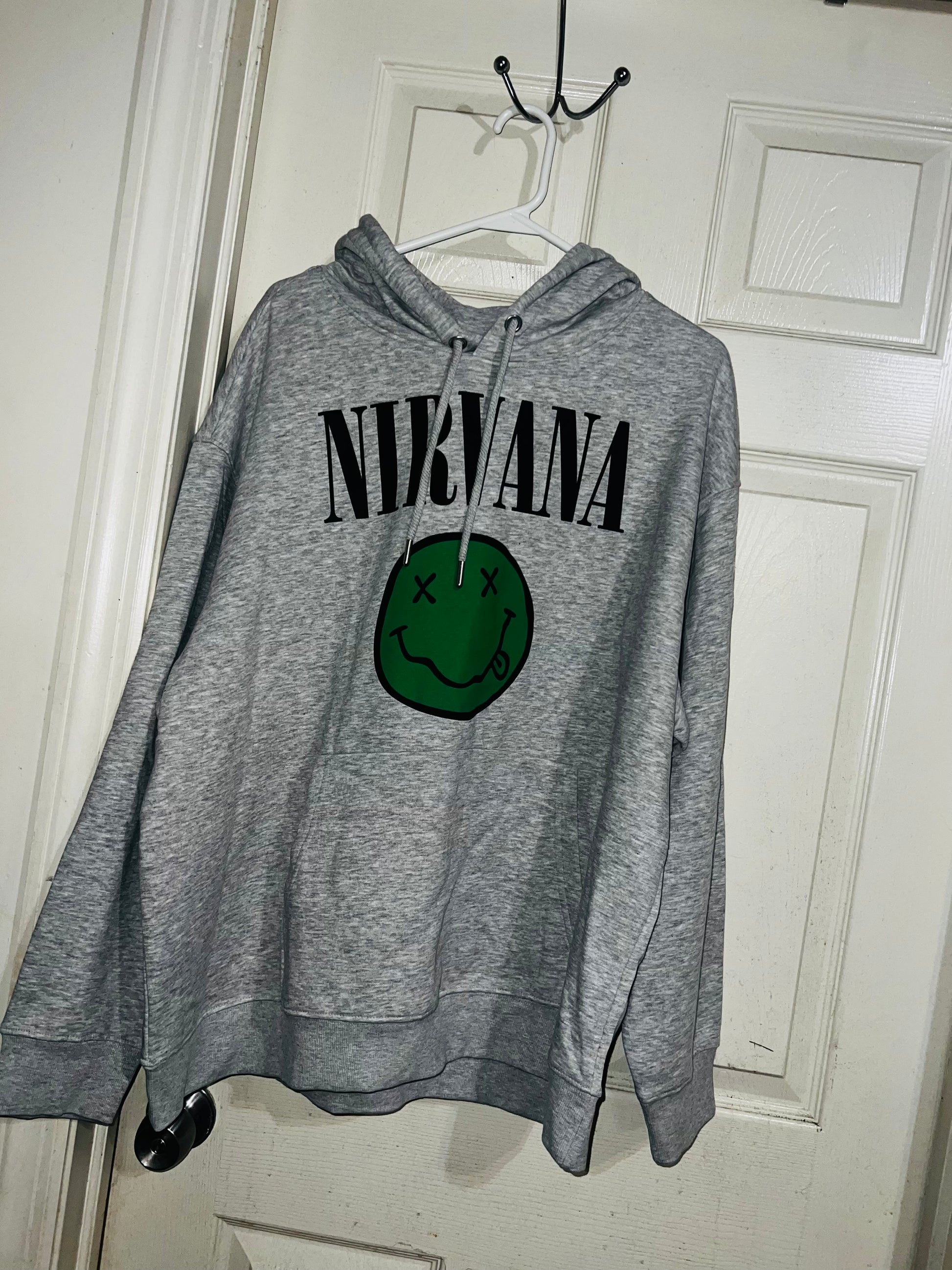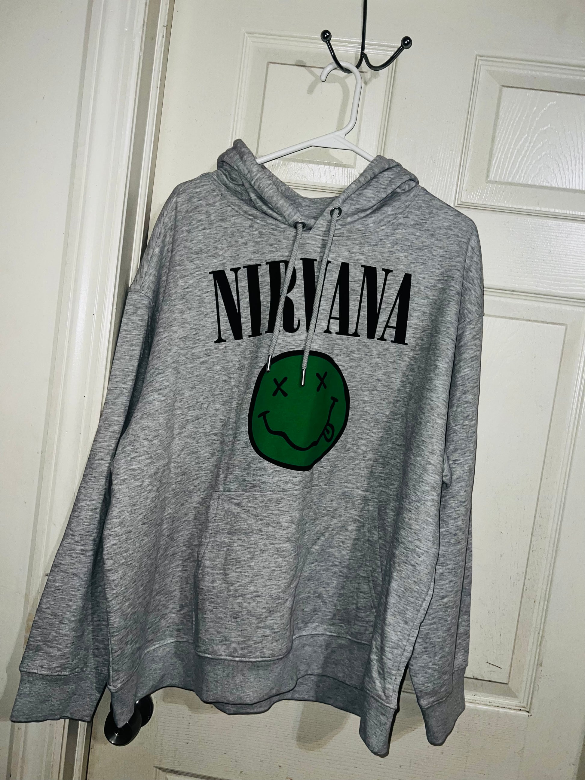 A grey hoodie with a super pretty and cute Nirvana smiley slogo in green on the front. Oversized and comfortable. Size XL.