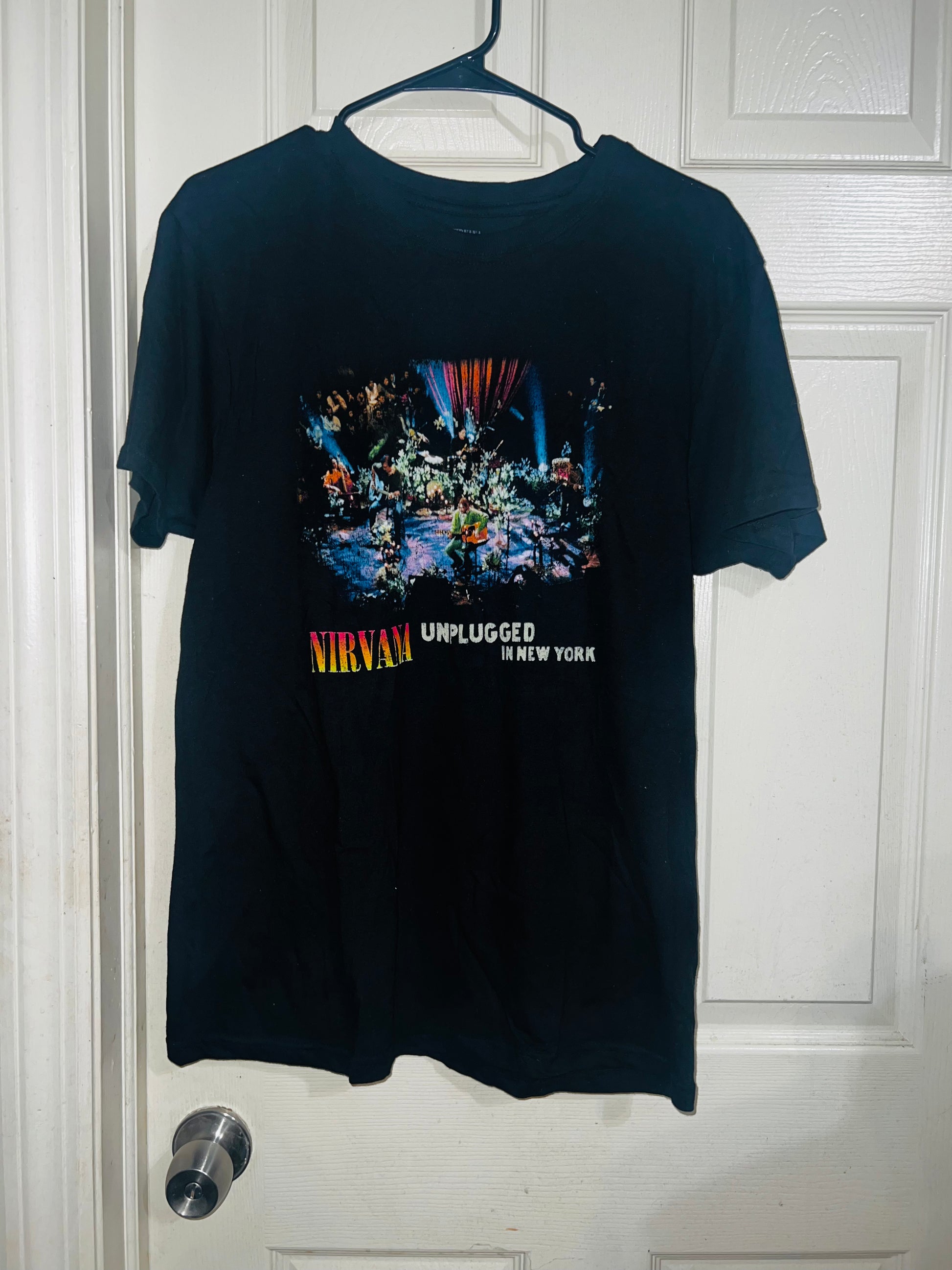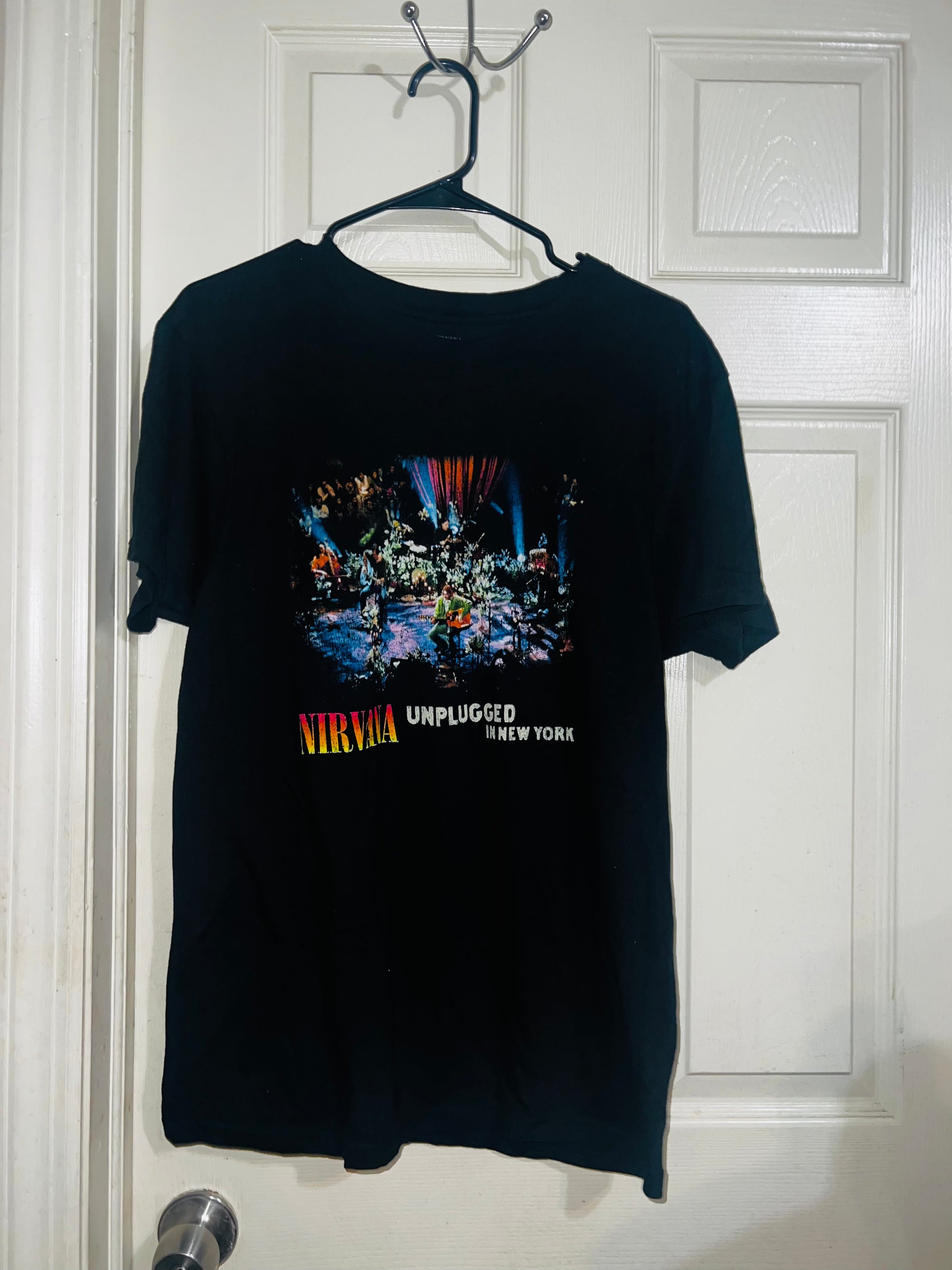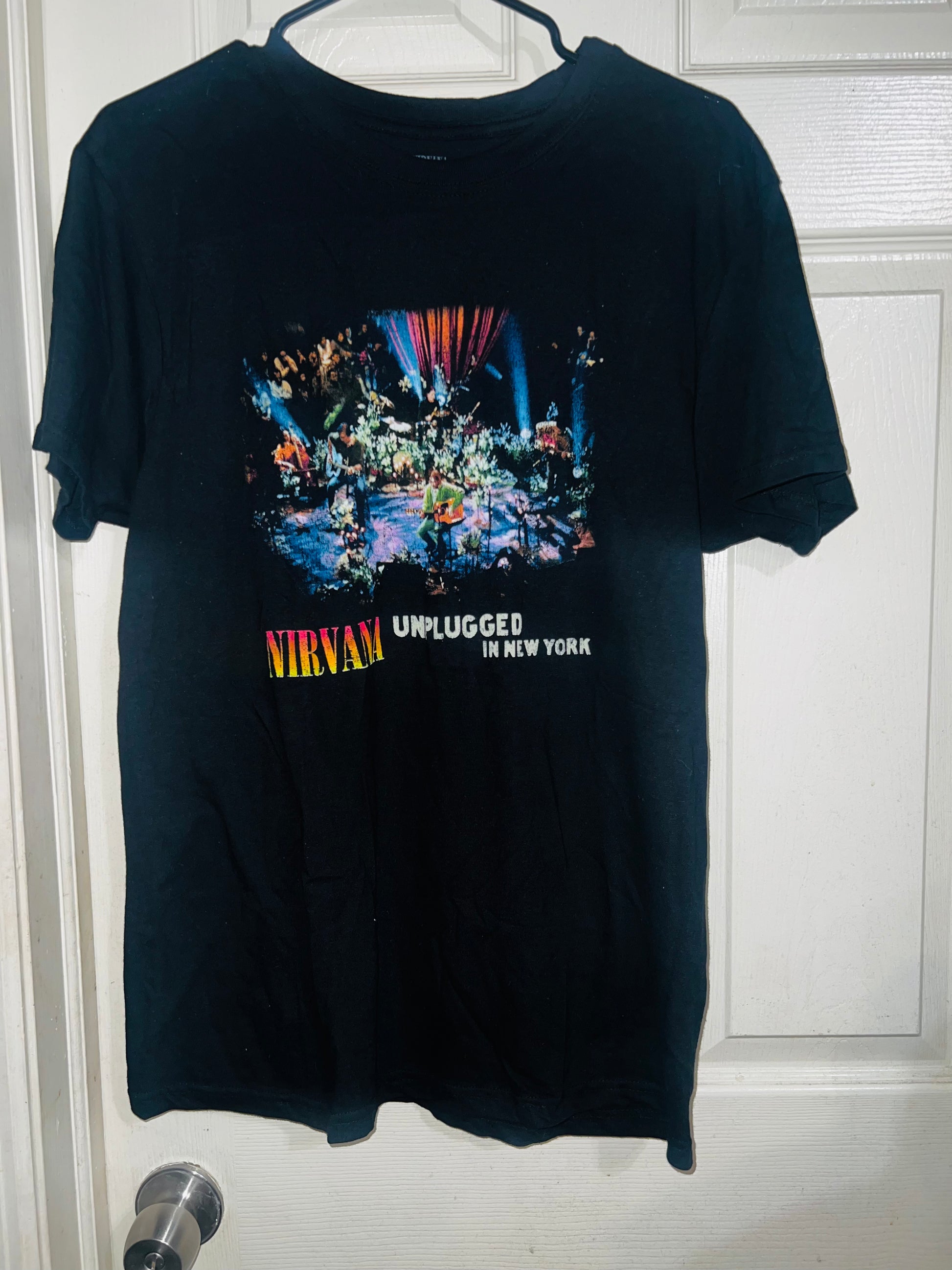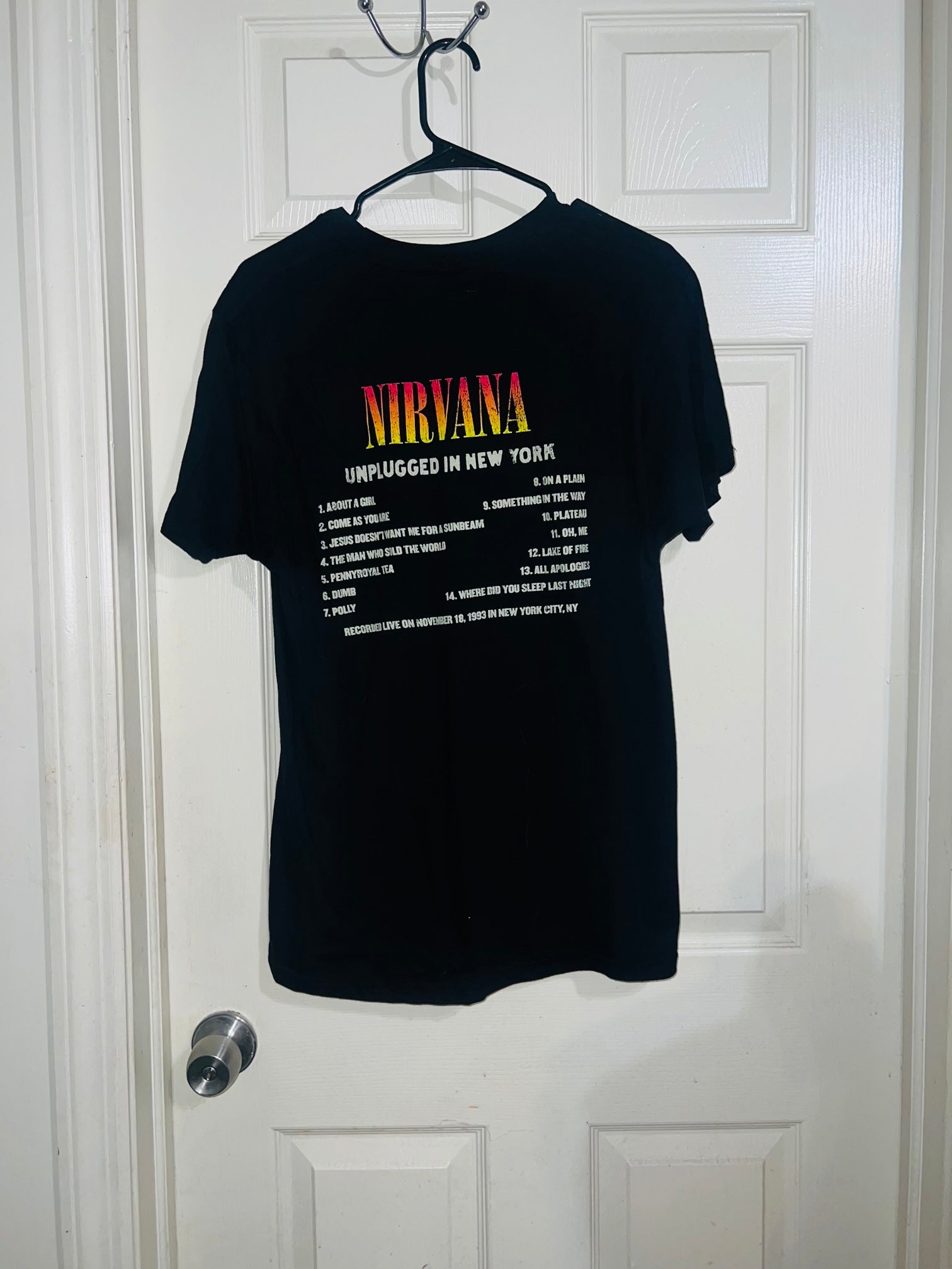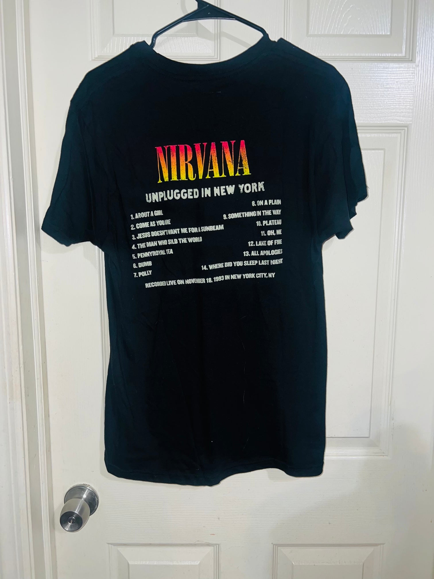 This is now a preorder. Please allow extra processing time. Nirvana unplugged in NYC double sided t-shirt with the track list on the back. This is one of my favorite sets they’ve played, and it makes me cry every time. Multiple sizes, but fits bigger and oversized.