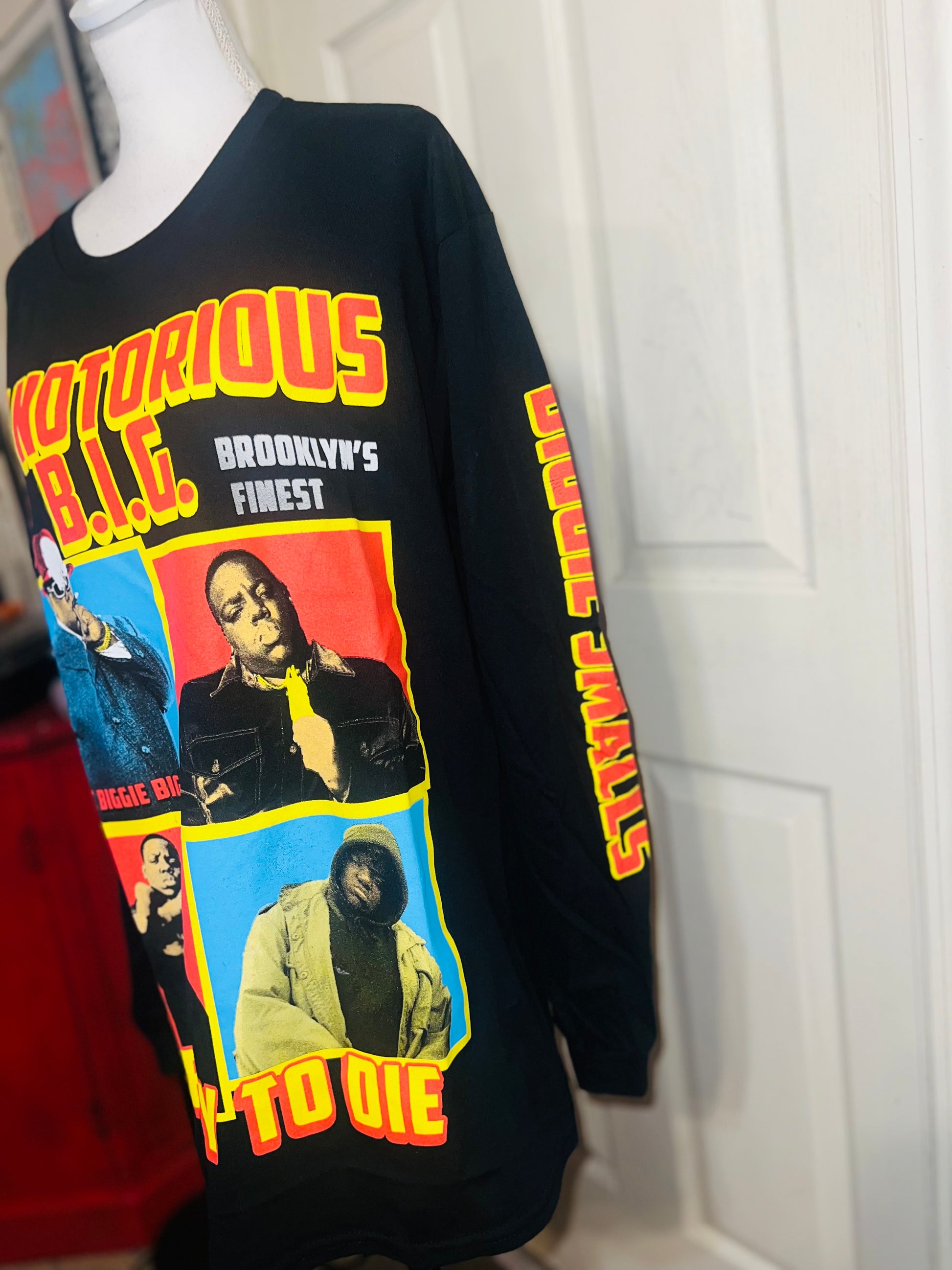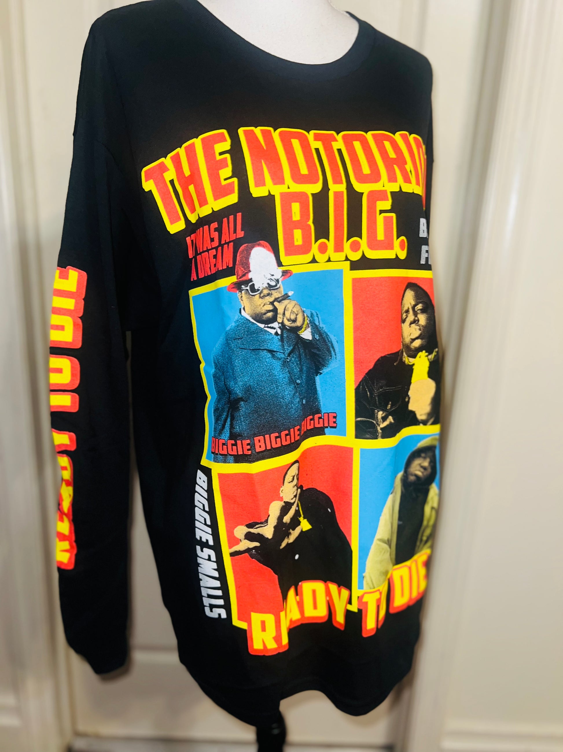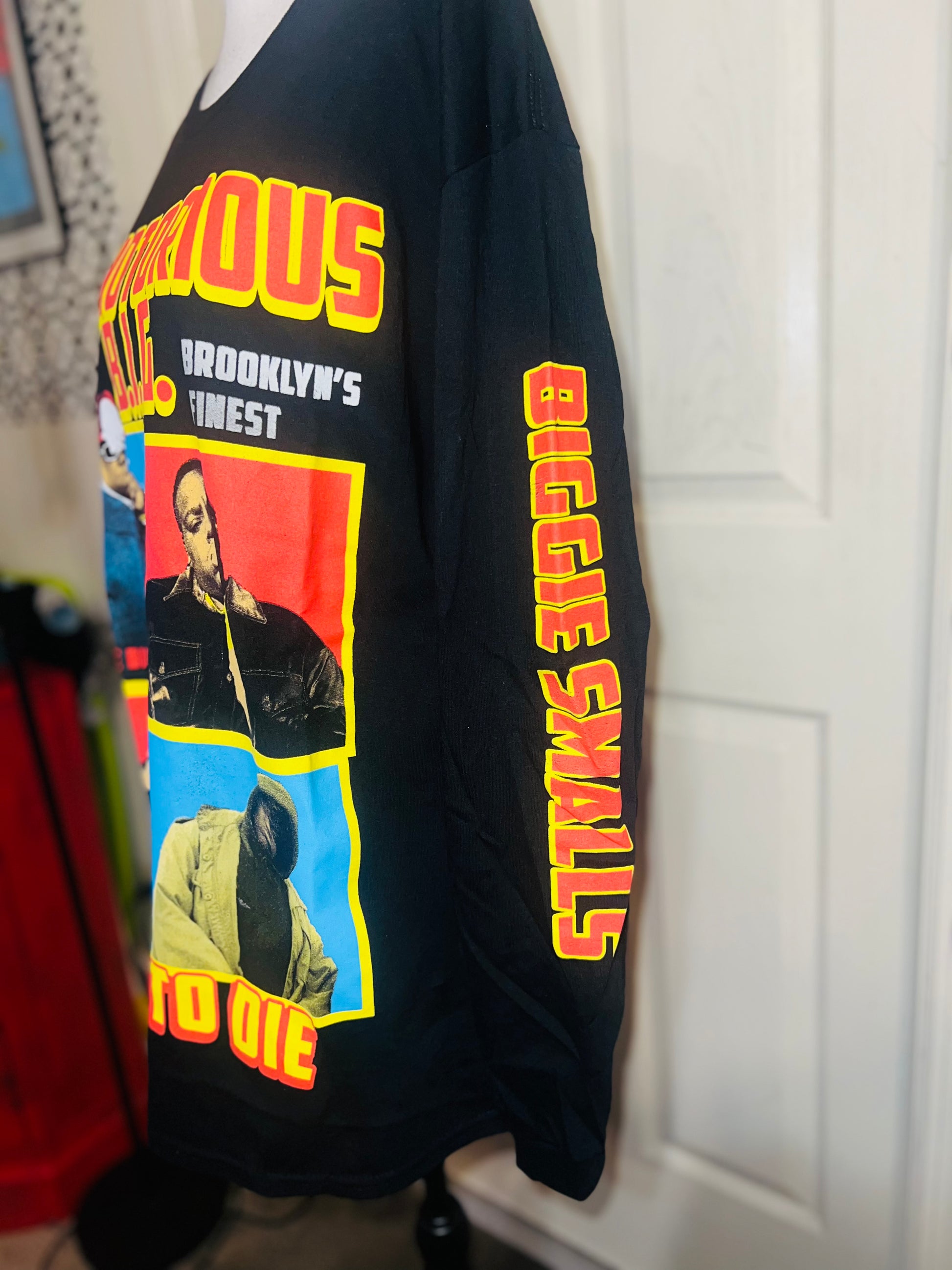 This is now a preorder. Please allow extra processing time. A black Biggie Smalls long sleeve tee with “Born to Die” on one sleeve and “Biggie Smalls” on the other. Super sick and bright, size XL, oversized.