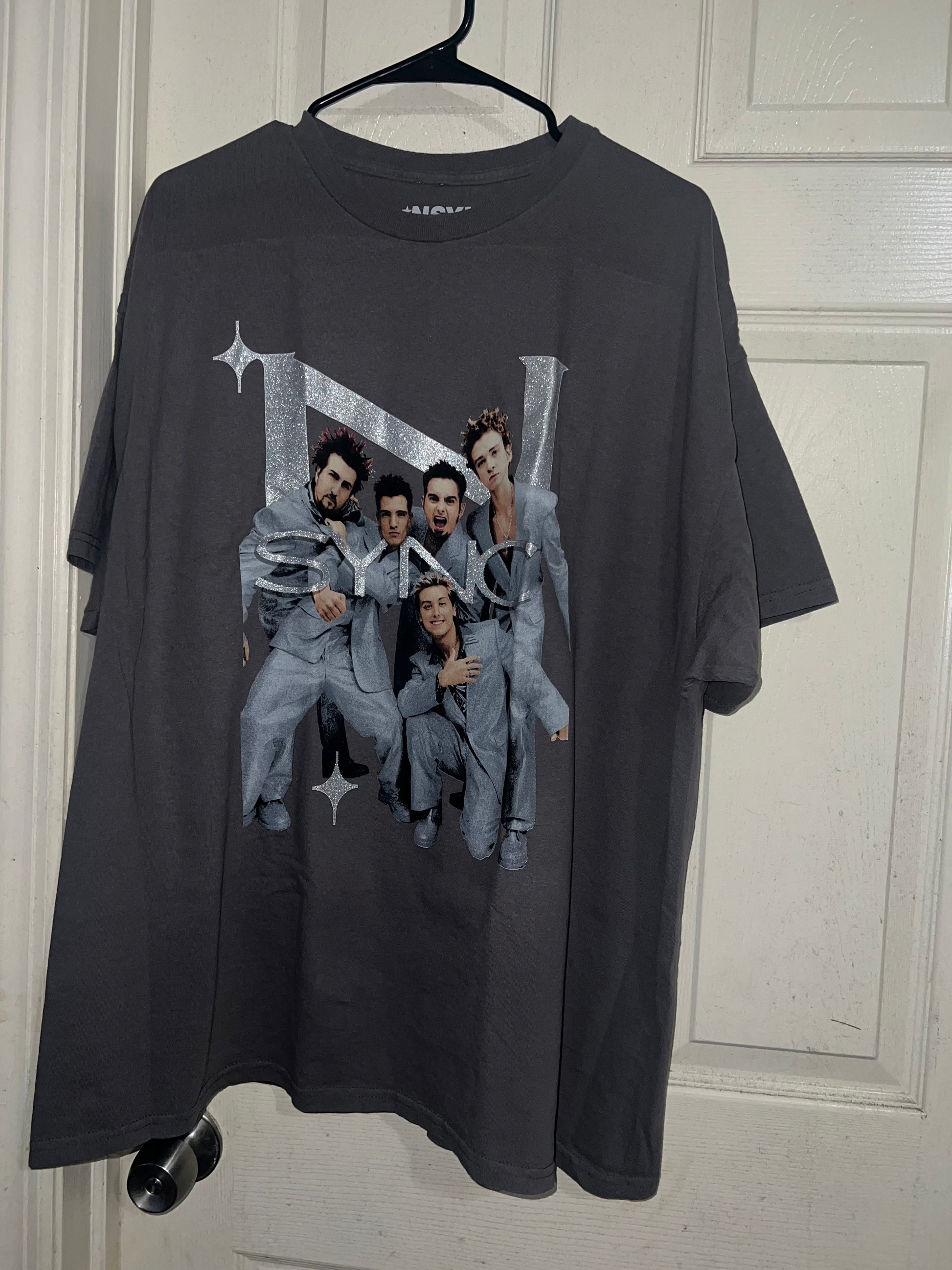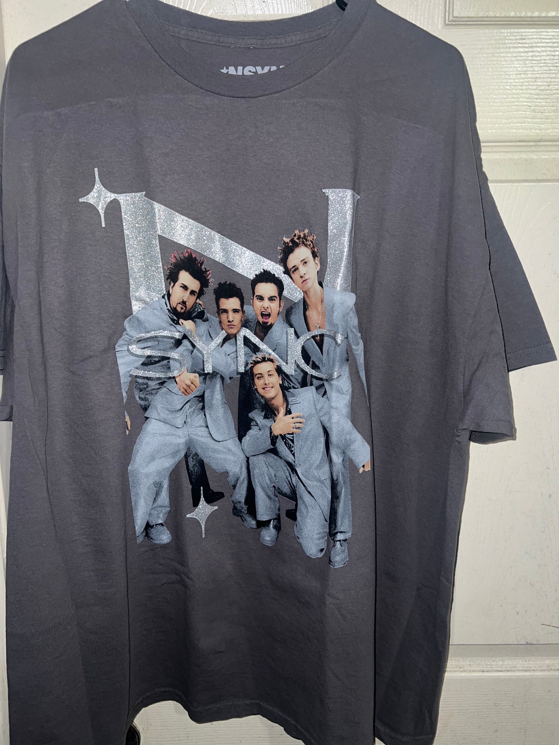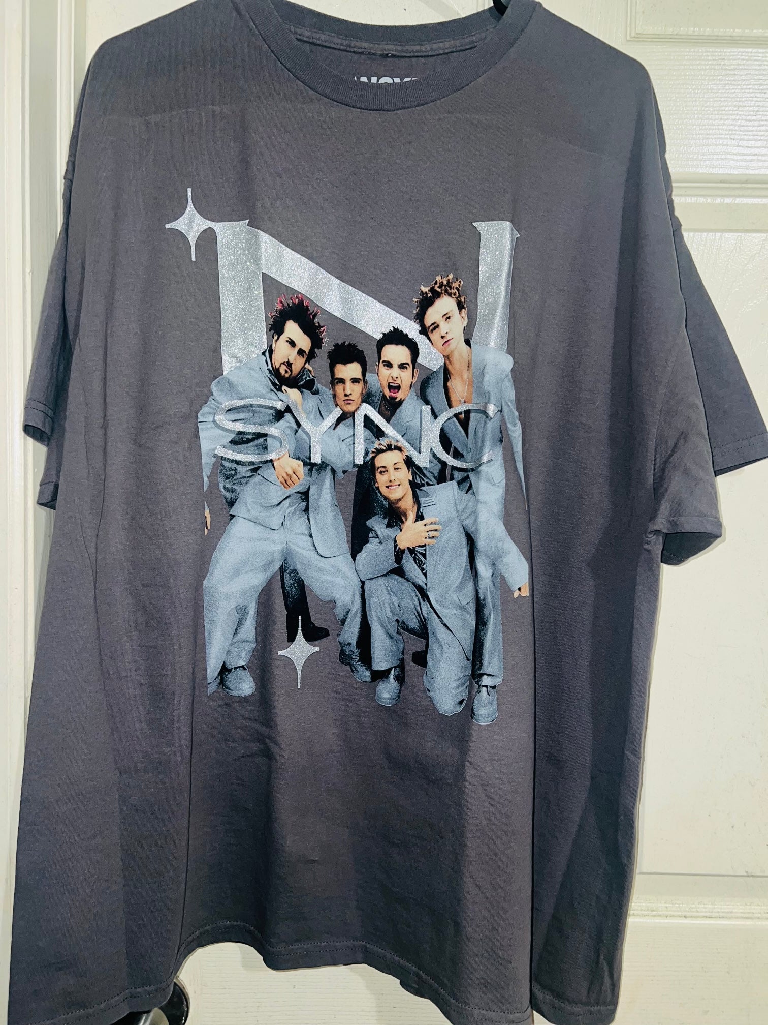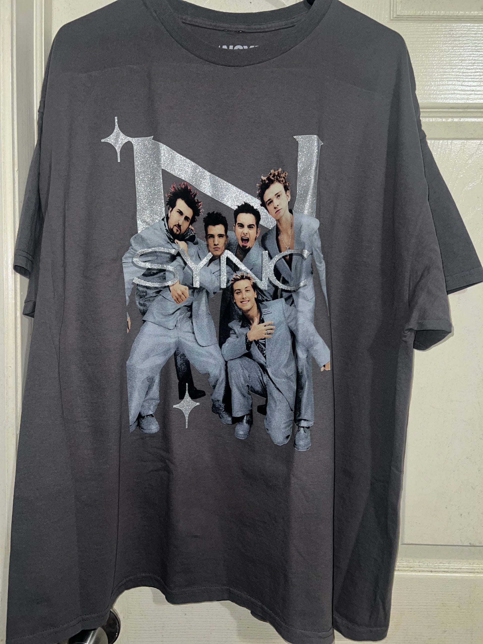 A grey NSYNC tee with a little sparkle contrast detail with our old favorite boy band on the front. Oversized, size XL.