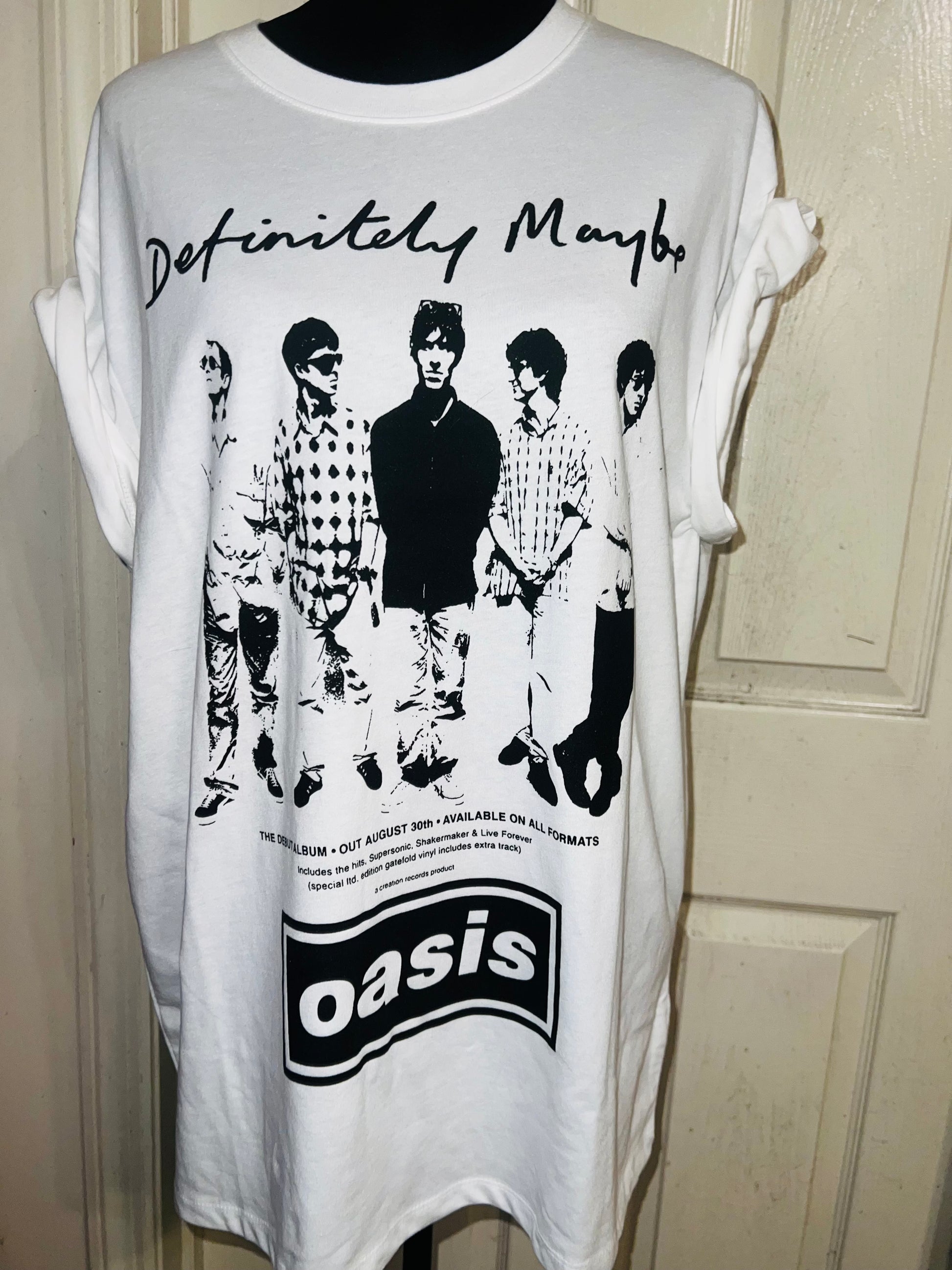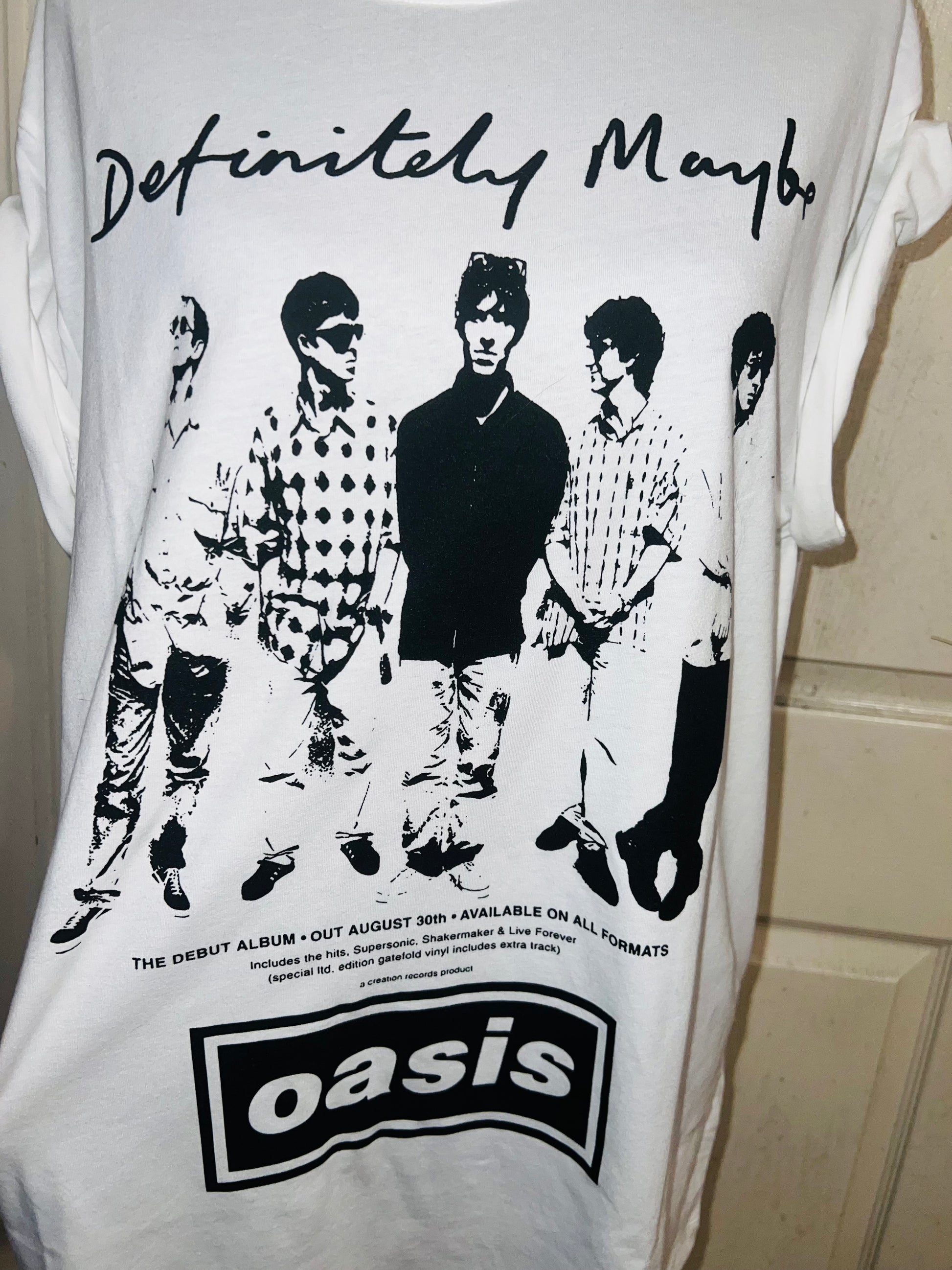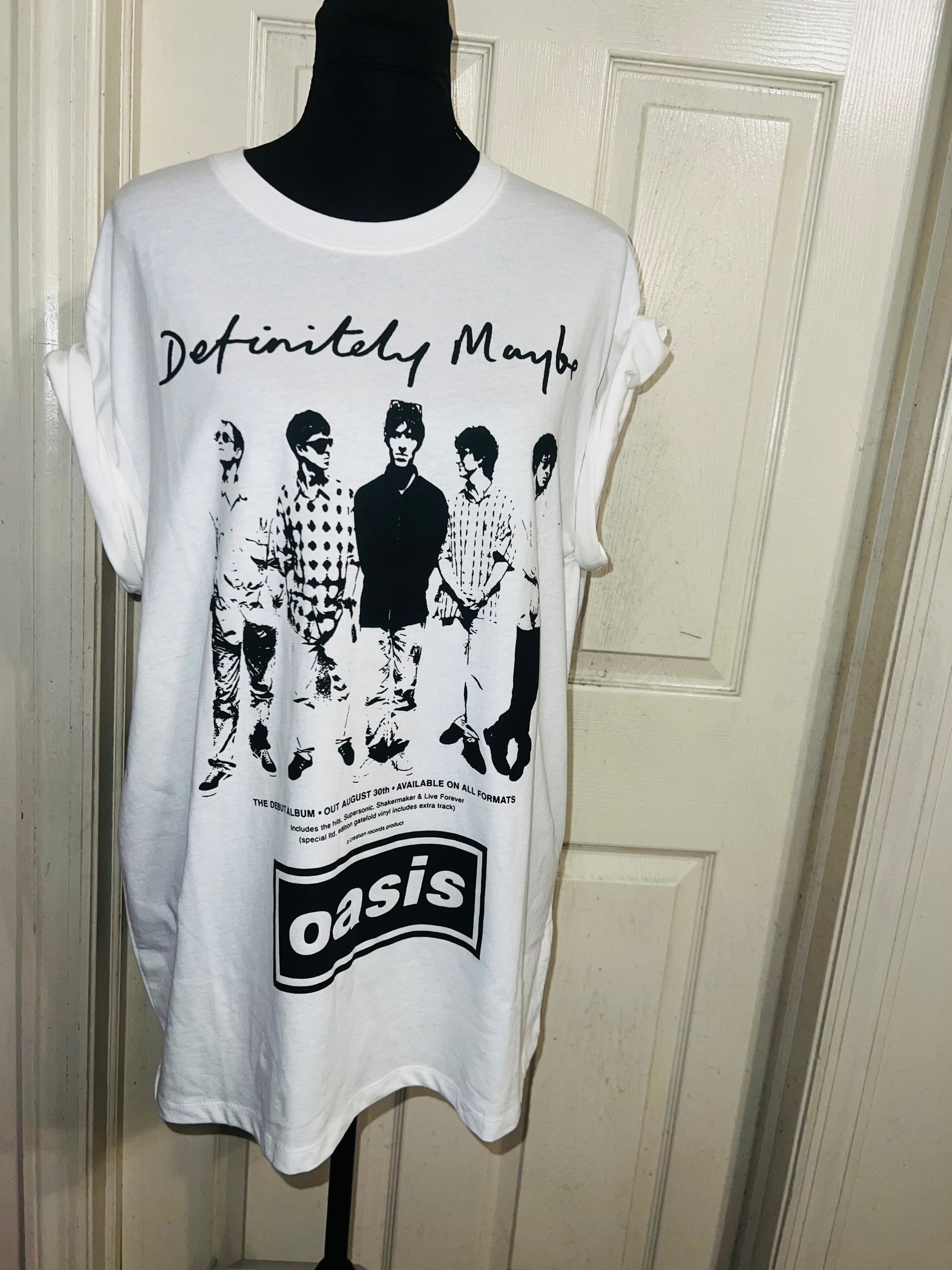 This is now a preorder. Please allow extra processing time. A white Definitey, Maybe Oasis tee. Oversized.