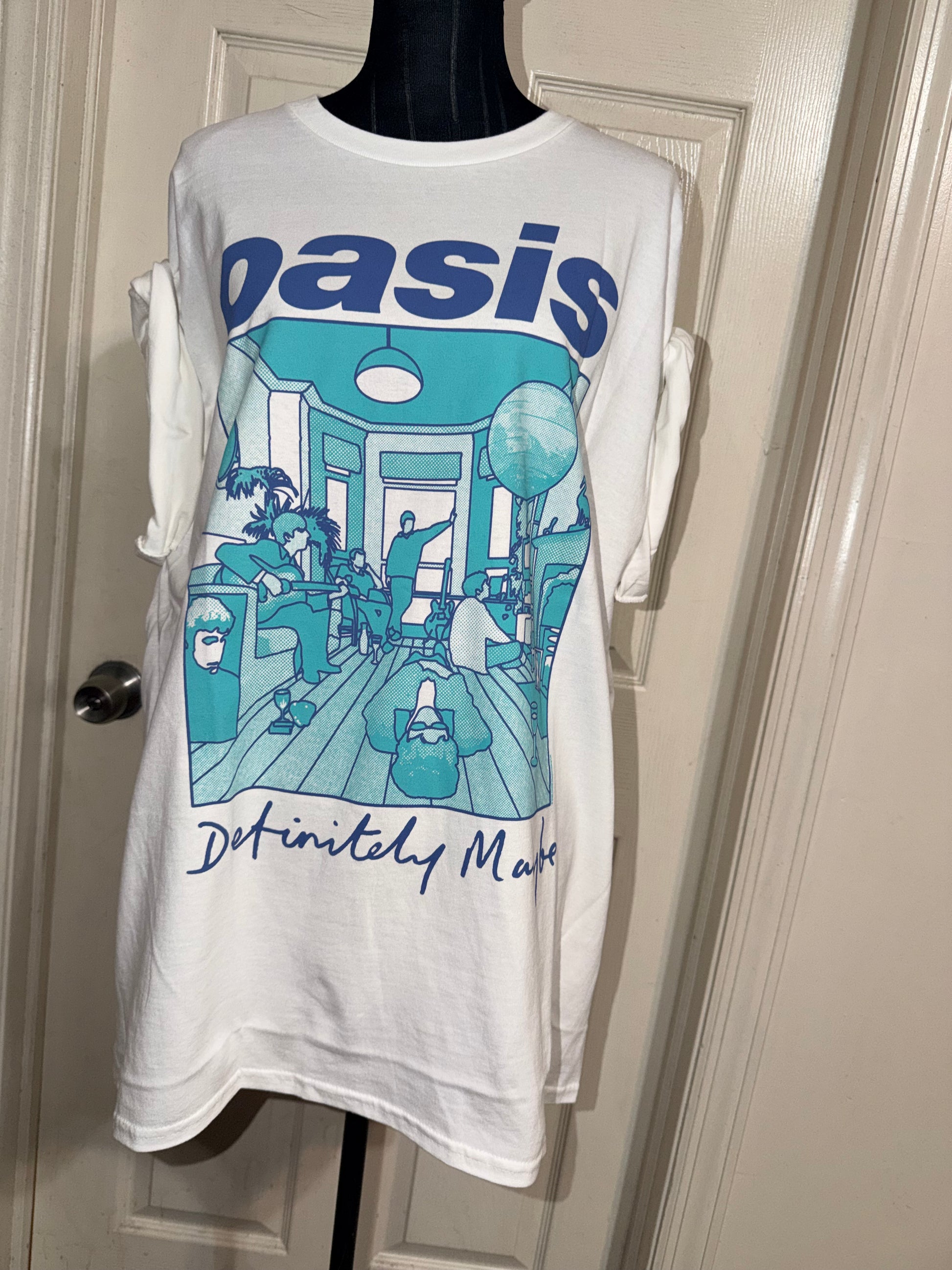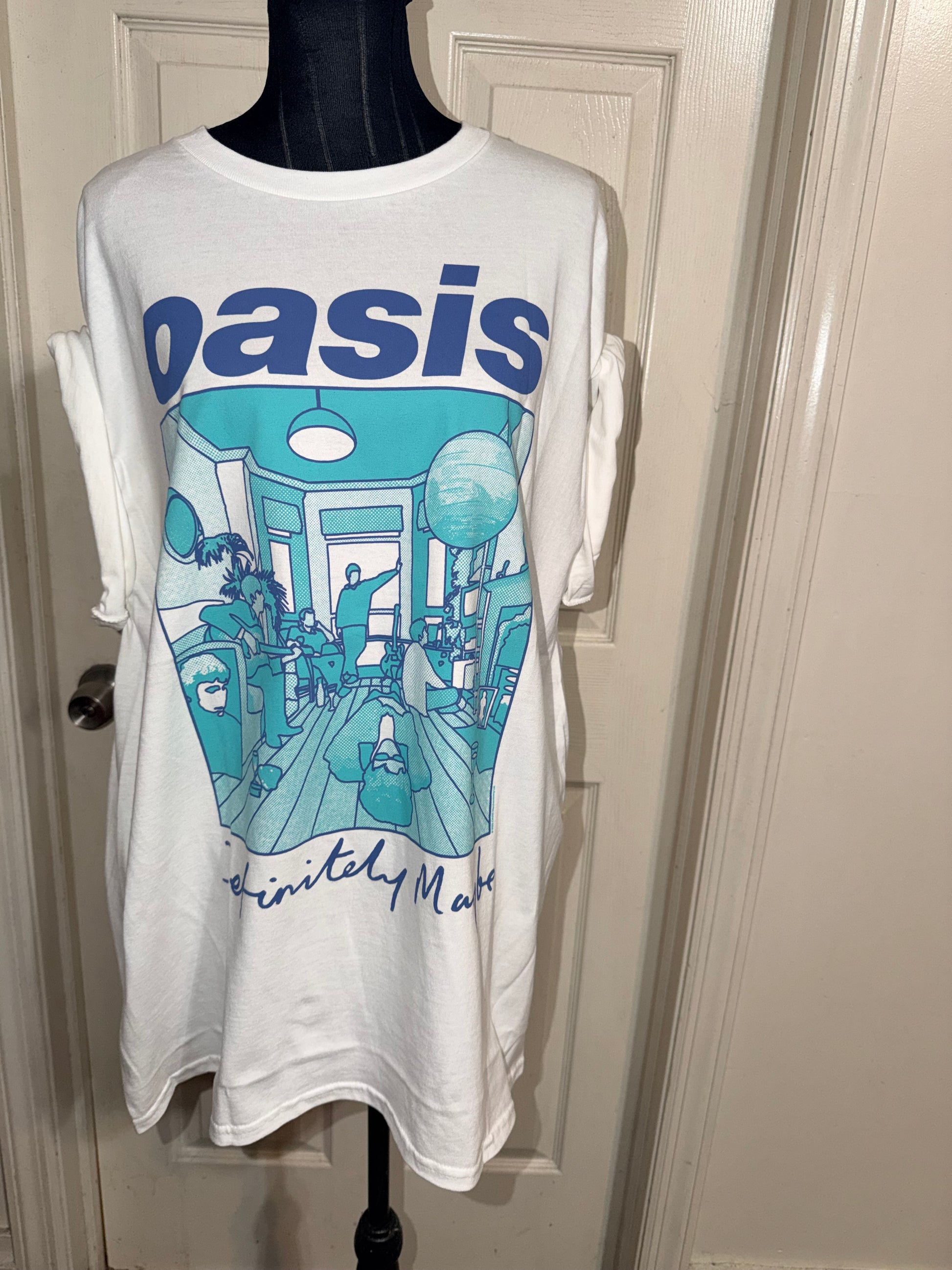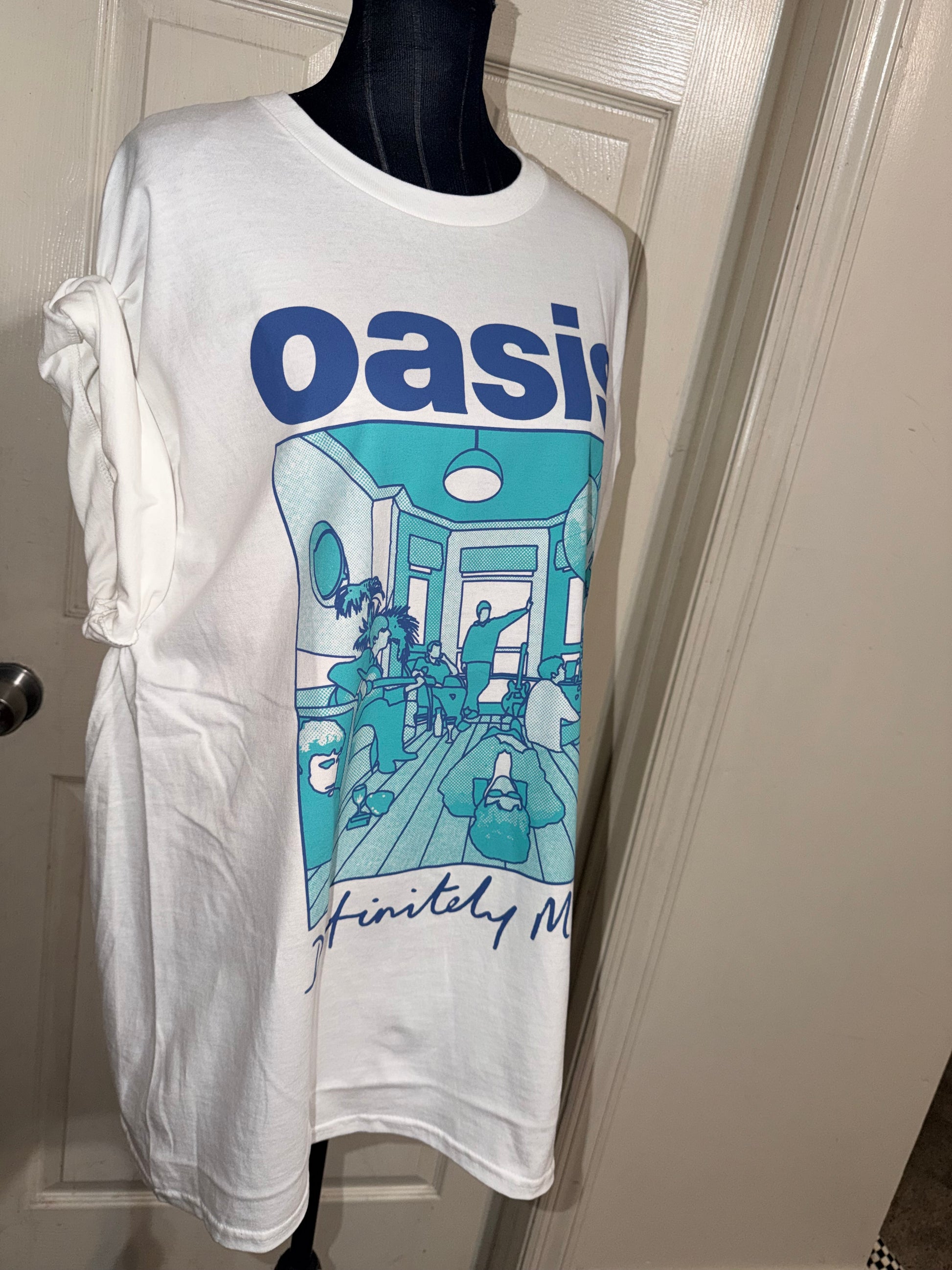 This is now a preorder.A white Oasis Definitely, Maybe tee with pretty blue contrast. Oversized.