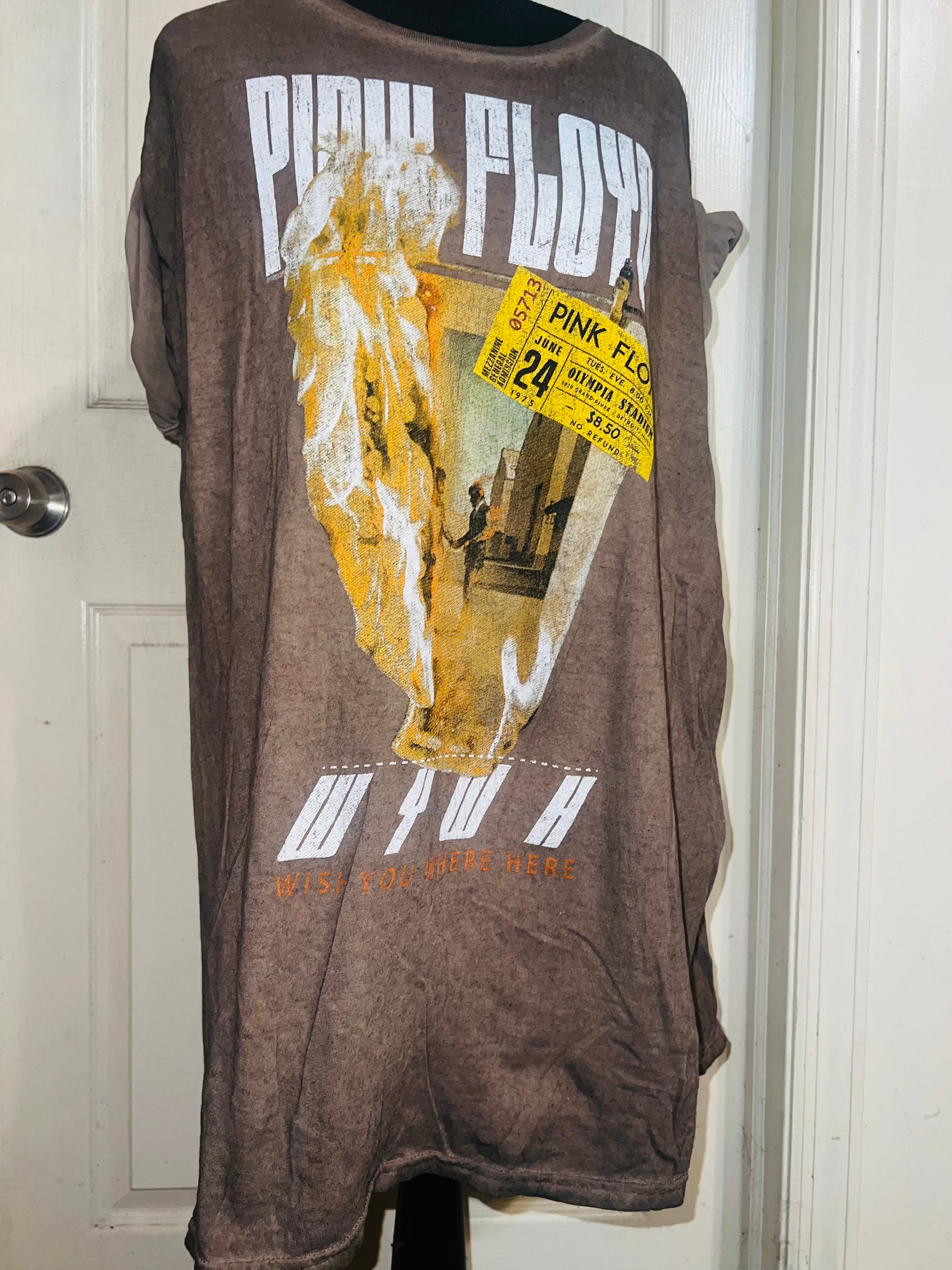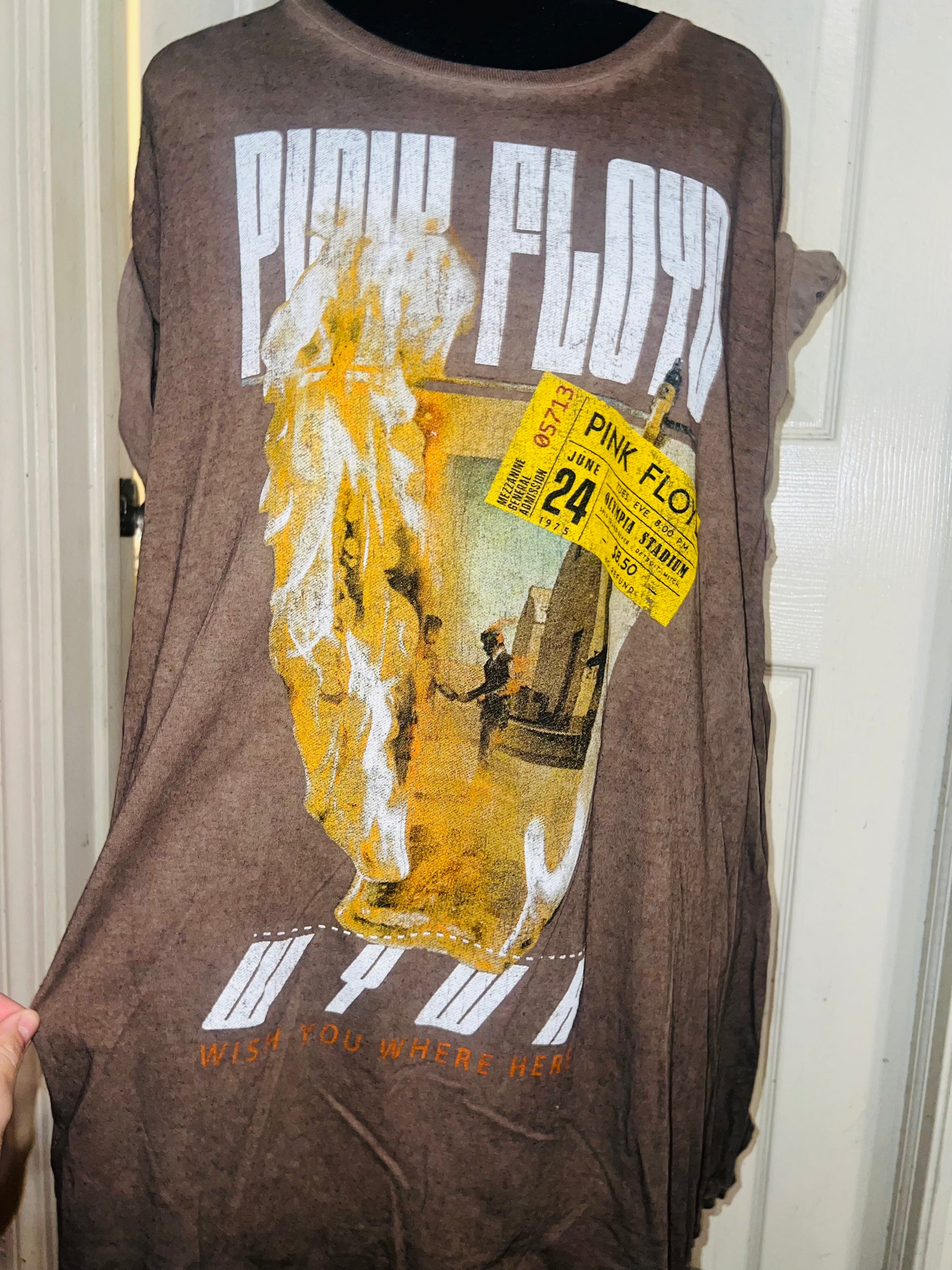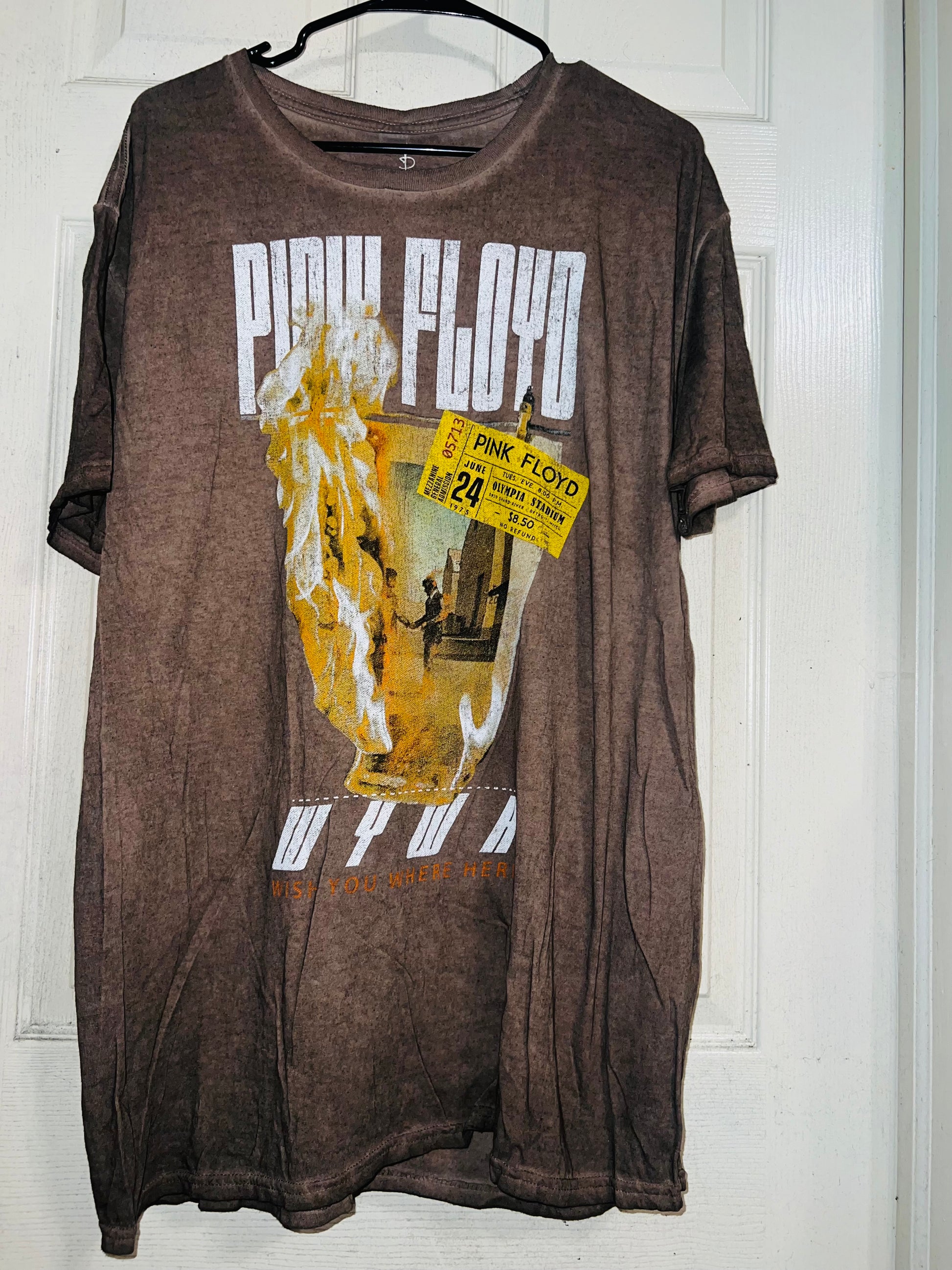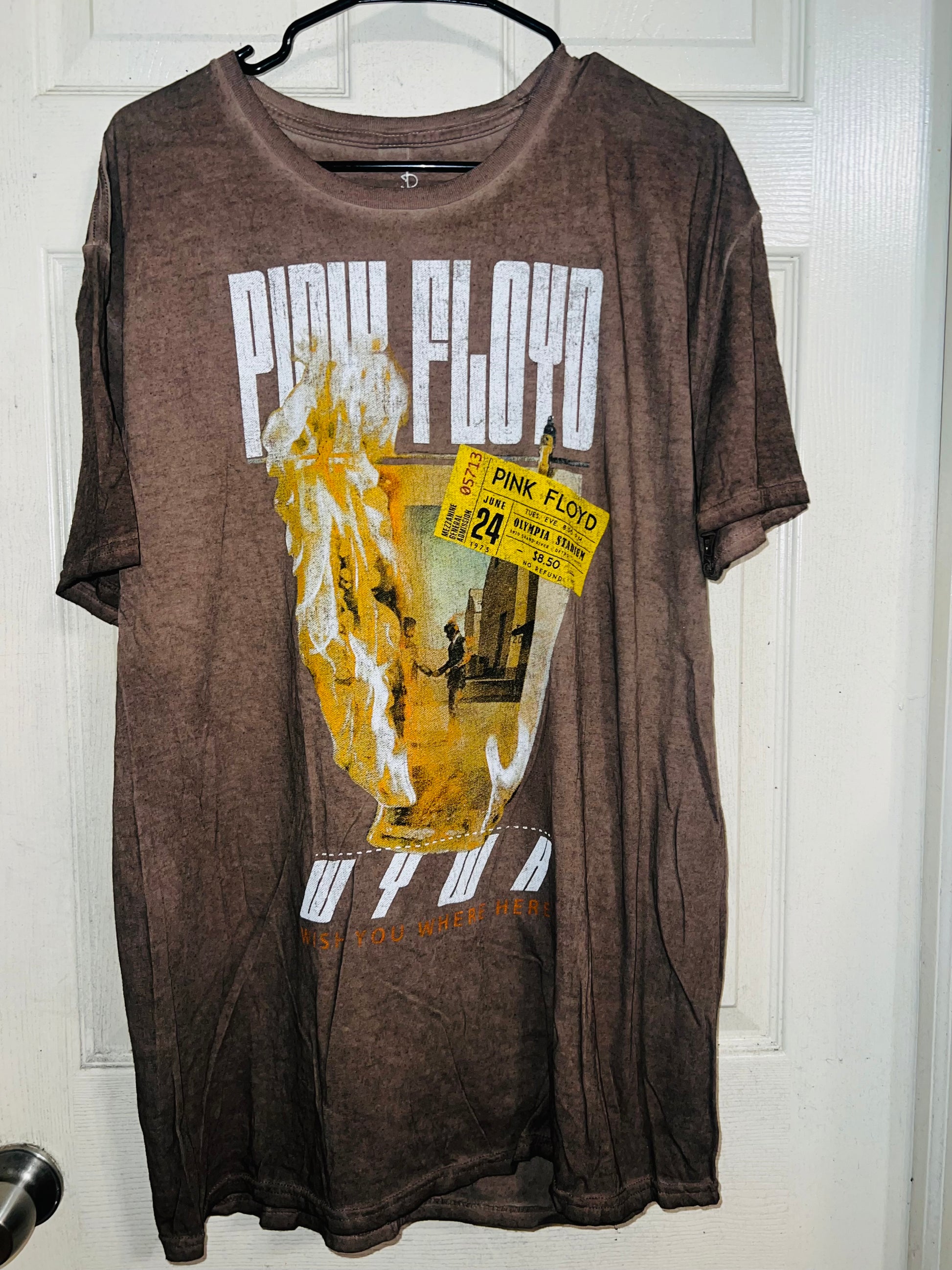 A brown Pink Floyd double sided “Wish You Were Here” tee. Has a sick graphic of a ticket and the iconic picture for WYWH. Size XL, oversized.