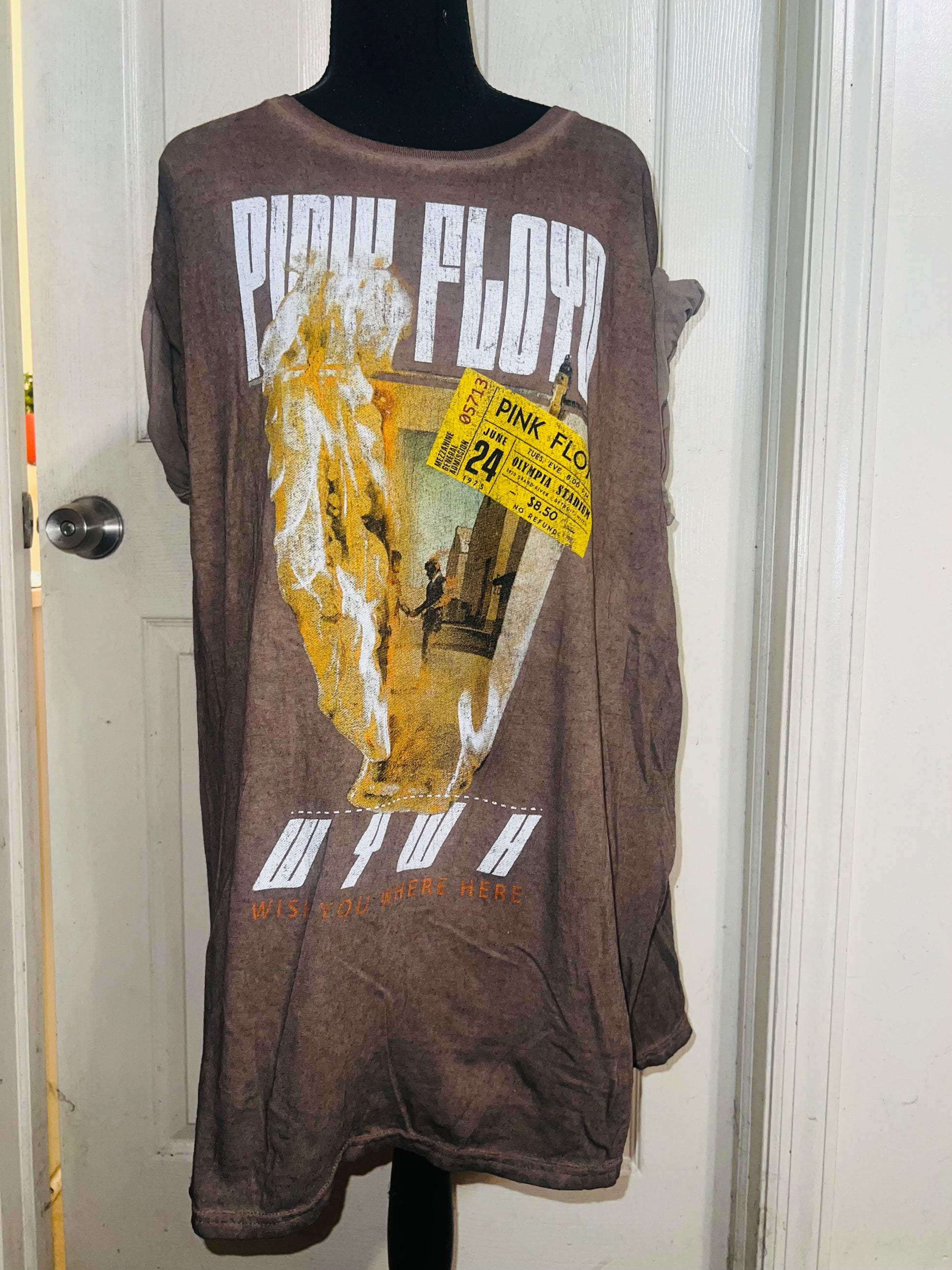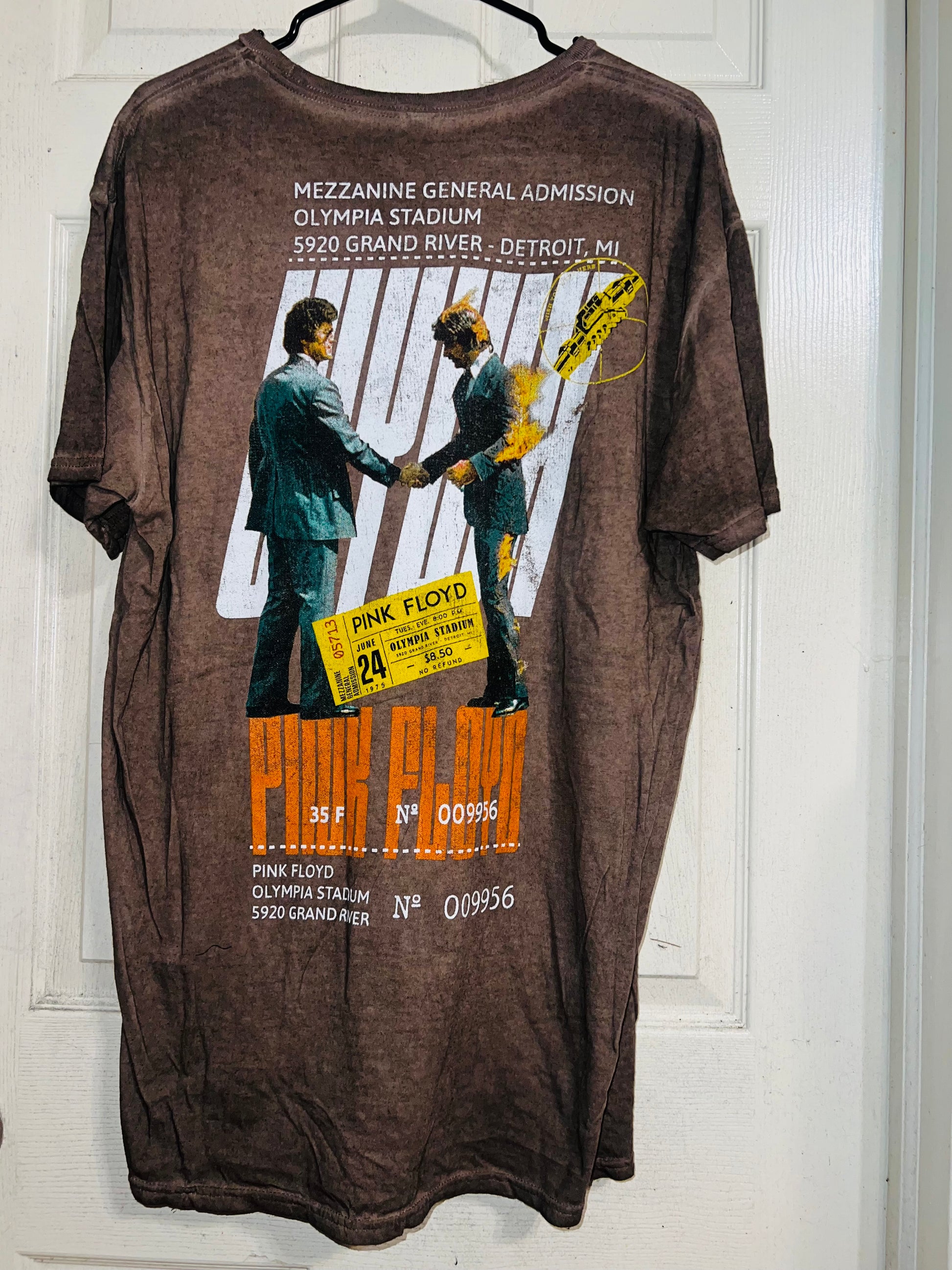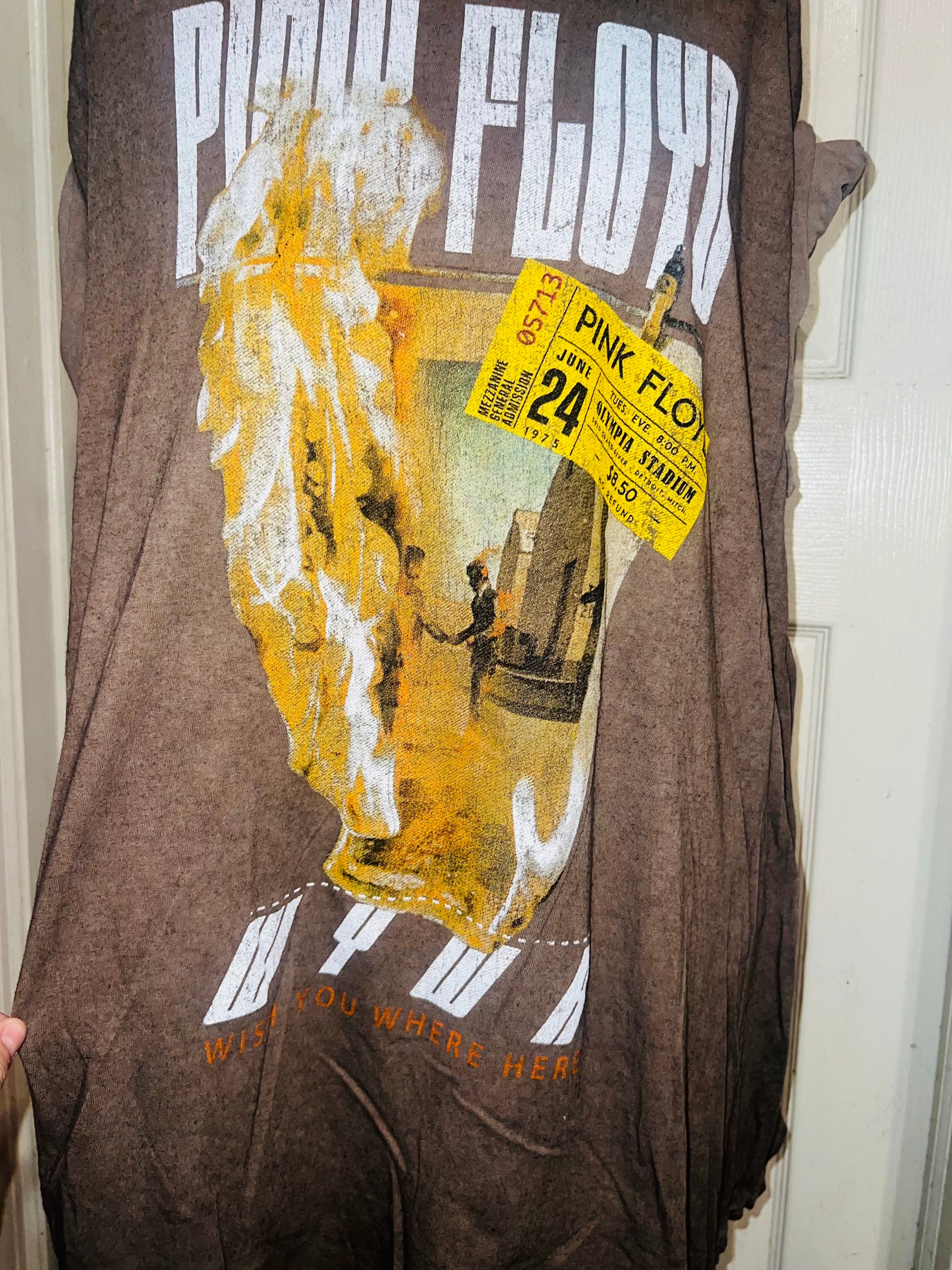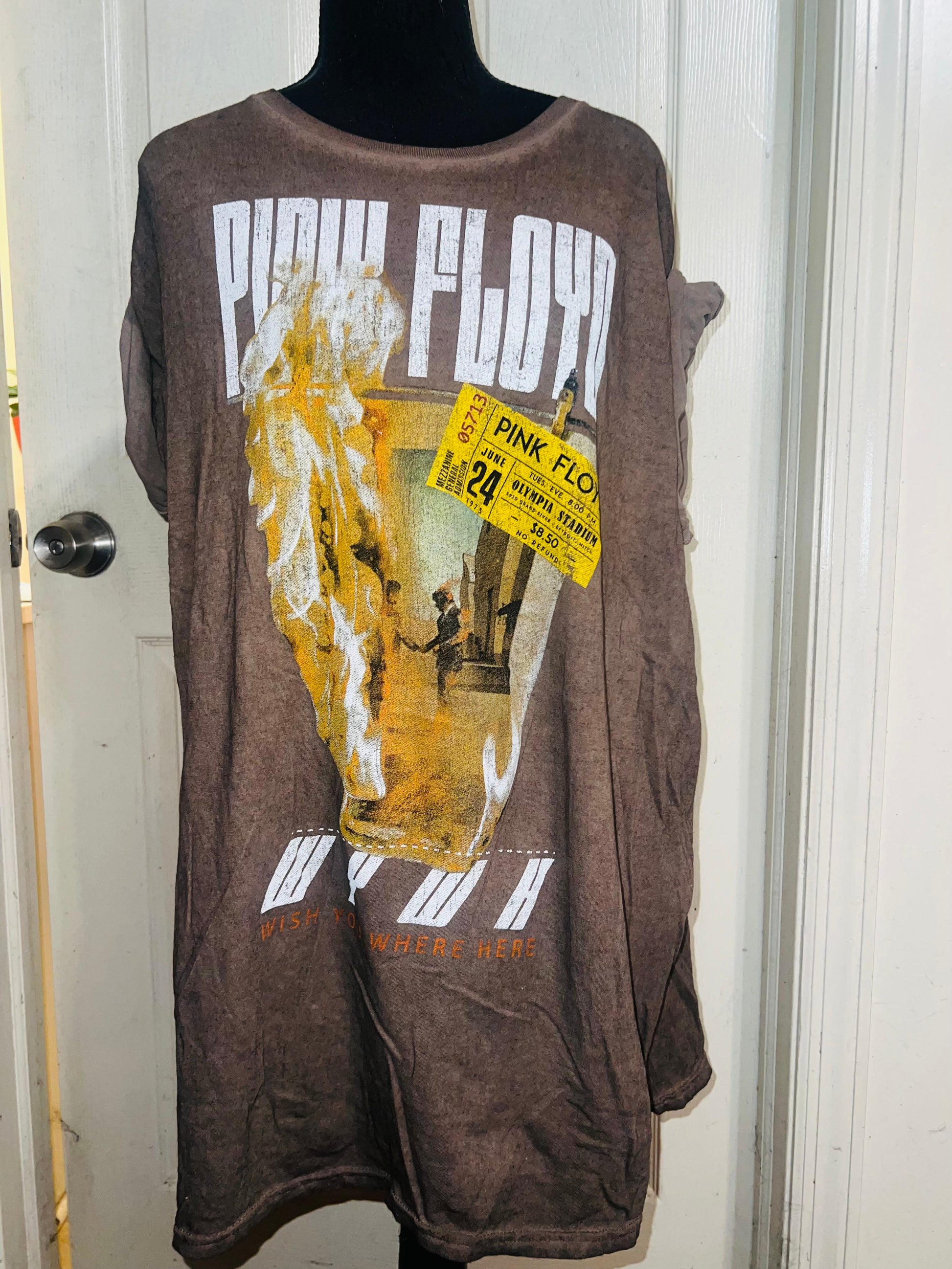 A brown Pink Floyd double sided “Wish You Were Here” tee. Has a sick graphic of a ticket and the iconic picture for WYWH. Size XL, oversized.
