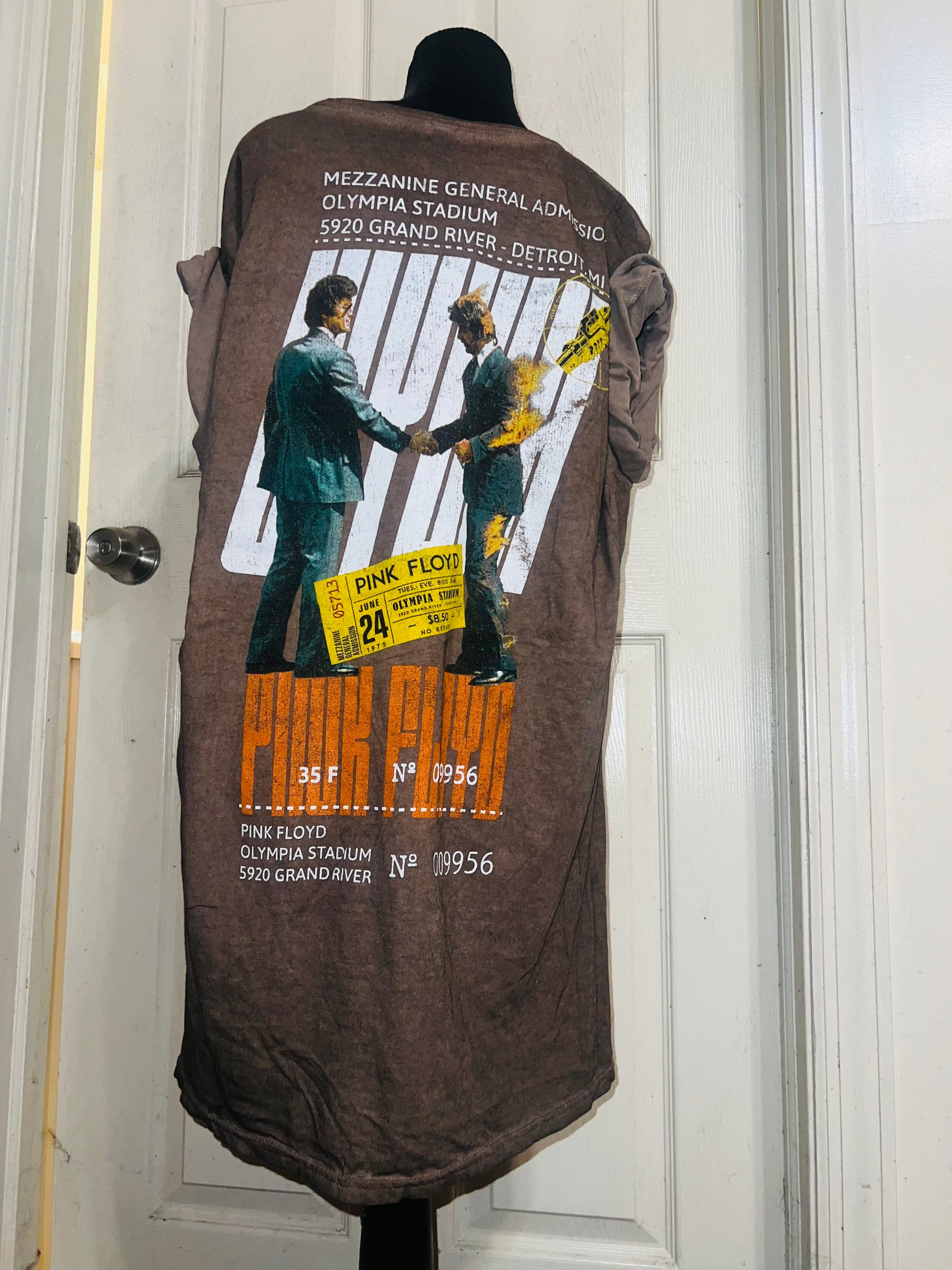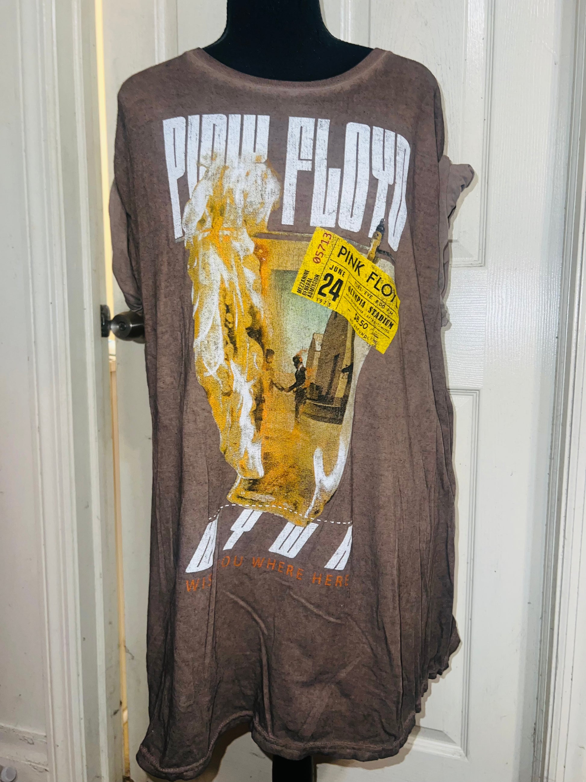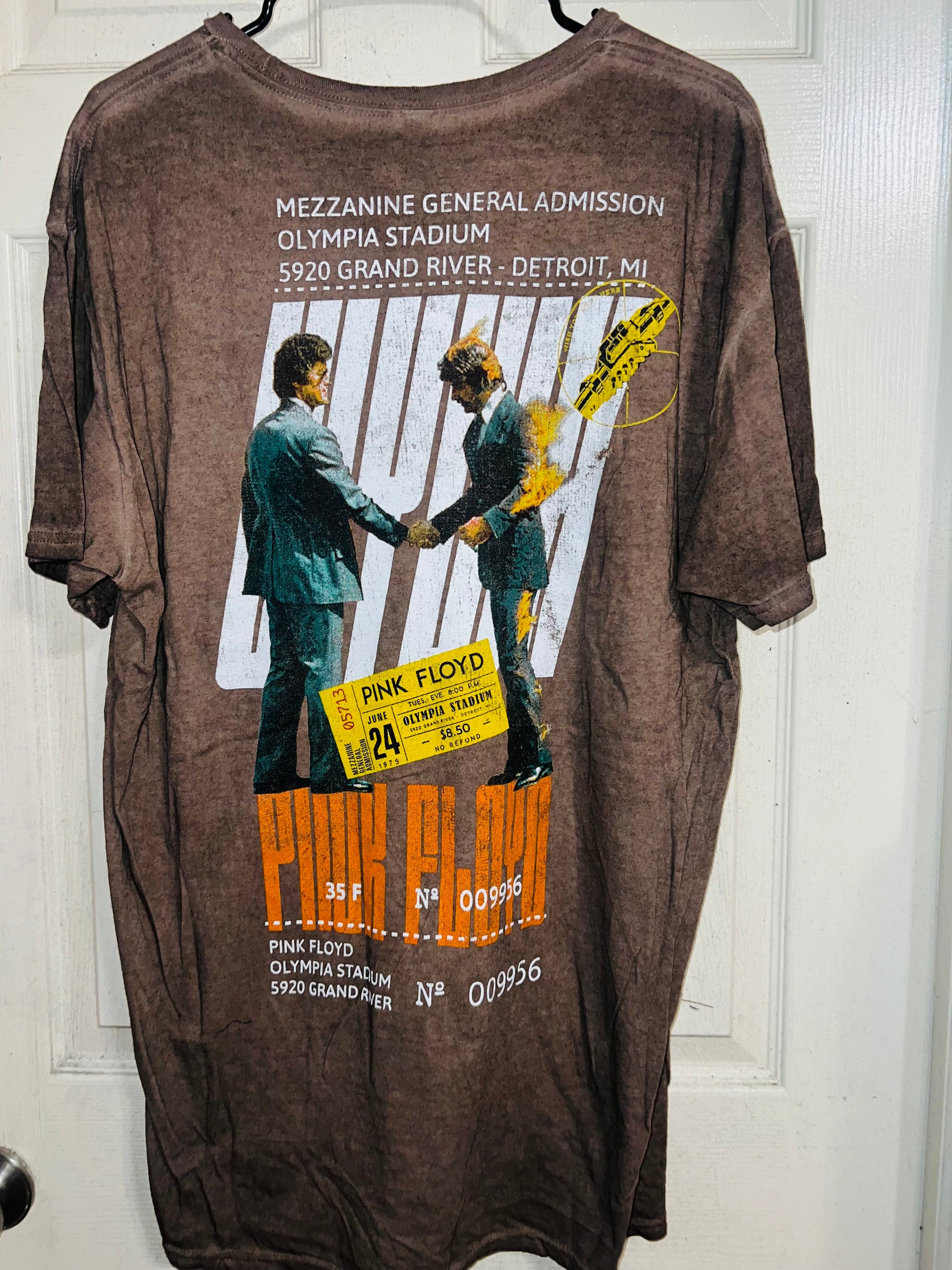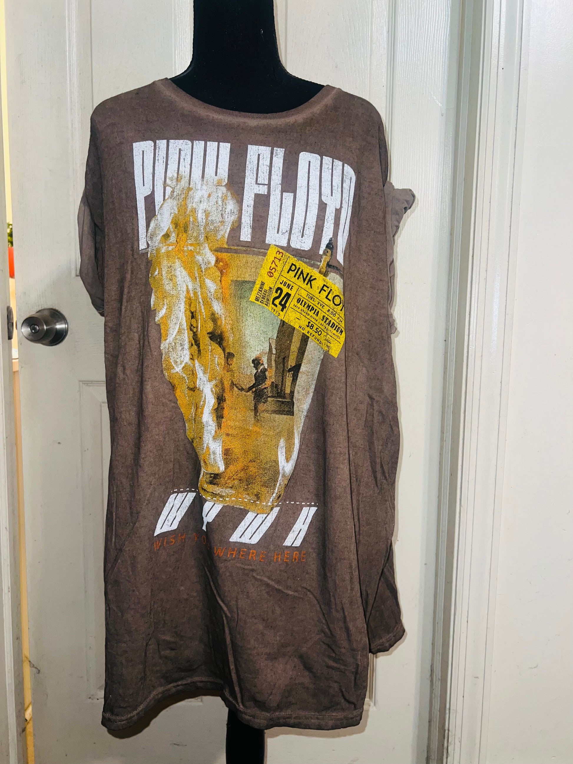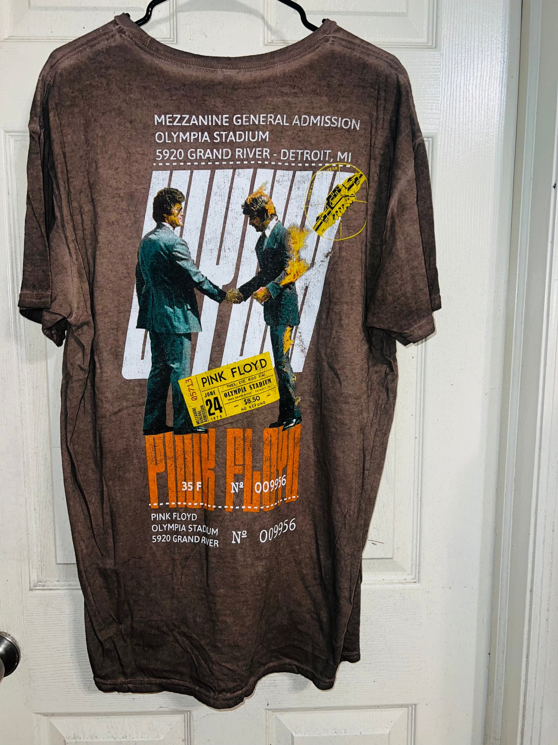 A brown Pink Floyd double sided “Wish You Were Here” tee. Has a sick graphic of a ticket and the iconic picture for WYWH. Size XL, oversized.