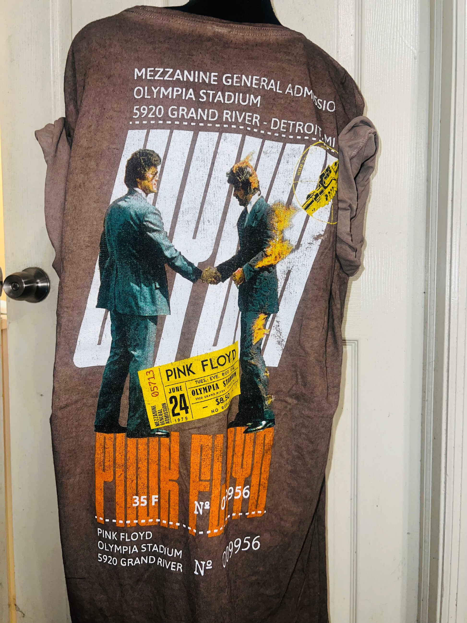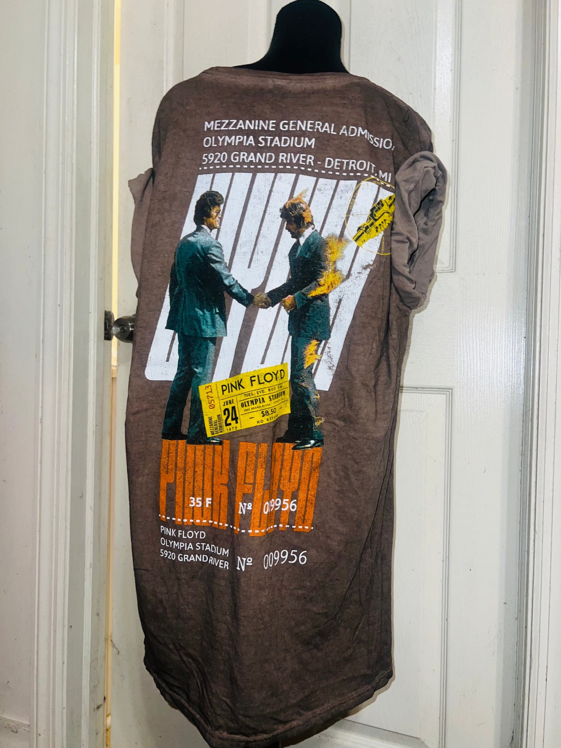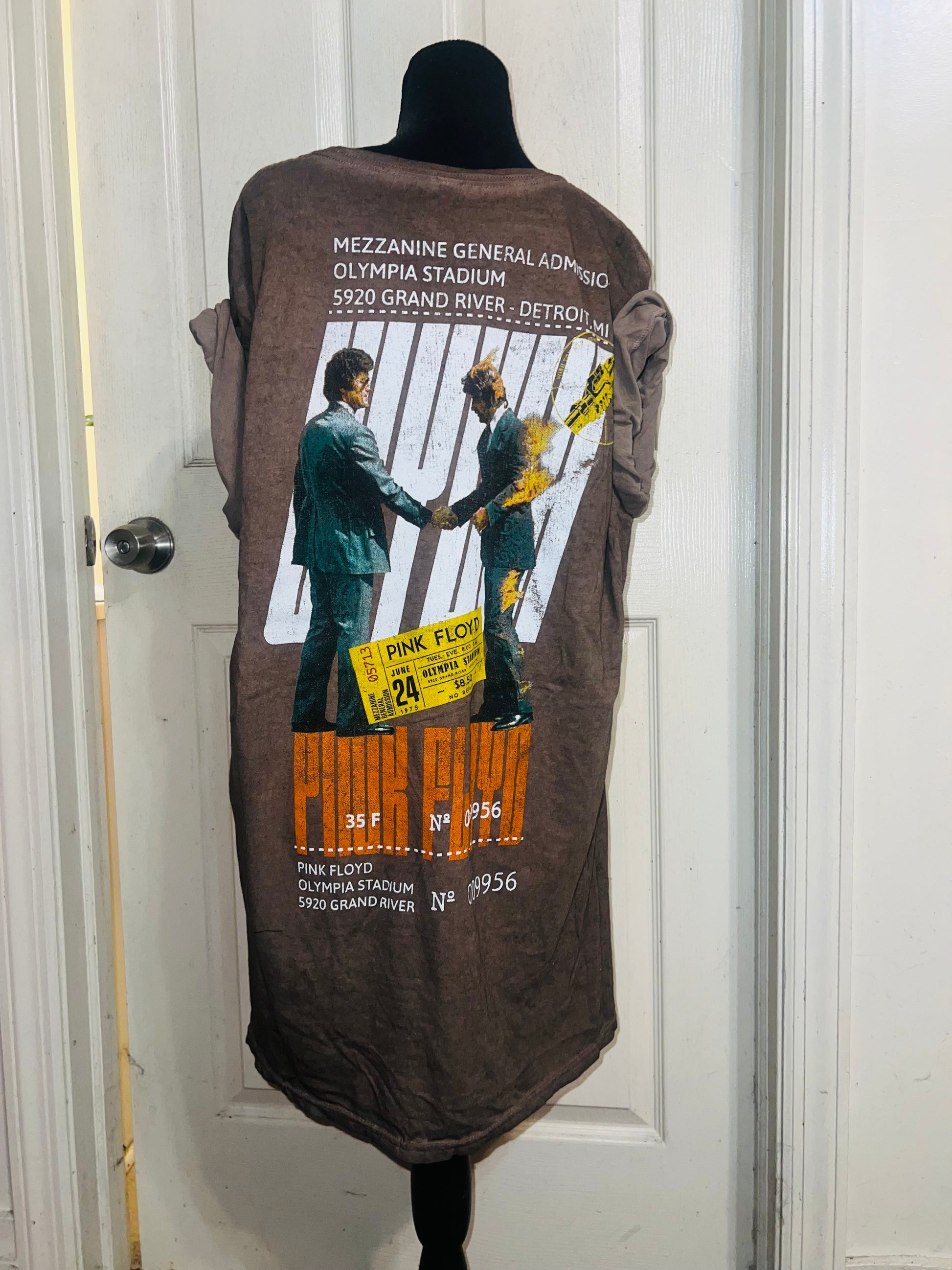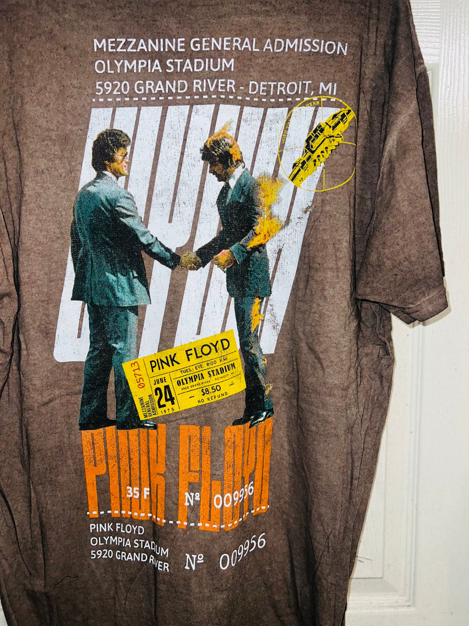 A brown Pink Floyd double sided “Wish You Were Here” tee. Has a sick graphic of a ticket and the iconic picture for WYWH. Size XL, oversized.
