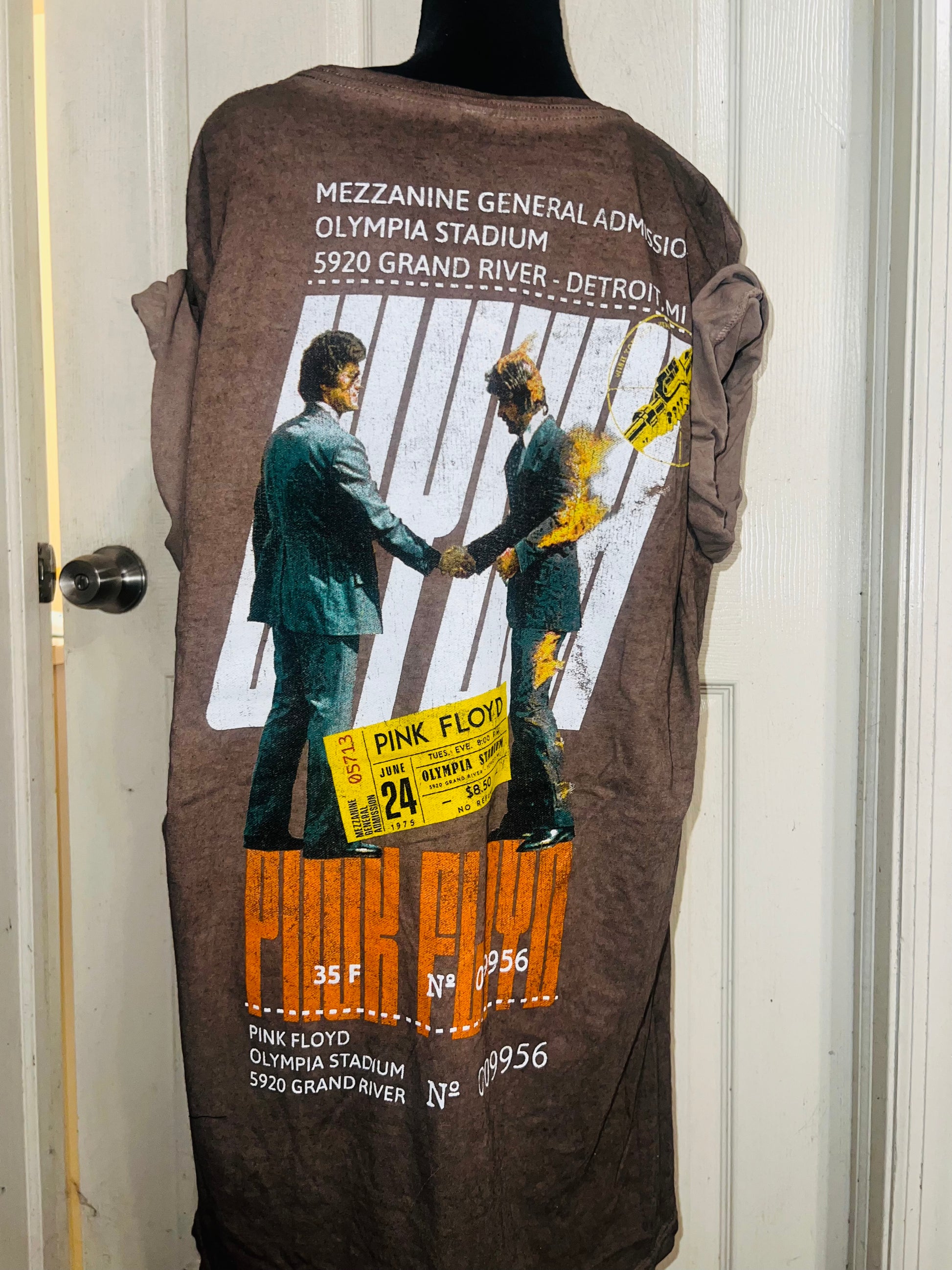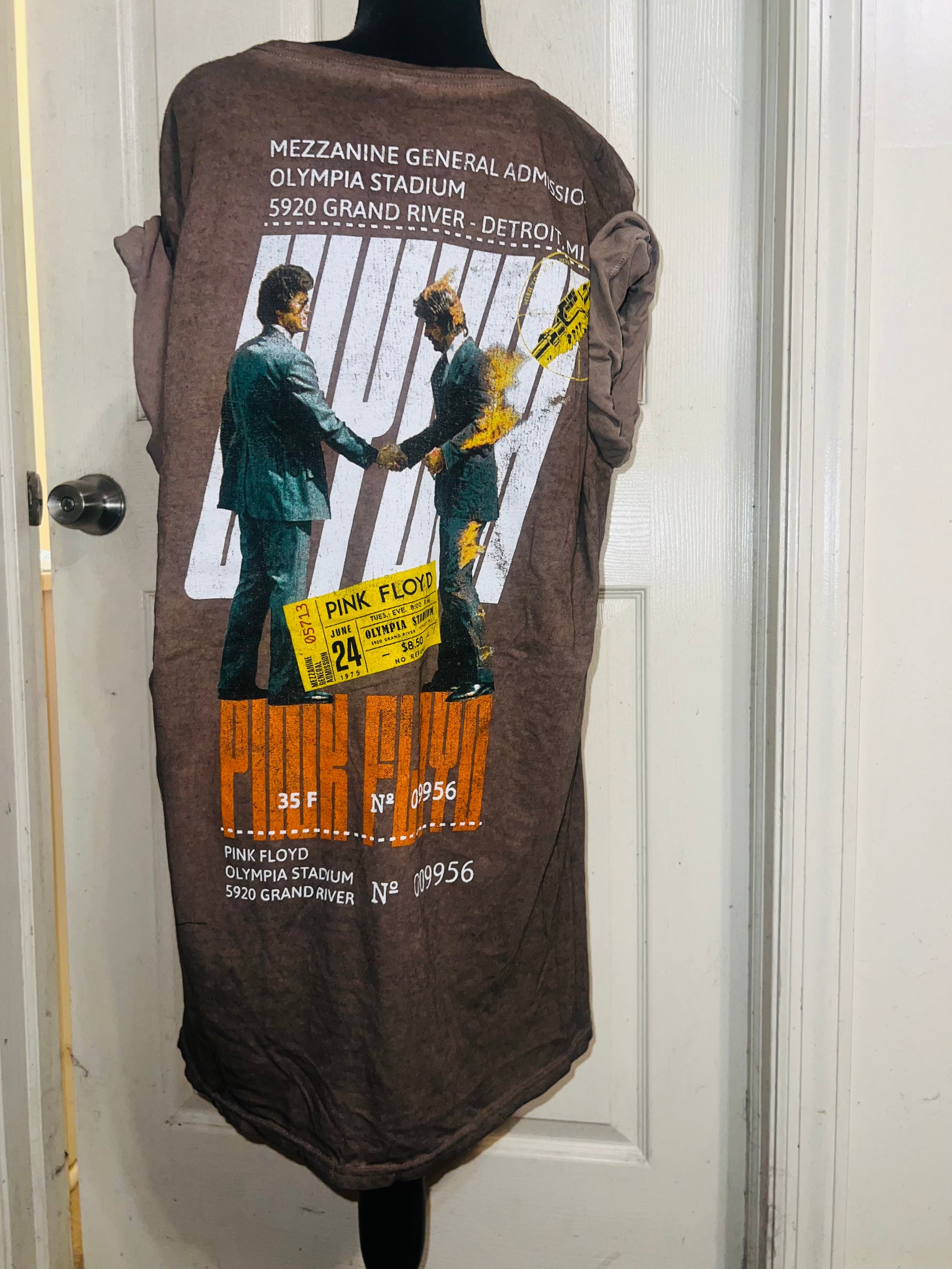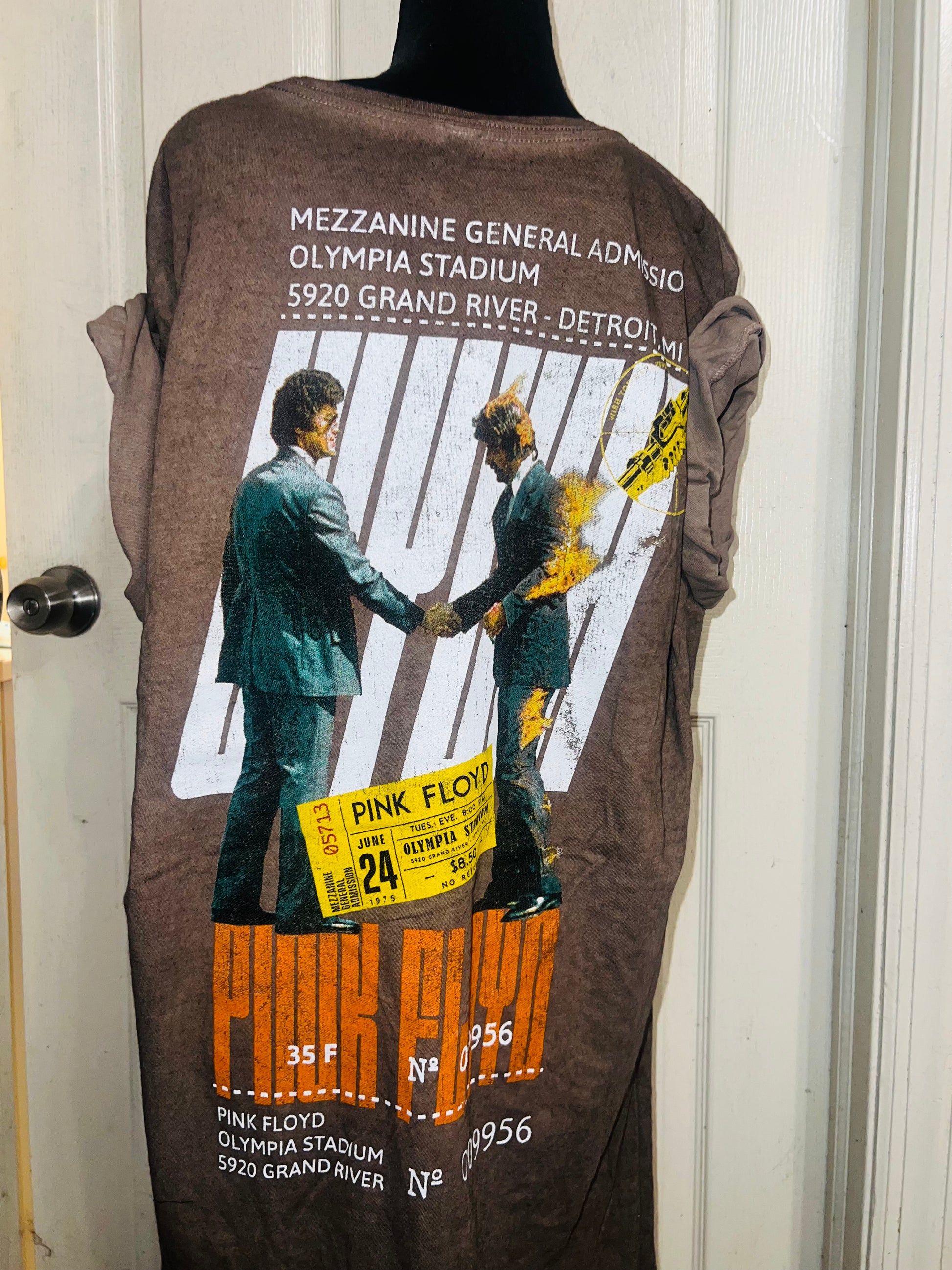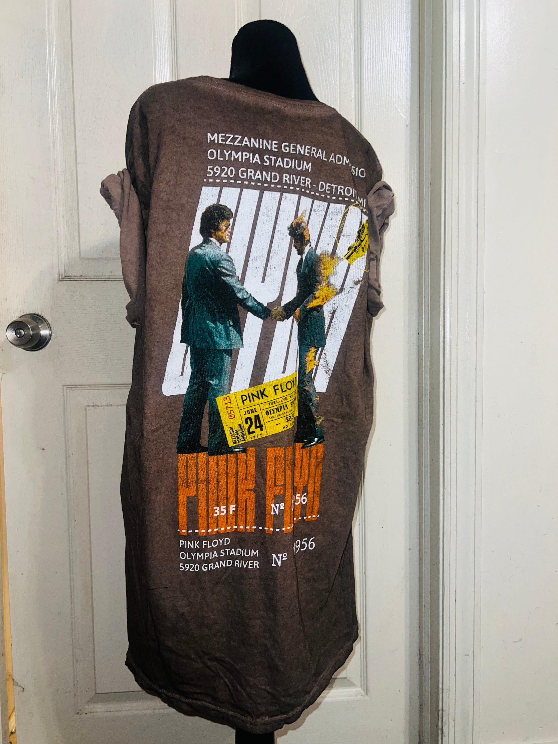 A brown Pink Floyd double sided “Wish You Were Here” tee. Has a sick graphic of a ticket and the iconic picture for WYWH. Size XL, oversized.