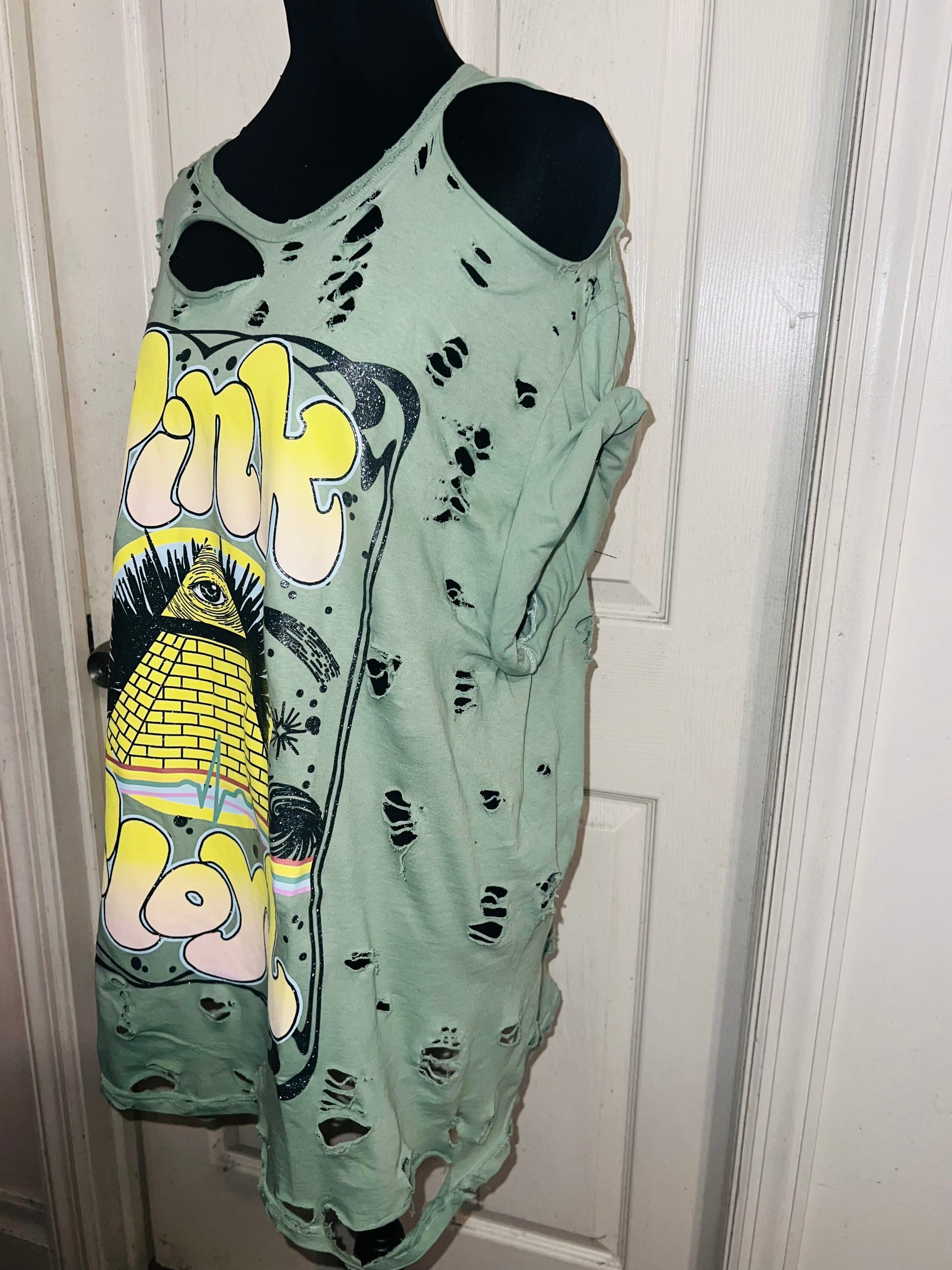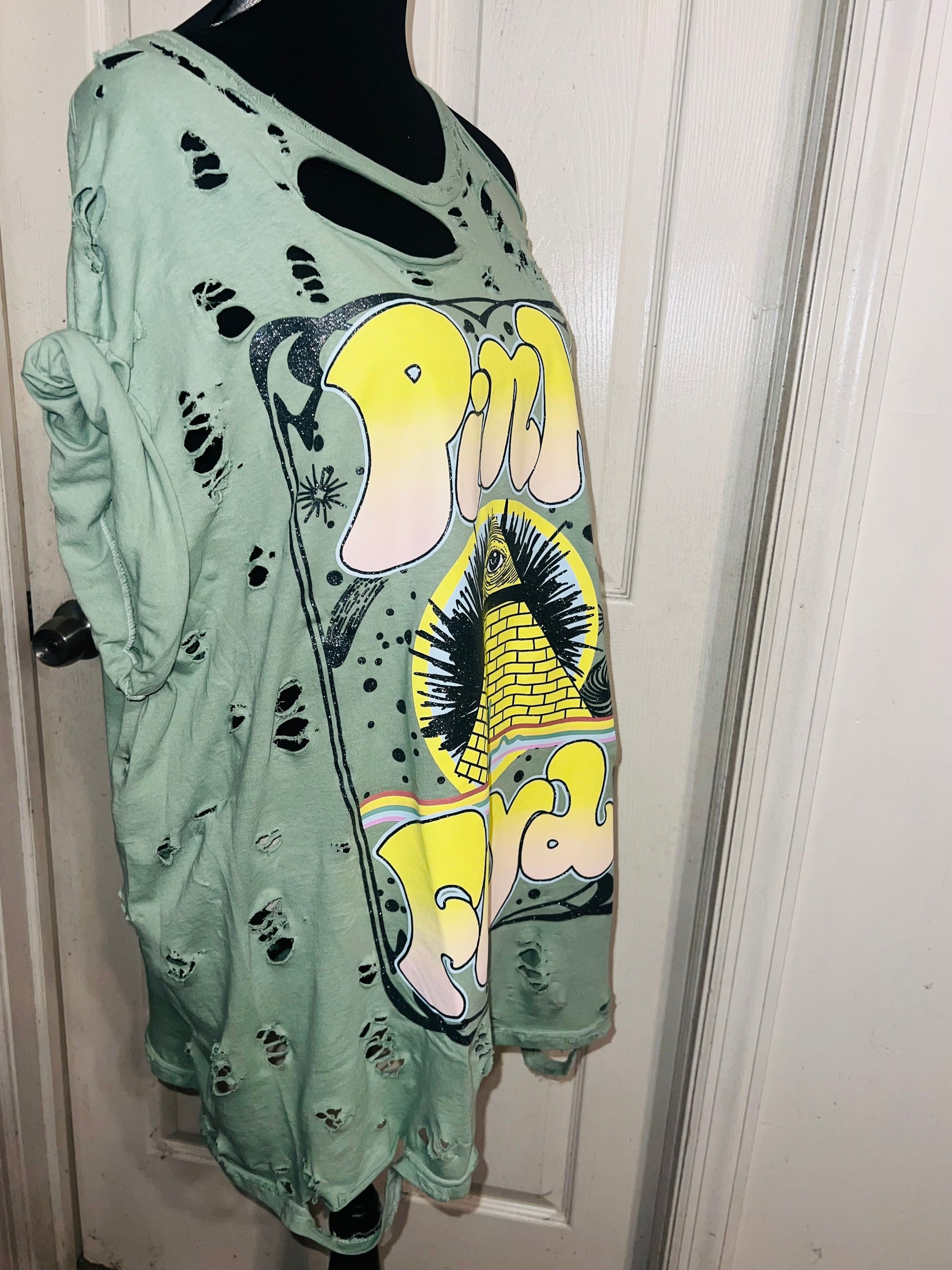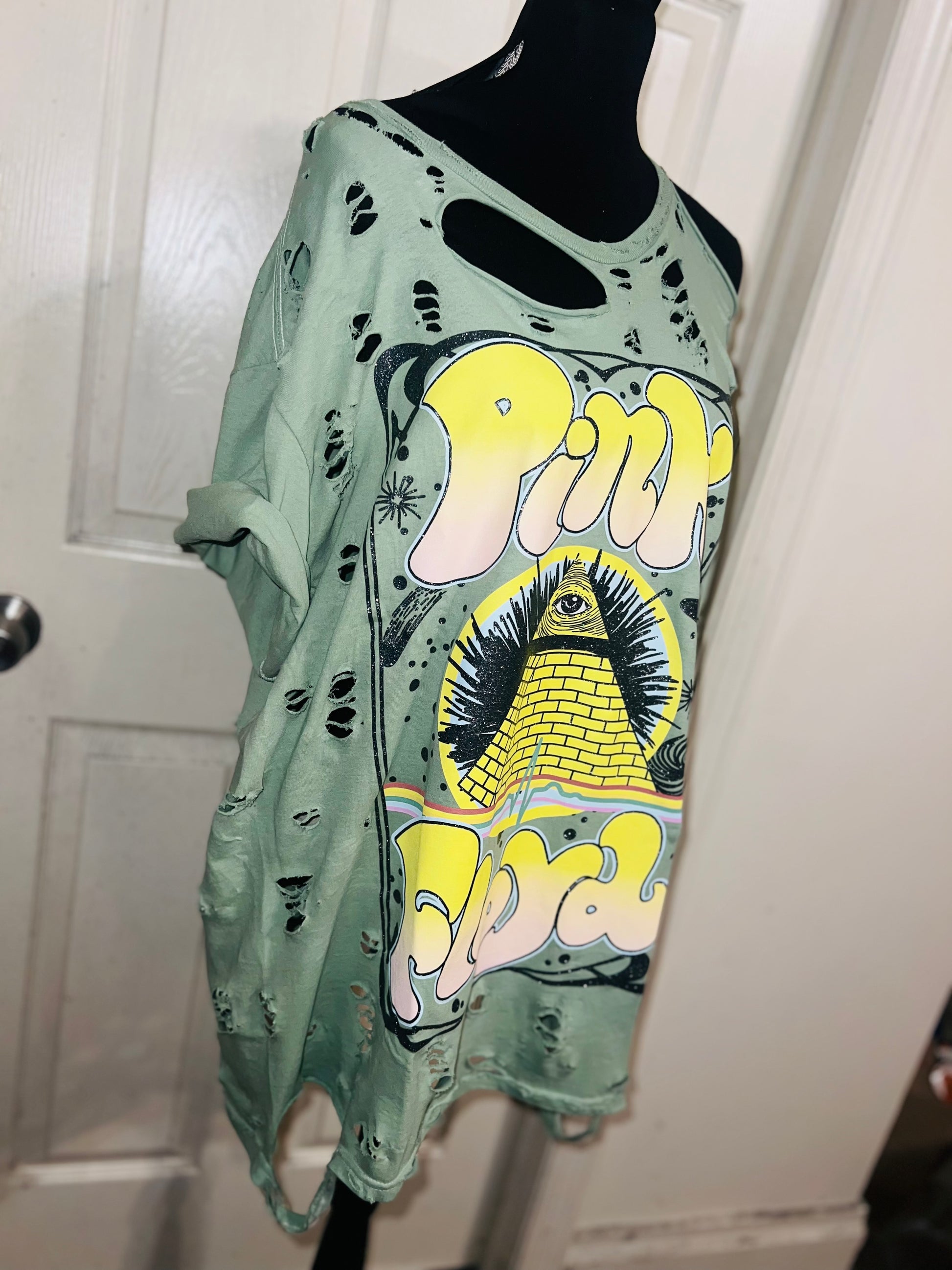 This is now a preorder and not distressed yet. A pale green Pink Floyd tee with the sick pyramid and eye images they use for Dark Side of the Moon. Oversized.