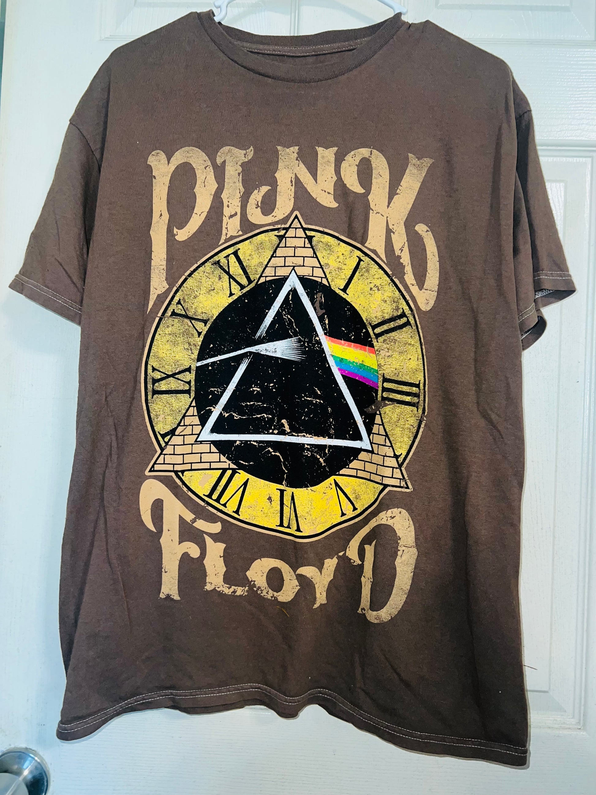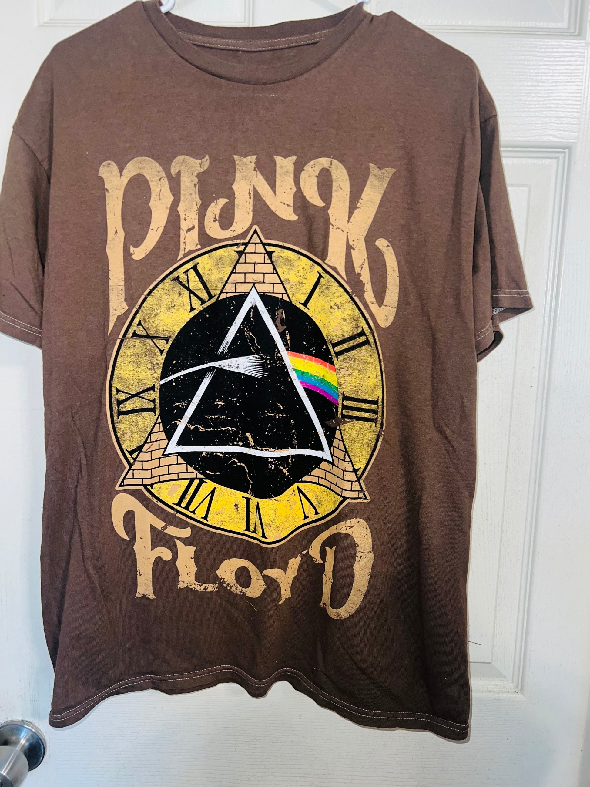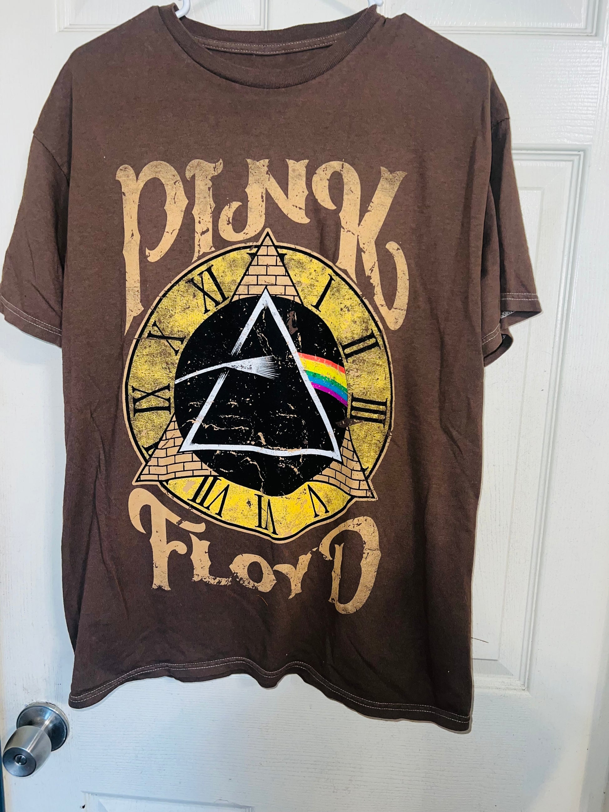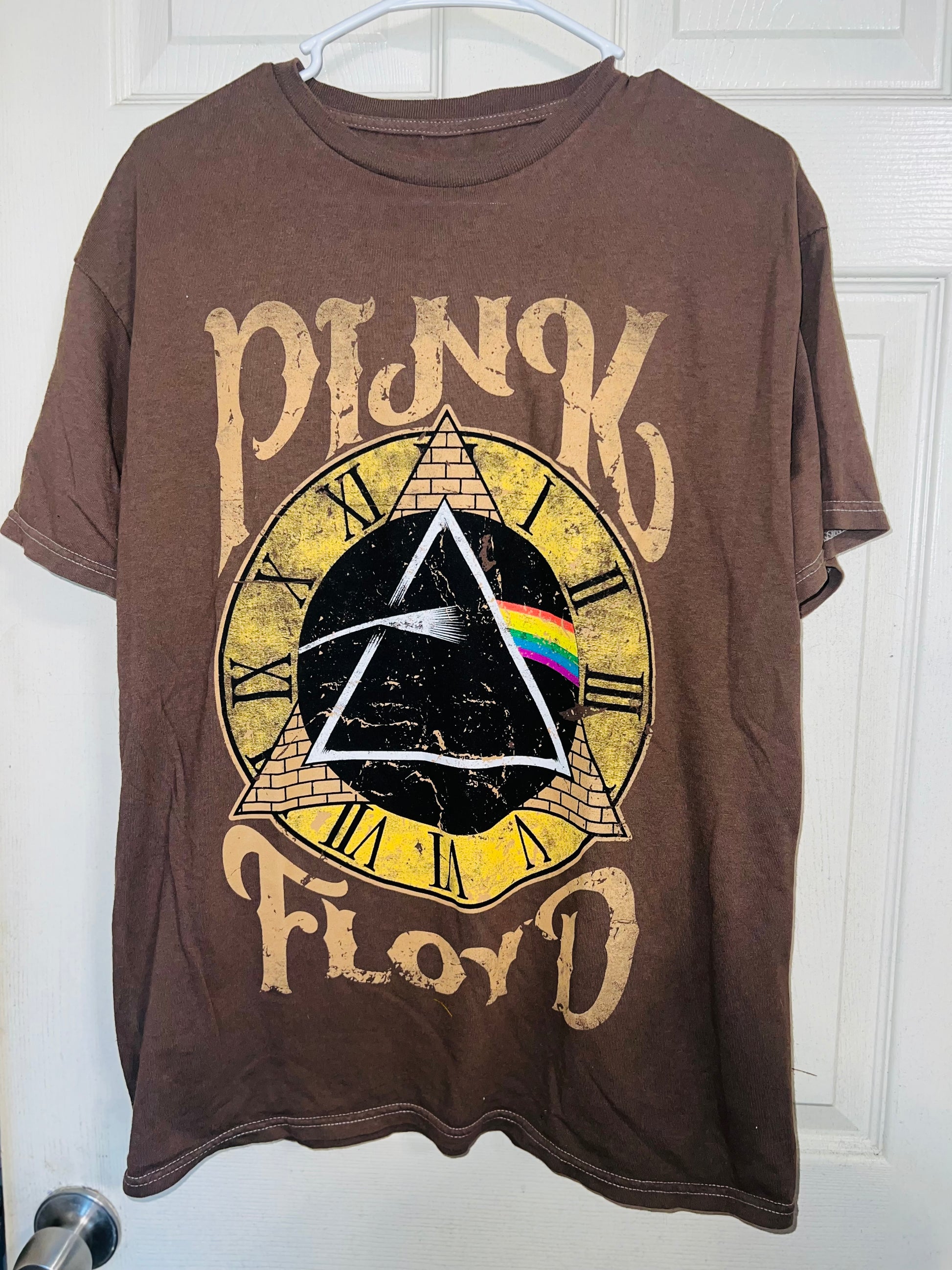 A chocolate Pink Floyd Dark Side of the Moon tee with their famous triangle with rainbow on top of a clock representing “time.” Oversized. Size M/L.