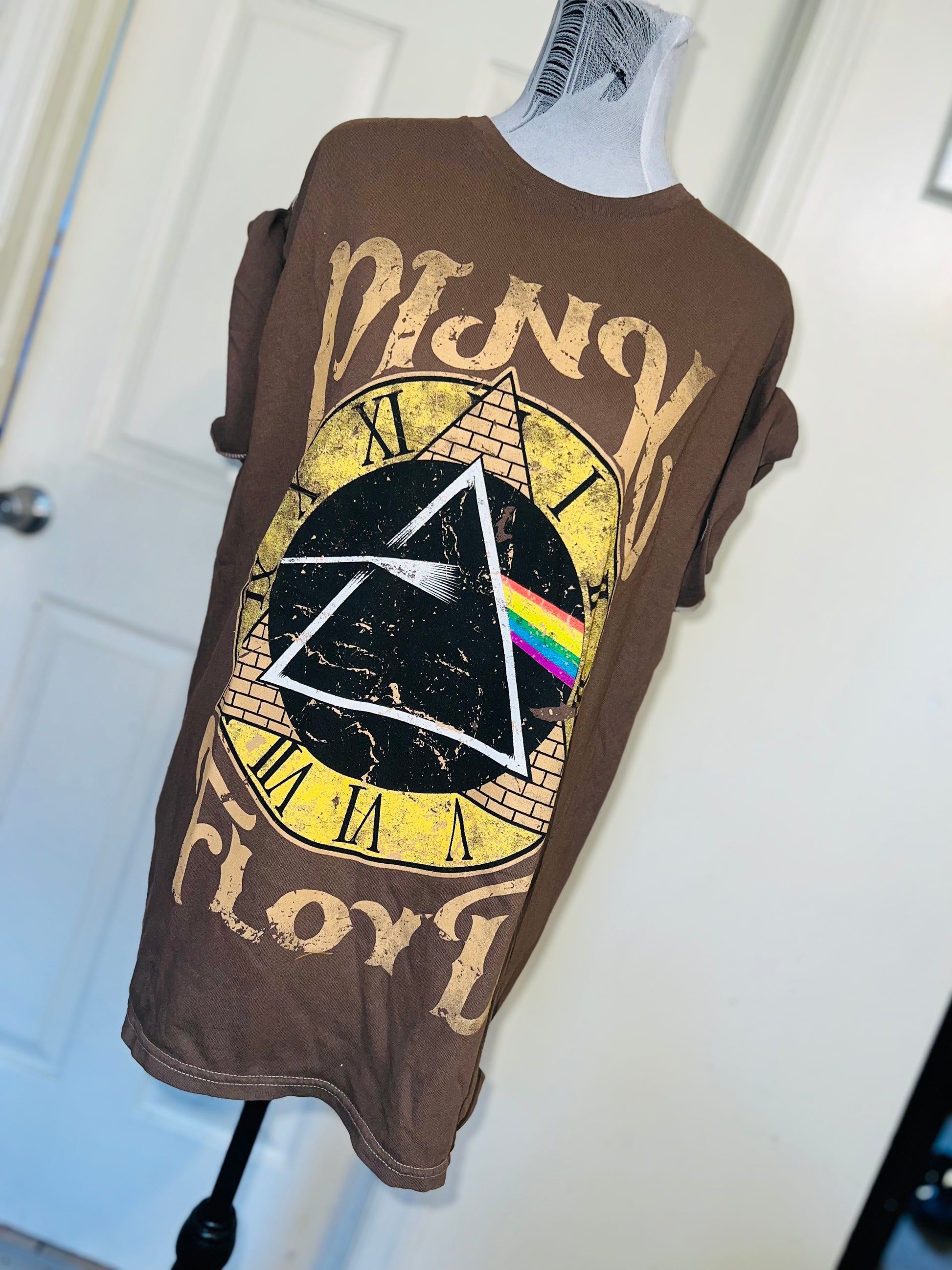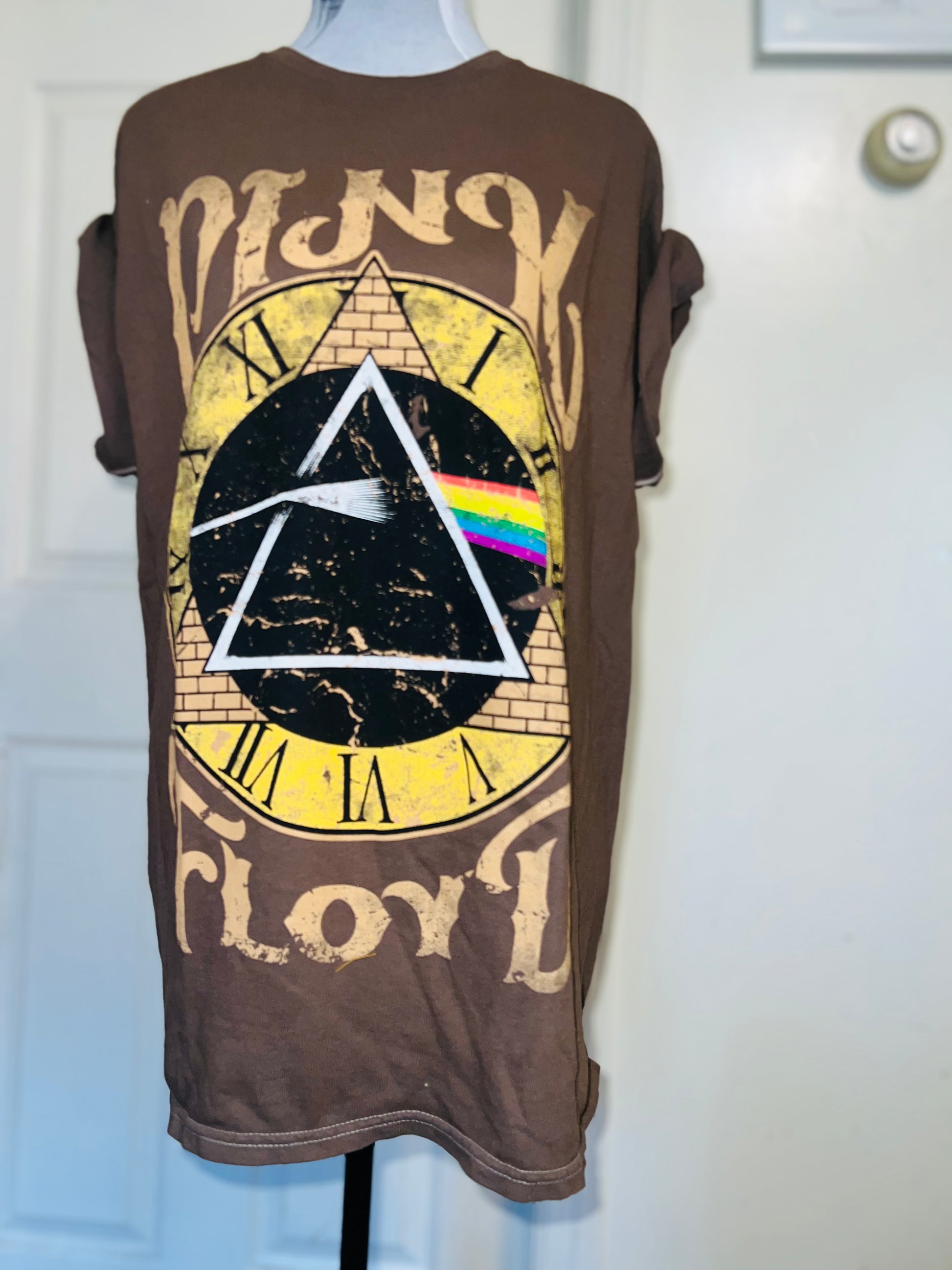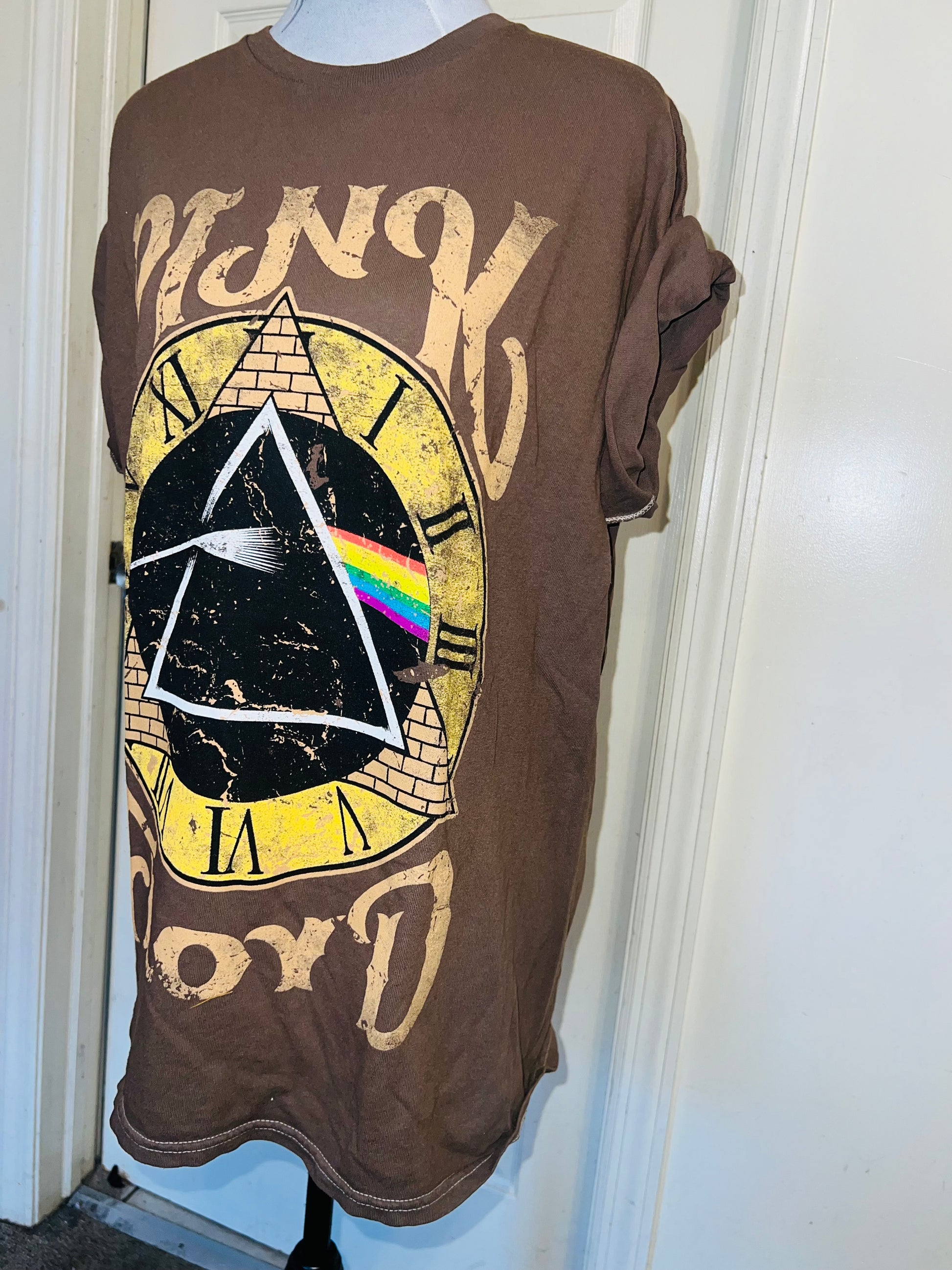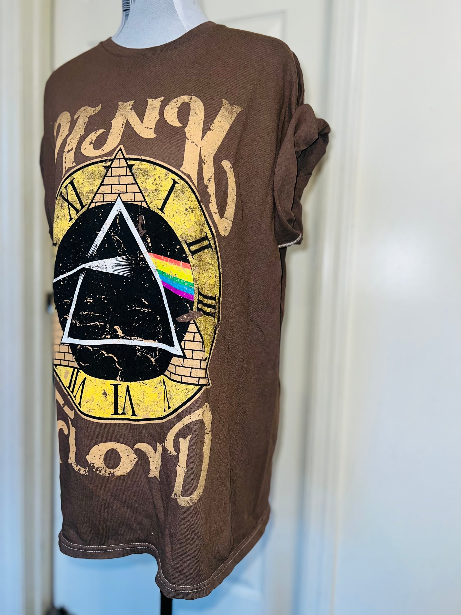 A chocolate Pink Floyd Dark Side of the Moon tee with their famous triangle with rainbow on top of a clock representing “time.” Oversized. Size M/L.