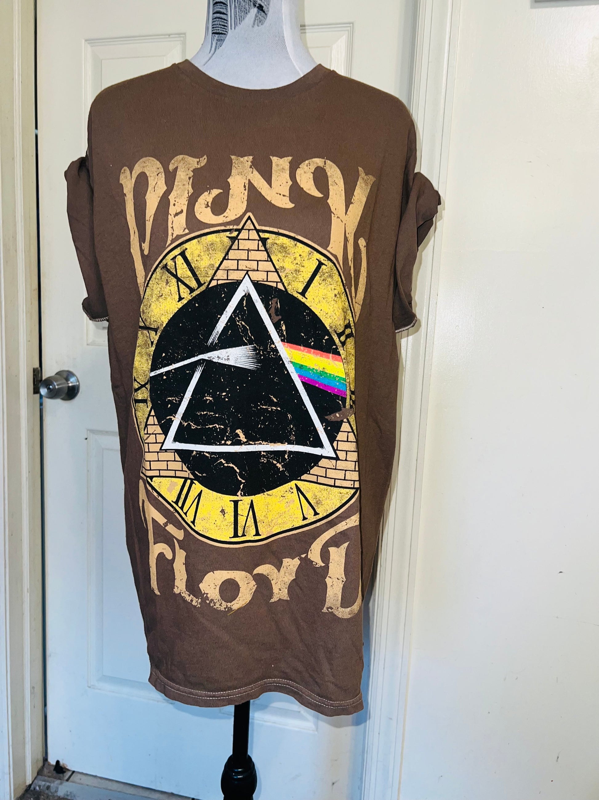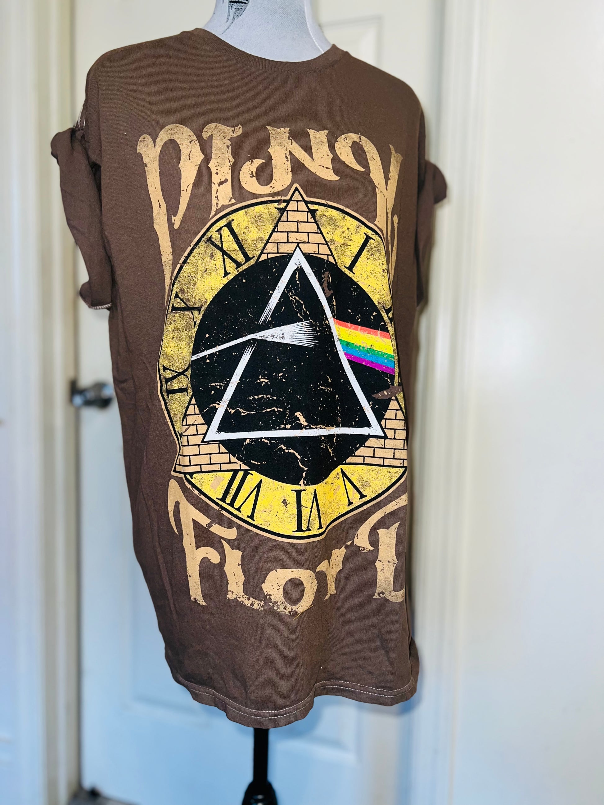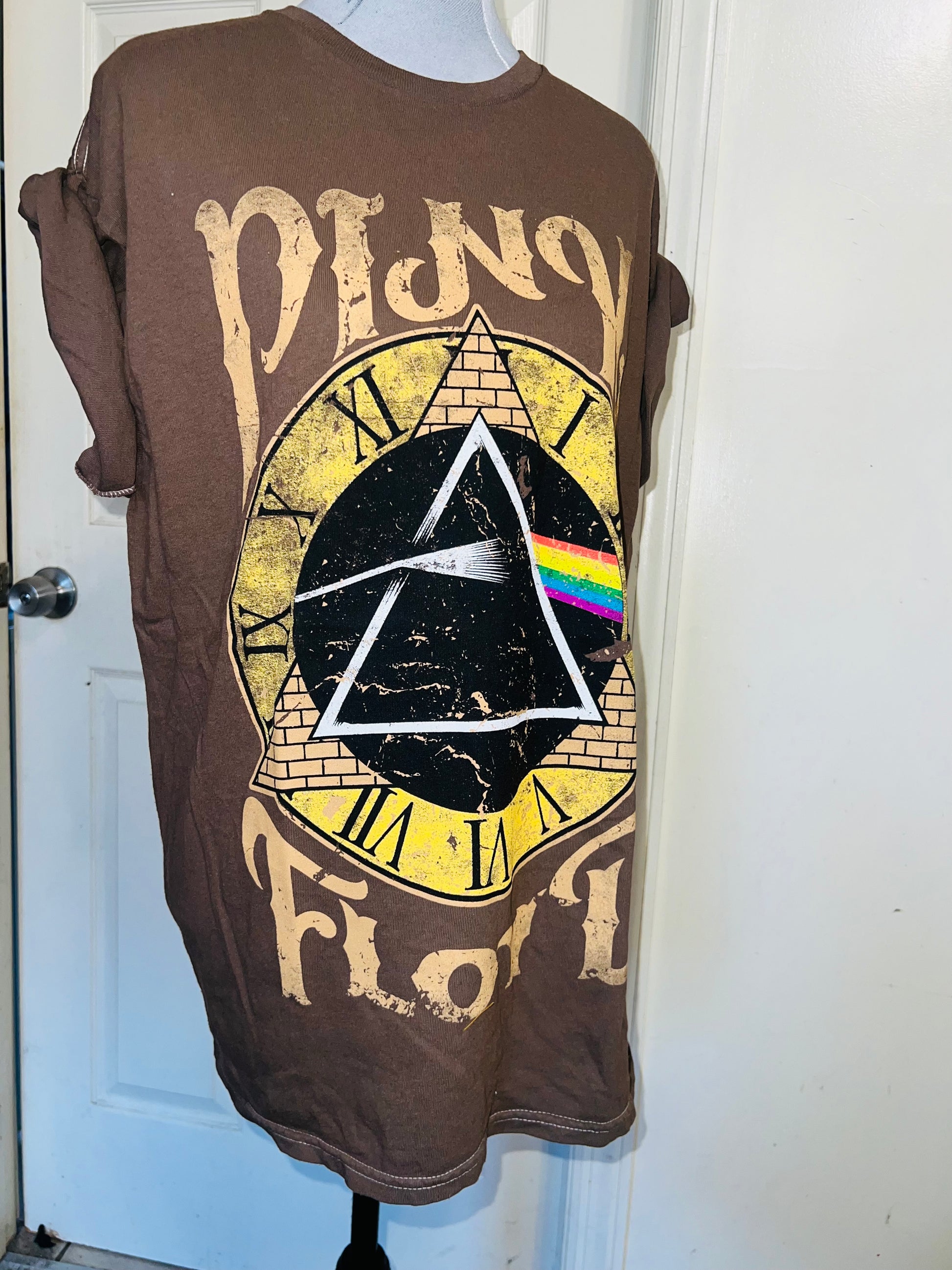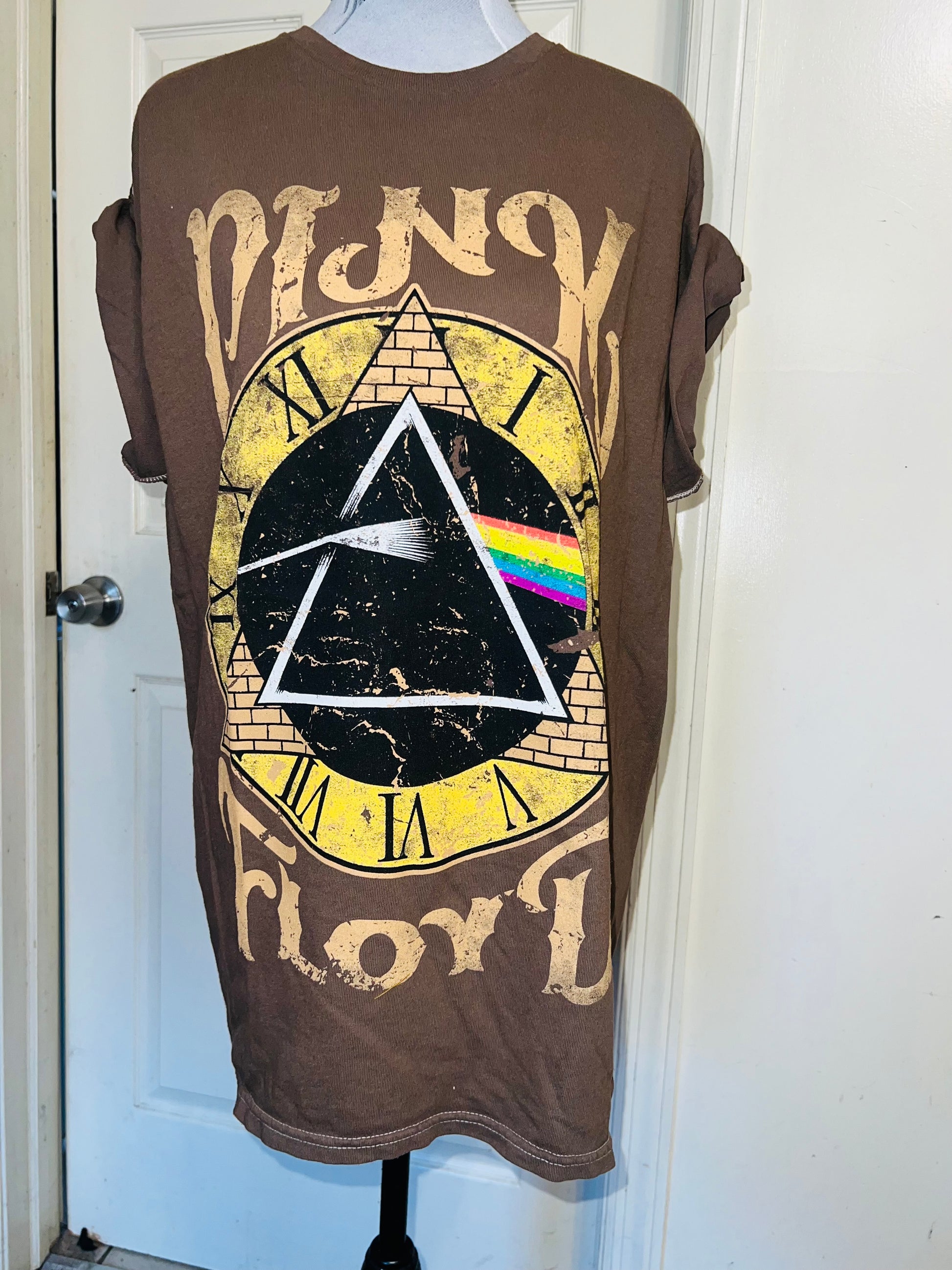 A chocolate Pink Floyd Dark Side of the Moon tee with their famous triangle with rainbow on top of a clock representing “time.” Oversized. Size M/L.