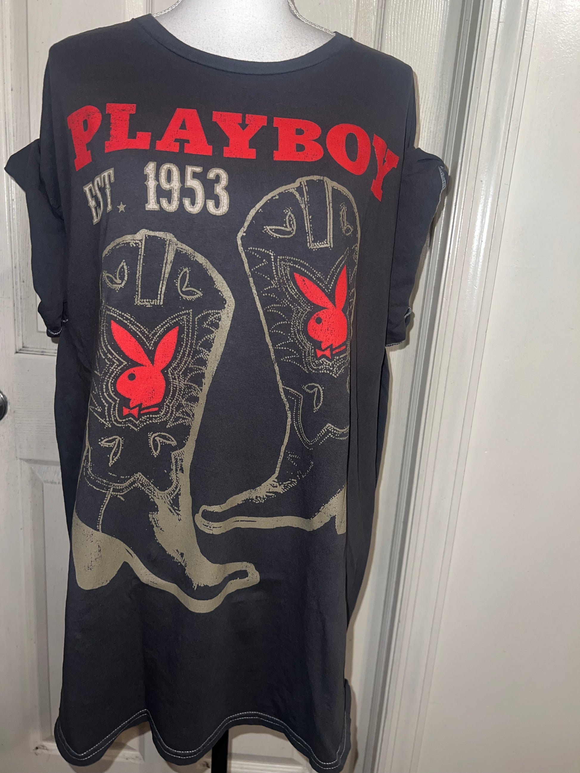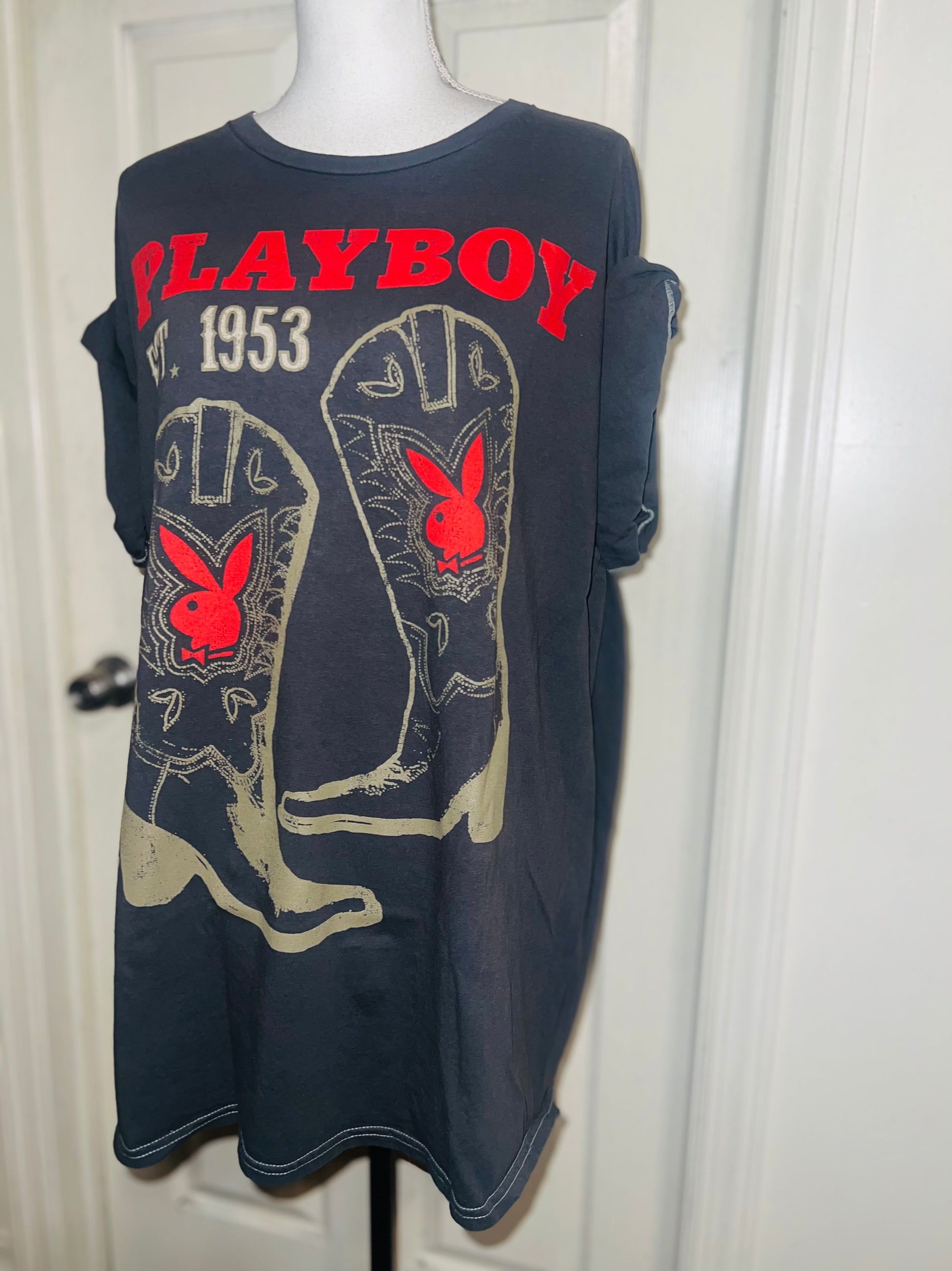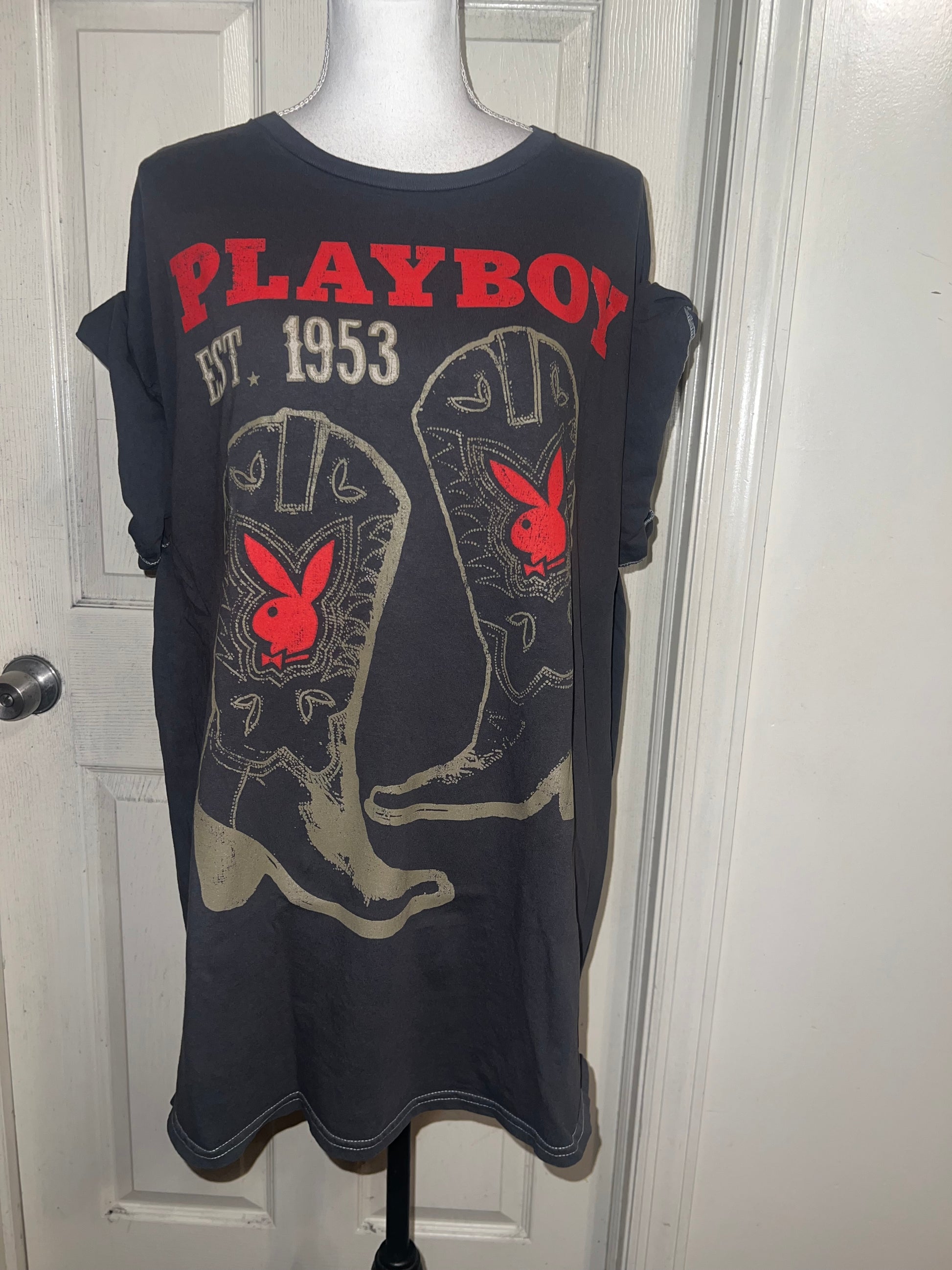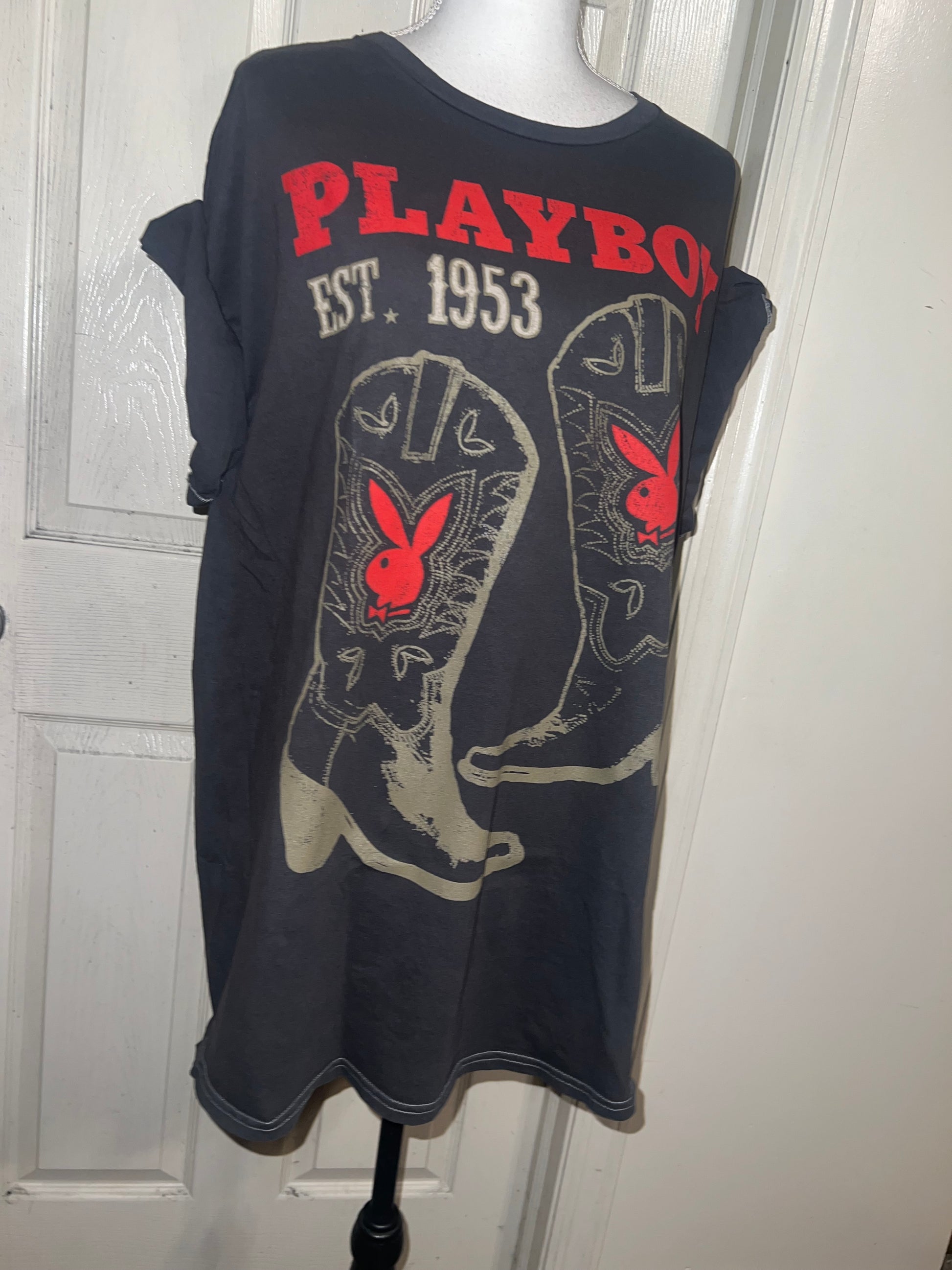 This is now a preorder. Please allow extra processing time. A dark charcoal grey Playboy tee with cowboy boots with bunnies and 1953. Size 1X, oversized.