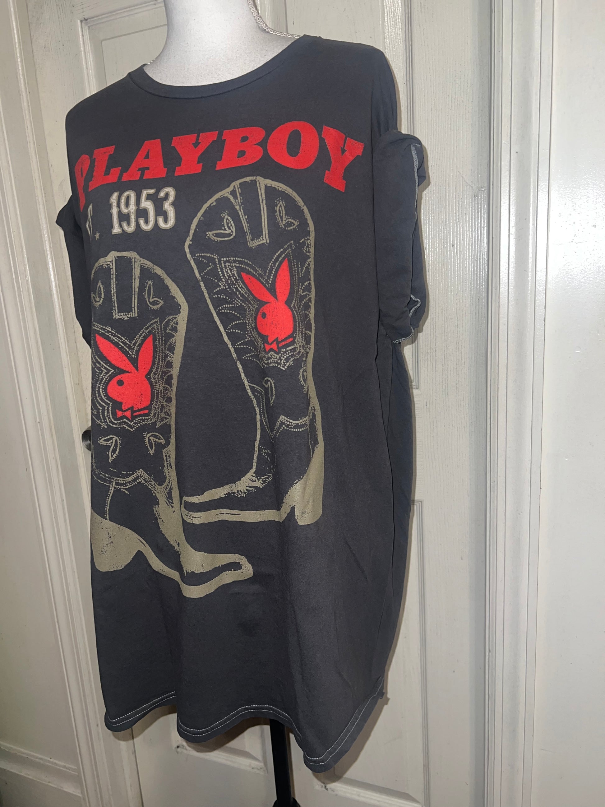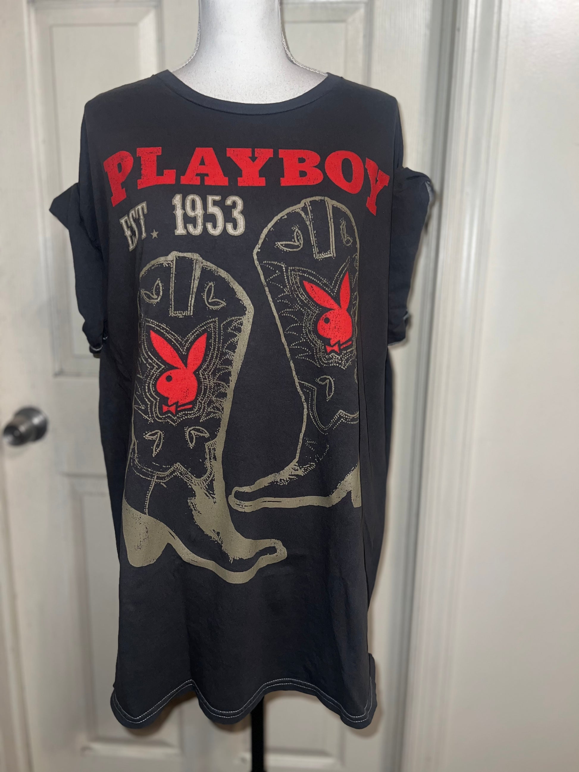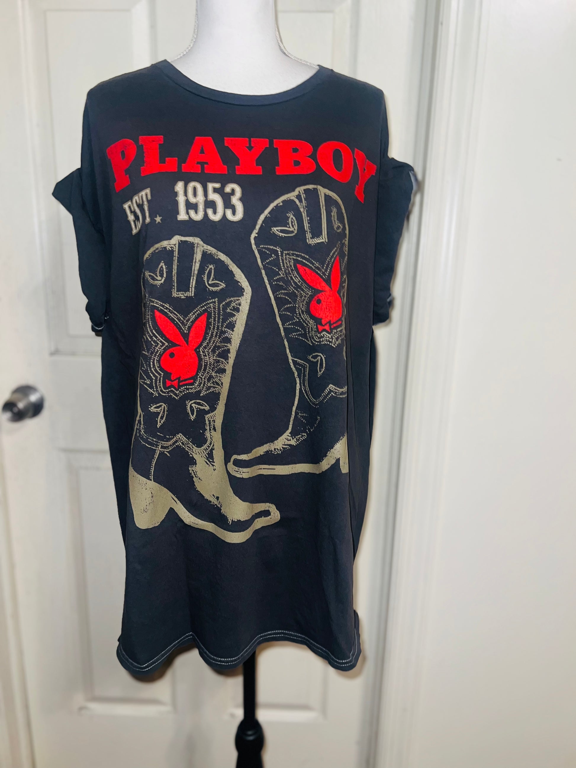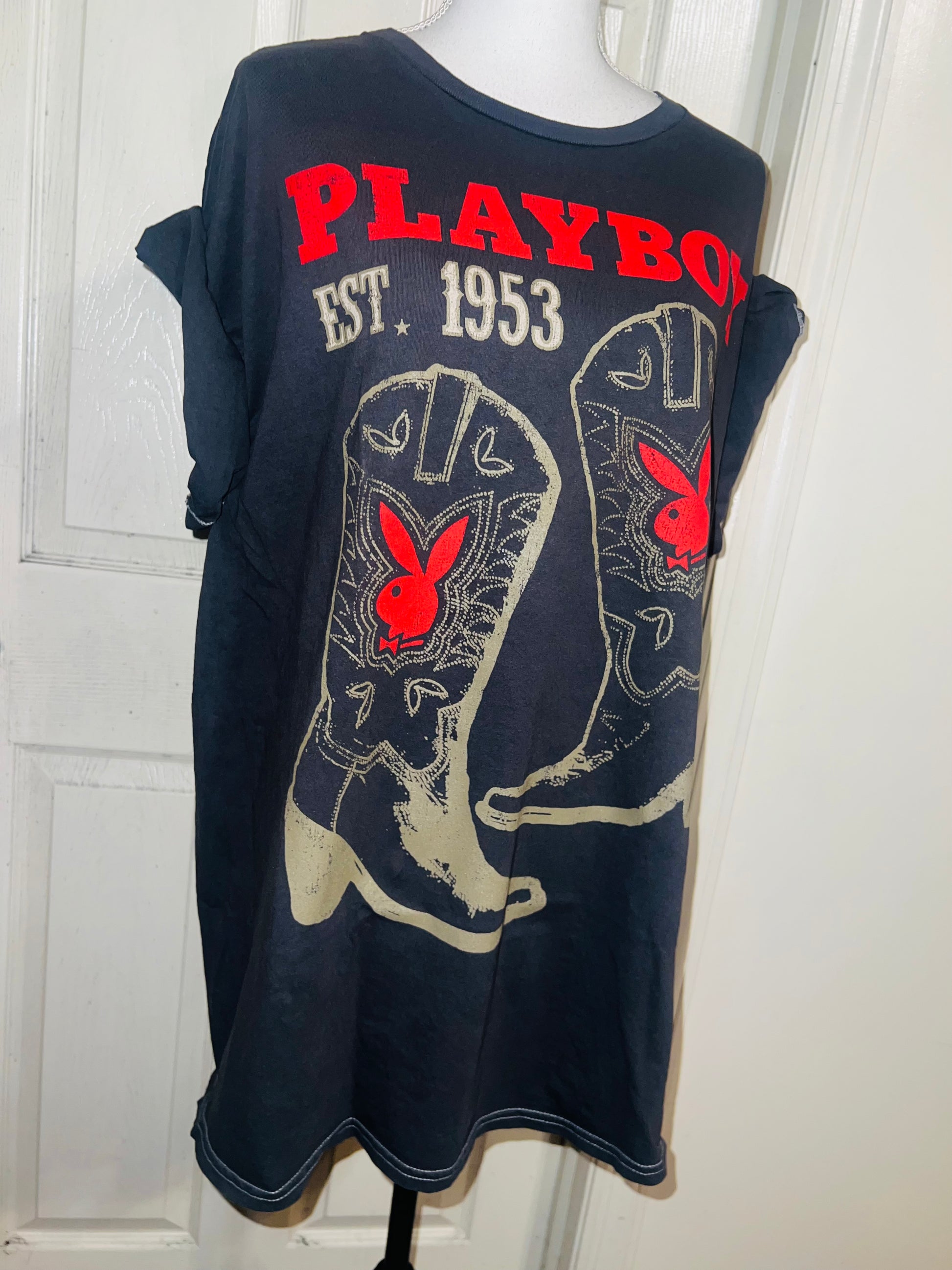 This is now a preorder. Please allow extra processing time. A dark charcoal grey Playboy tee with cowboy boots with bunnies and 1953. Size 1X, oversized.