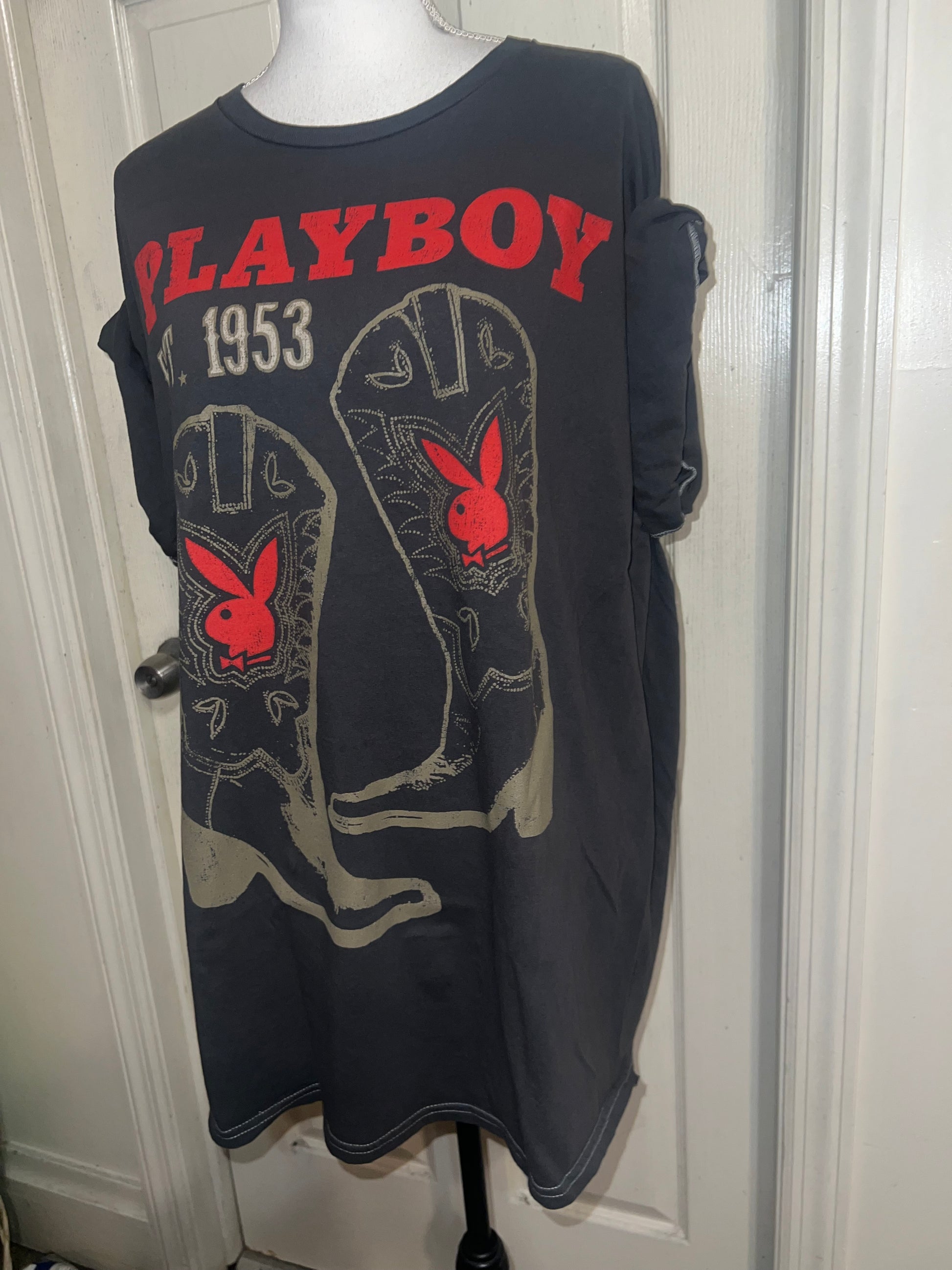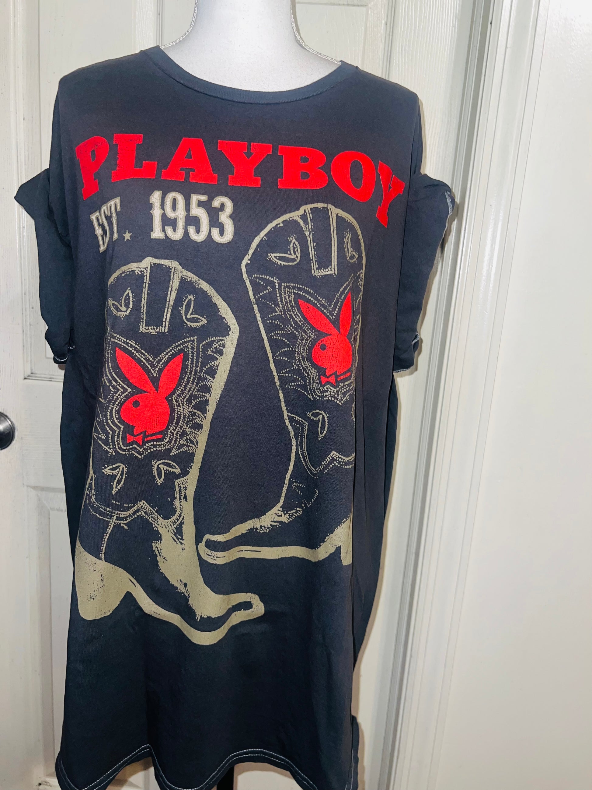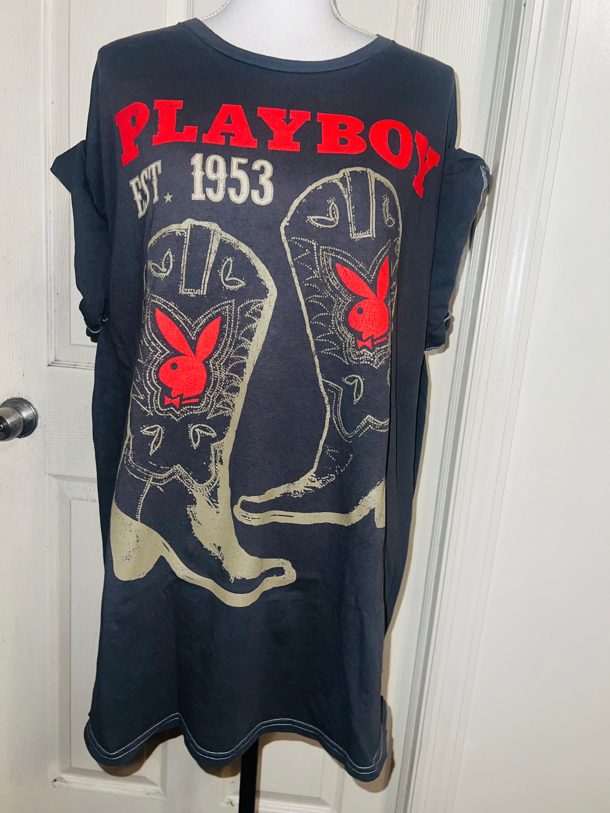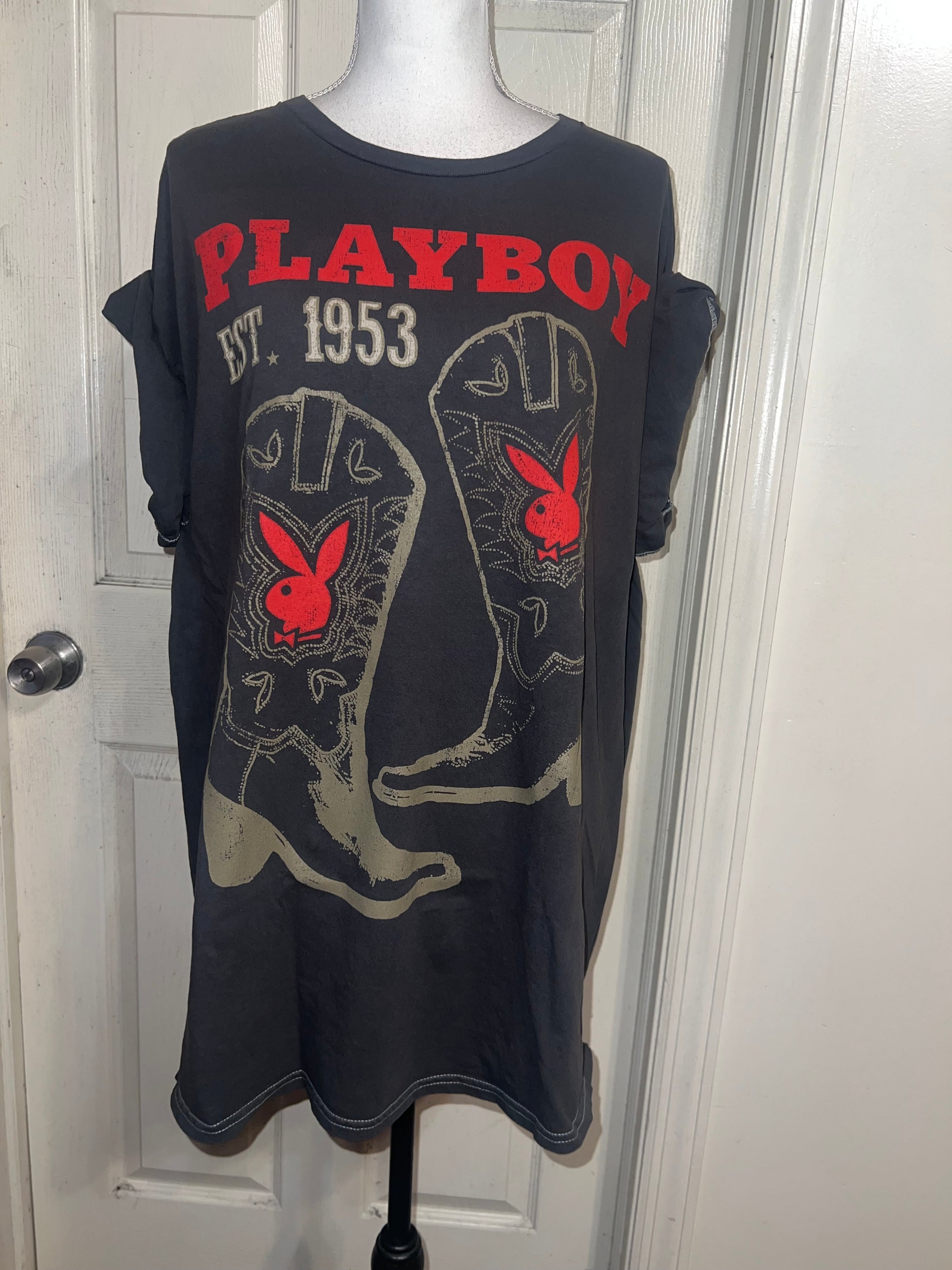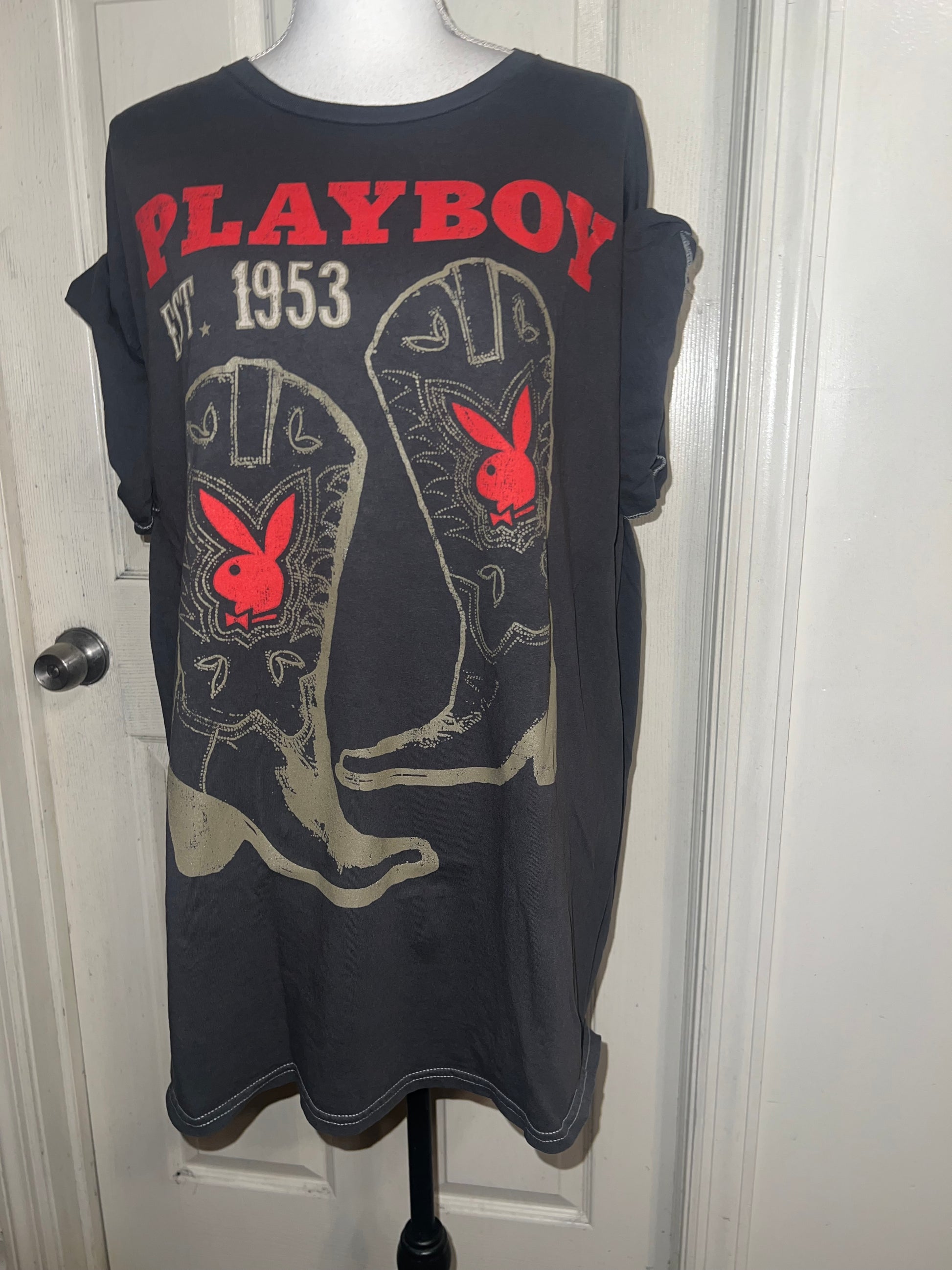 This is now a preorder. Please allow extra processing time. A dark charcoal grey Playboy tee with cowboy boots with bunnies and 1953. Size 1X, oversized.